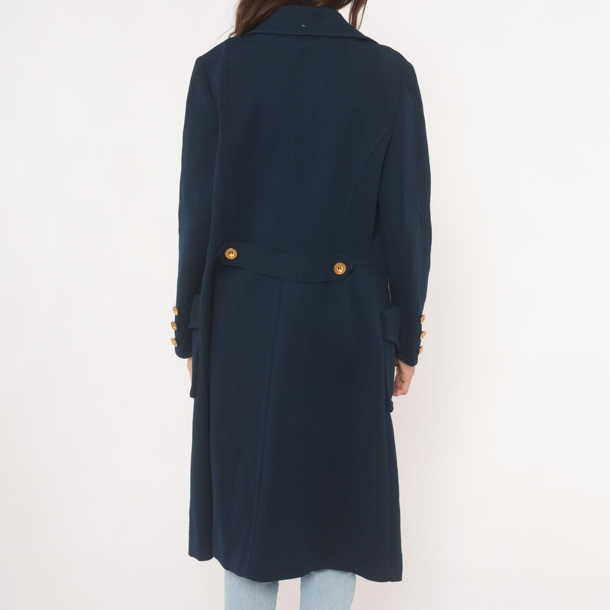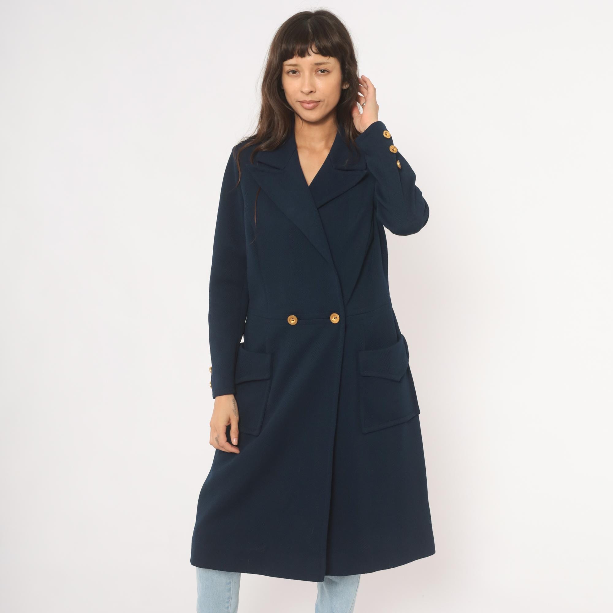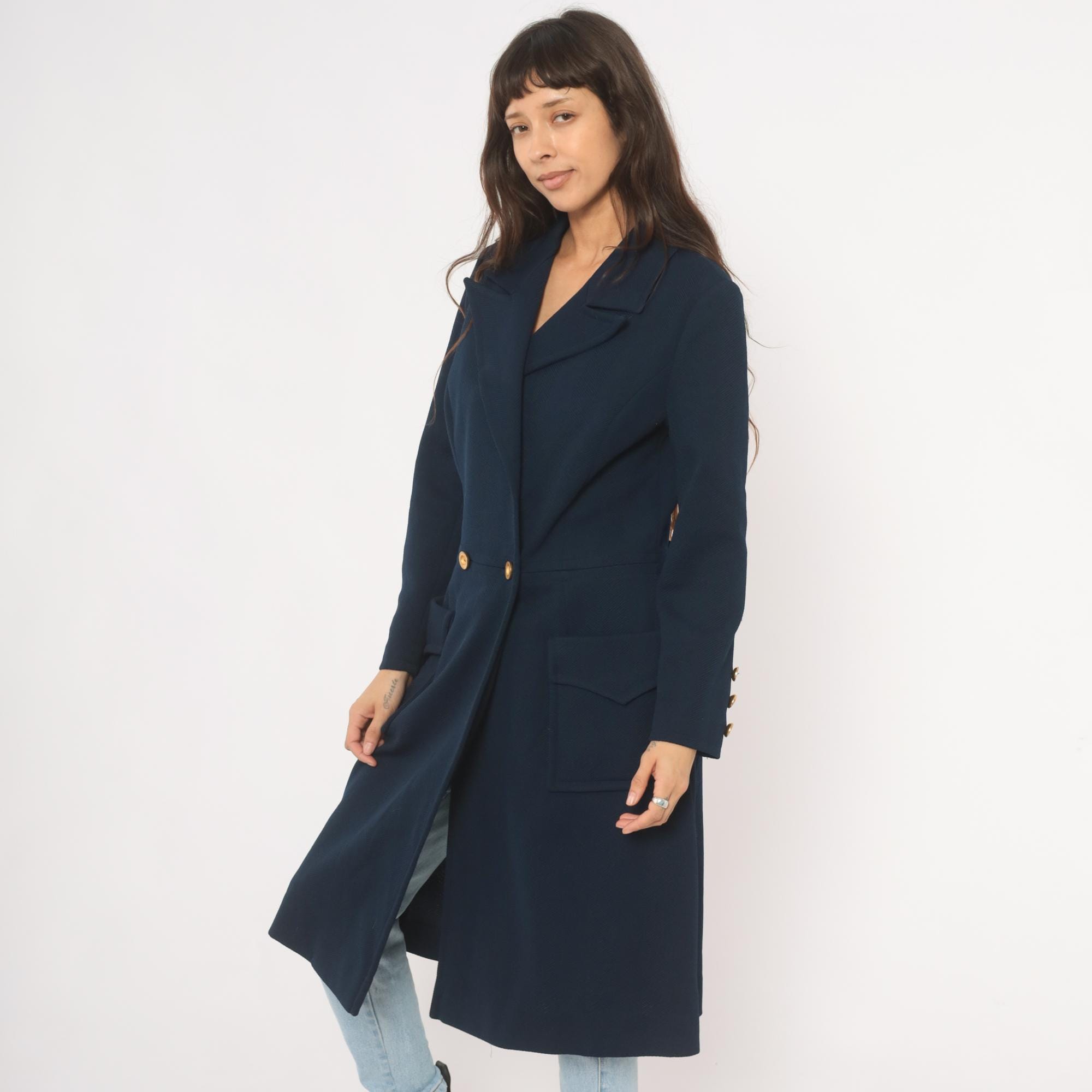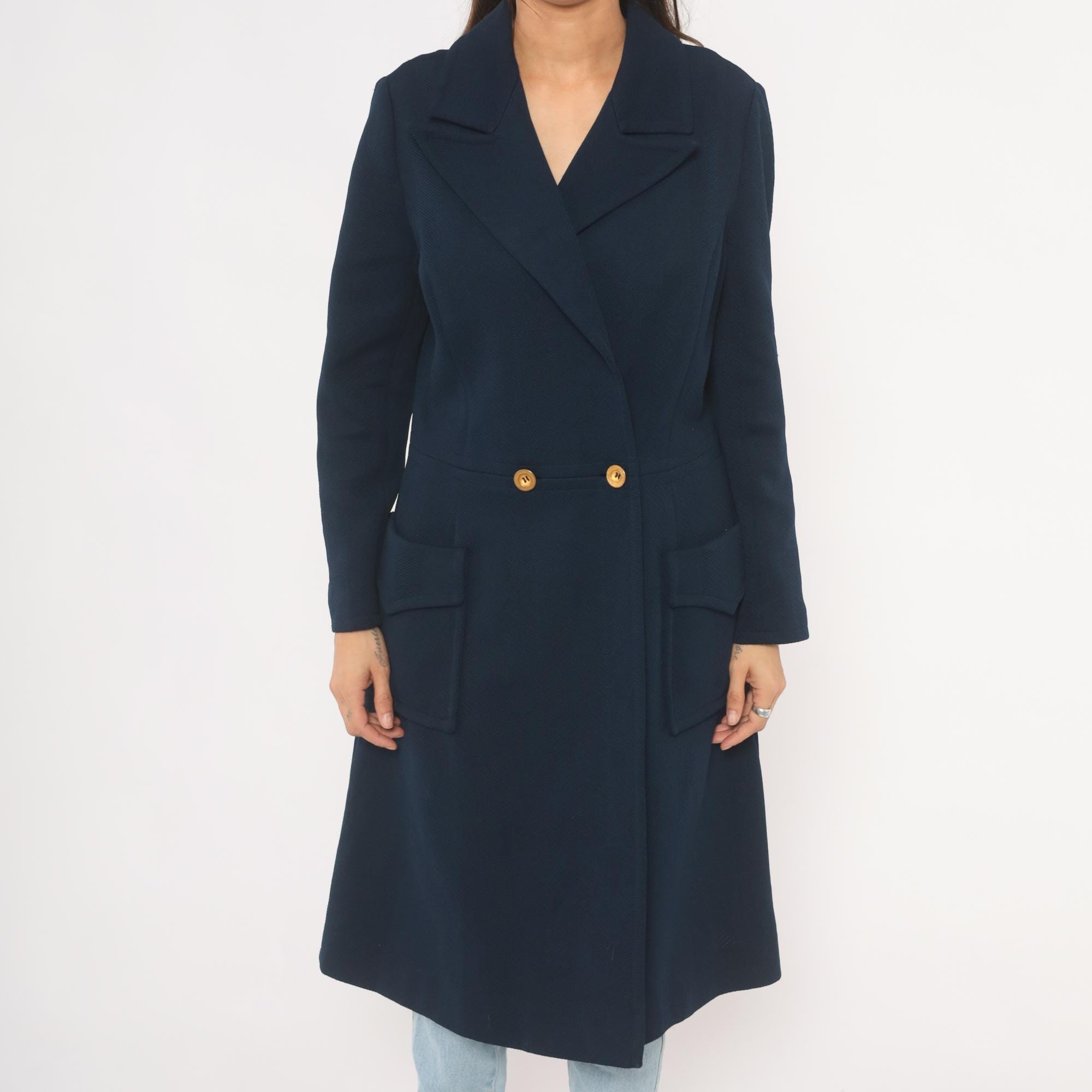 70s navy double breasted coat from Butte Knit with notched lapel collar and two gold-tone front closure buttons. Matching gold buttons at the back waist and on each cuff. Front flap pockets at the hip, A-line silhouette below the waist, and knee length hem. Diagonal twill weave texture visible across the fabric.