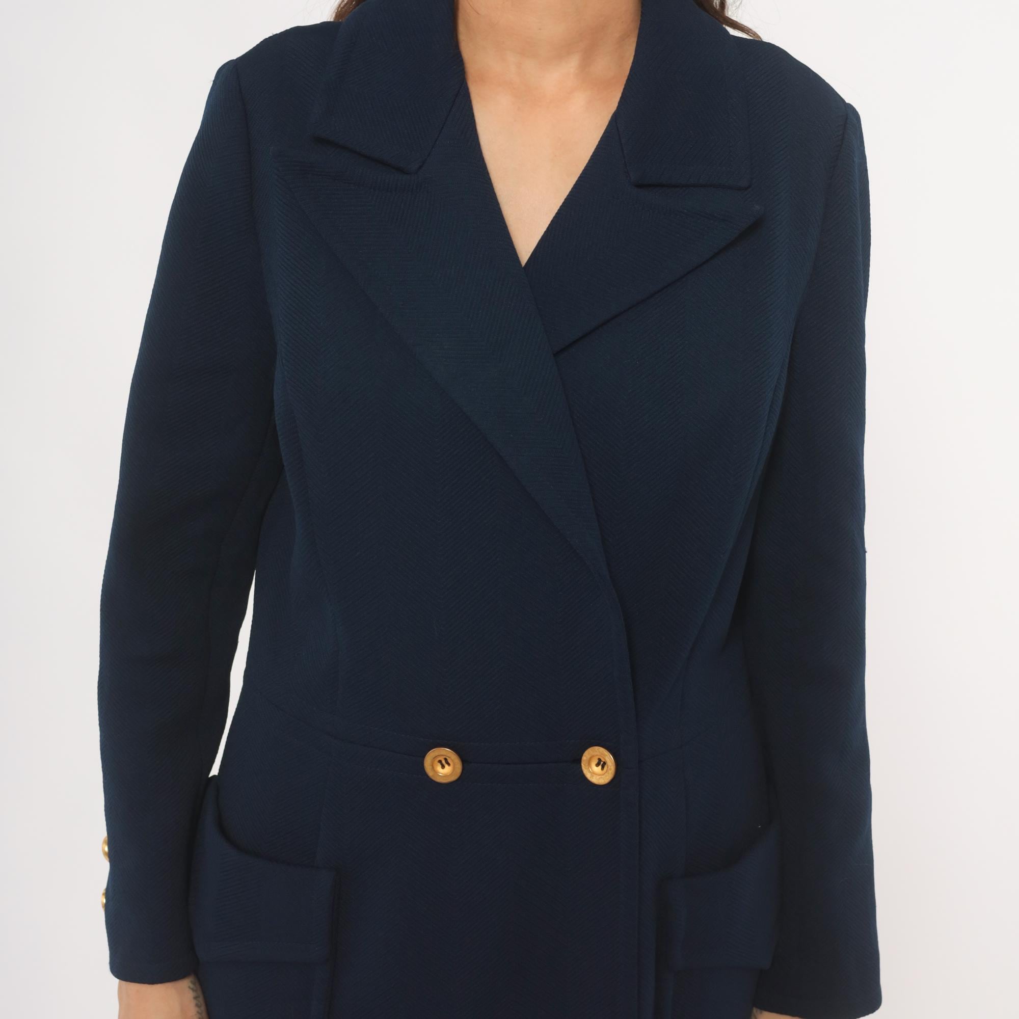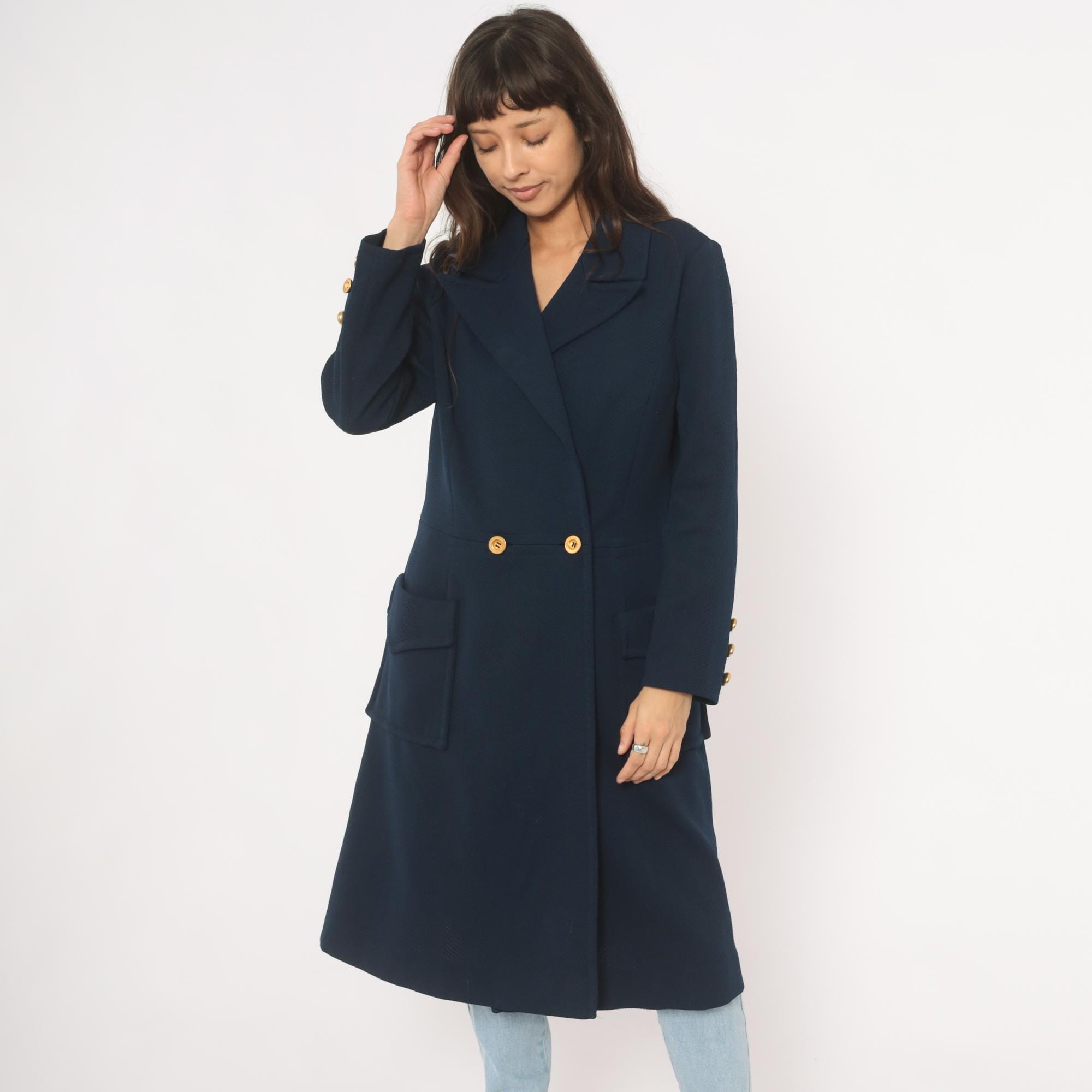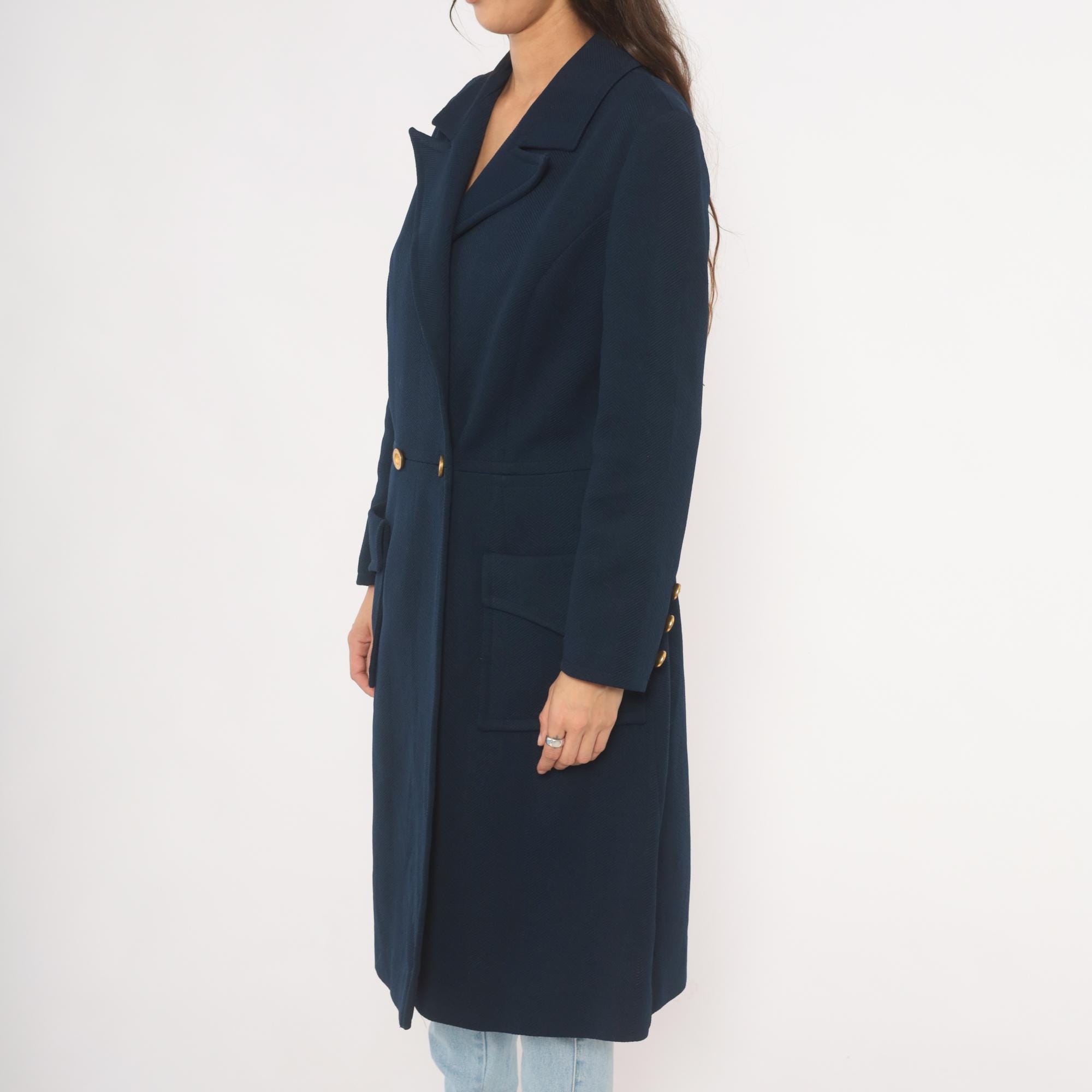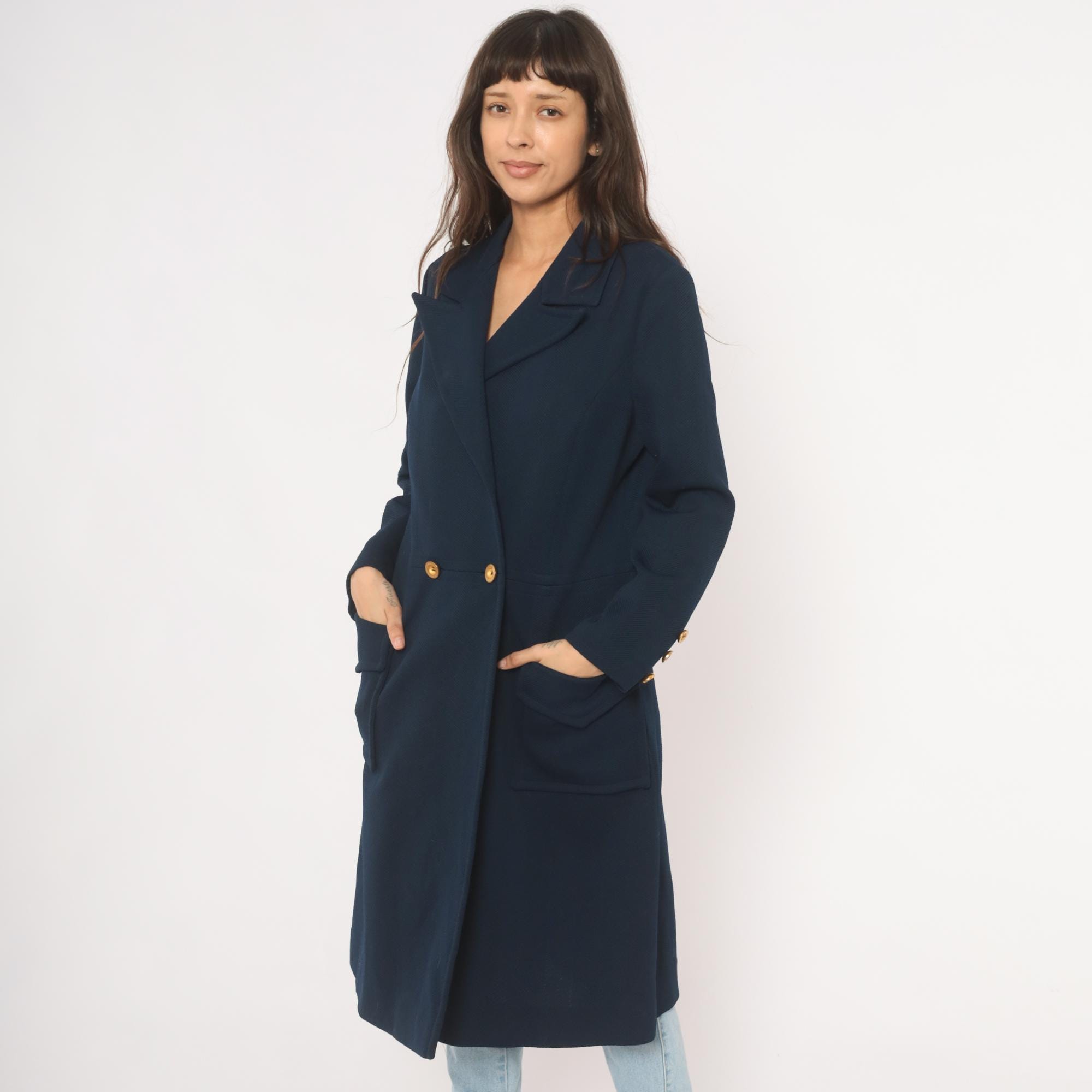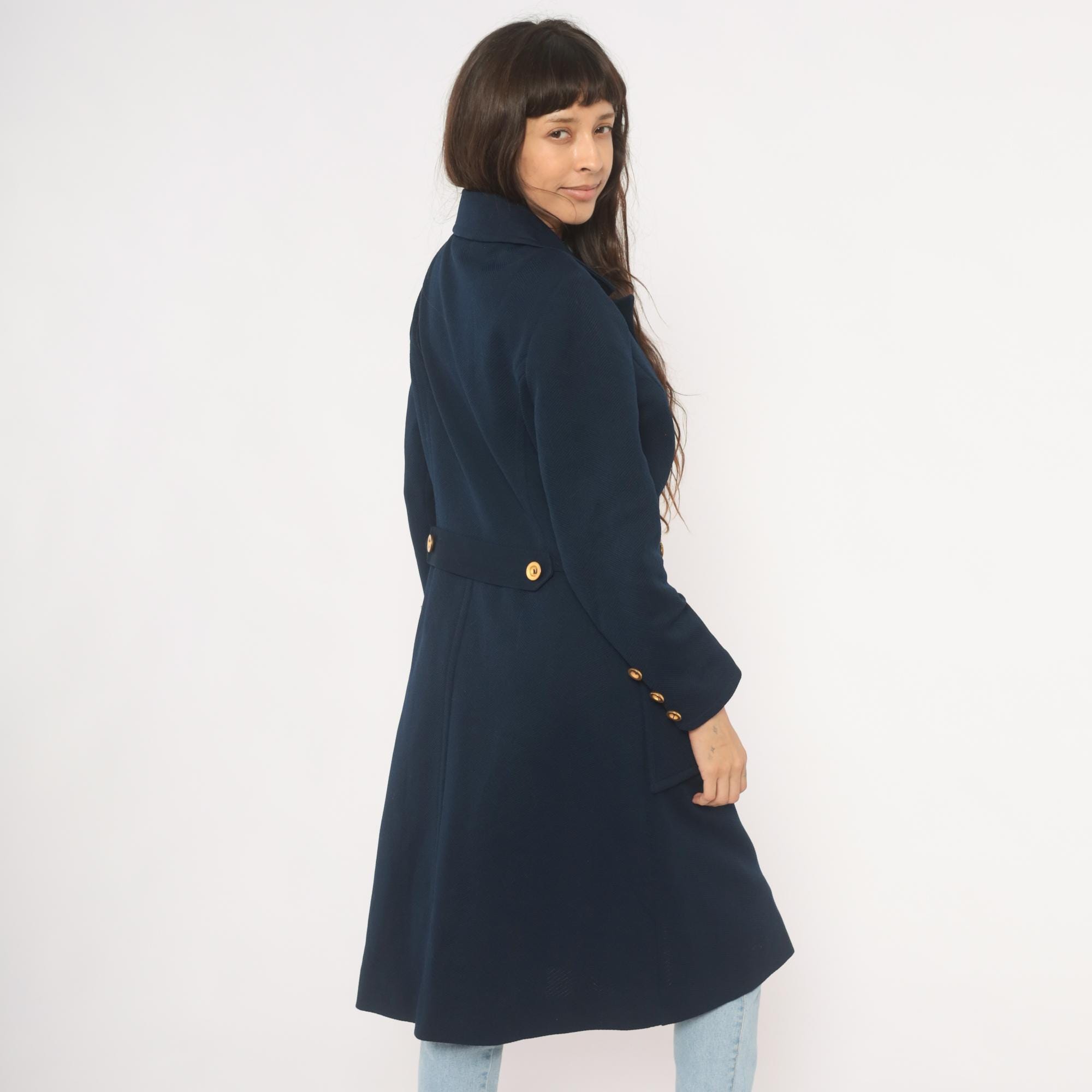 70s navy double breasted coat from Butte Knit with notched lapel collar and two gold-tone front closure buttons. Matching gold buttons at the back waist and on each cuff. Front flap pockets at the hip, A-line silhouette below the waist, and knee length hem. Diagonal twill weave texture visible across the fabric.
