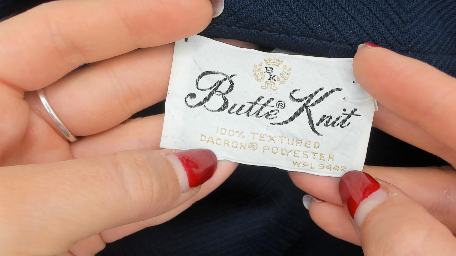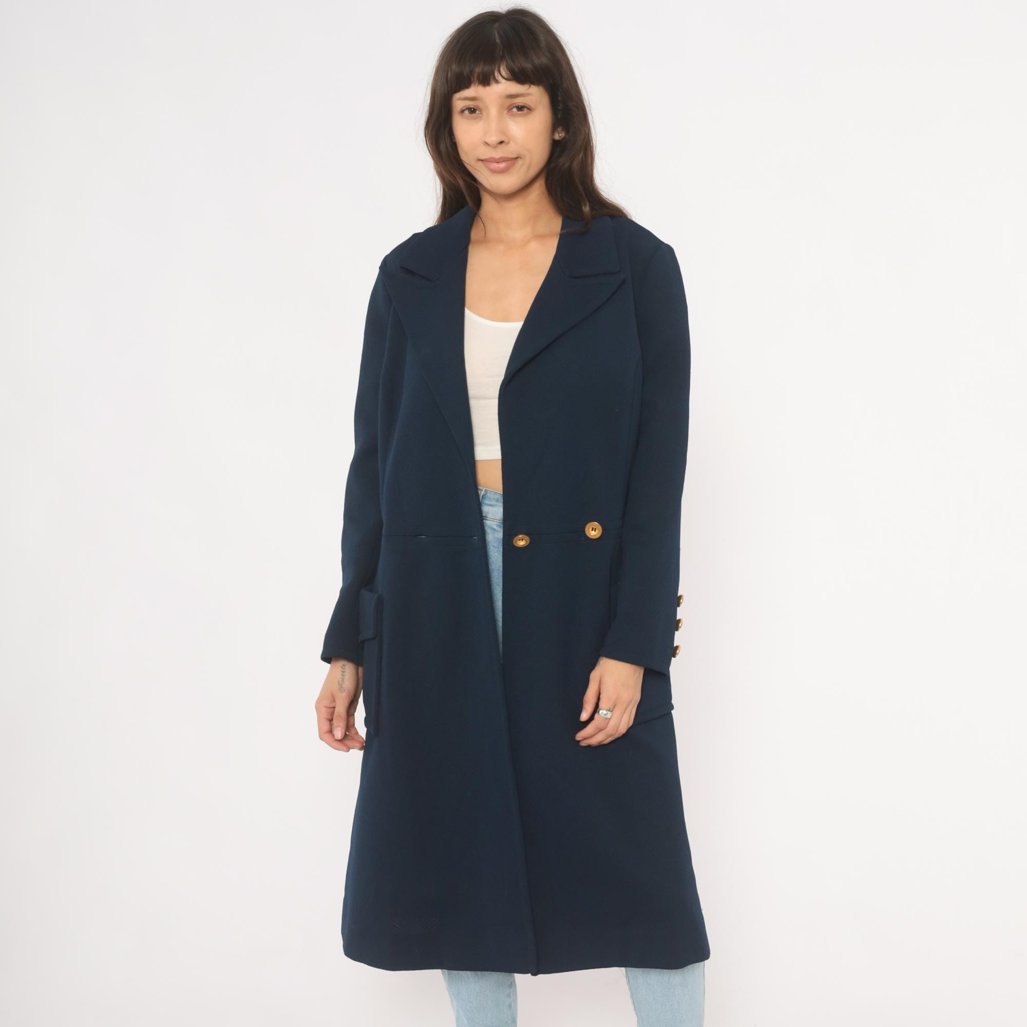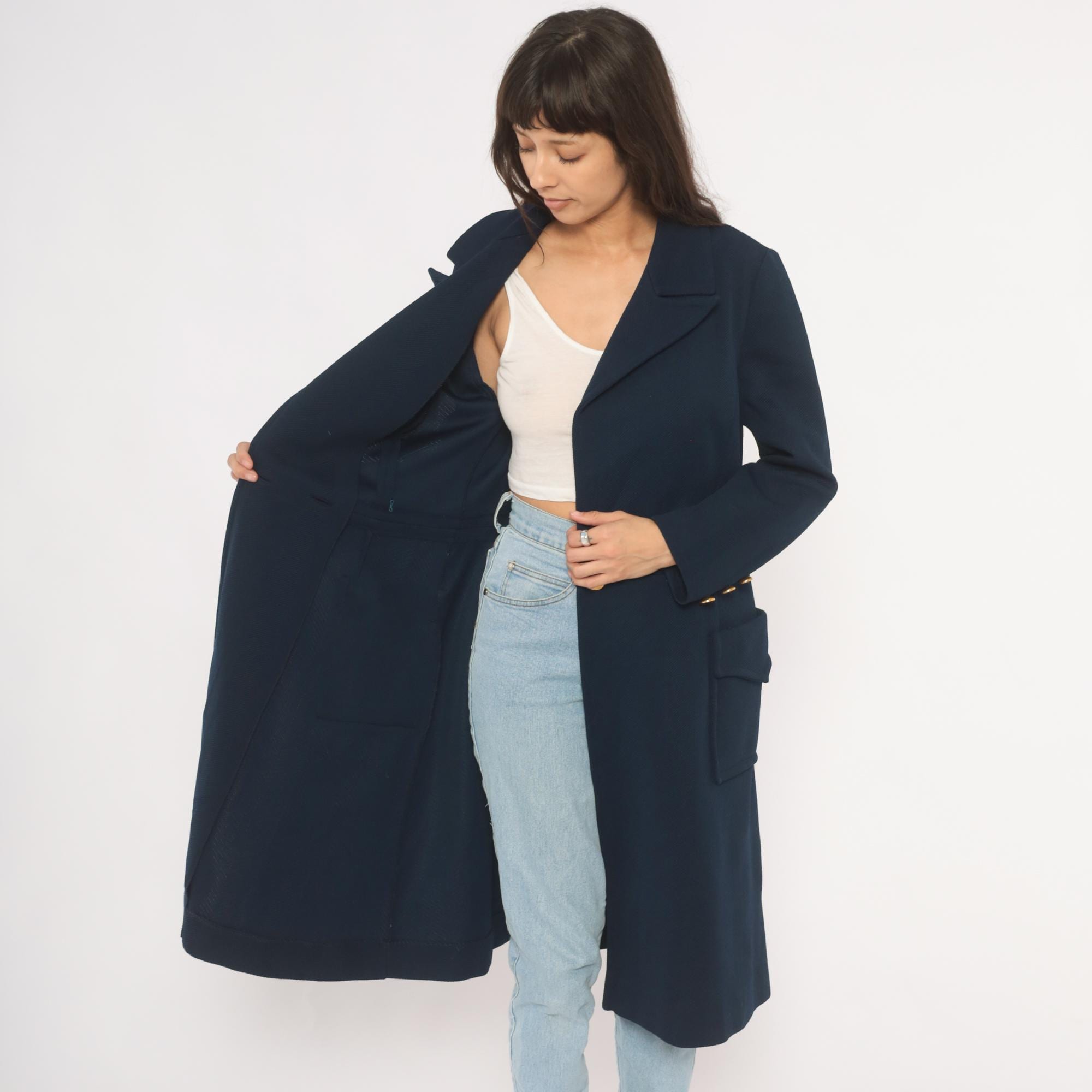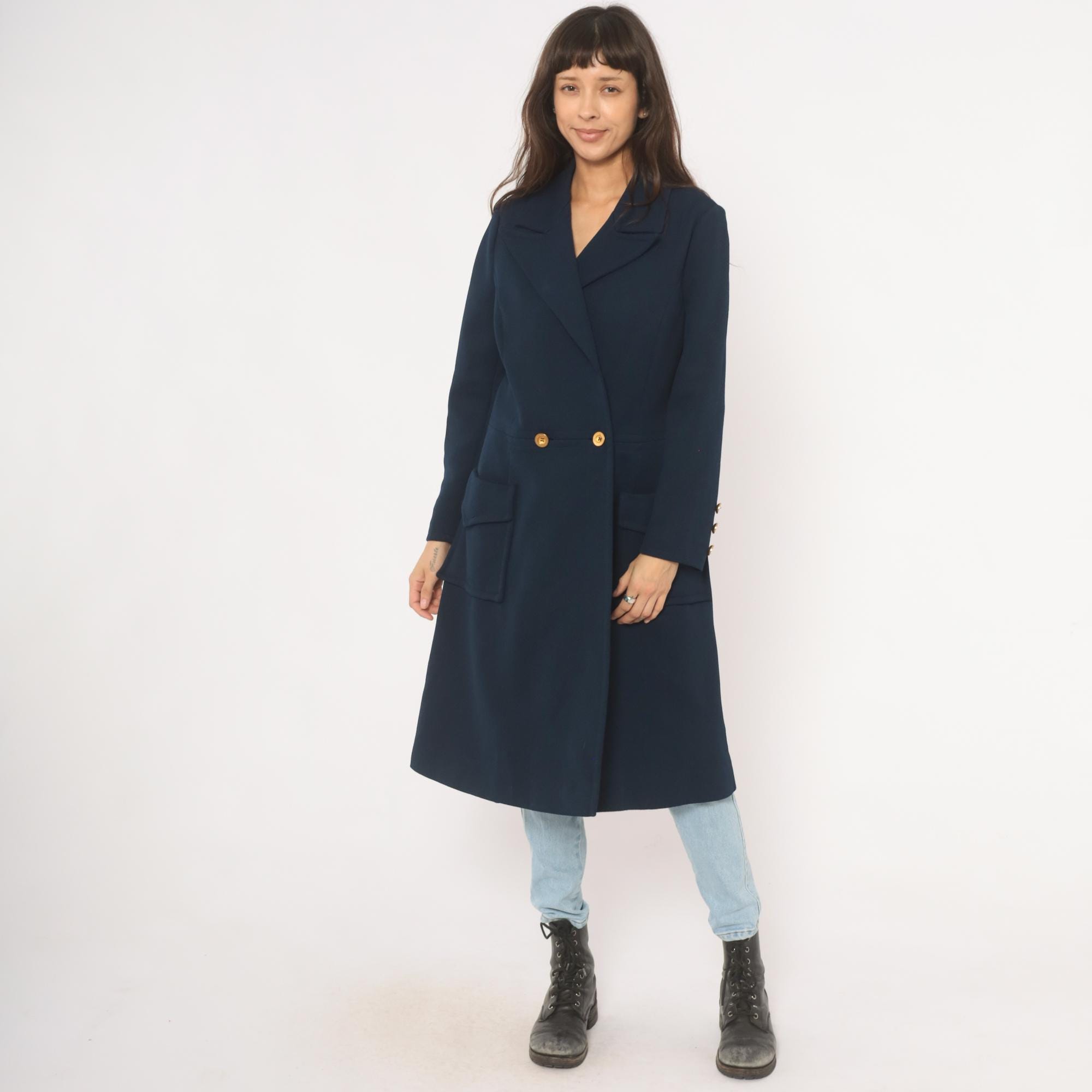 70s navy double breasted coat from Butte Knit with notched lapel collar and two gold-tone front closure buttons. Matching gold buttons at the back waist and on each cuff. Front flap pockets at the hip, A-line silhouette below the waist, and knee length hem. Diagonal twill weave texture visible across the fabric.