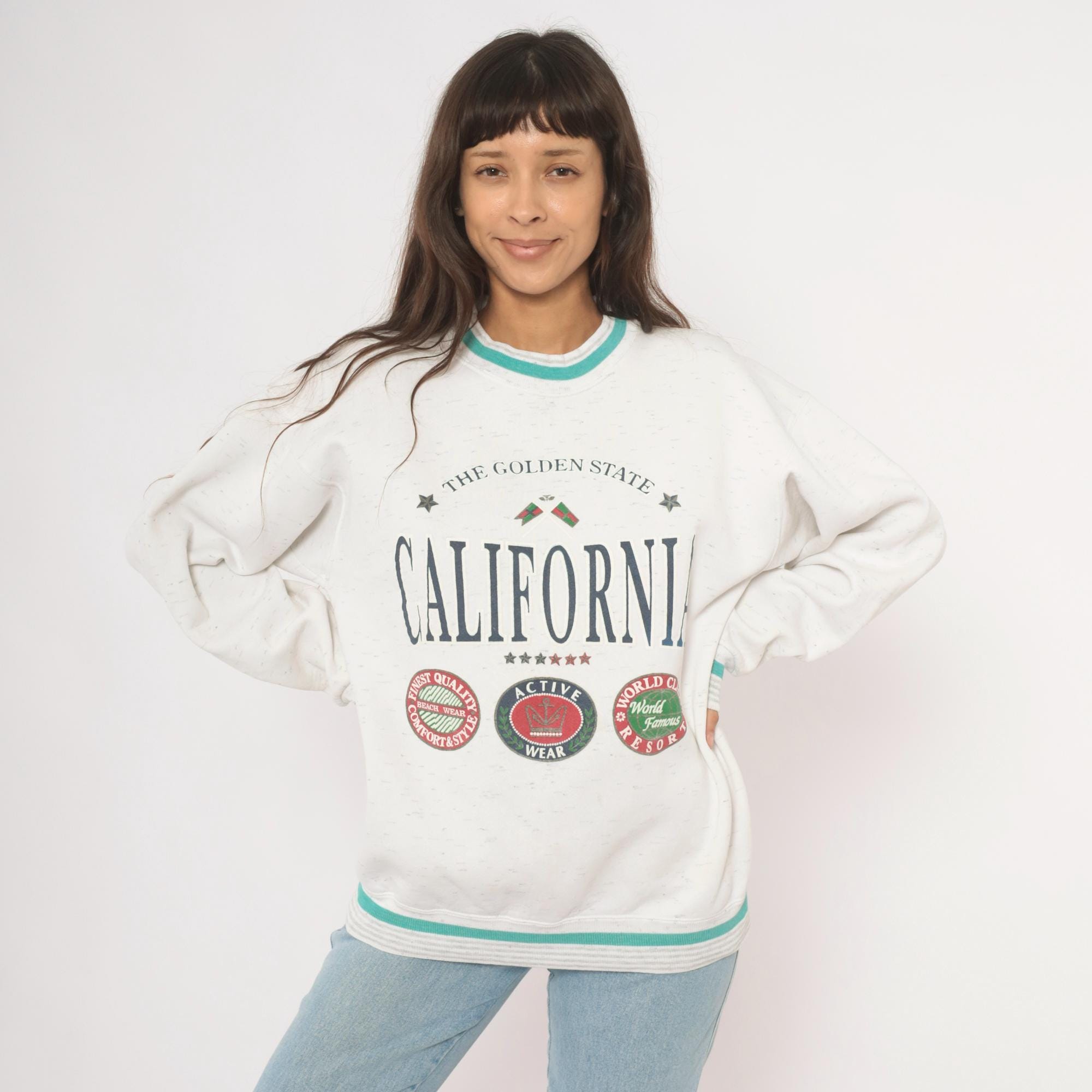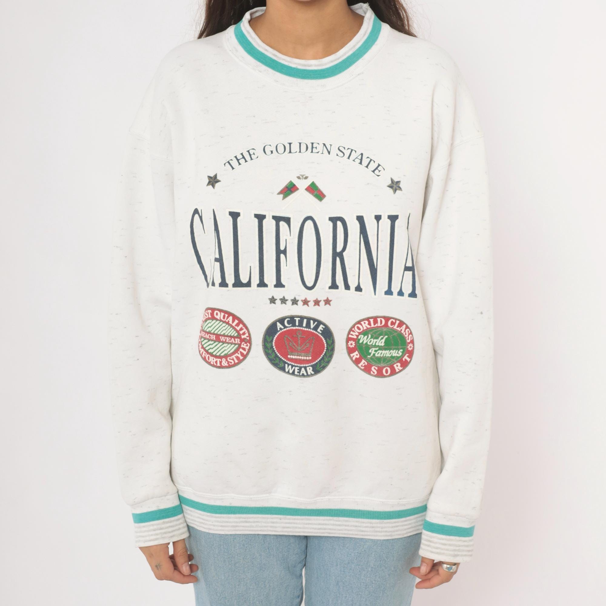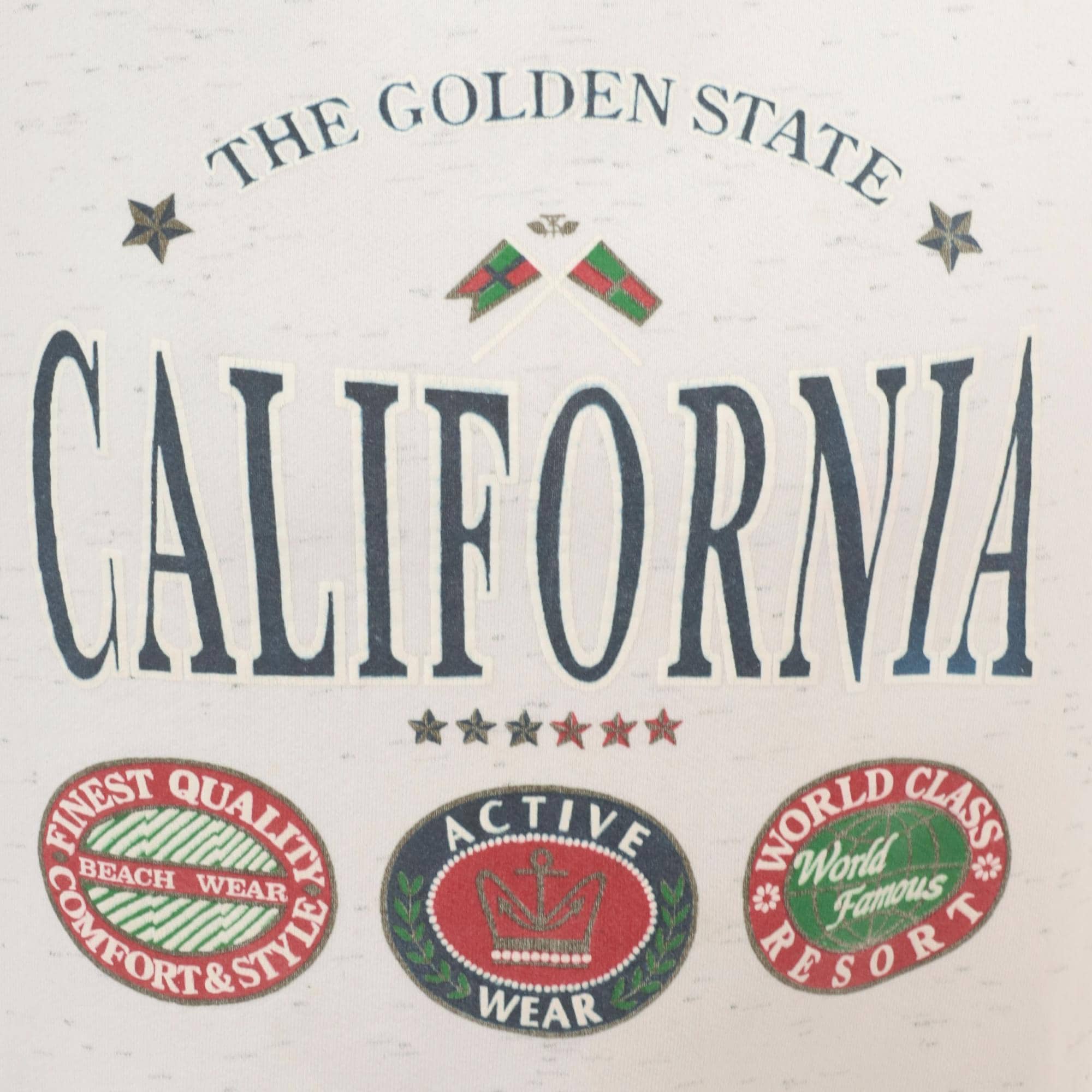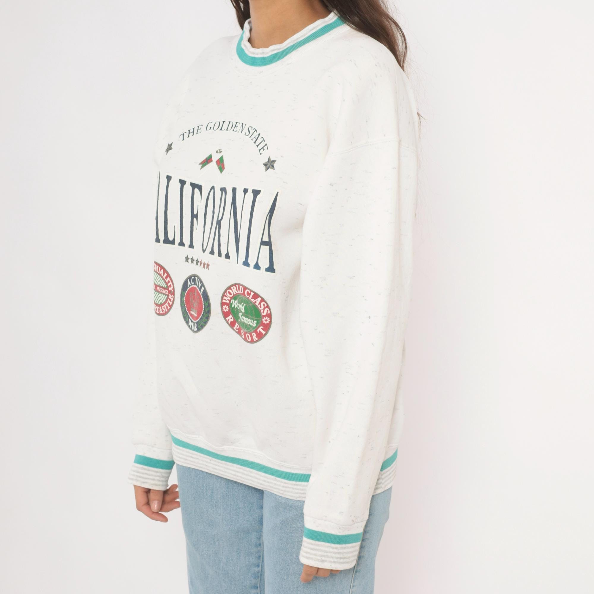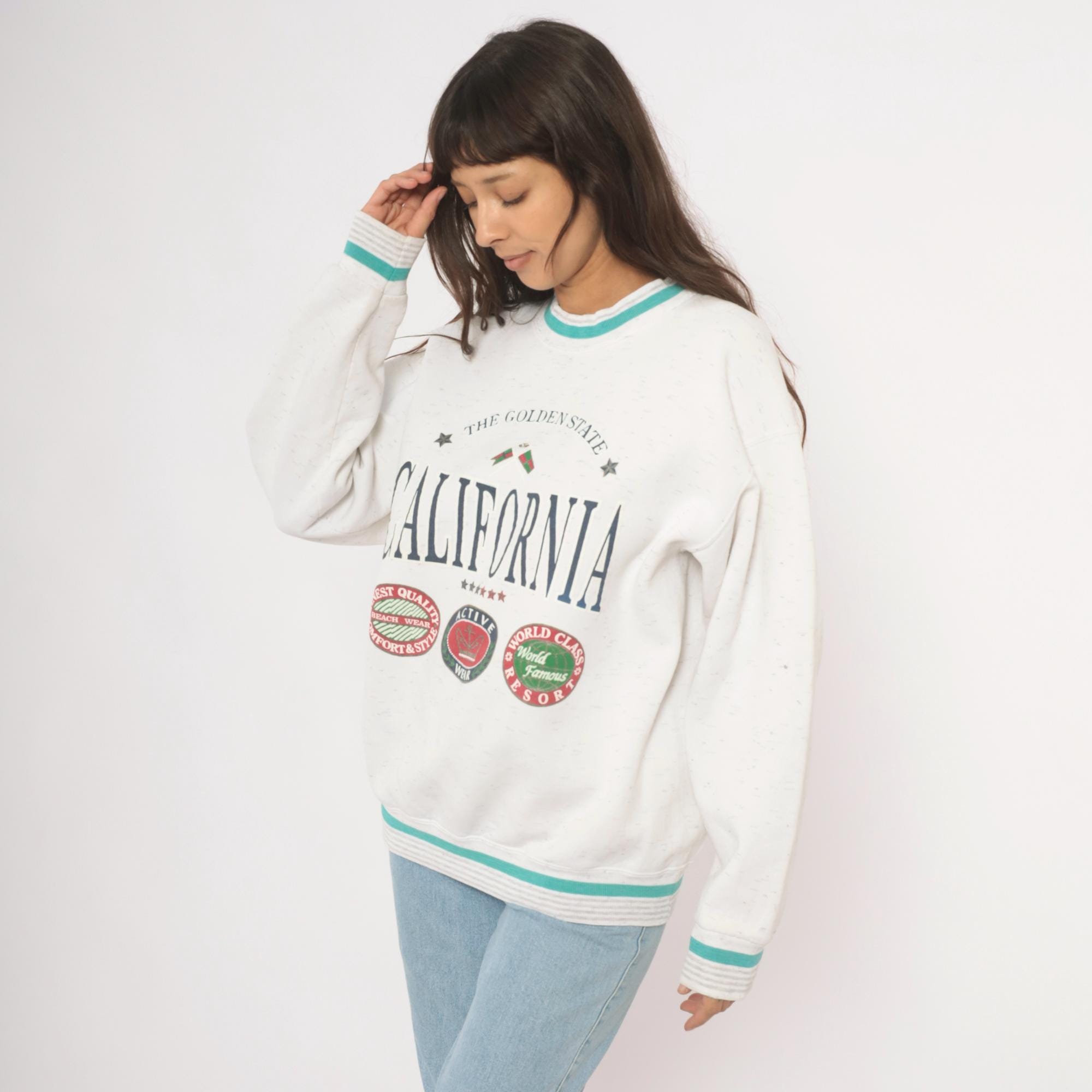 90s crewneck sweatshirt from Oneita in speckled off-white with teal striped ribbed trim at the collar, cuffs, and hem. "The Golden State California" graphic across the chest with crossed flags, stars, and three circular badge emblems reading "Finest Quality Beach Wear Comfort & Style," "Active Wear," and "World Class World Famous Resort." Relaxed fit pullover with dropped shoulders and no pockets.