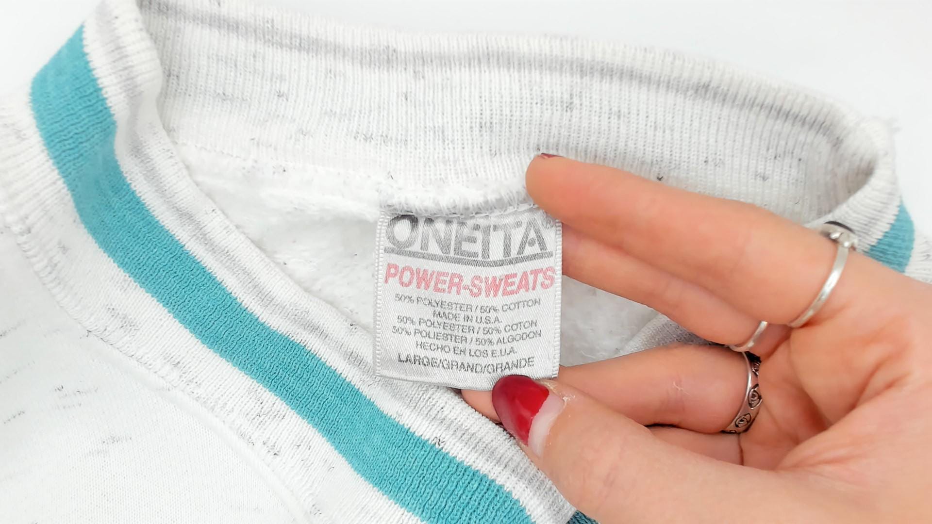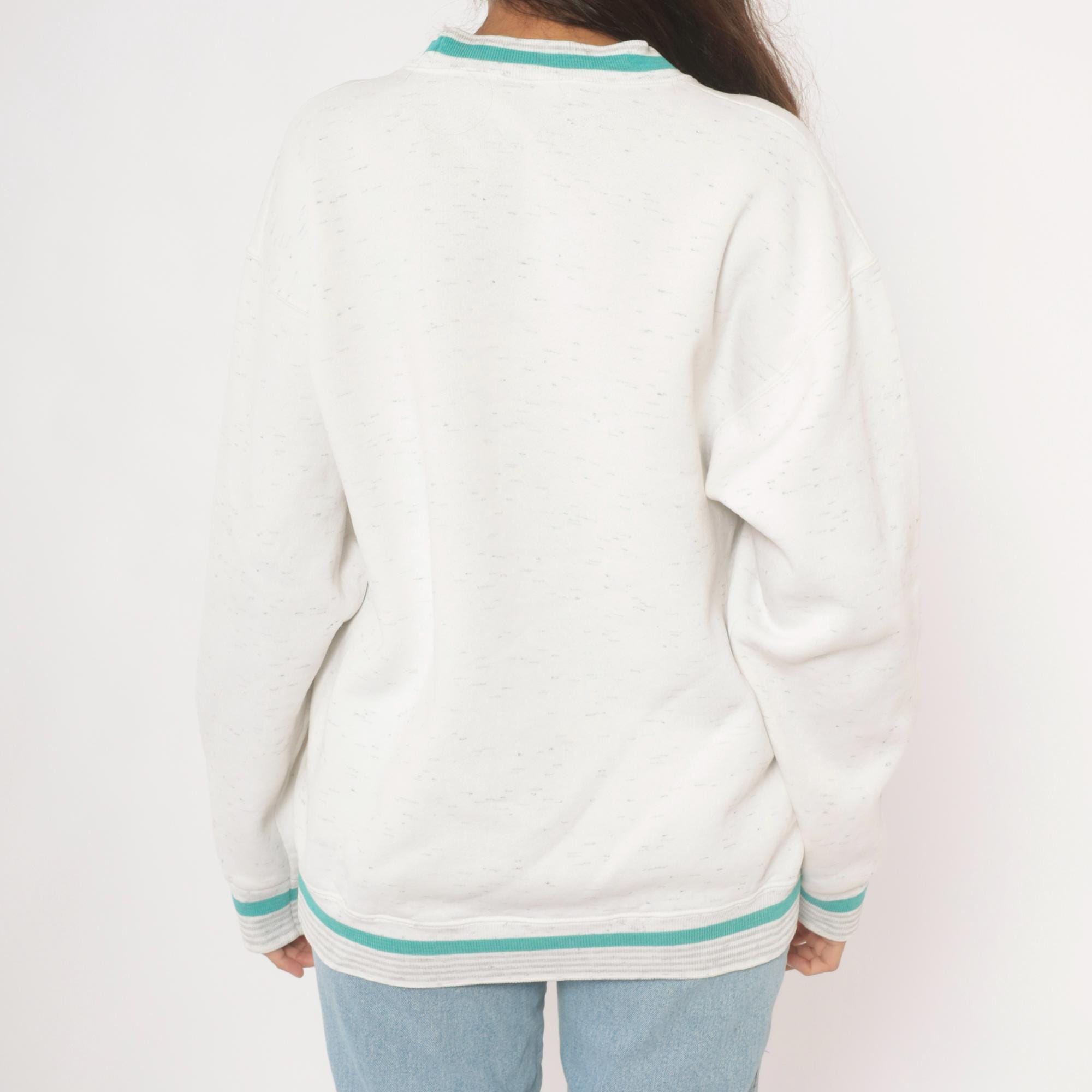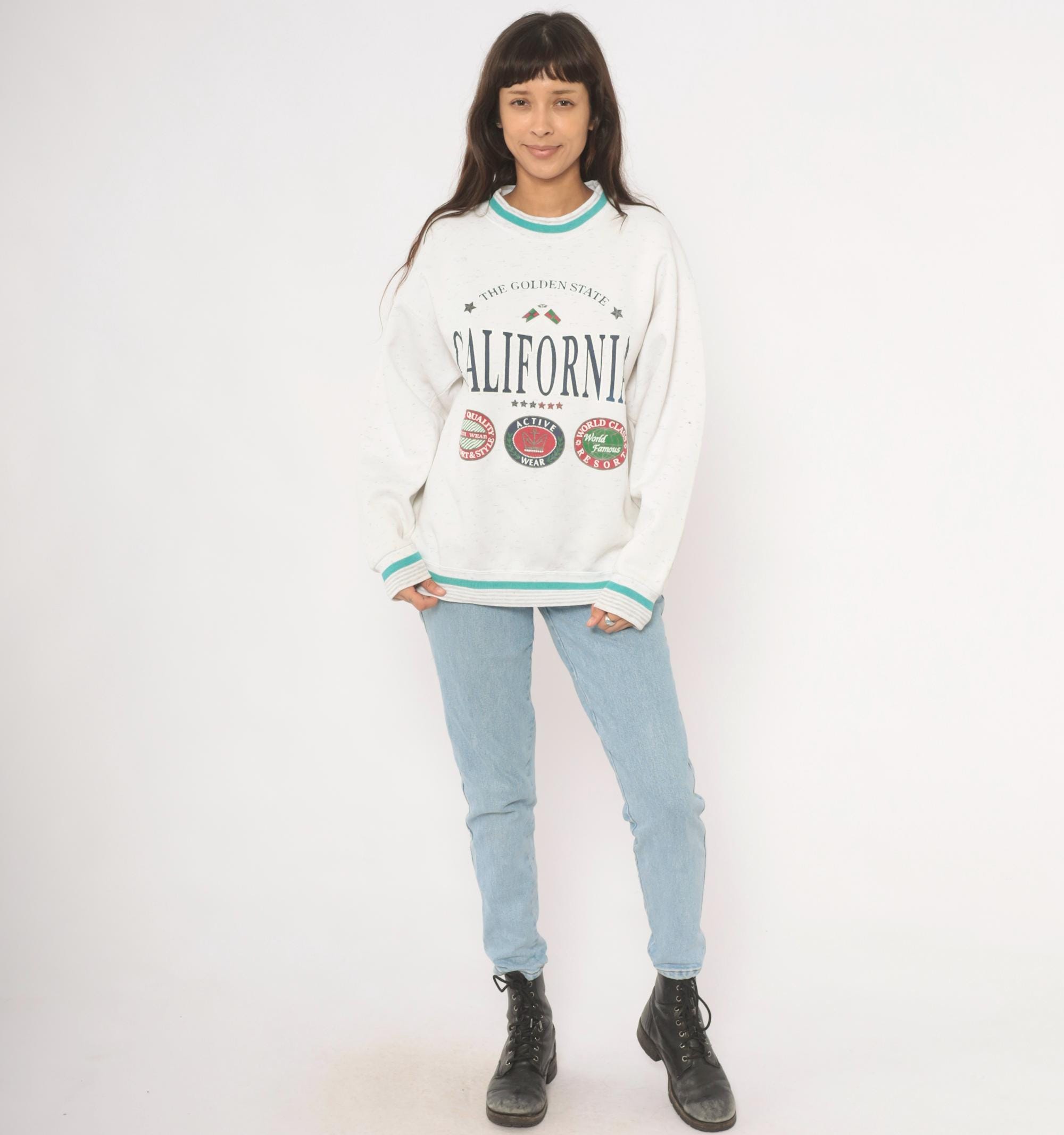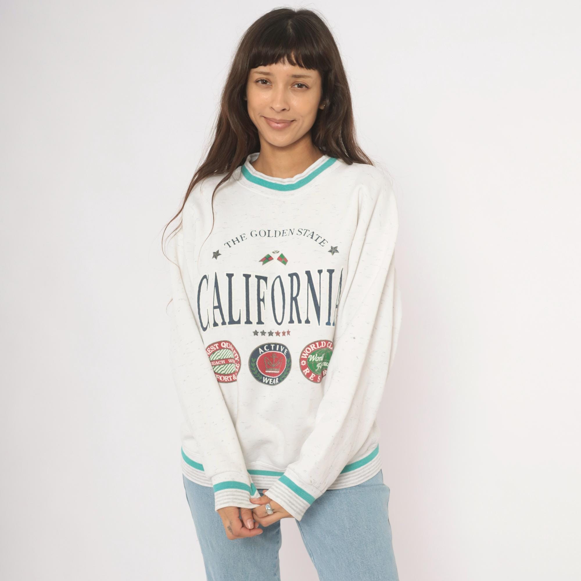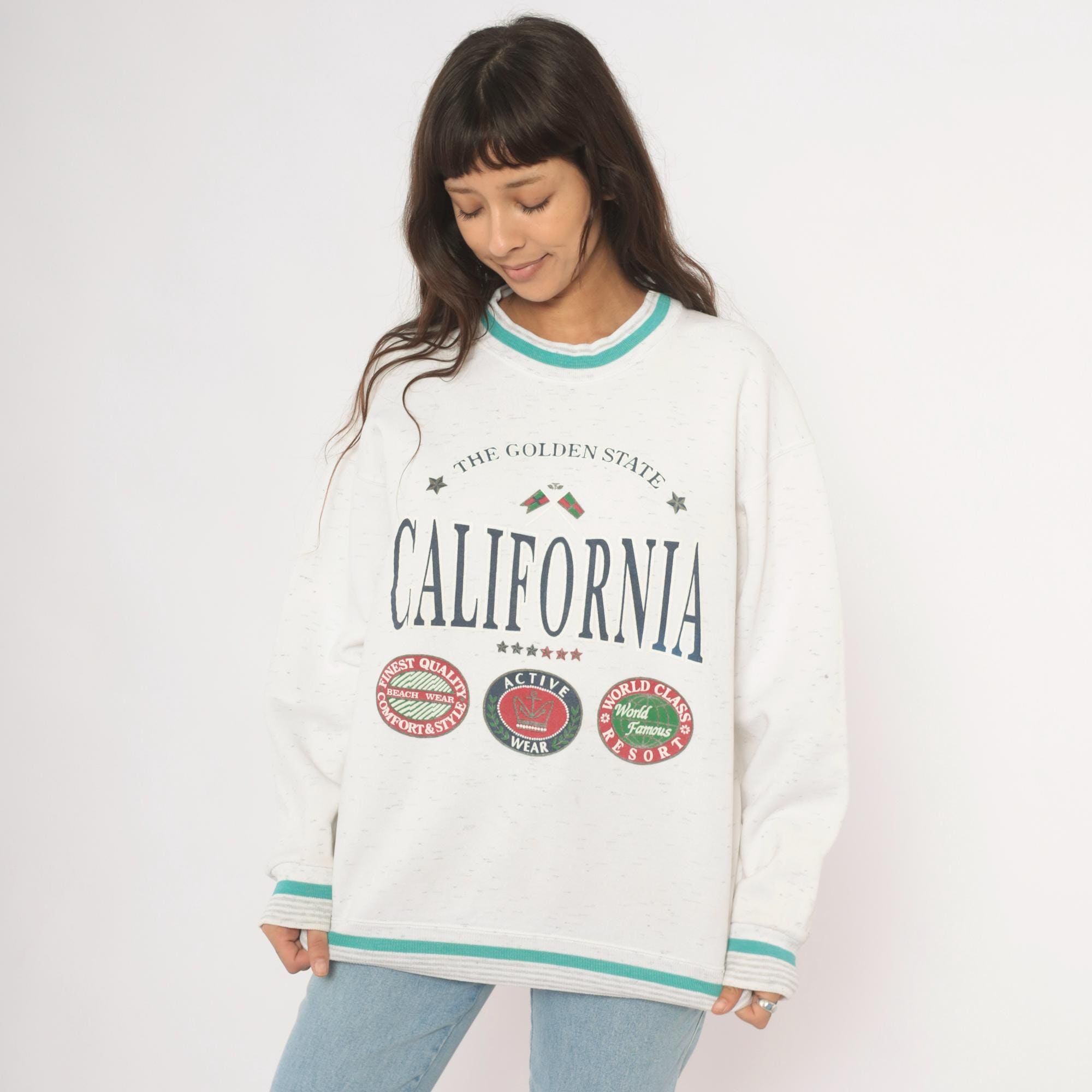 90s crewneck sweatshirt from Oneita in speckled off-white with teal striped ribbed trim at the collar, cuffs, and hem. "The Golden State California" graphic across the chest with crossed flags, stars, and three circular badge emblems reading "Finest Quality Beach Wear Comfort & Style," "Active Wear," and "World Class World Famous Resort." Relaxed fit pullover with dropped shoulders and no pockets.
