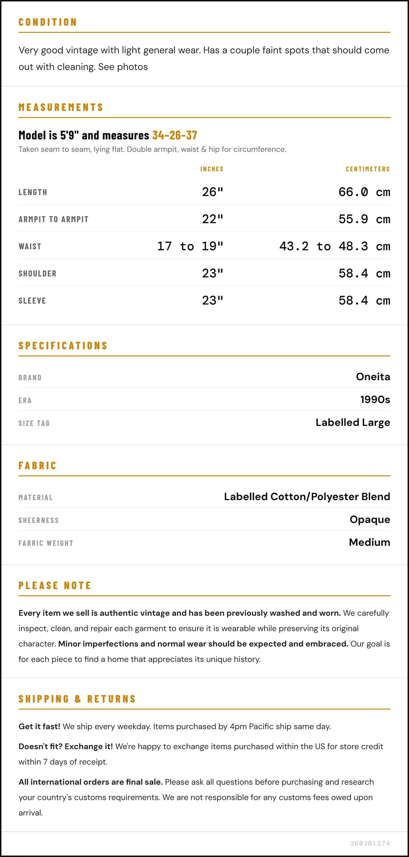 Vintage denim was usually made without any stretch, unlike modern jeans. Check the measurements to ensure proper fit, and remember to give yourself a little wiggle room in the waist and hips, depending on your preferred fit.