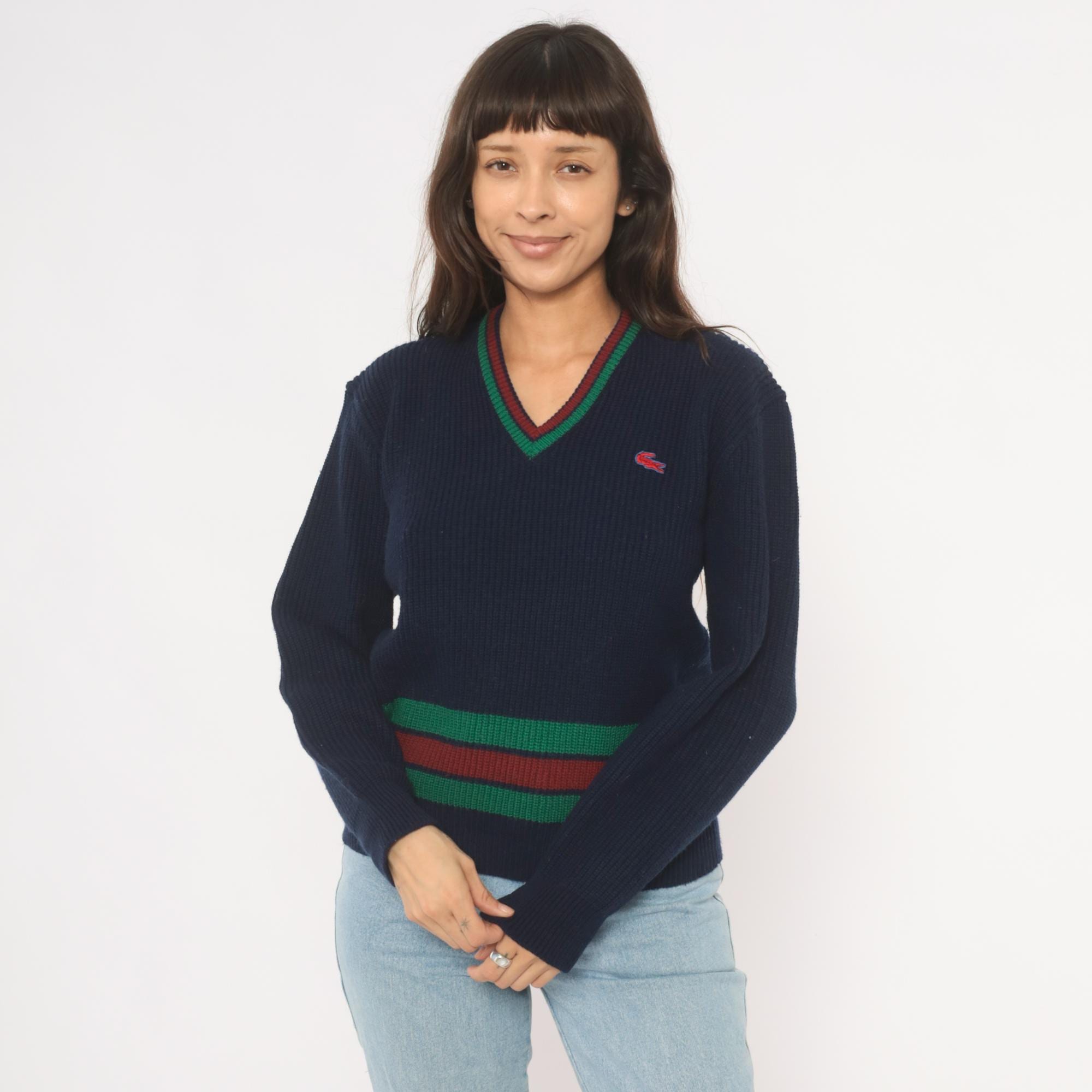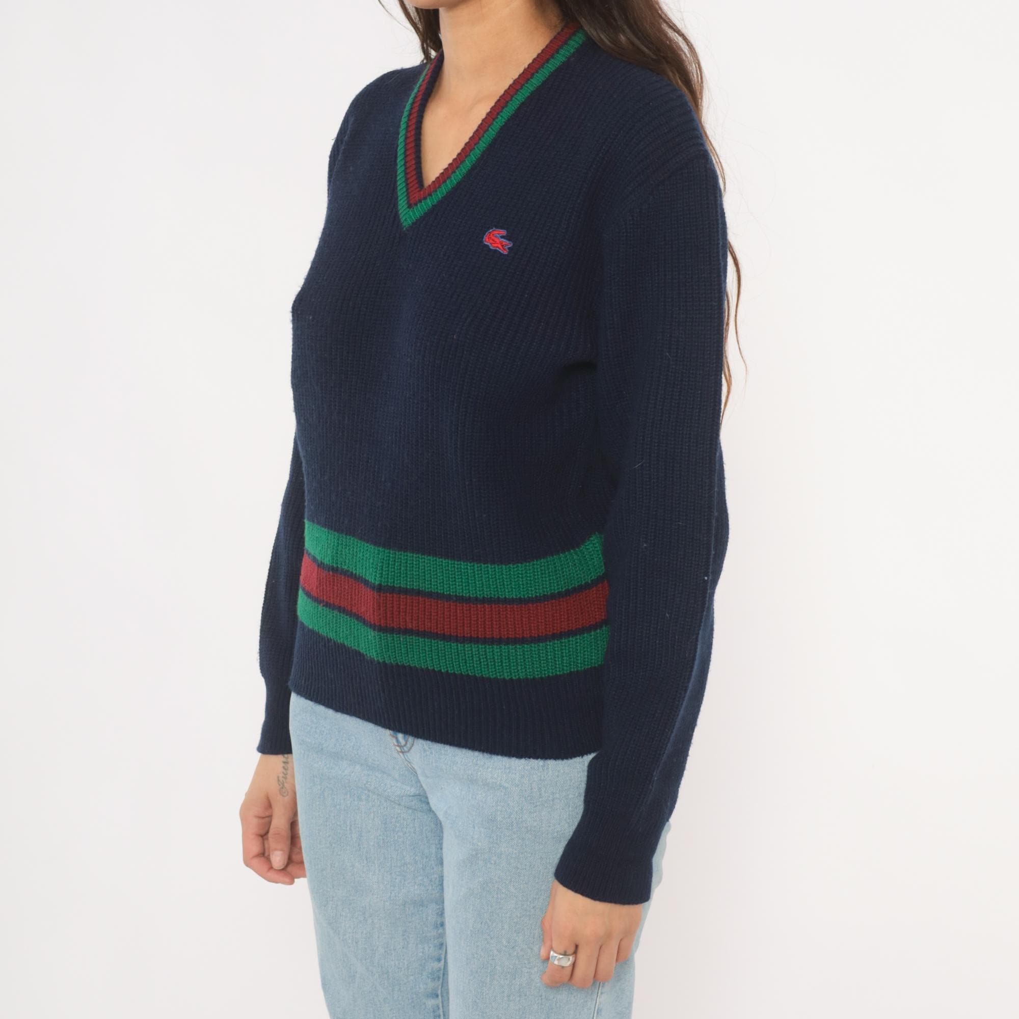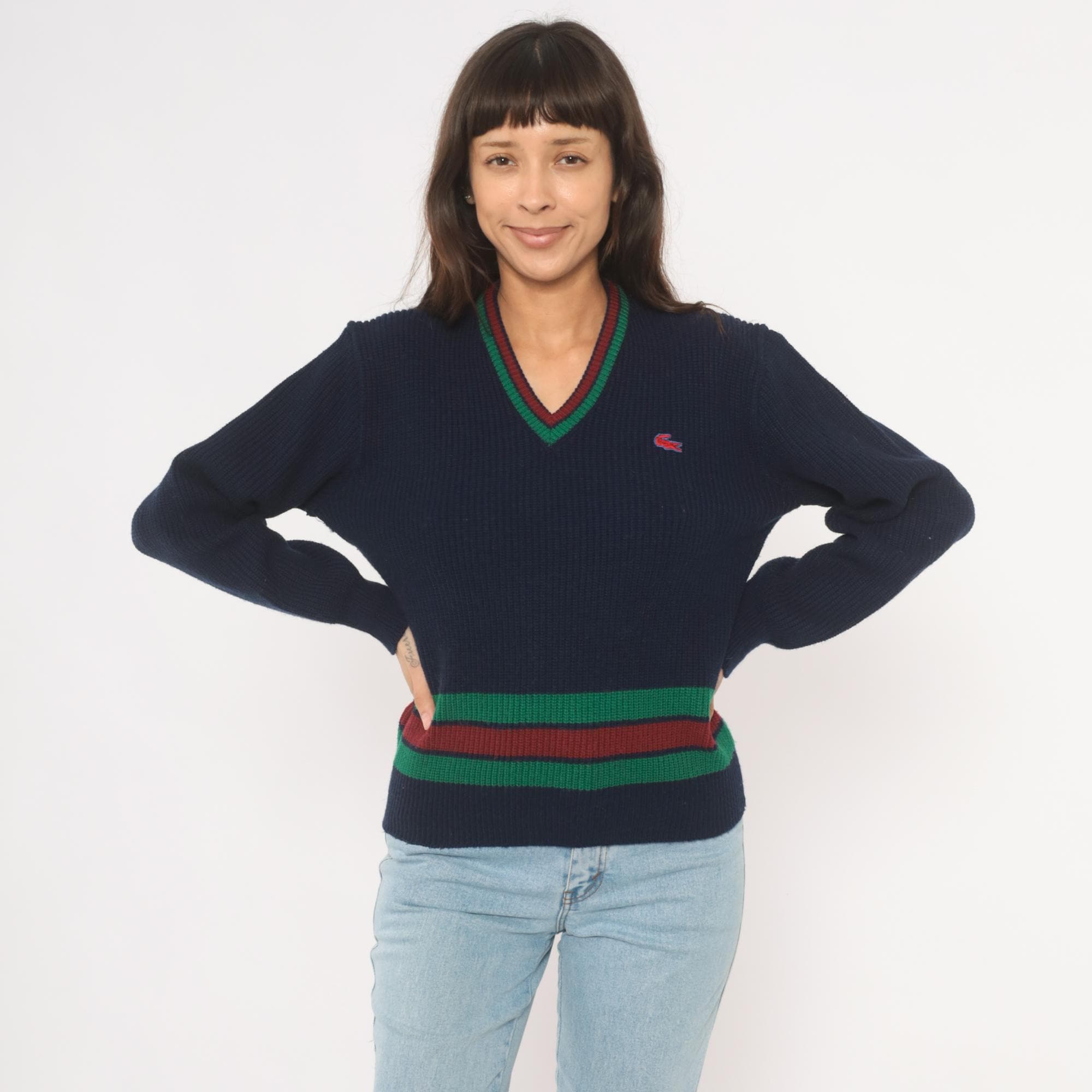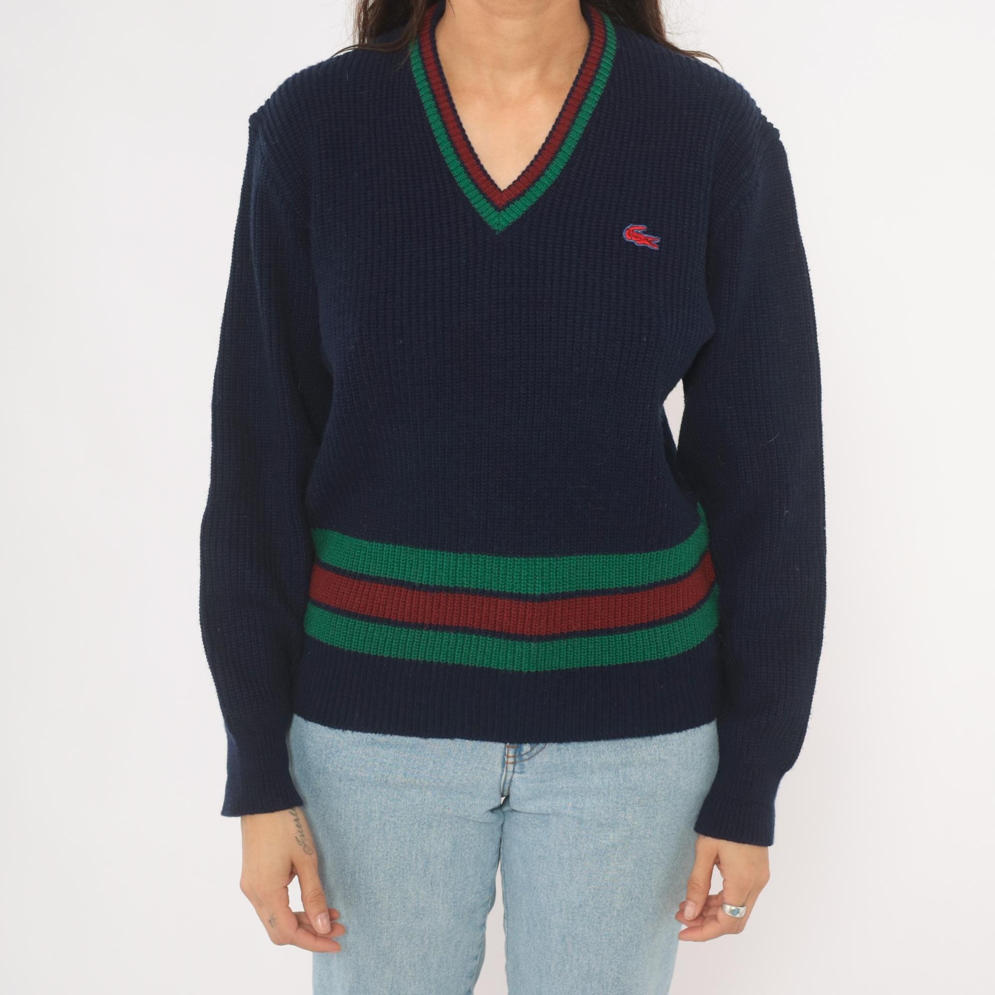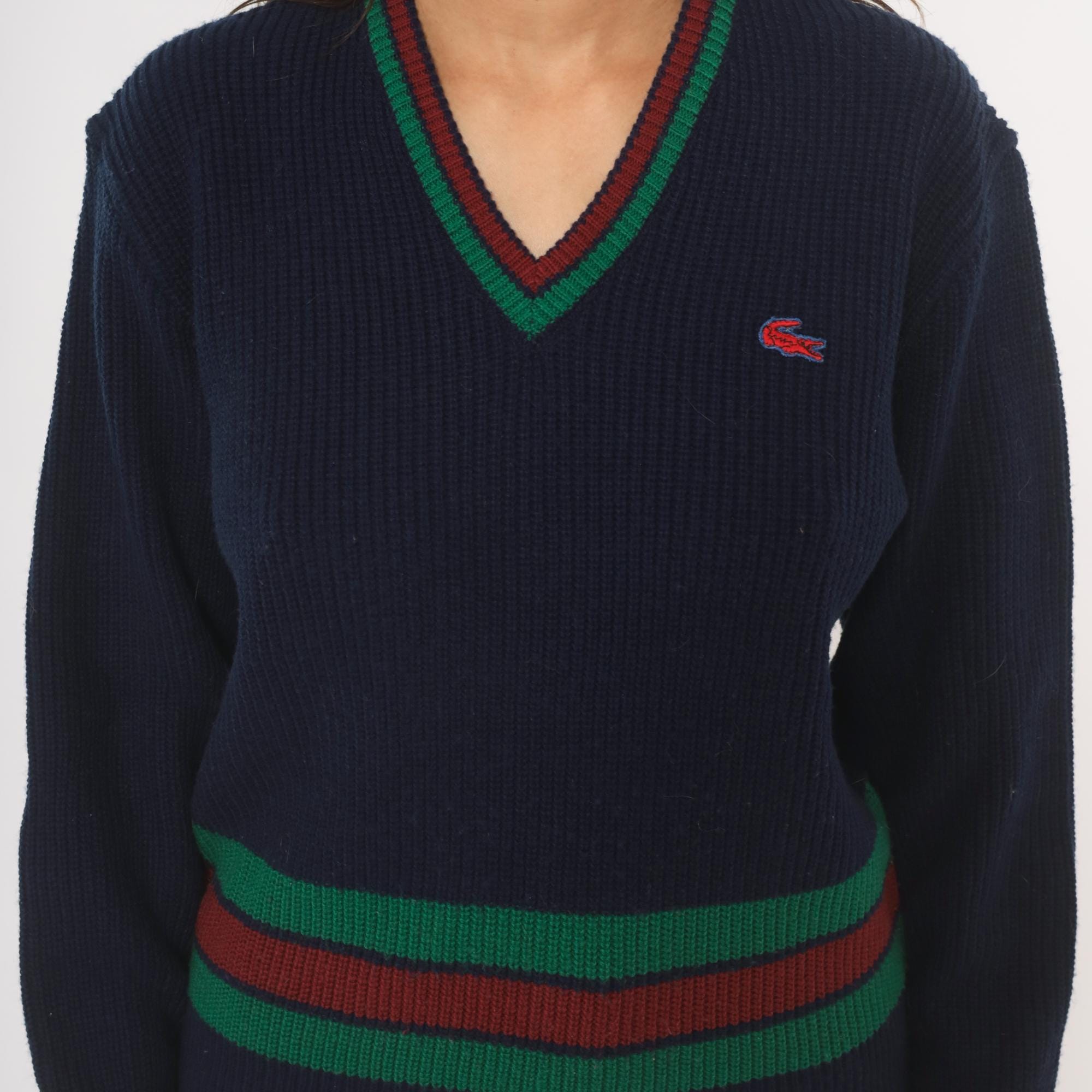 80s navy Lacoste V-neck pullover sweater with green and burgundy striped banding at the hem and neckline. Ribbed knit construction throughout with a red and blue embroidered crocodile logo on the left chest. Long sleeves with ribbed cuffs and a cricket-style striped waistband that wraps around the full body.
