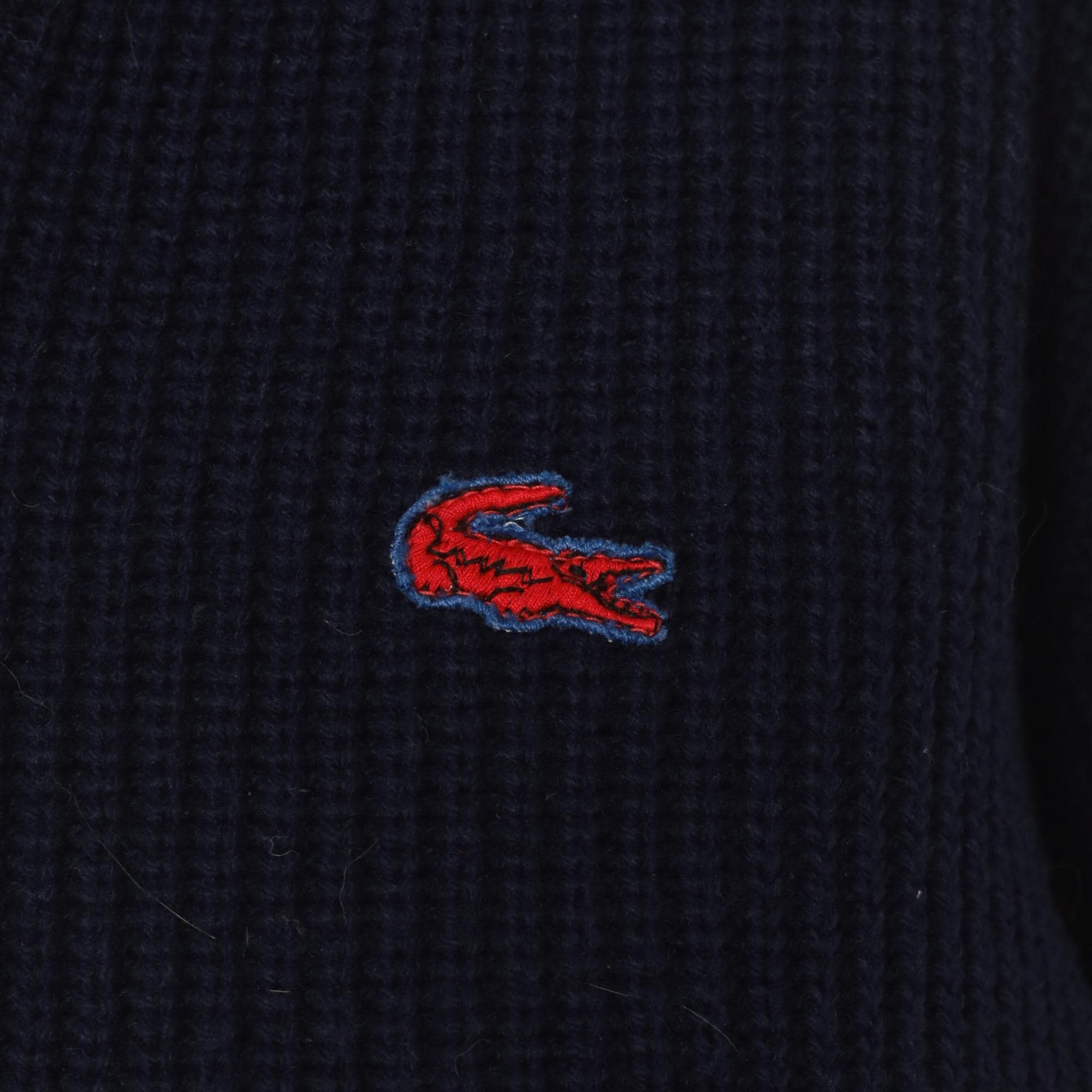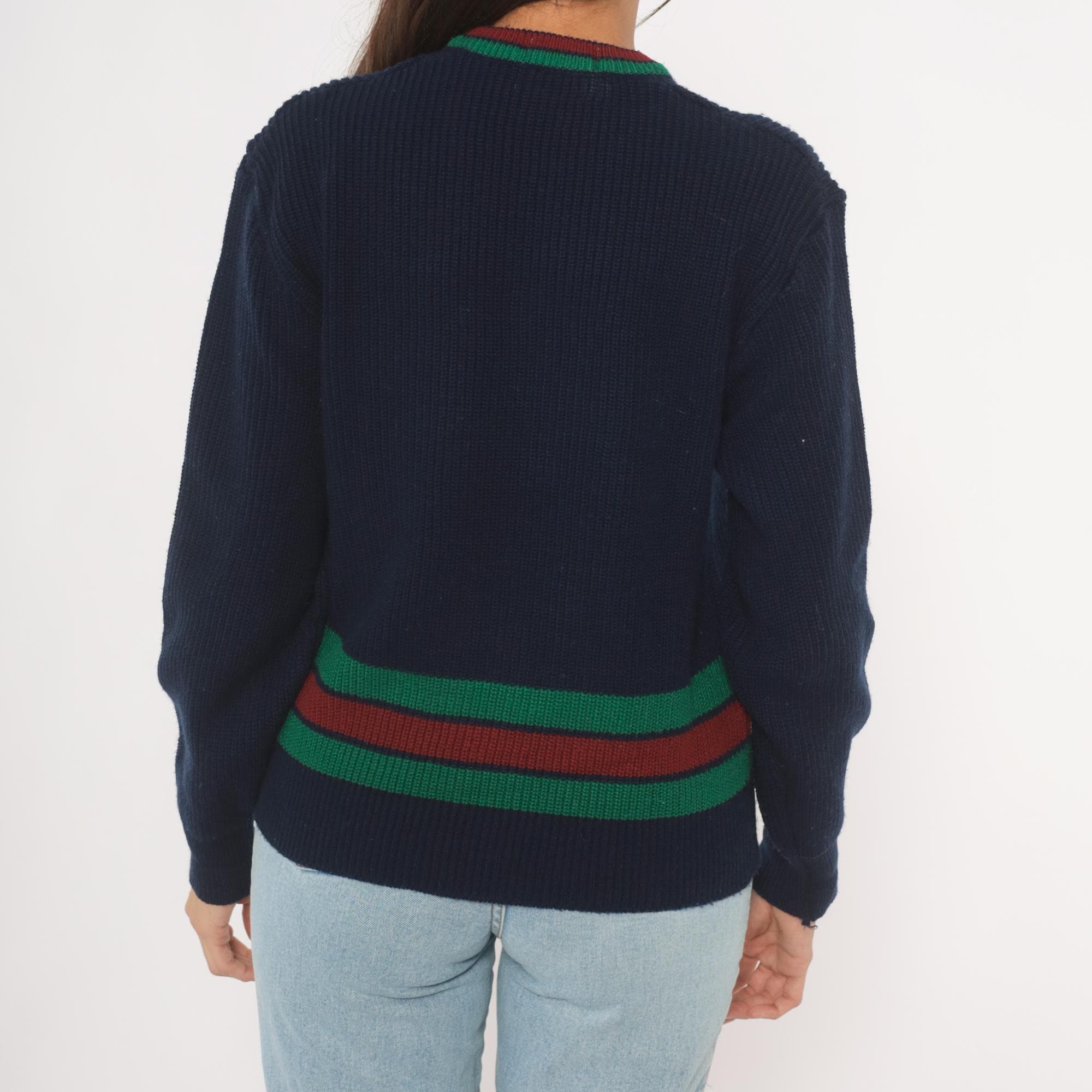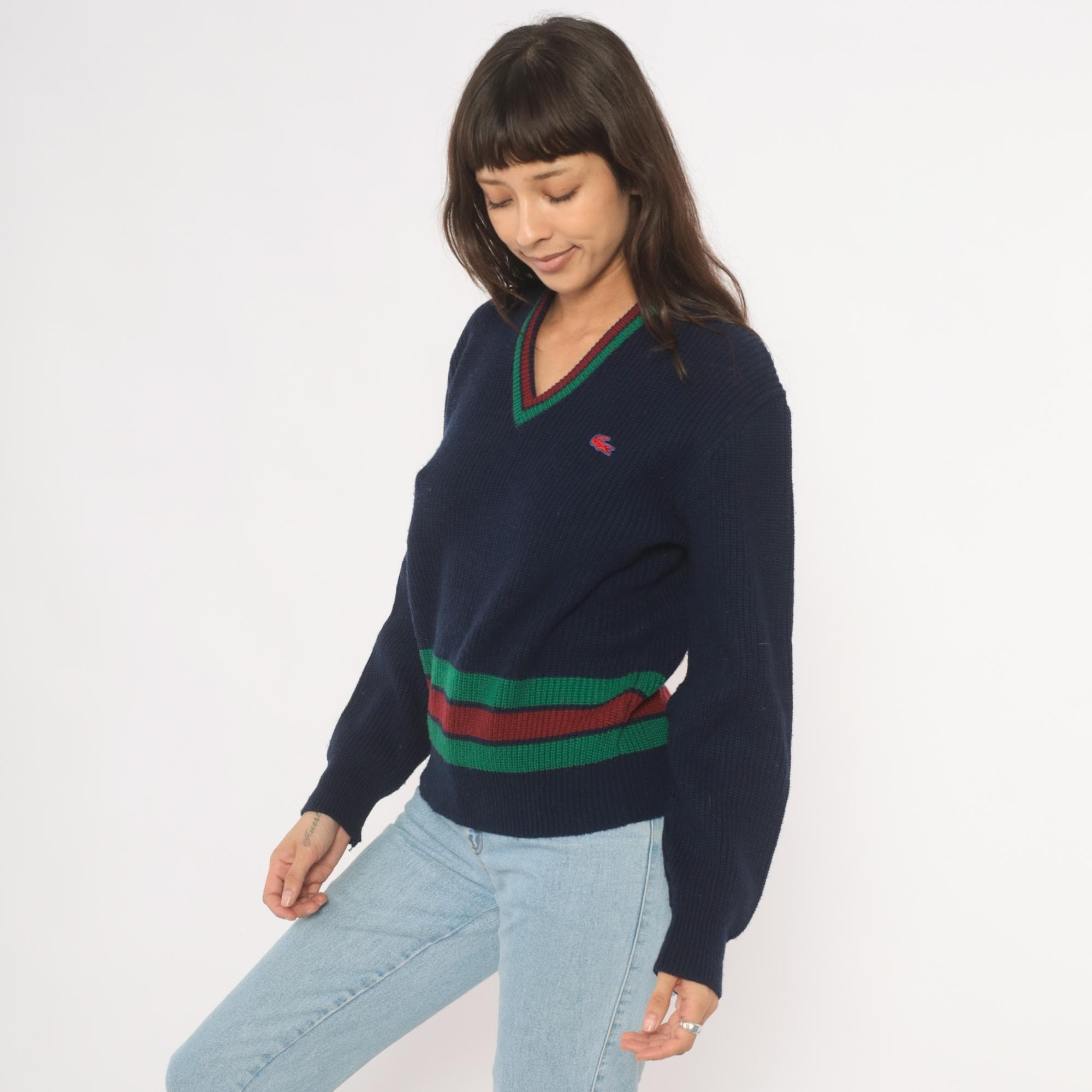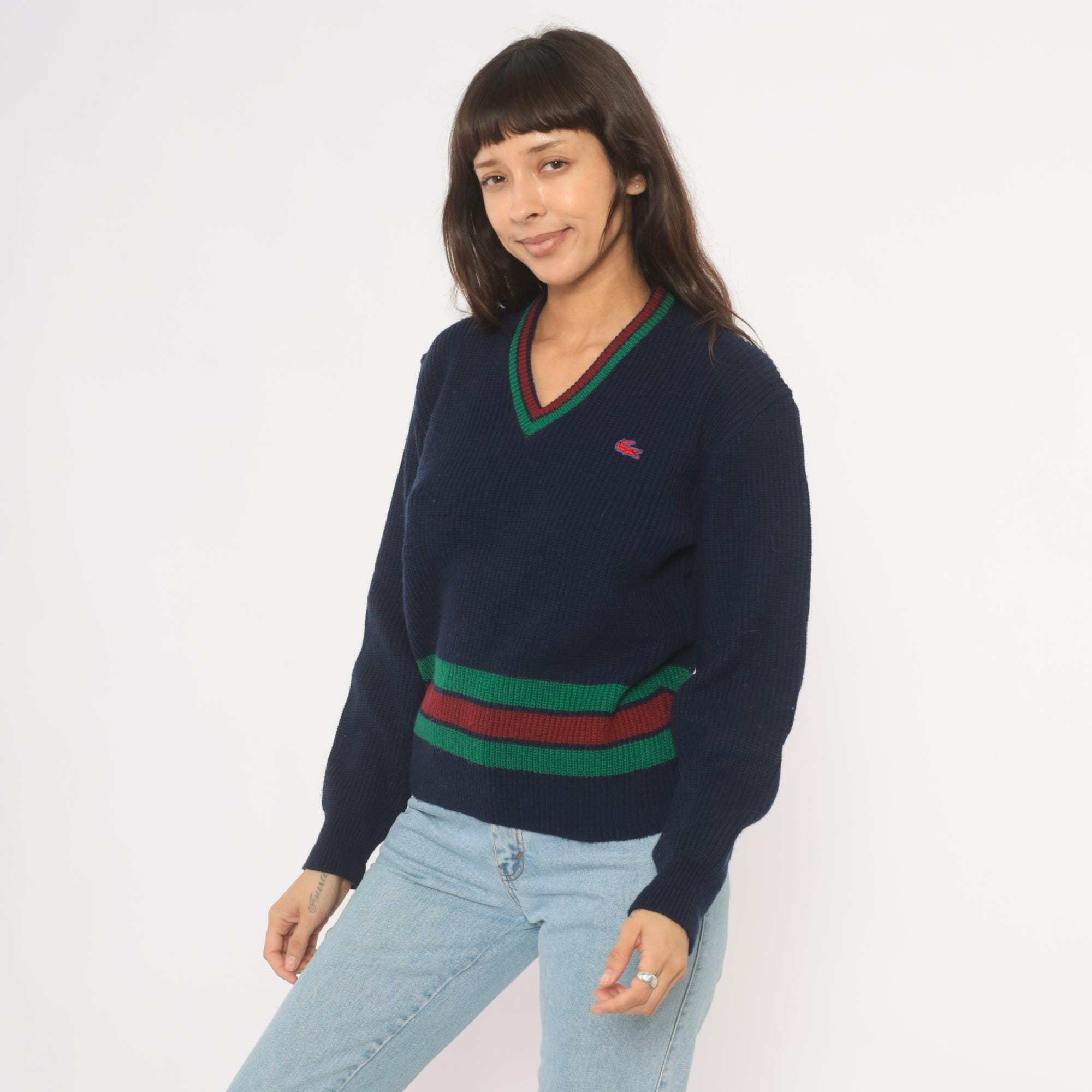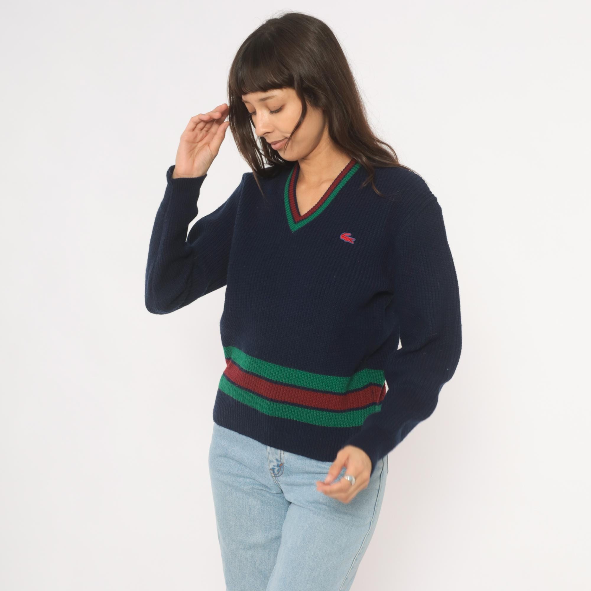 80s navy Lacoste V-neck pullover sweater with green and burgundy striped banding at the hem and neckline. Ribbed knit construction throughout with a red and blue embroidered crocodile logo on the left chest. Long sleeves with ribbed cuffs and a cricket-style striped waistband that wraps around the full body.