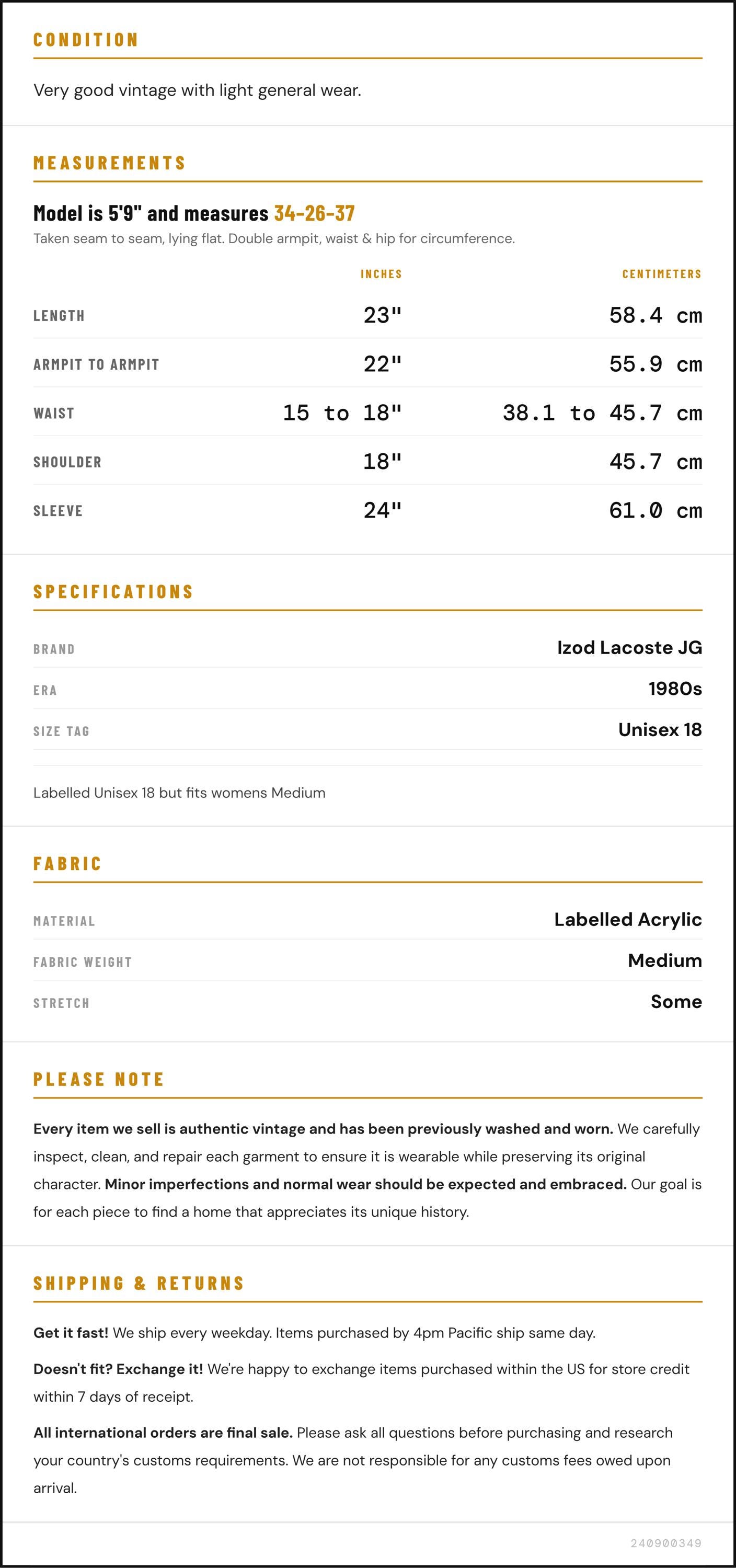 Measurements are taken laying flat and should be doubled where applicable. The "best fits" size is just an estimate, and vintage sizing can vary from modern sizing. Please use measurements to ensure proper fit. The best thing to do is measure a similar item of your own, and compare. When an item has stretch, we will list the unstretched dimensions with the stretched measurement afterwards.