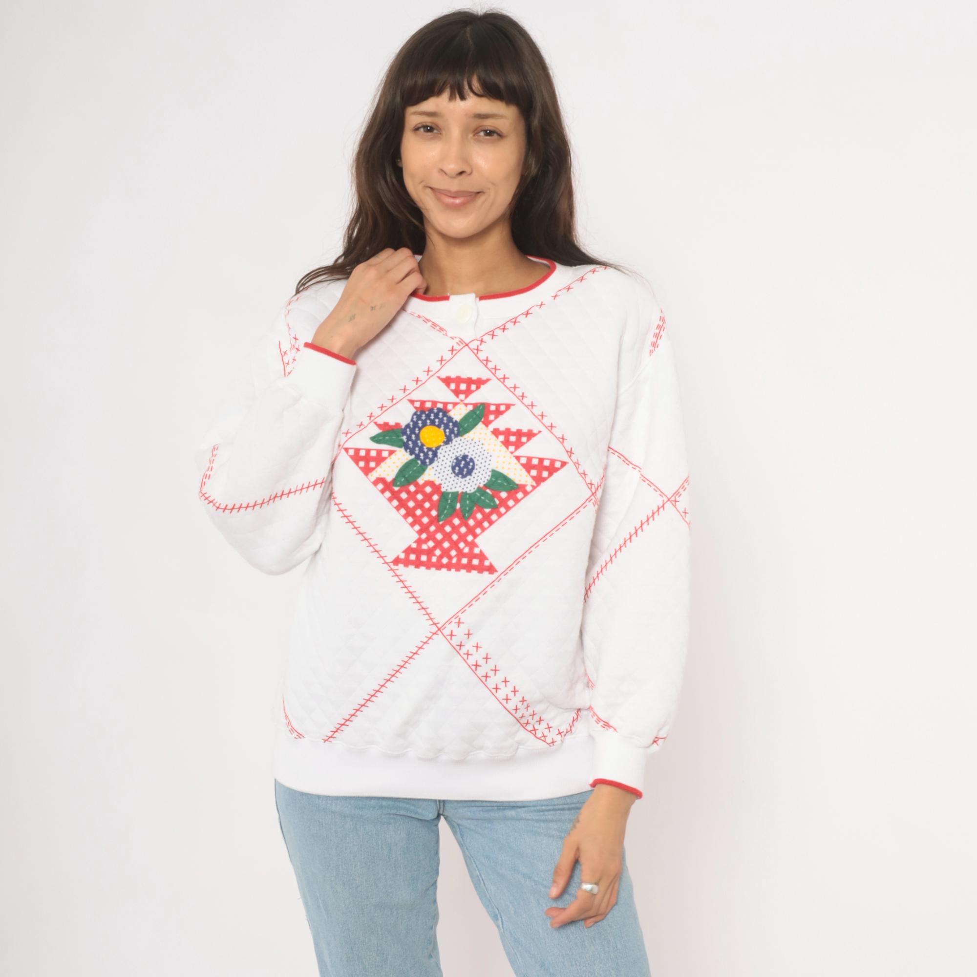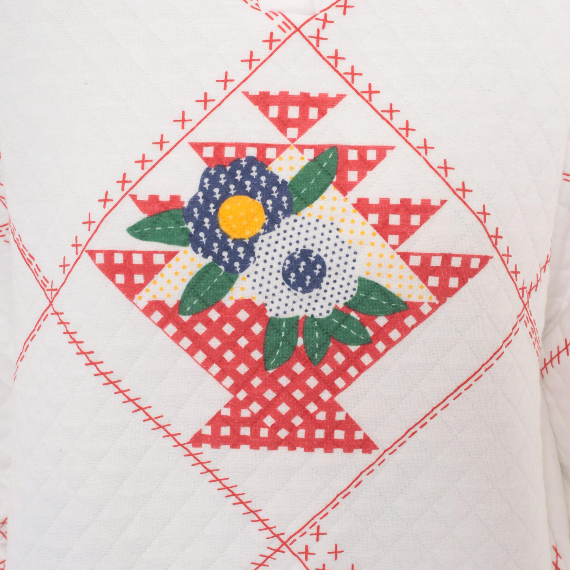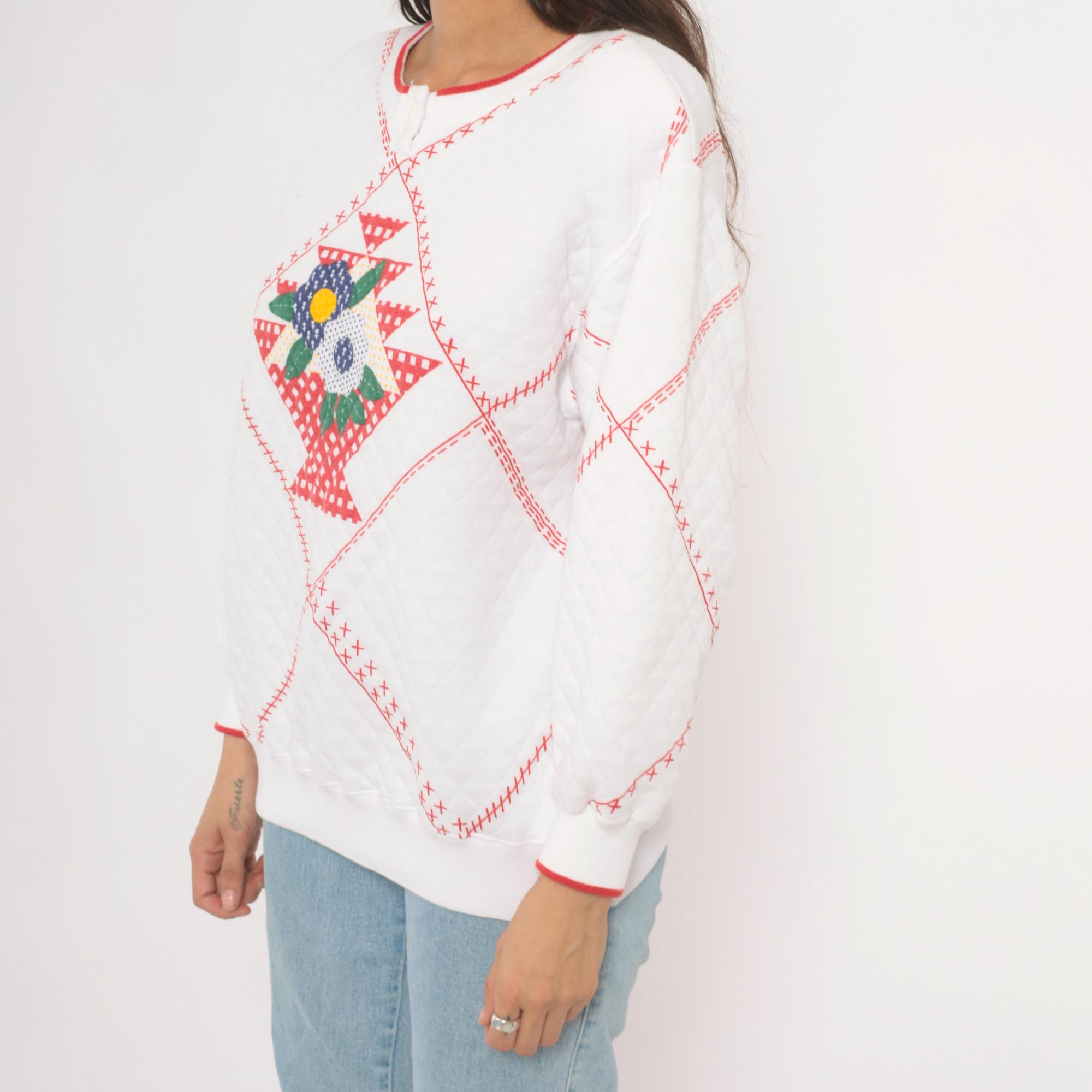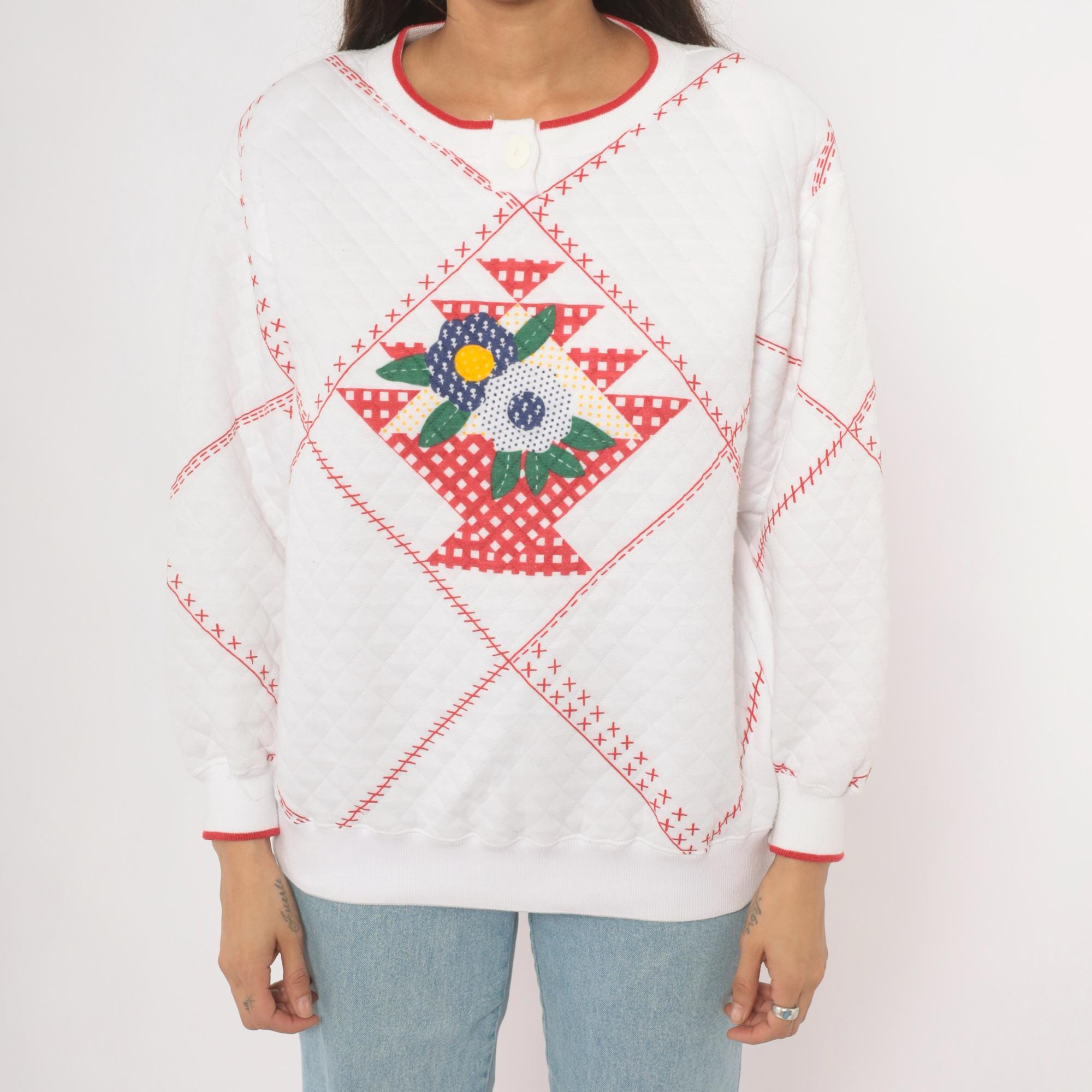 80s white quilted henley sweatshirt from Jason Maxwell Petite with a red cross-stitch patchwork print throughout and a floral applique at center front. Navy, green, yellow, and red flowers with green leaf embroidery sit within a diamond-shaped gingham basket motif. Round neckline with red contrast trim and single button closure, ribbed cuffs with red piping, and ribbed hem.