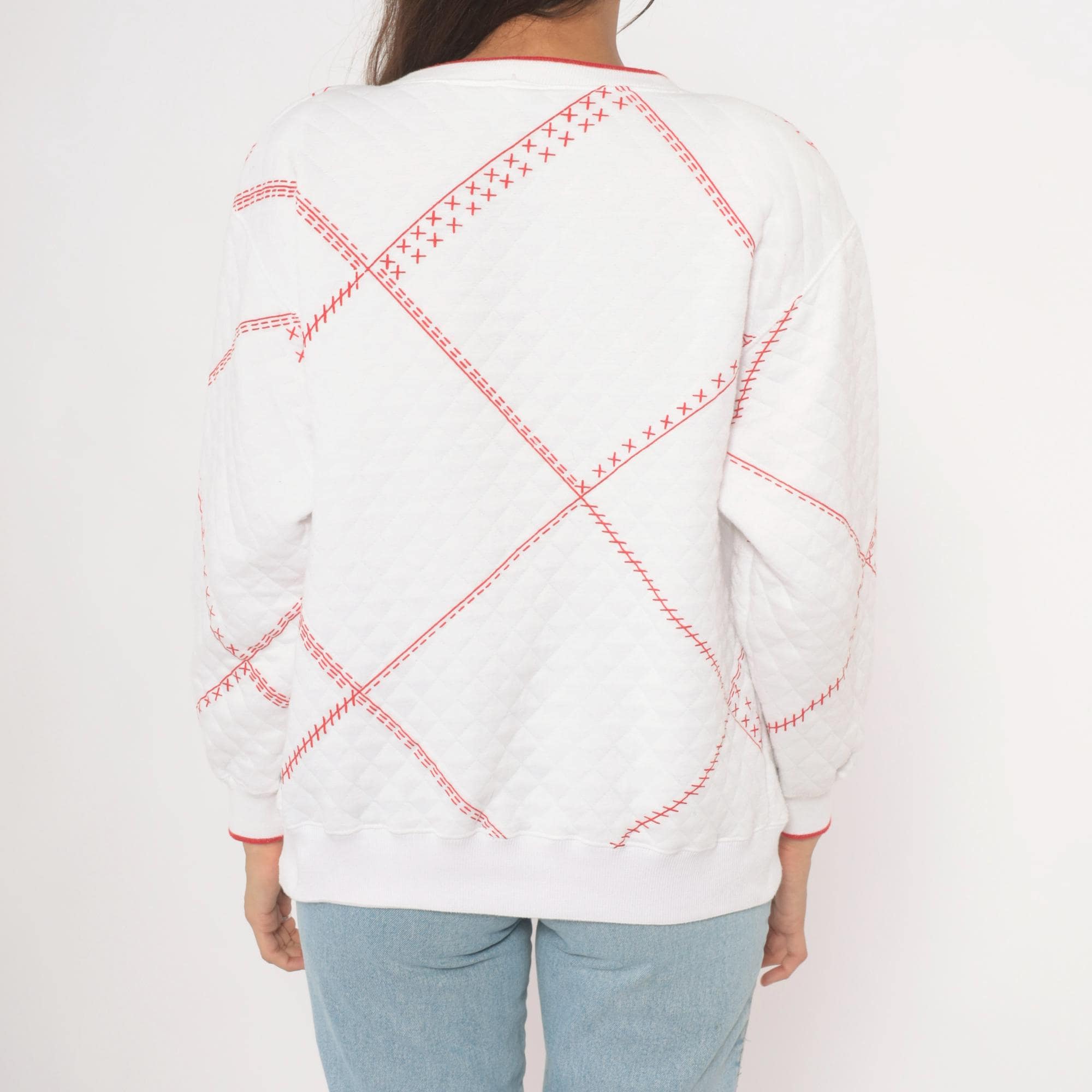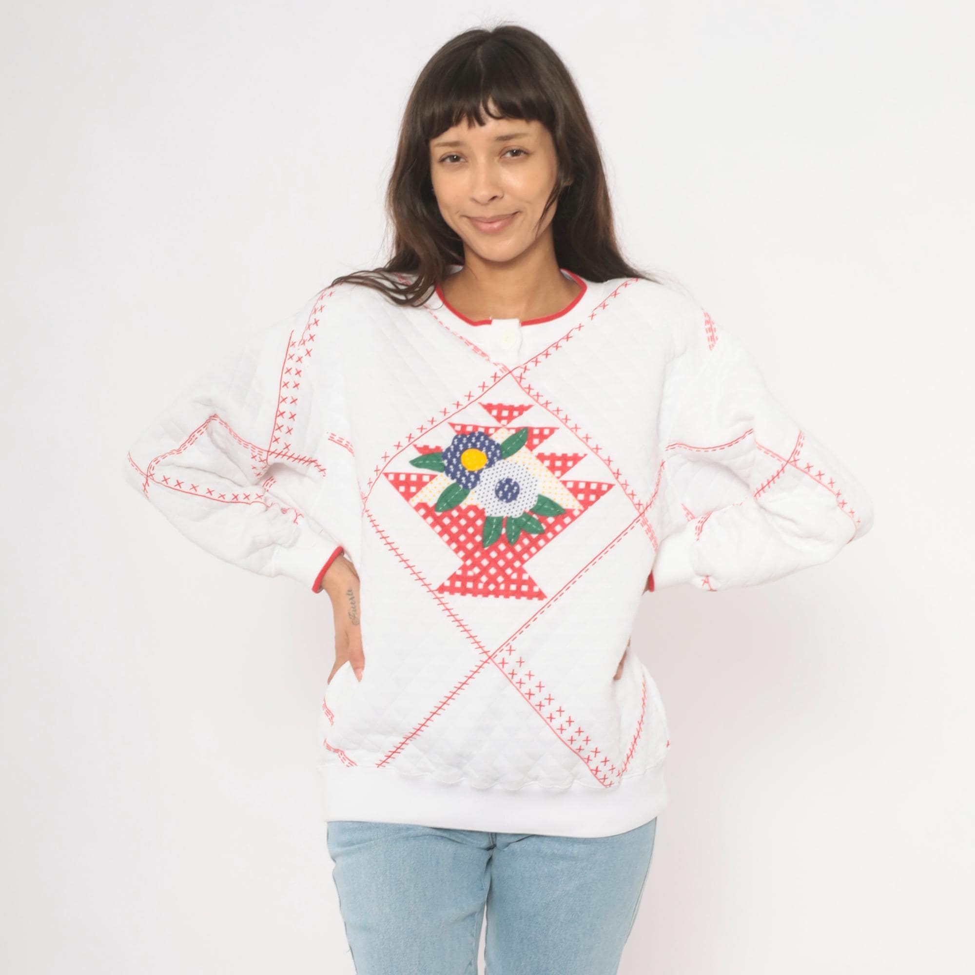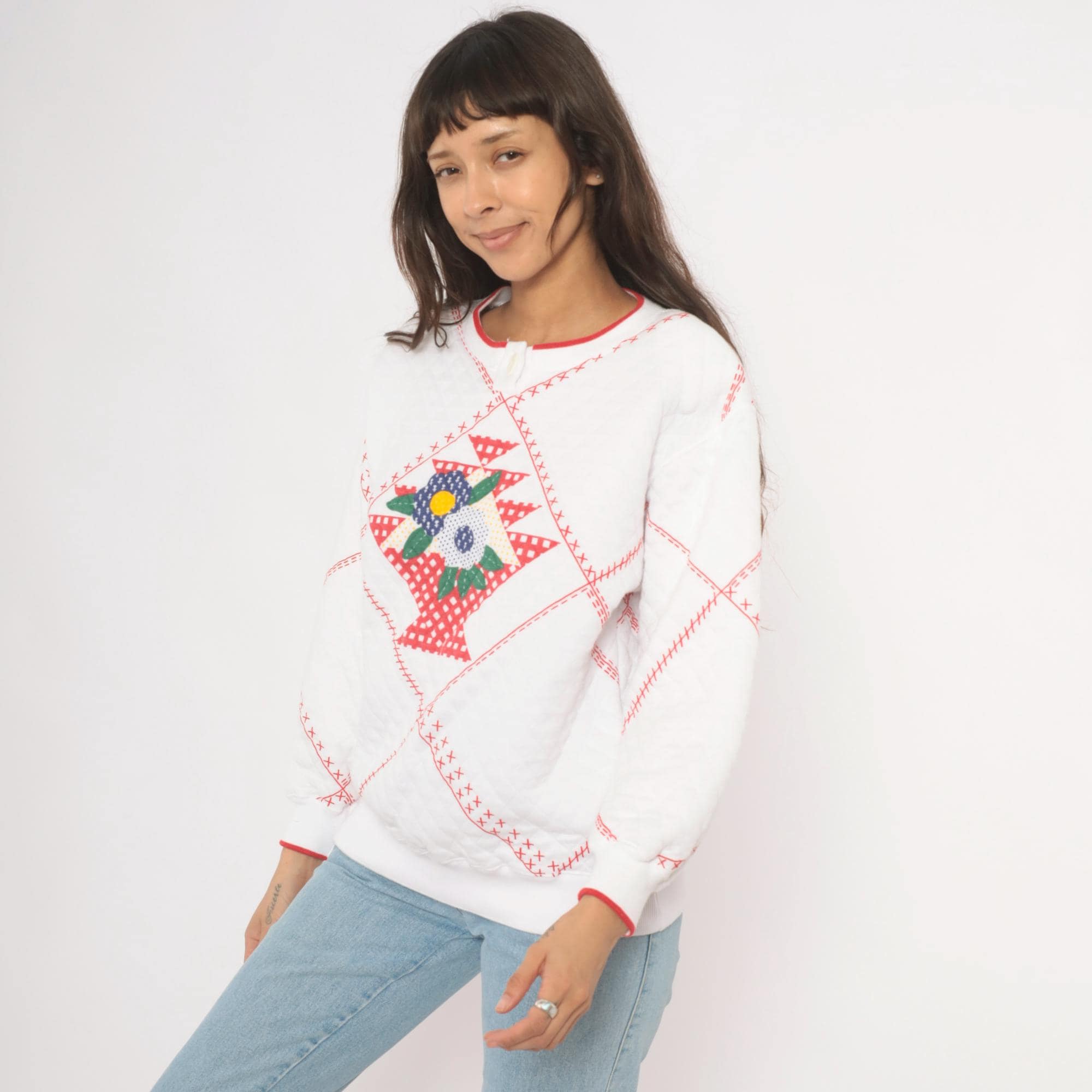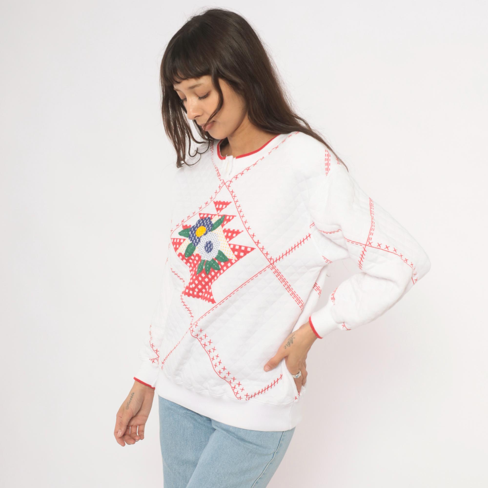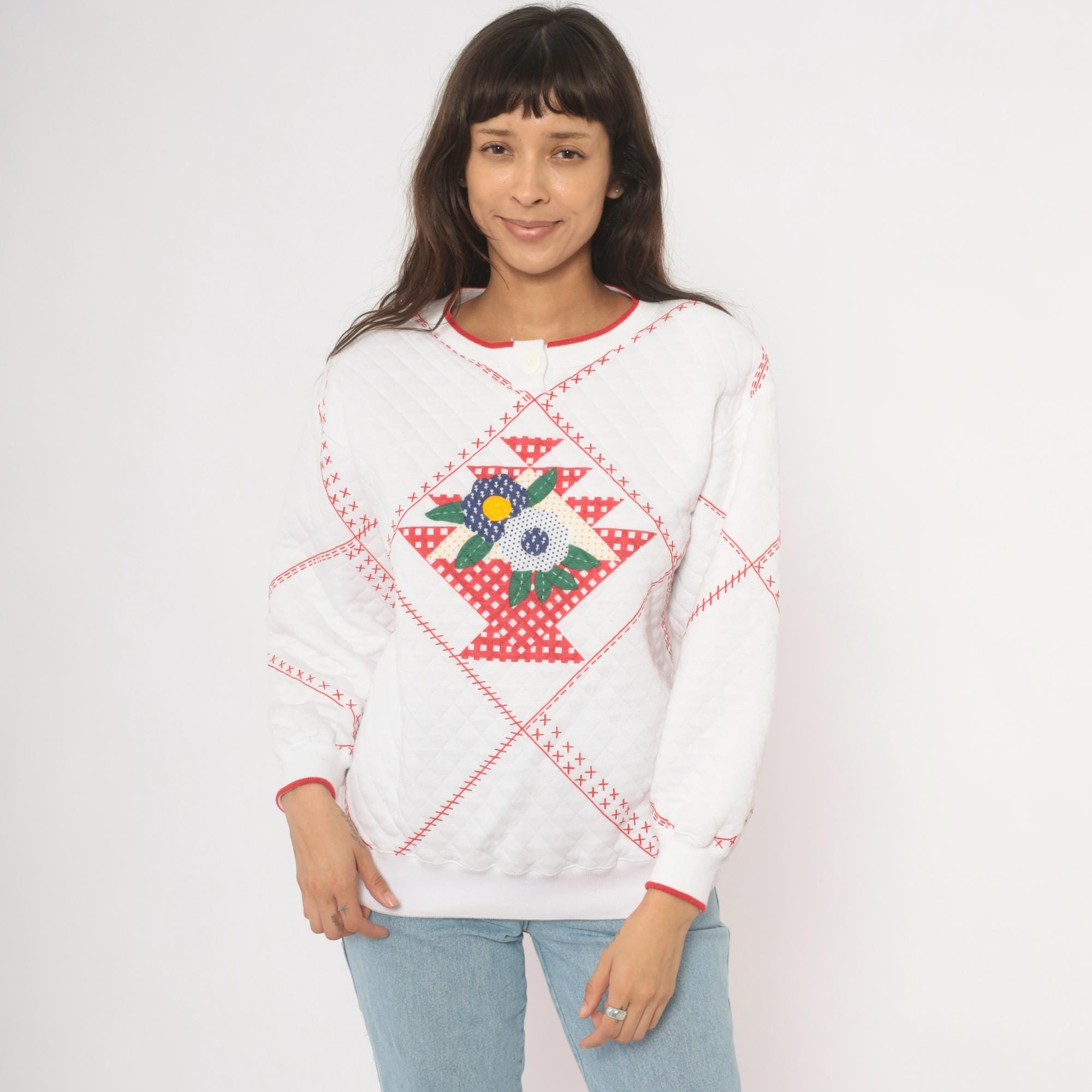 80s white quilted henley sweatshirt from Jason Maxwell Petite with a red cross-stitch patchwork print throughout and a floral applique at center front. Navy, green, yellow, and red flowers with green leaf embroidery sit within a diamond-shaped gingham basket motif. Round neckline with red contrast trim and single button closure, ribbed cuffs with red piping, and ribbed hem.