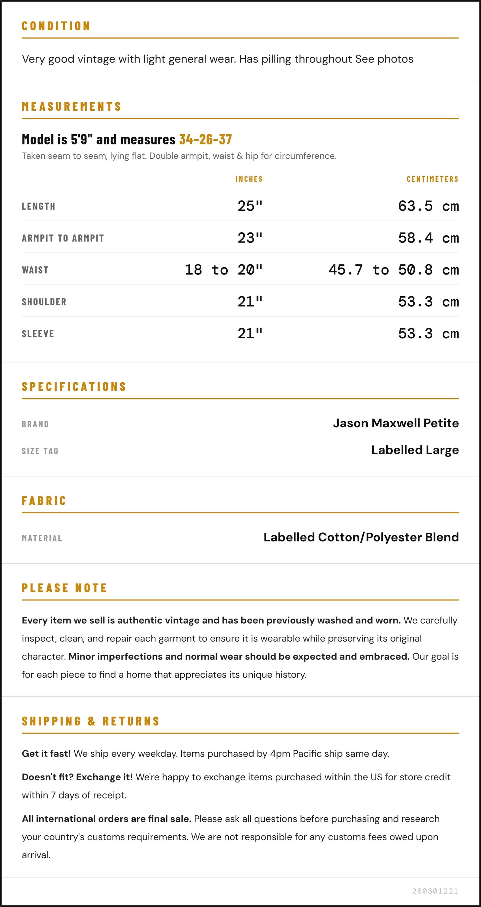 Condition: Very good vintage with light general wear. Has pilling throughout See photos