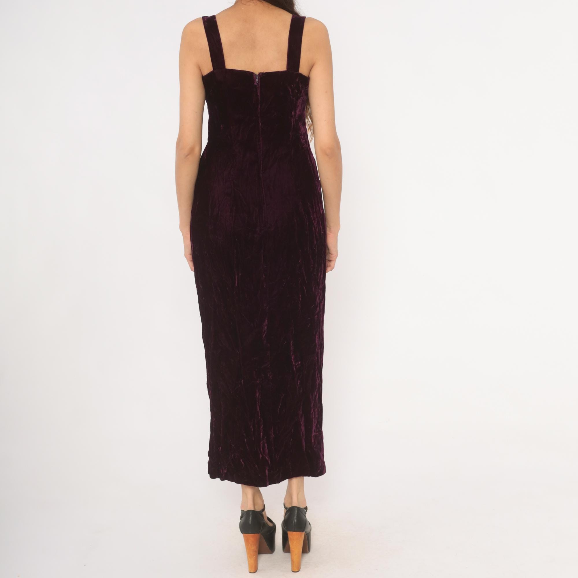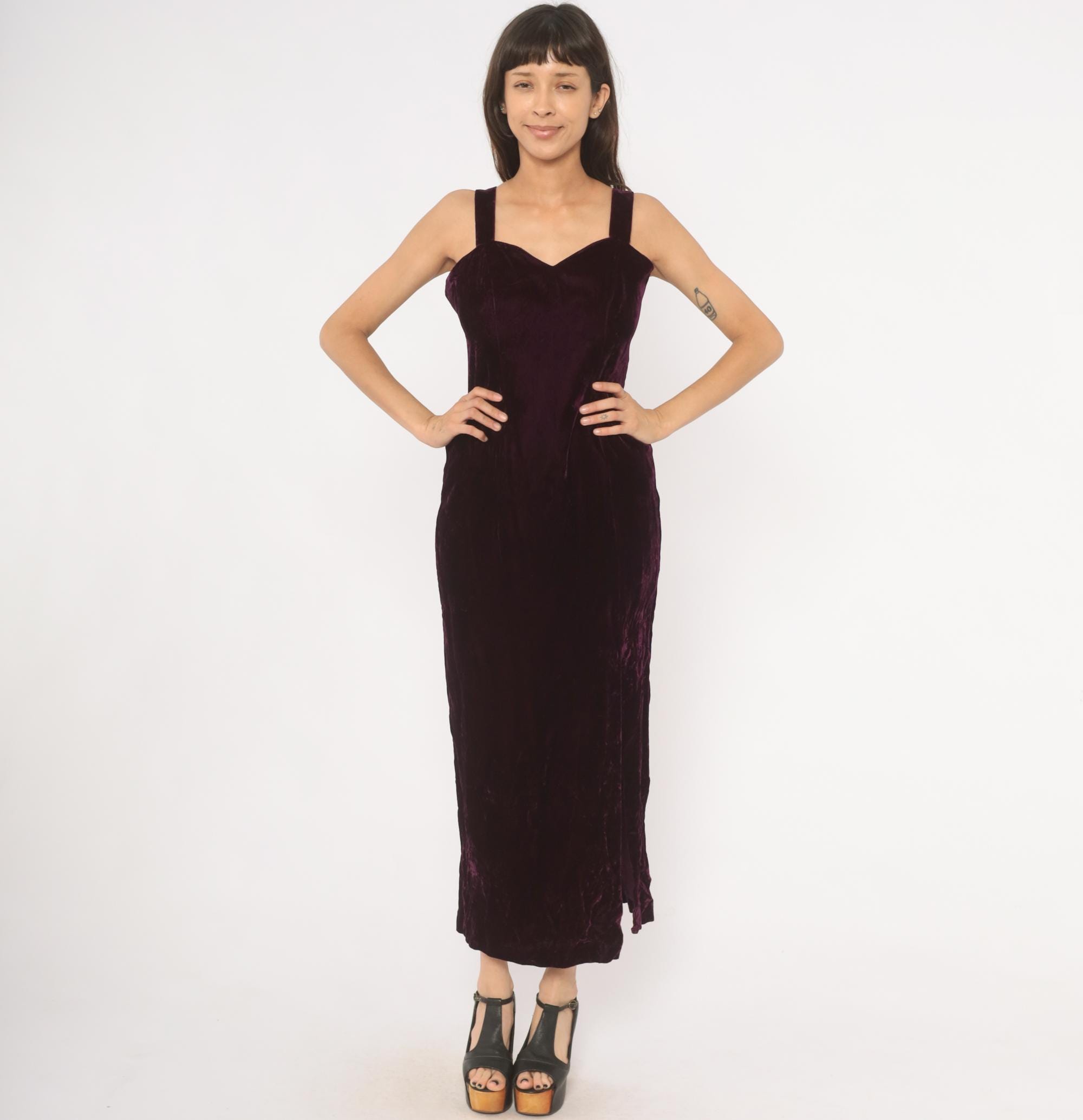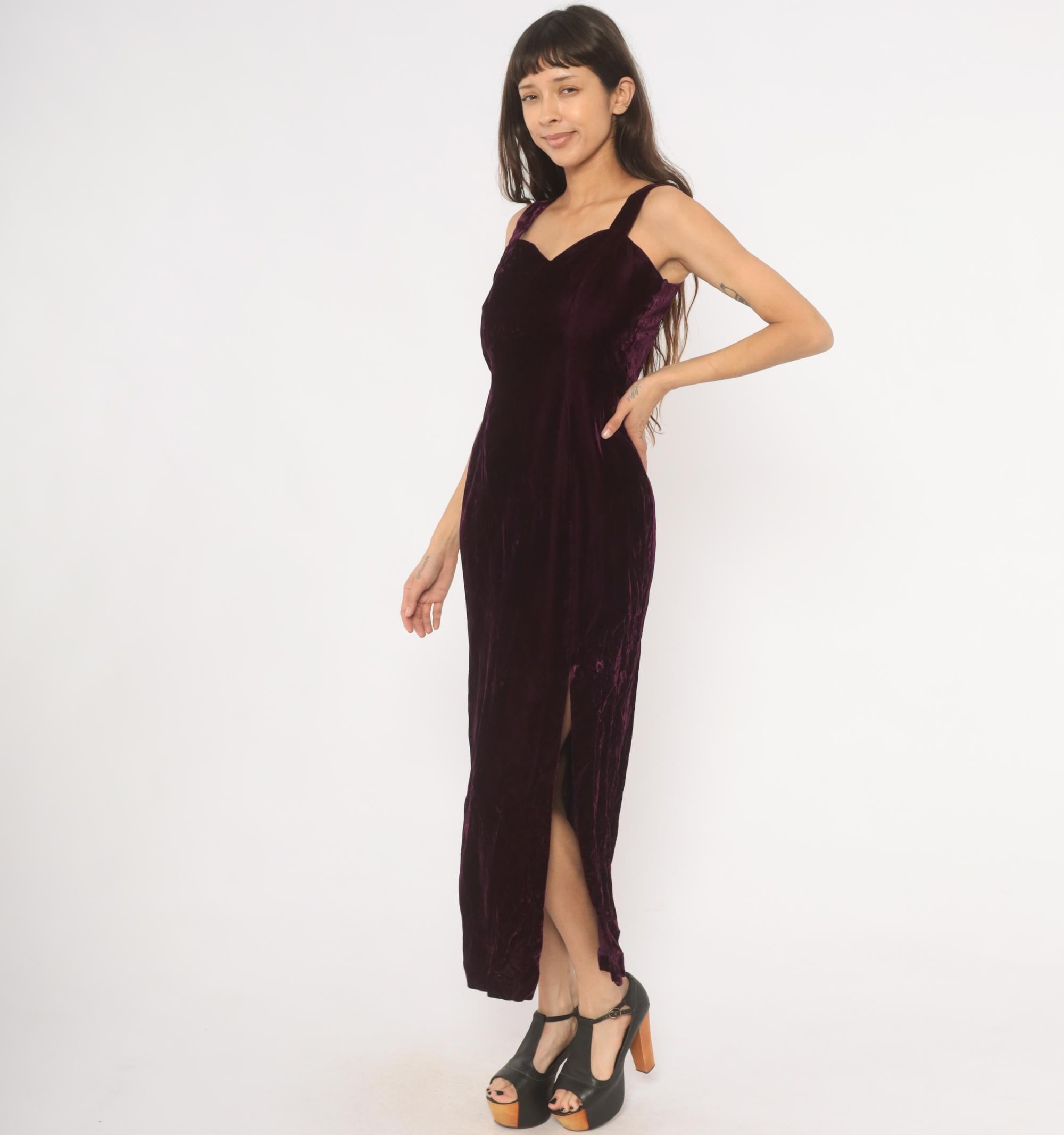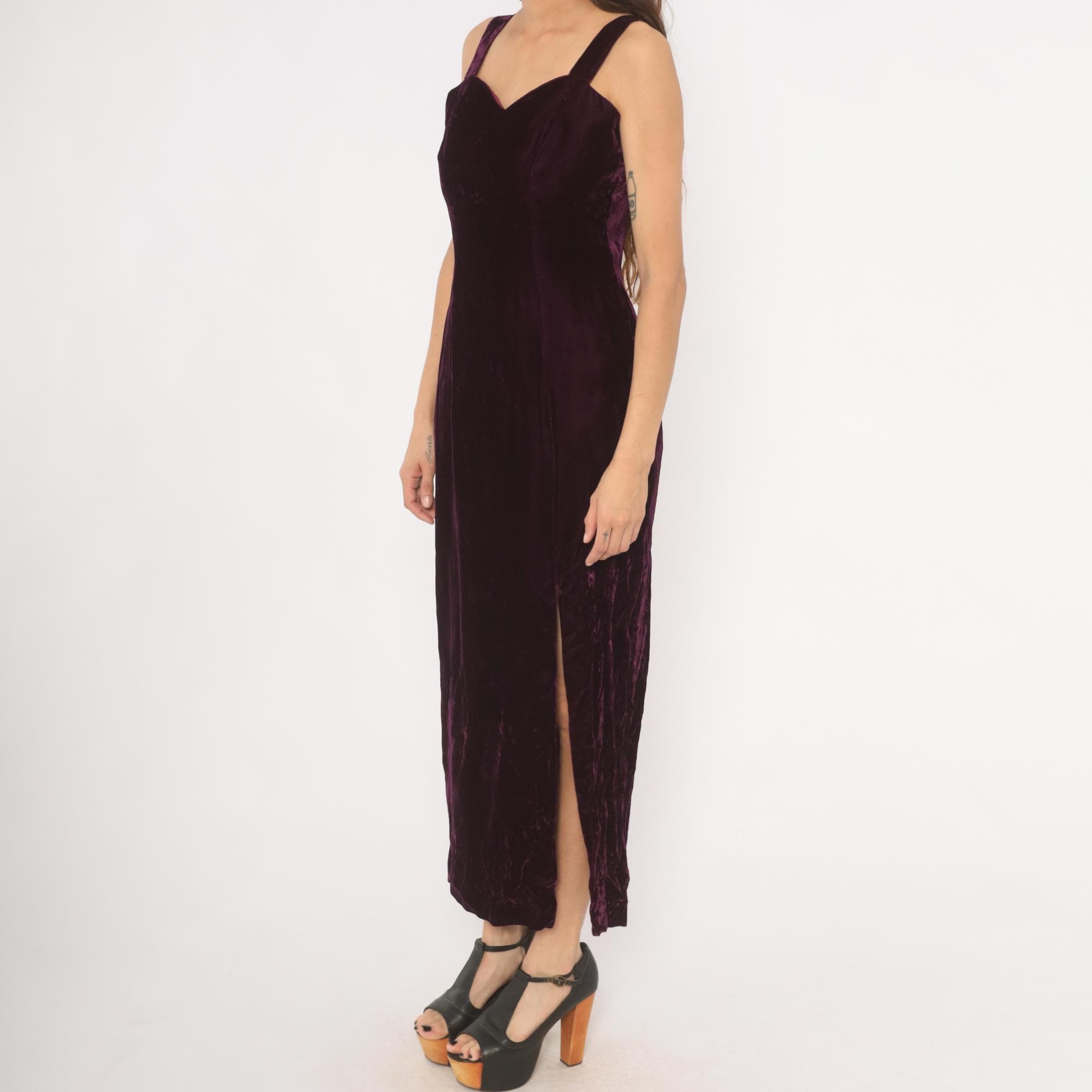 70s plum velvet maxi dress with sweetheart neckline and wide shoulder straps. Fitted bodice through the waist with a straight column silhouette and side slit near the hem. Back zipper closure runs from the upper back to mid-hip, with a rich purple, wine-toned crushed velvet throughout.