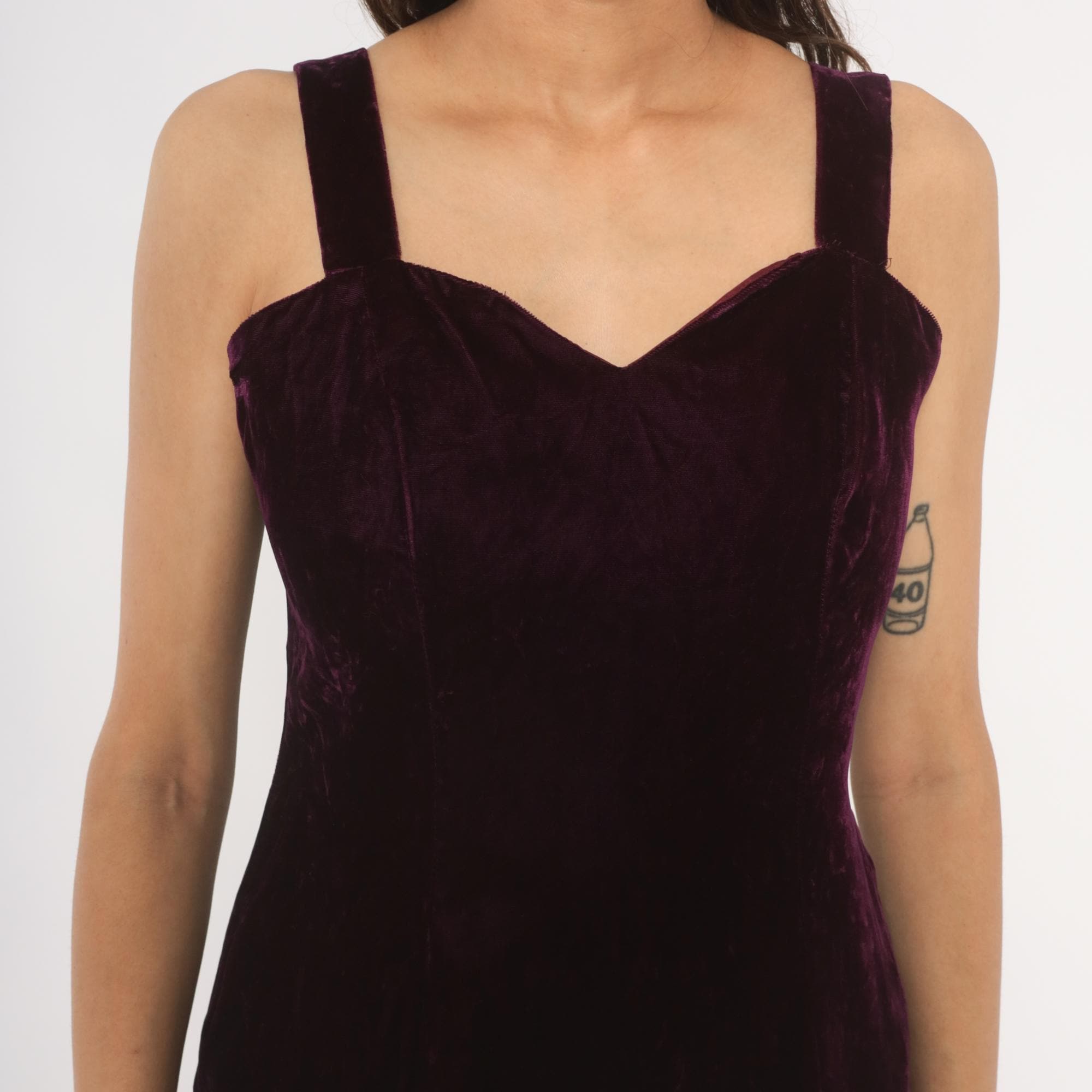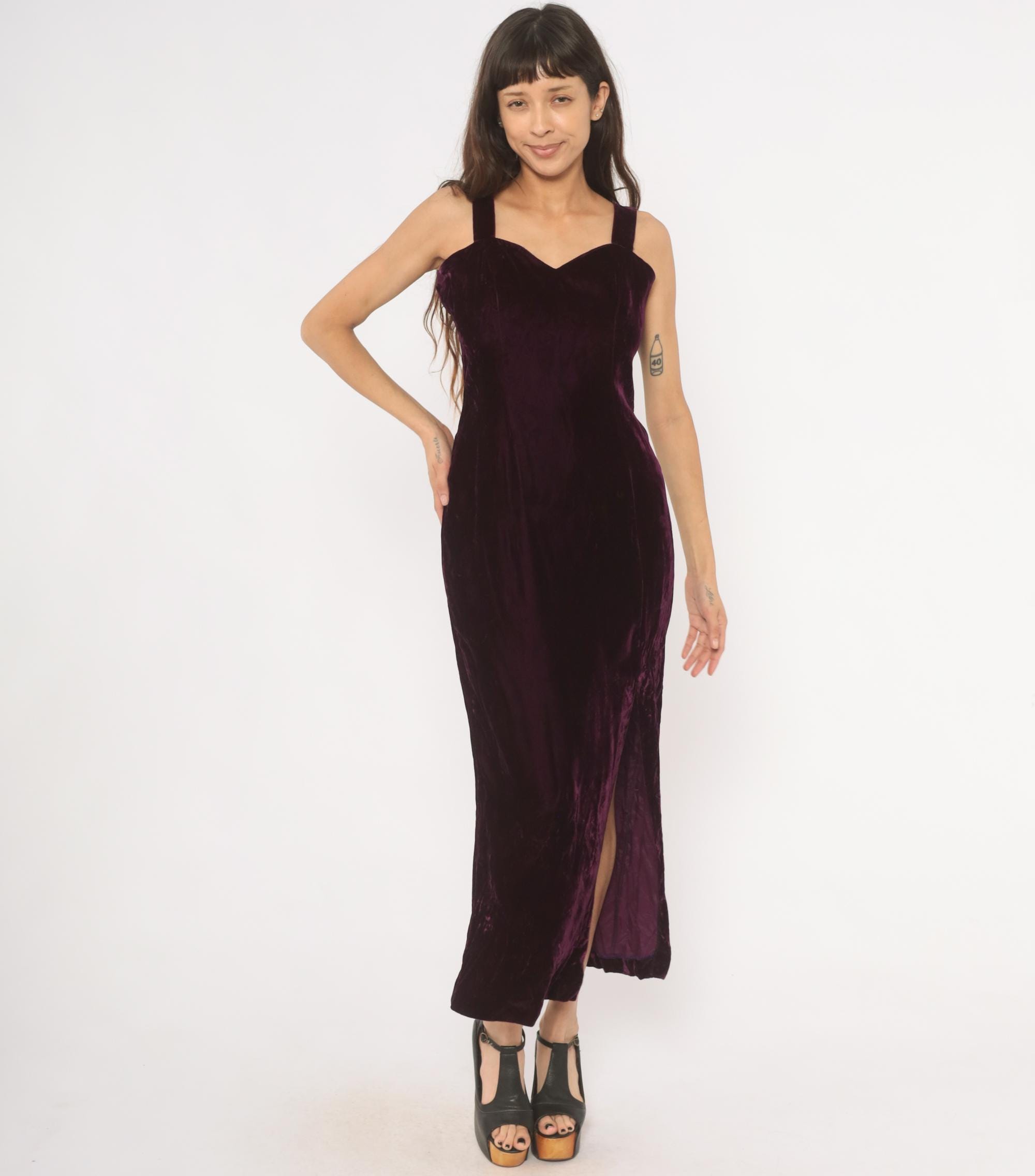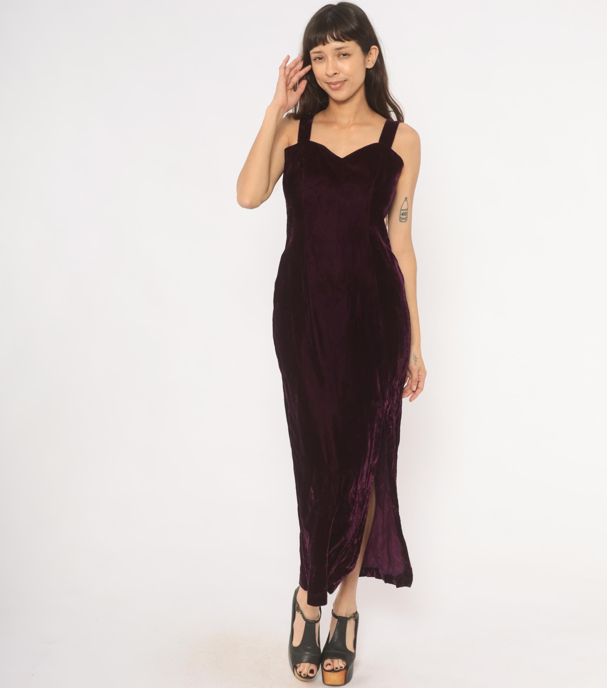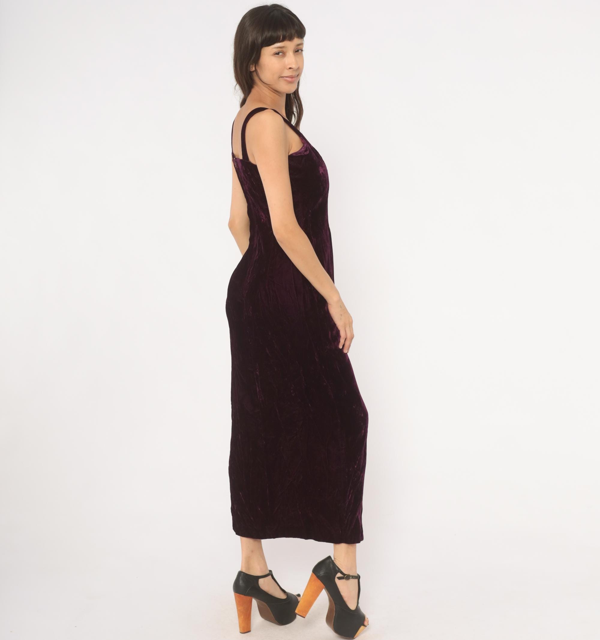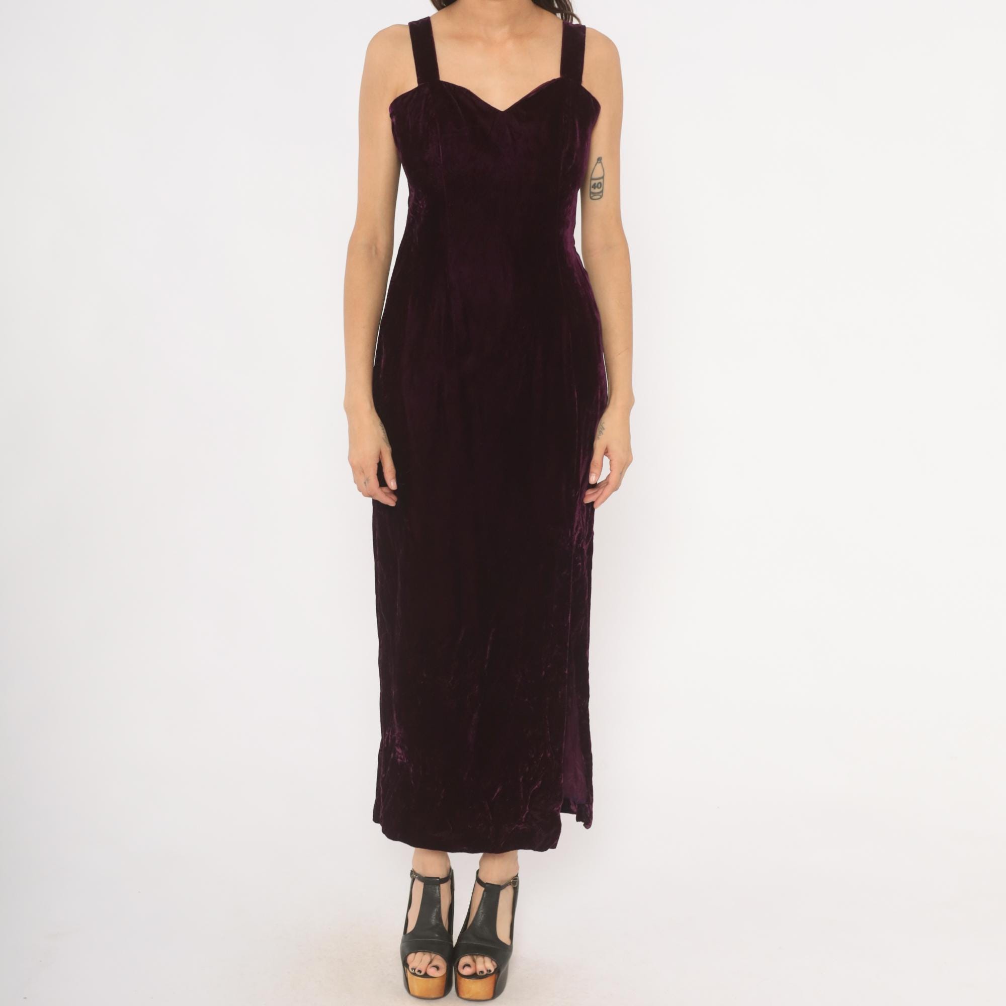 70s plum velvet maxi dress with sweetheart neckline and wide shoulder straps. Fitted bodice through the waist with a straight column silhouette and side slit near the hem. Back zipper closure runs from the upper back to mid-hip, with a rich purple, wine-toned crushed velvet throughout.