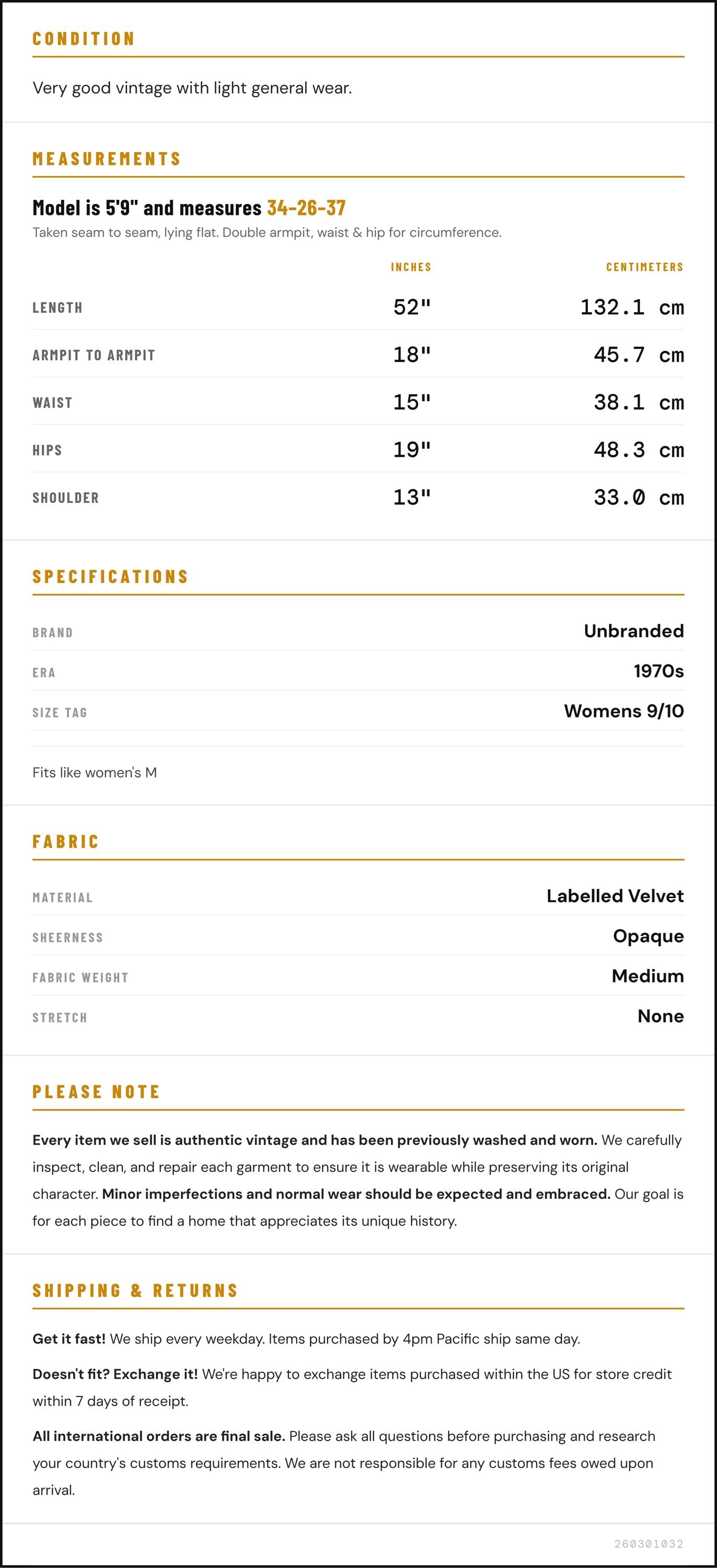 Measurements are taken laying flat and should be doubled where applicable. The "best fits" size is just an estimate, and vintage sizing can vary from modern sizing. Please use measurements to ensure proper fit. The best thing to do is measure a similar item of your own, and compare. When an item has stretch, we will list the unstretched dimensions with the stretched measurement afterwards.