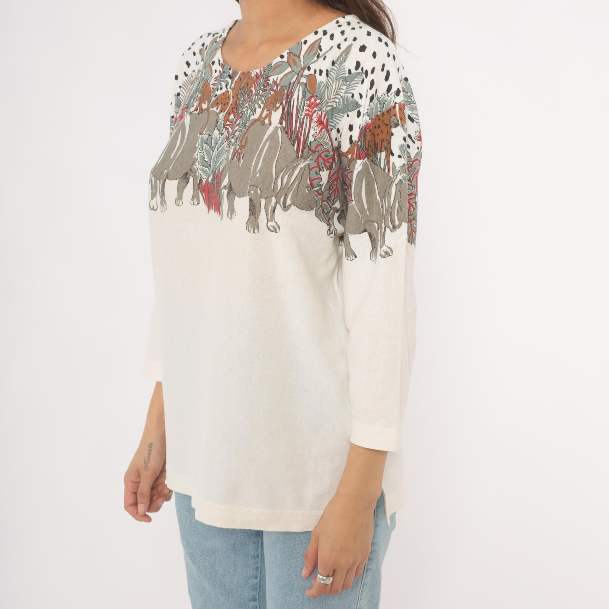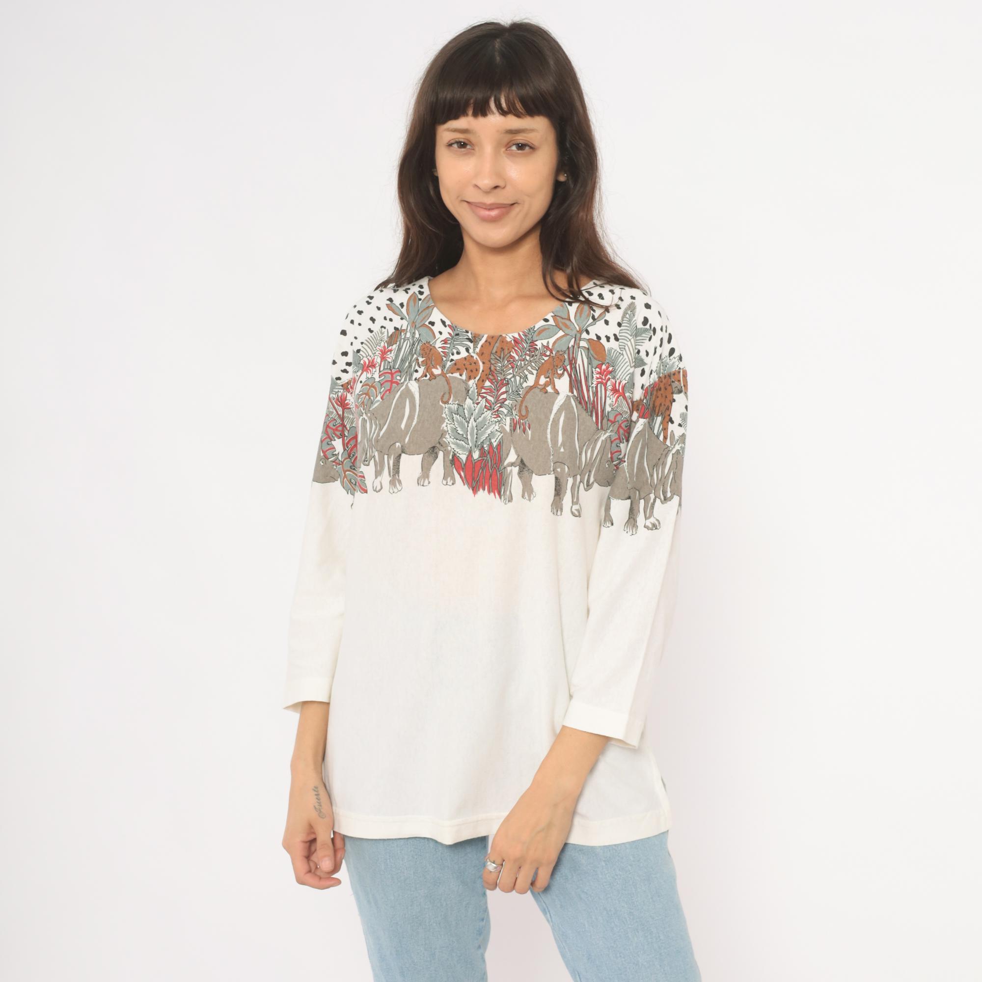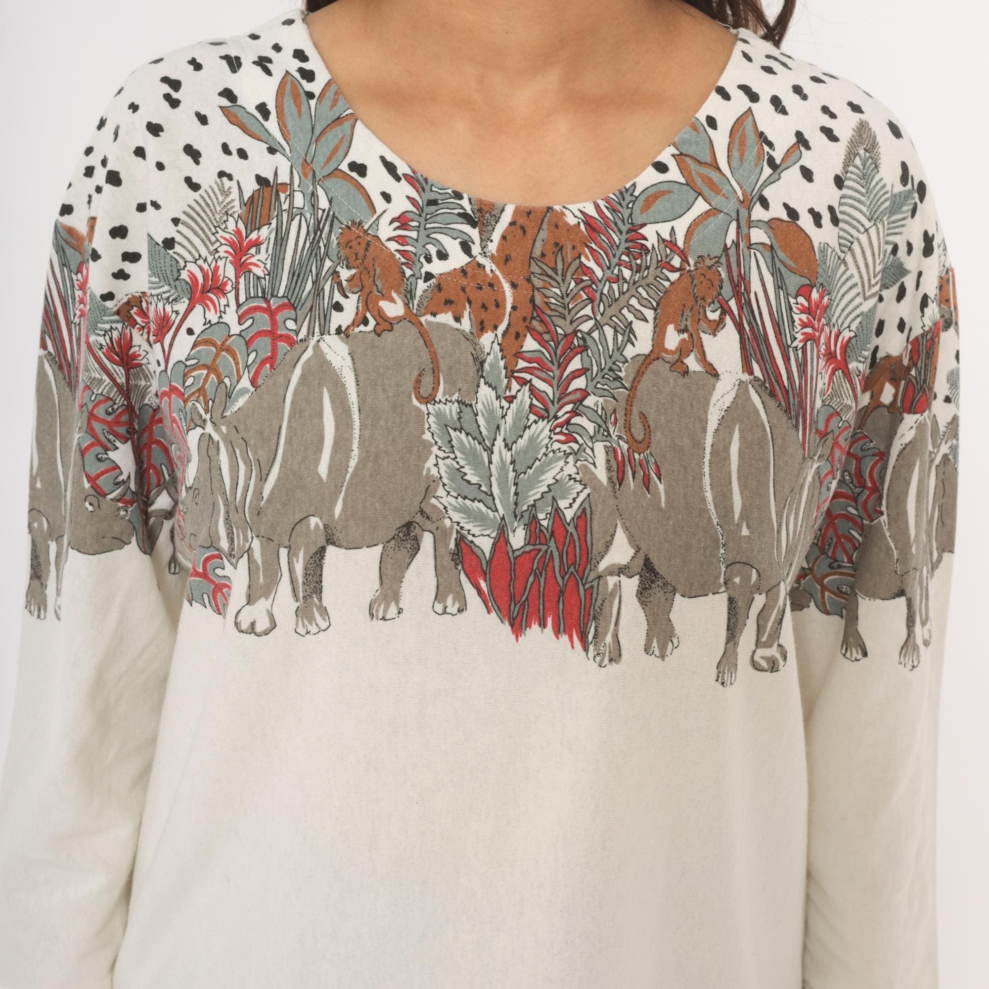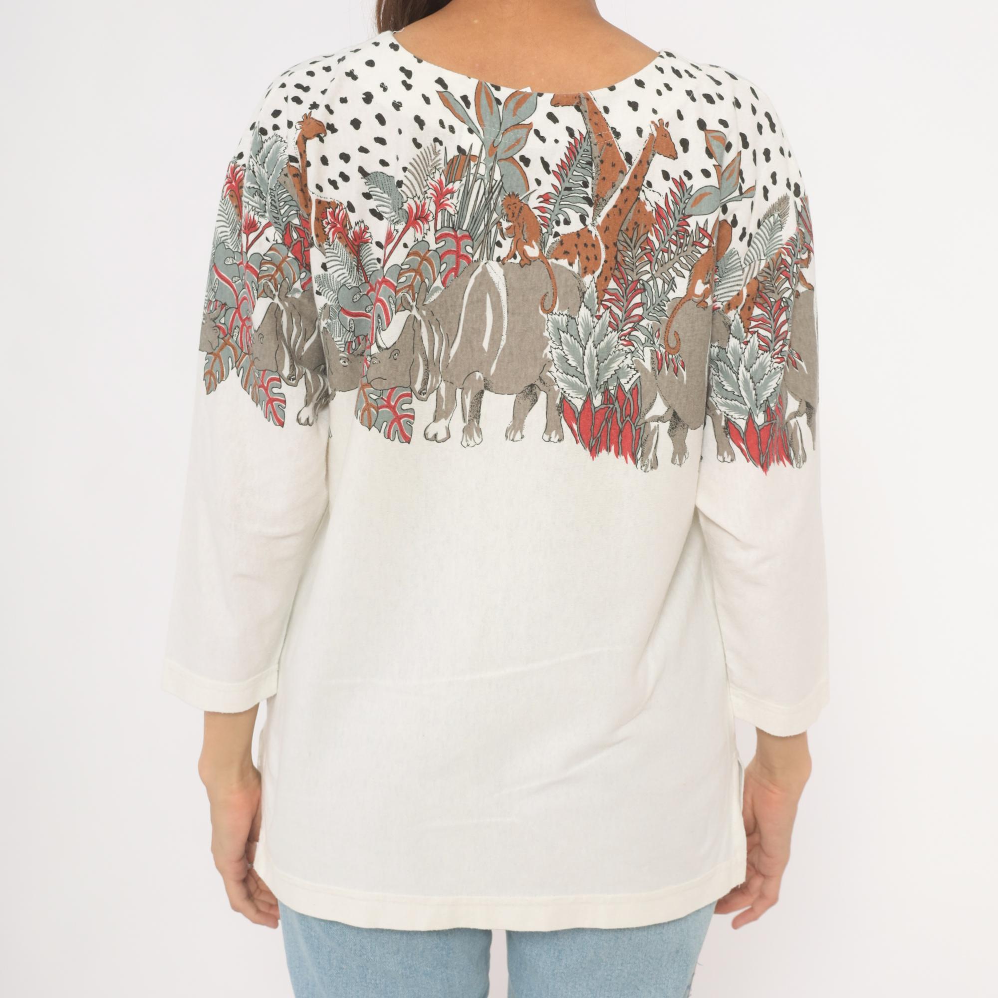90s safari animal print top from Enchante Sport with an illustrated jungle scene across the yoke, front and back. Rhinoceroses, monkeys, giraffes, elephants, and leopards walk among tropical foliage in taupe, brown, red, and sage green tones against a cream body. Black dalmatian-style spots fill the upper shoulders above the animal border, scoop neckline, three-quarter length sleeves with banded cuffs, and a banded hem.