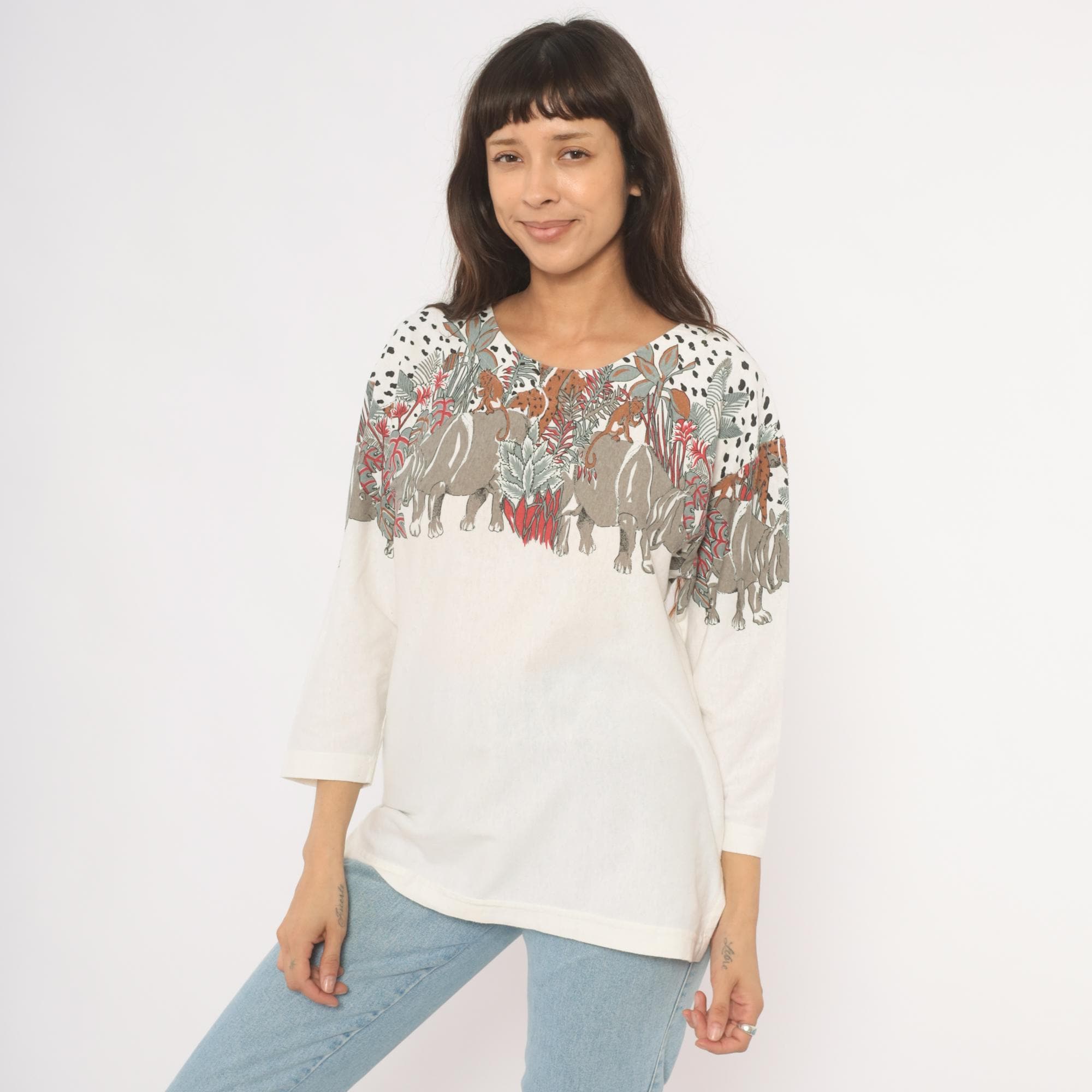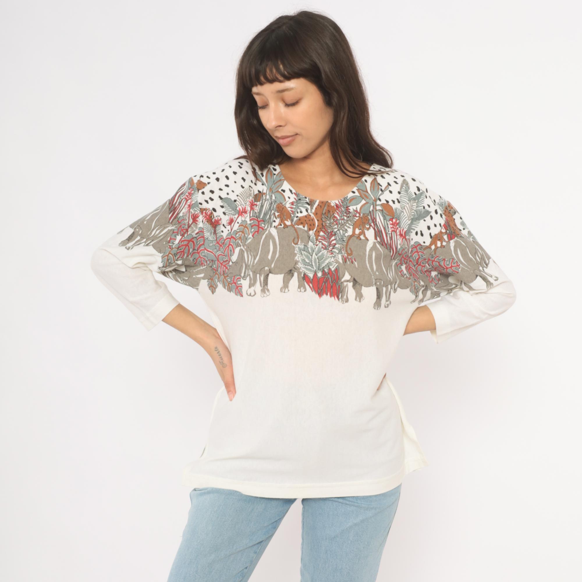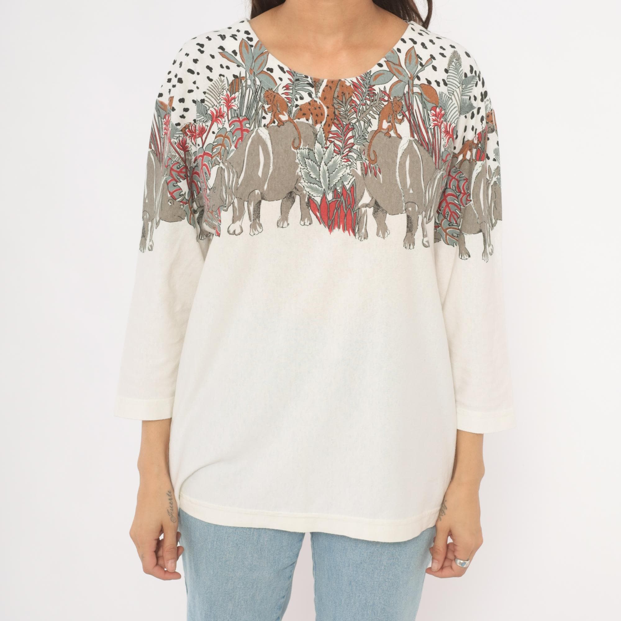 90s safari animal print top from Enchante Sport with an illustrated jungle scene across the yoke, front and back. Rhinoceroses, monkeys, giraffes, elephants, and leopards walk among tropical foliage in taupe, brown, red, and sage green tones against a cream body. Black dalmatian-style spots fill the upper shoulders above the animal border, scoop neckline, three-quarter length sleeves with banded cuffs, and a banded hem.