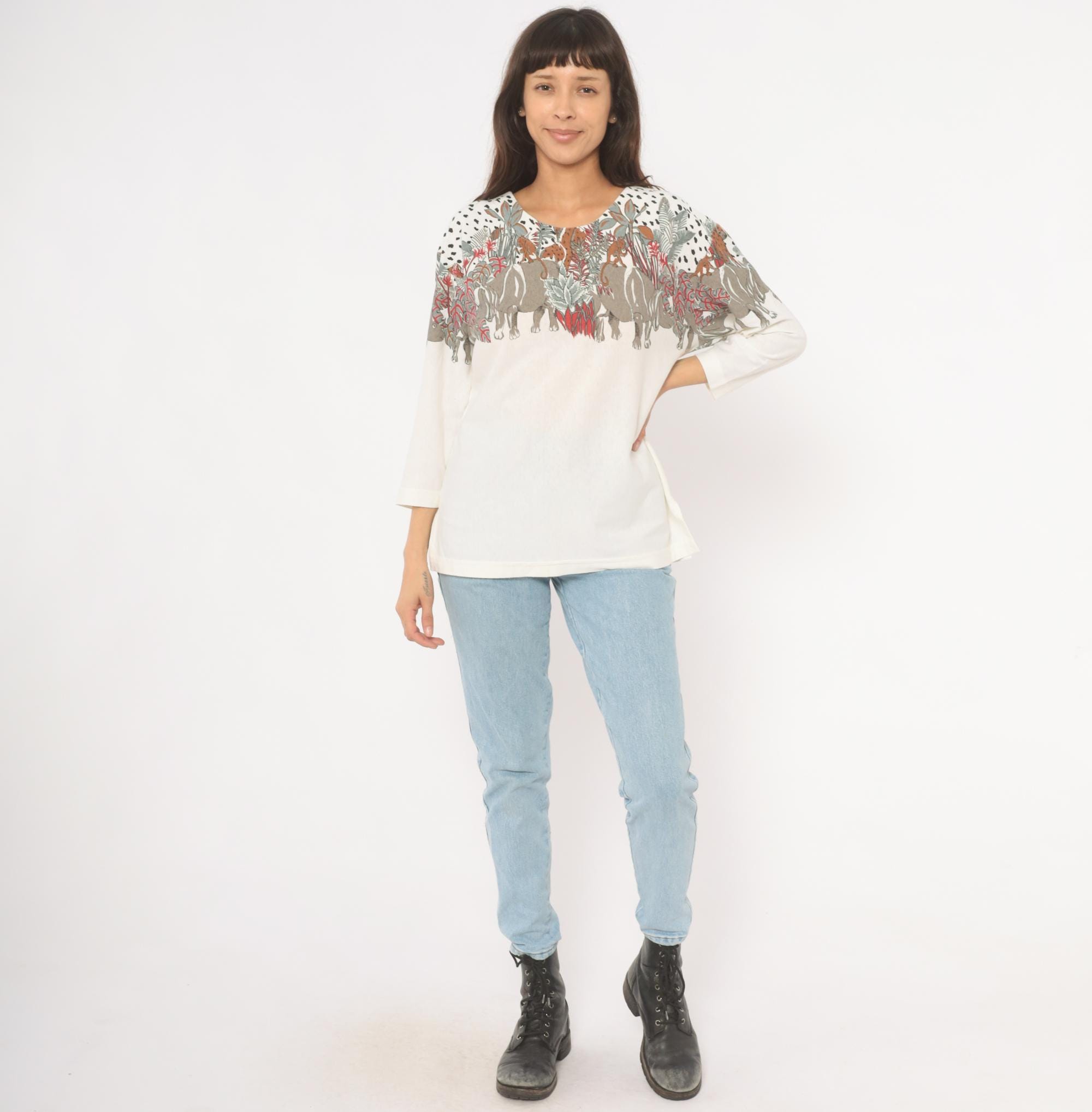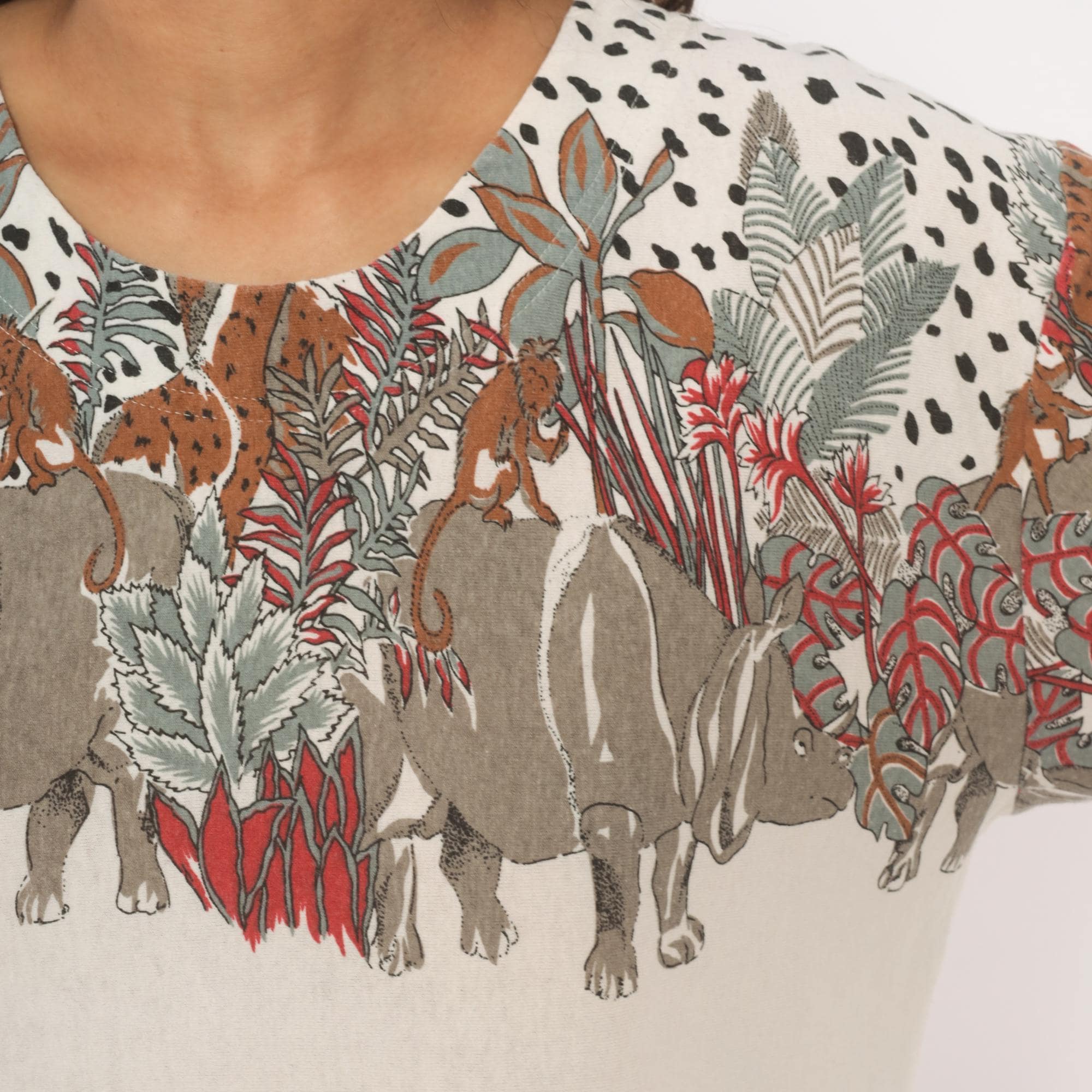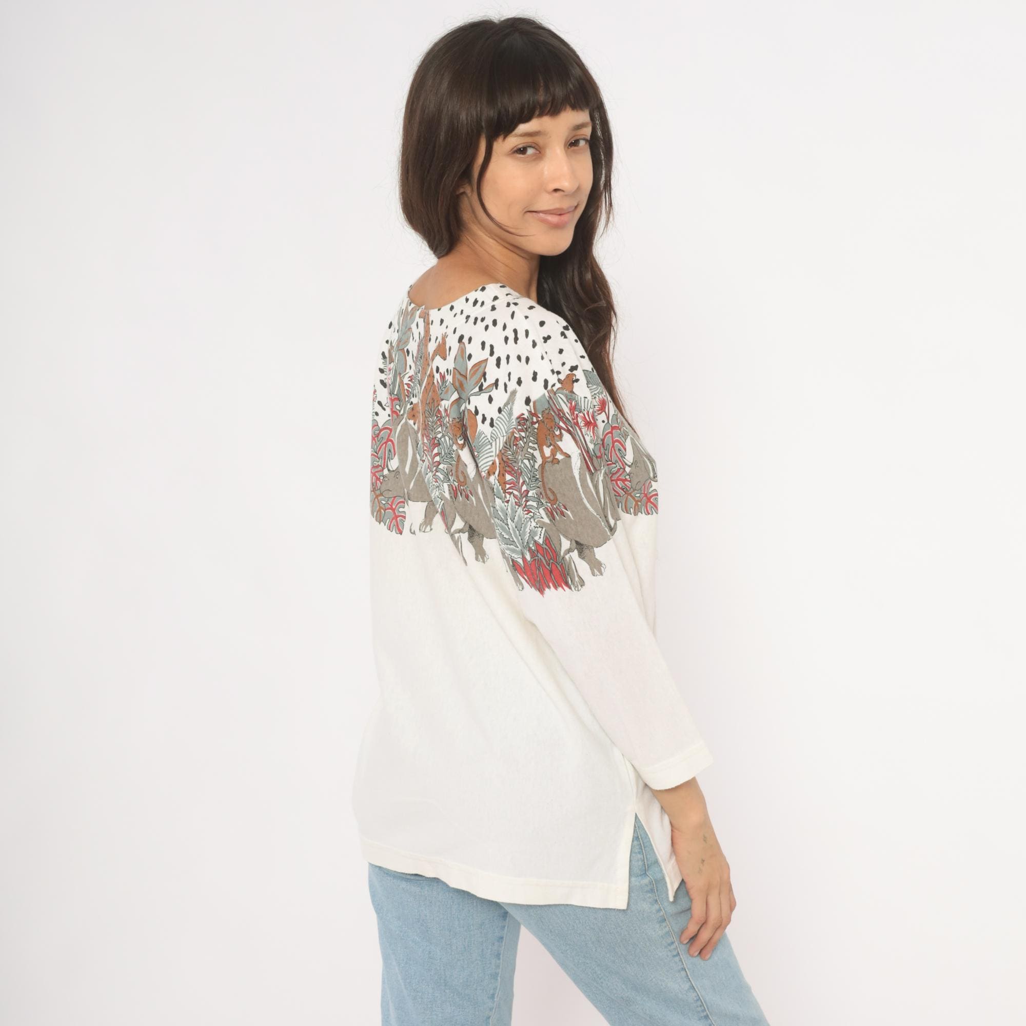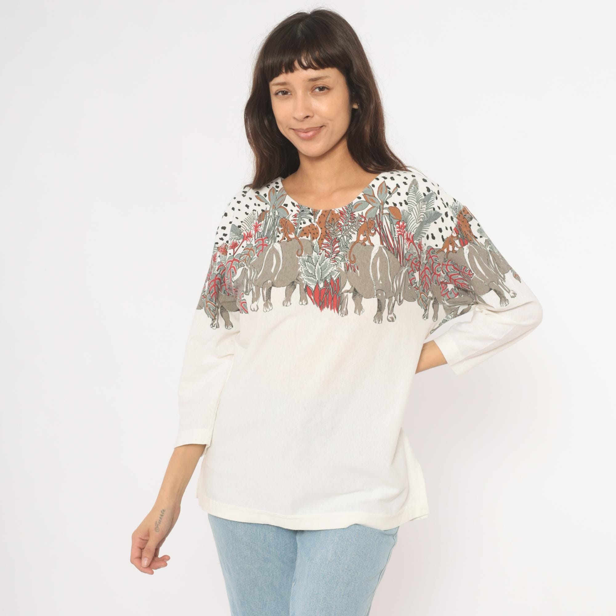 90s safari animal print top from Enchante Sport with an illustrated jungle scene across the yoke, front and back. Rhinoceroses, monkeys, giraffes, elephants, and leopards walk among tropical foliage in taupe, brown, red, and sage green tones against a cream body. Black dalmatian-style spots fill the upper shoulders above the animal border, scoop neckline, three-quarter length sleeves with banded cuffs, and a banded hem.