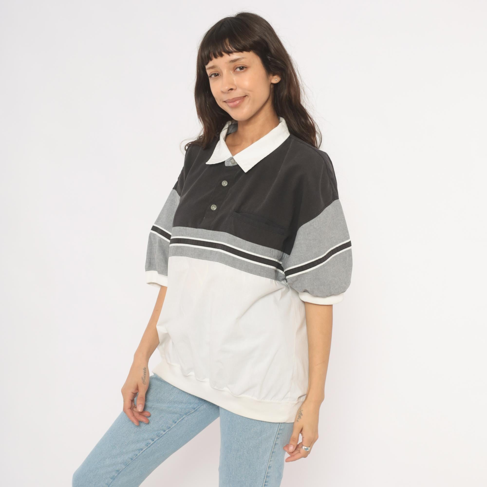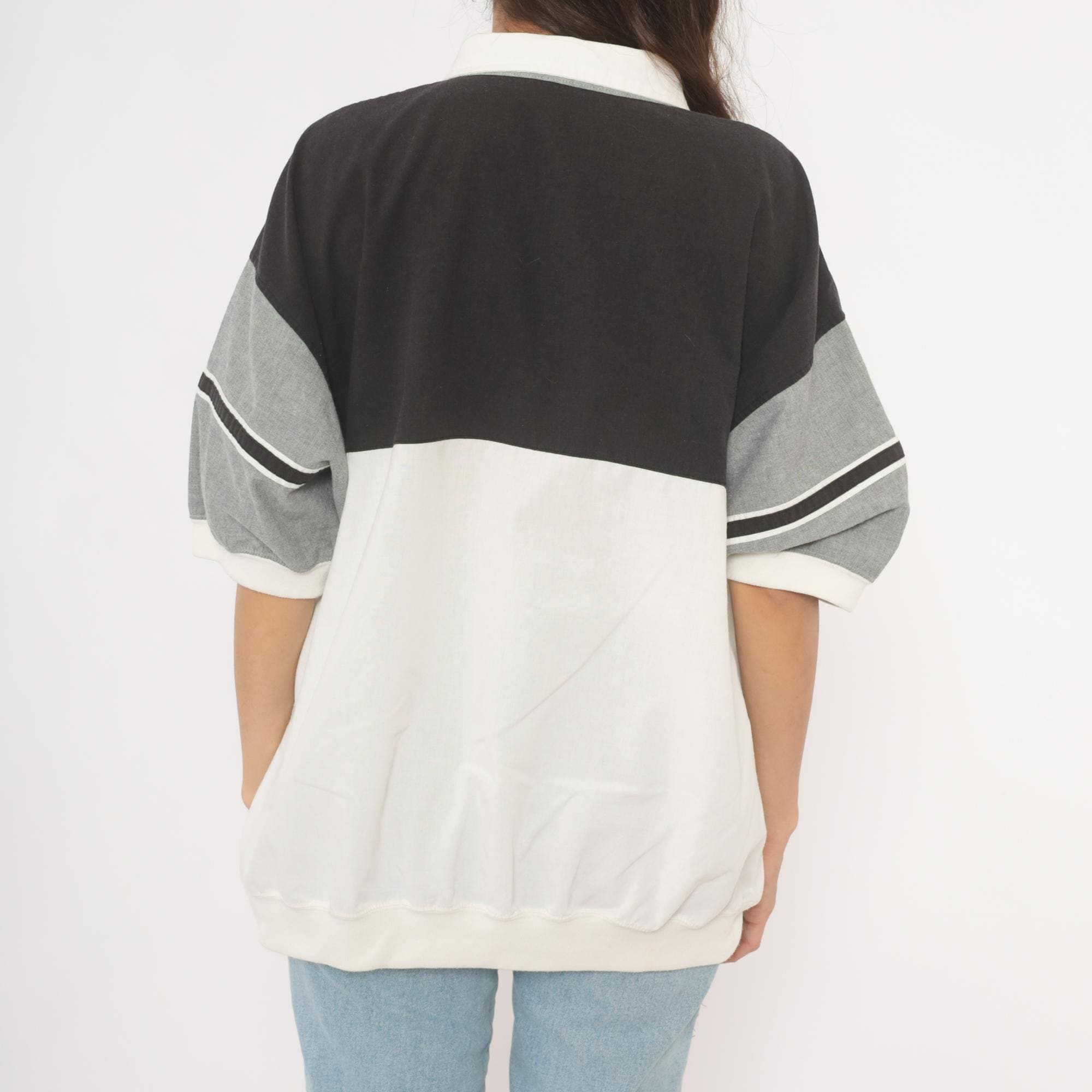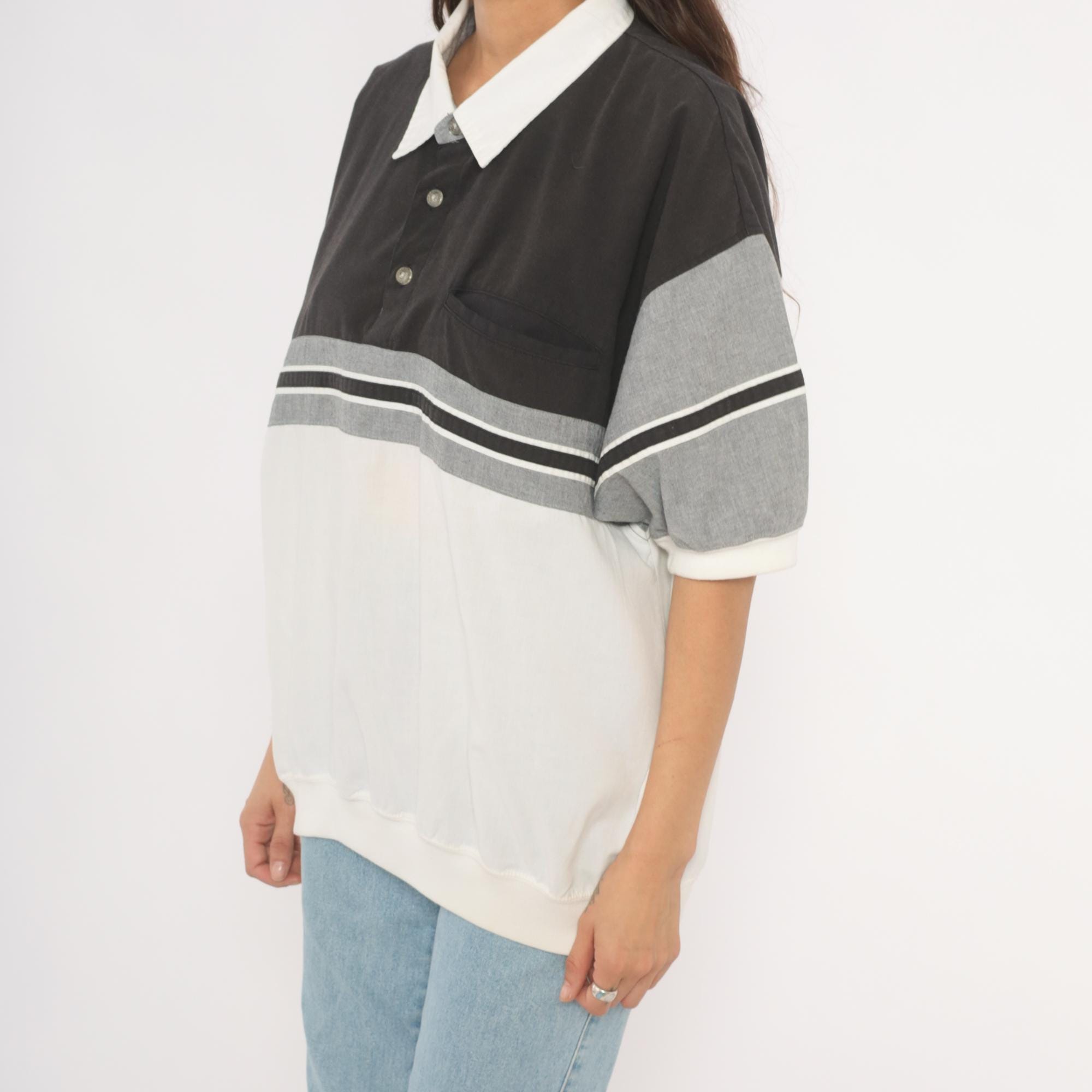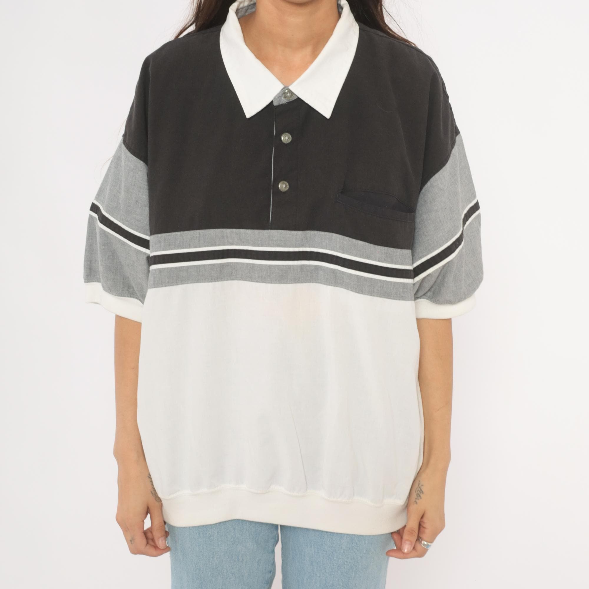 90s color block polo pullover with a white pointed collar and two-button placket closure. Black upper body with gray panel sleeves and horizontal black and white striping across the chest, transitioning to an ivory lower body. Short sleeves with white ribbed cuffs, elasticized waistband hem, and a small chest pocket on the left side.