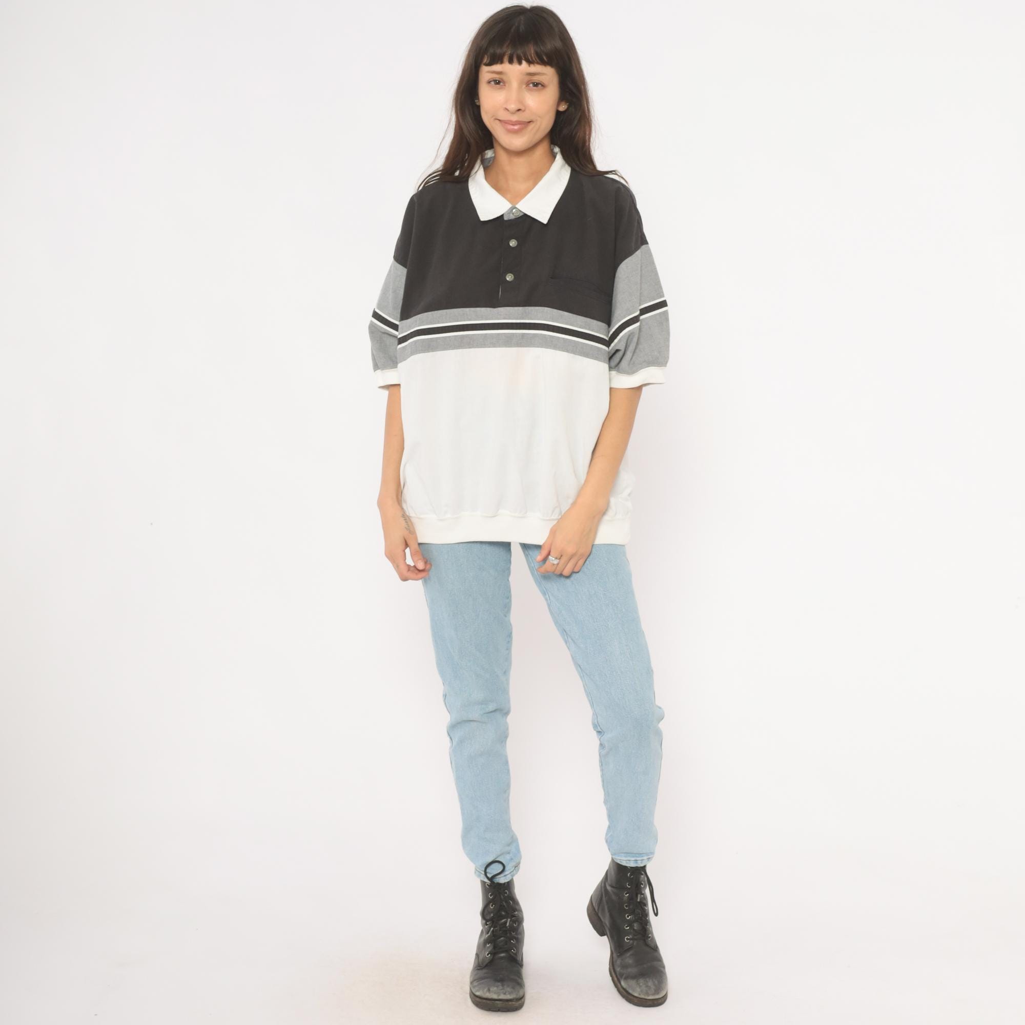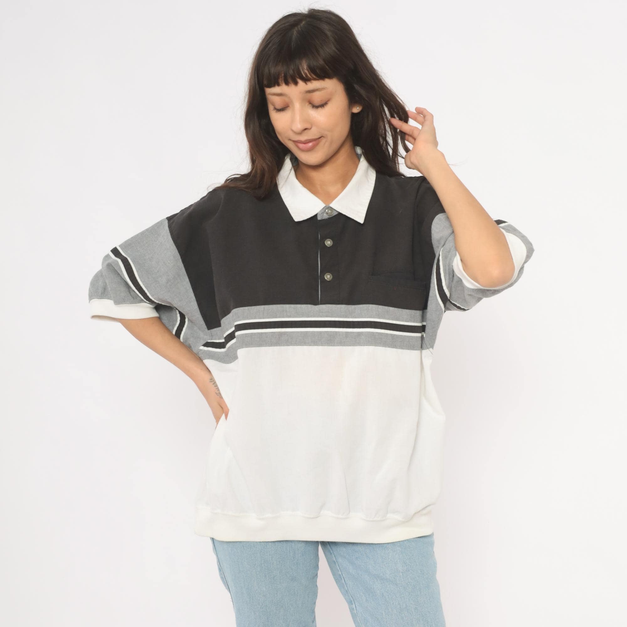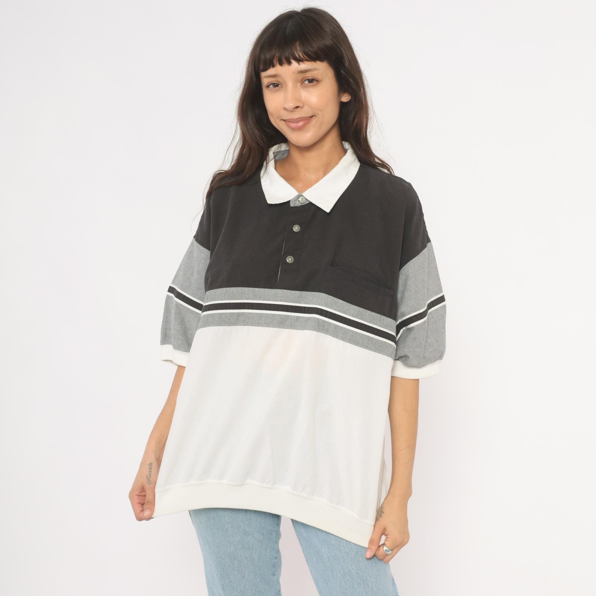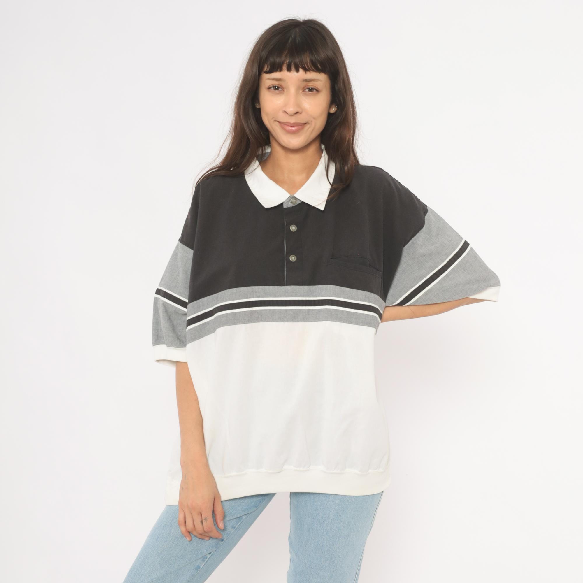 90s color block polo pullover with a white pointed collar and two-button placket closure. Black upper body with gray panel sleeves and horizontal black and white striping across the chest, transitioning to an ivory lower body. Short sleeves with white ribbed cuffs, elasticized waistband hem, and a small chest pocket on the left side.