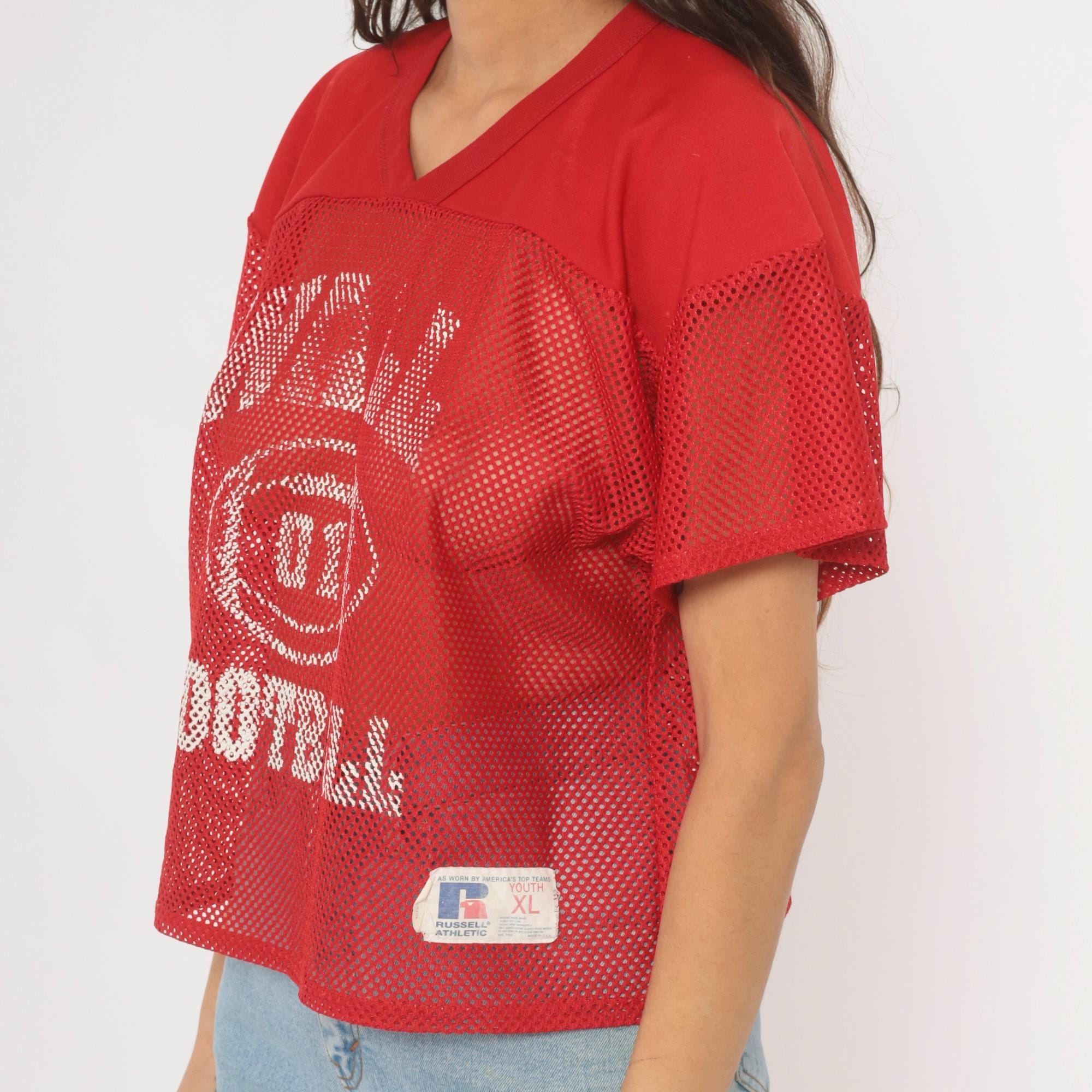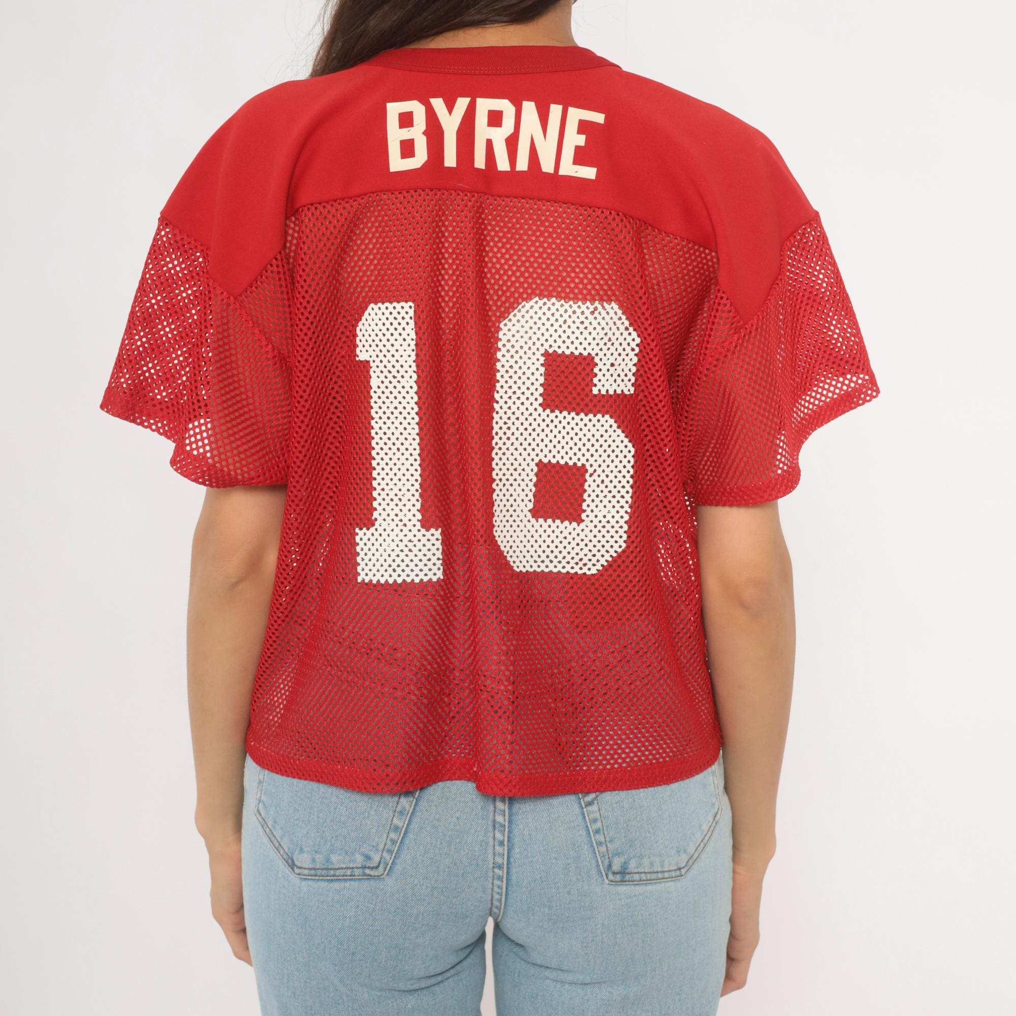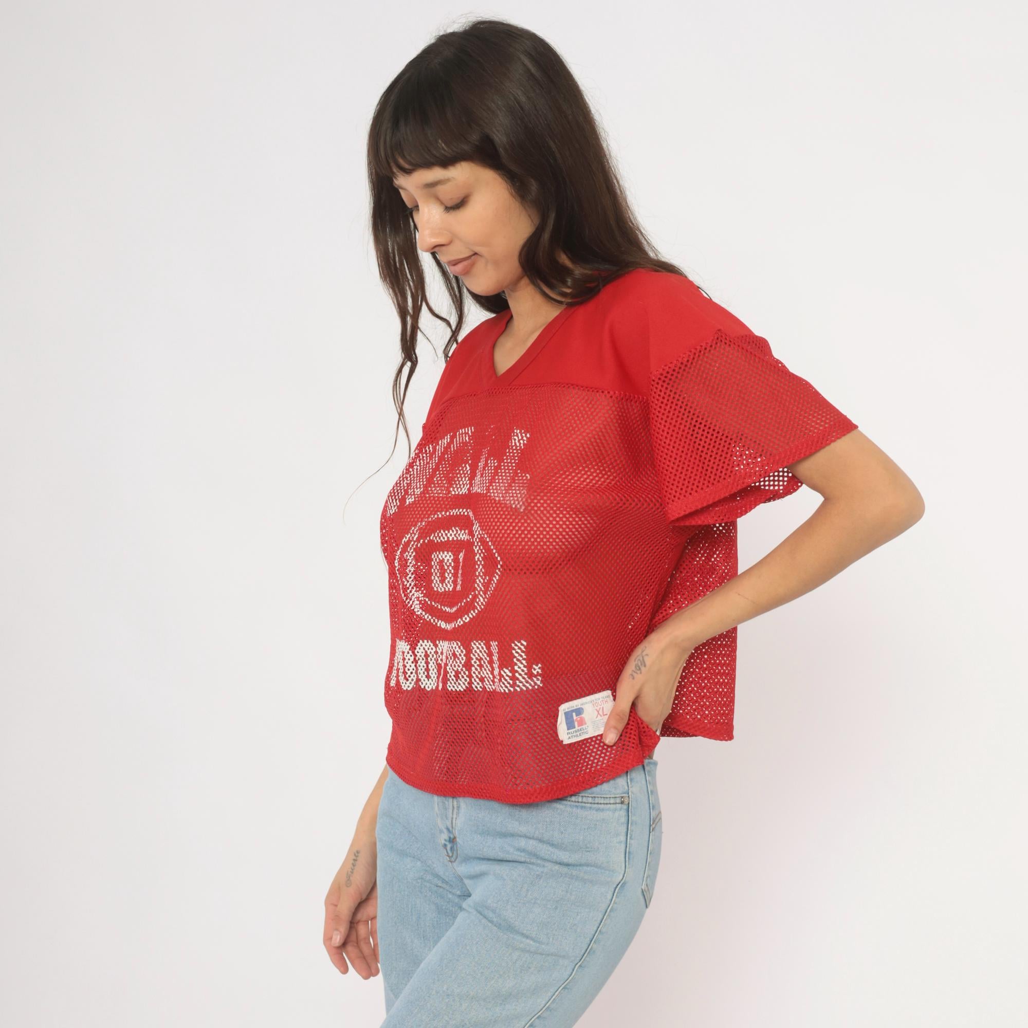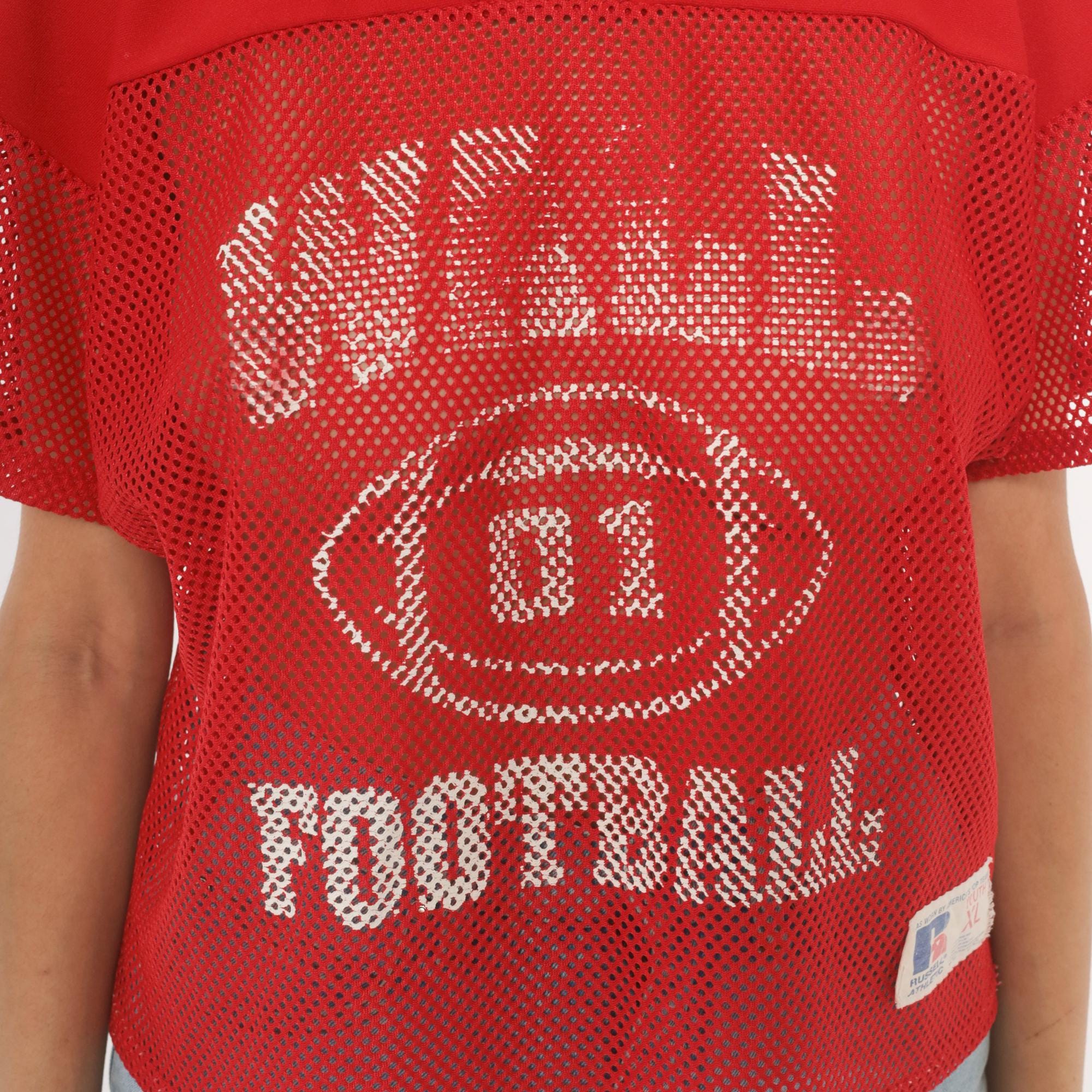 Red mesh football practice jersey from Russell Athletic with white screen-printed graphics on the front, a football graphic with "01" at center, and "FOOTBALL" text below. V-neck neckline with solid yoke panel across the chest and shoulders, short sleeves in open mesh fabric. Back displays "BYRNE" name plate and number 16 in white print.