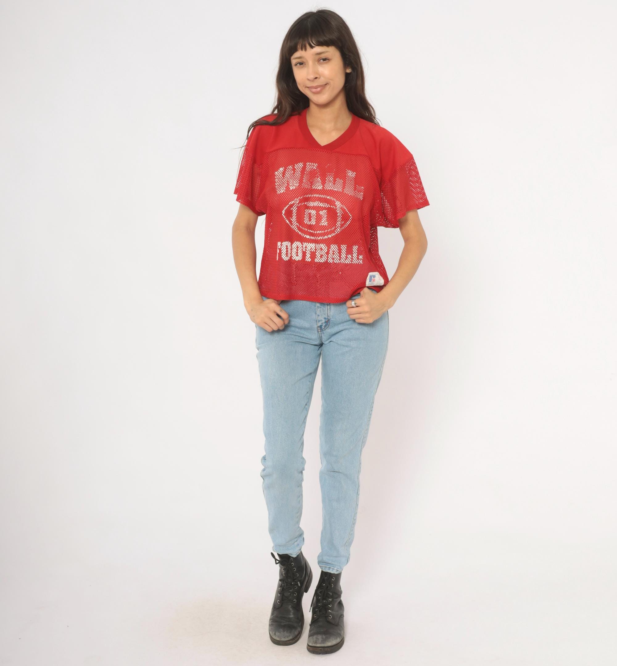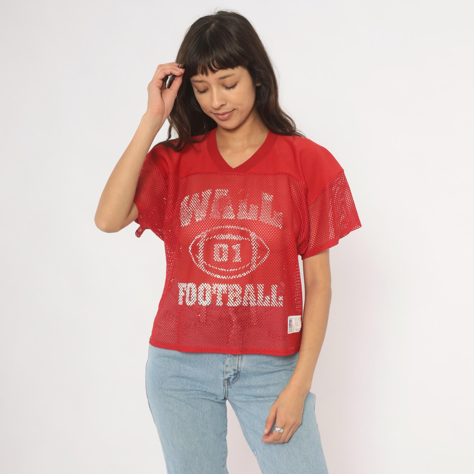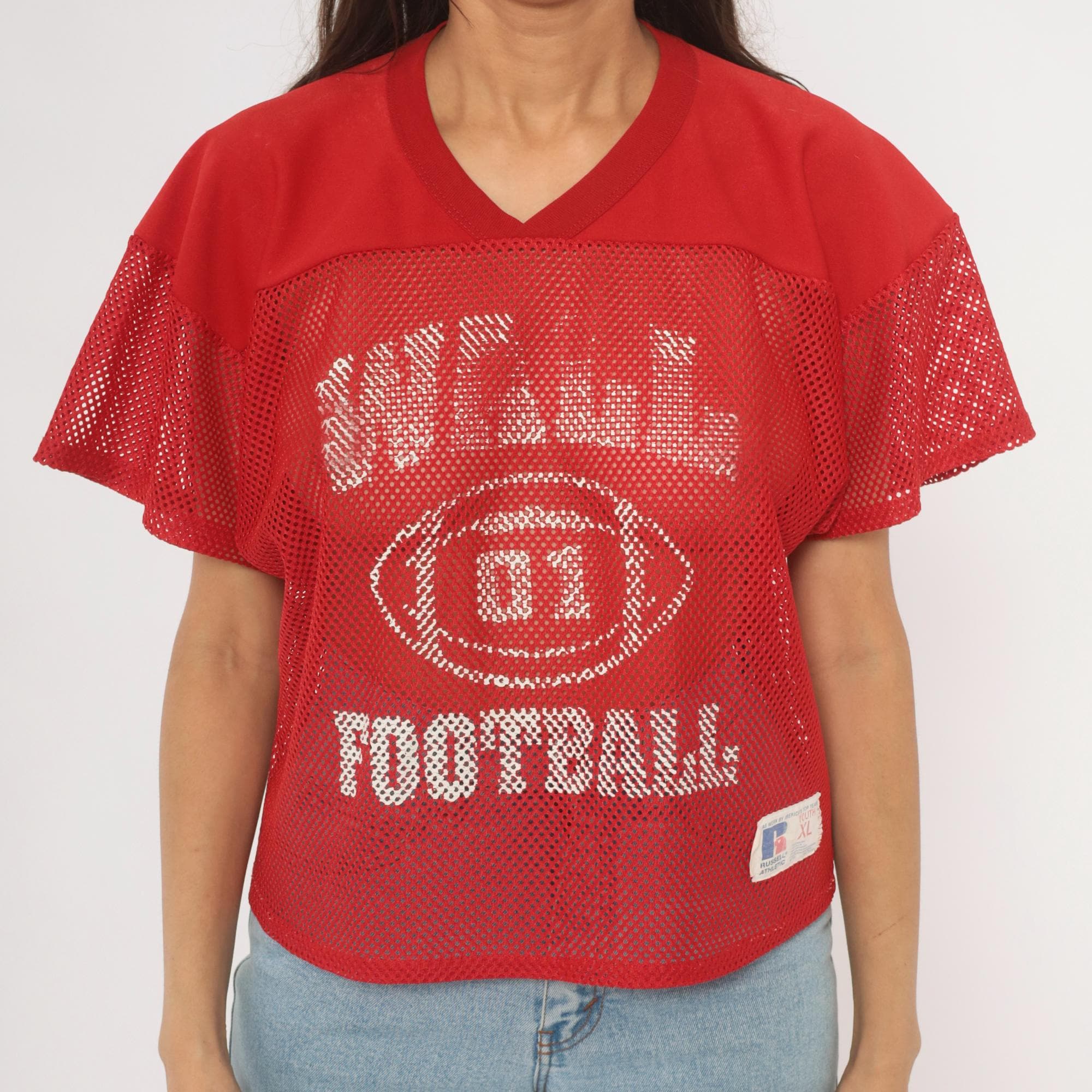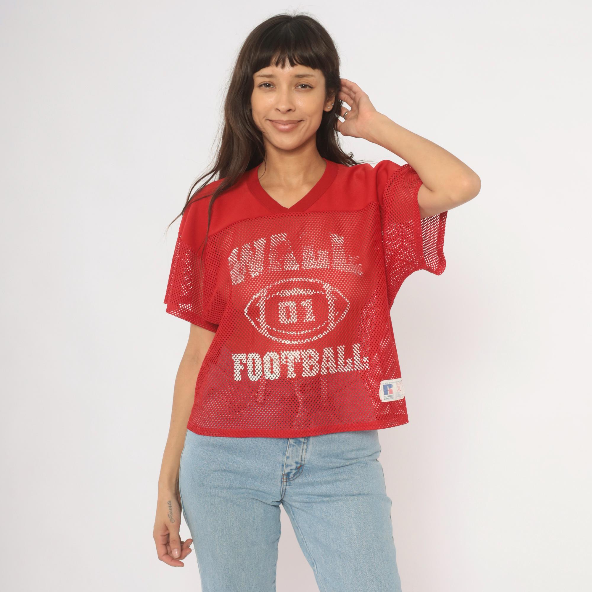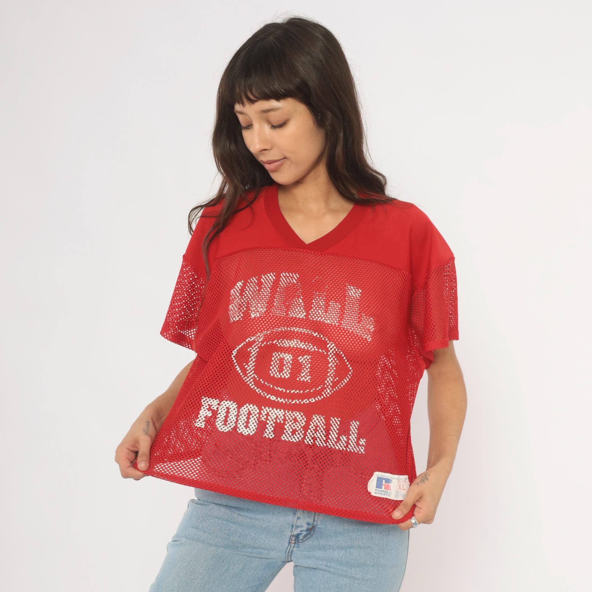 Red mesh football practice jersey from Russell Athletic with white screen-printed graphics on the front, a football graphic with "01" at center, and "FOOTBALL" text below. V-neck neckline with solid yoke panel across the chest and shoulders, short sleeves in open mesh fabric. Back displays "BYRNE" name plate and number 16 in white print.