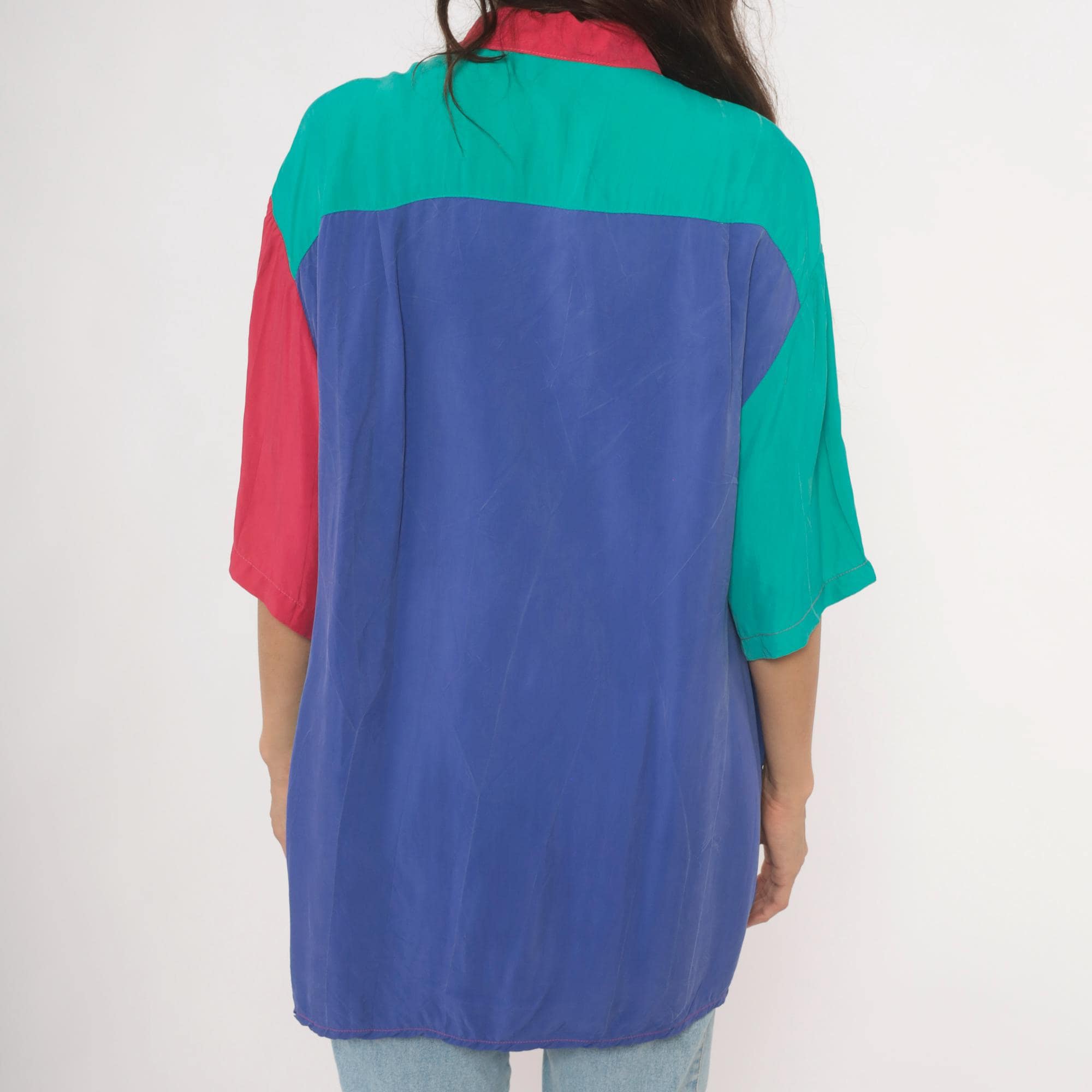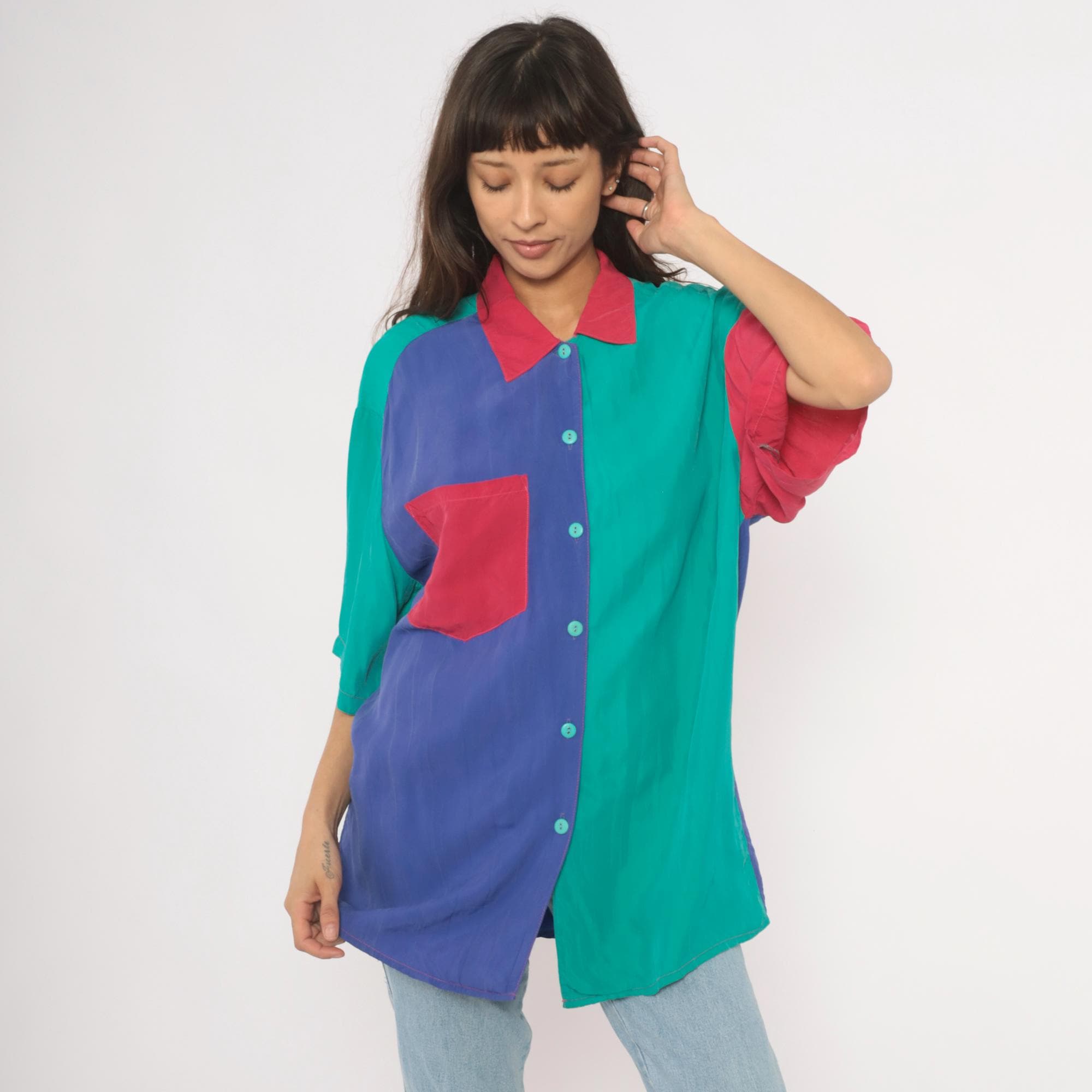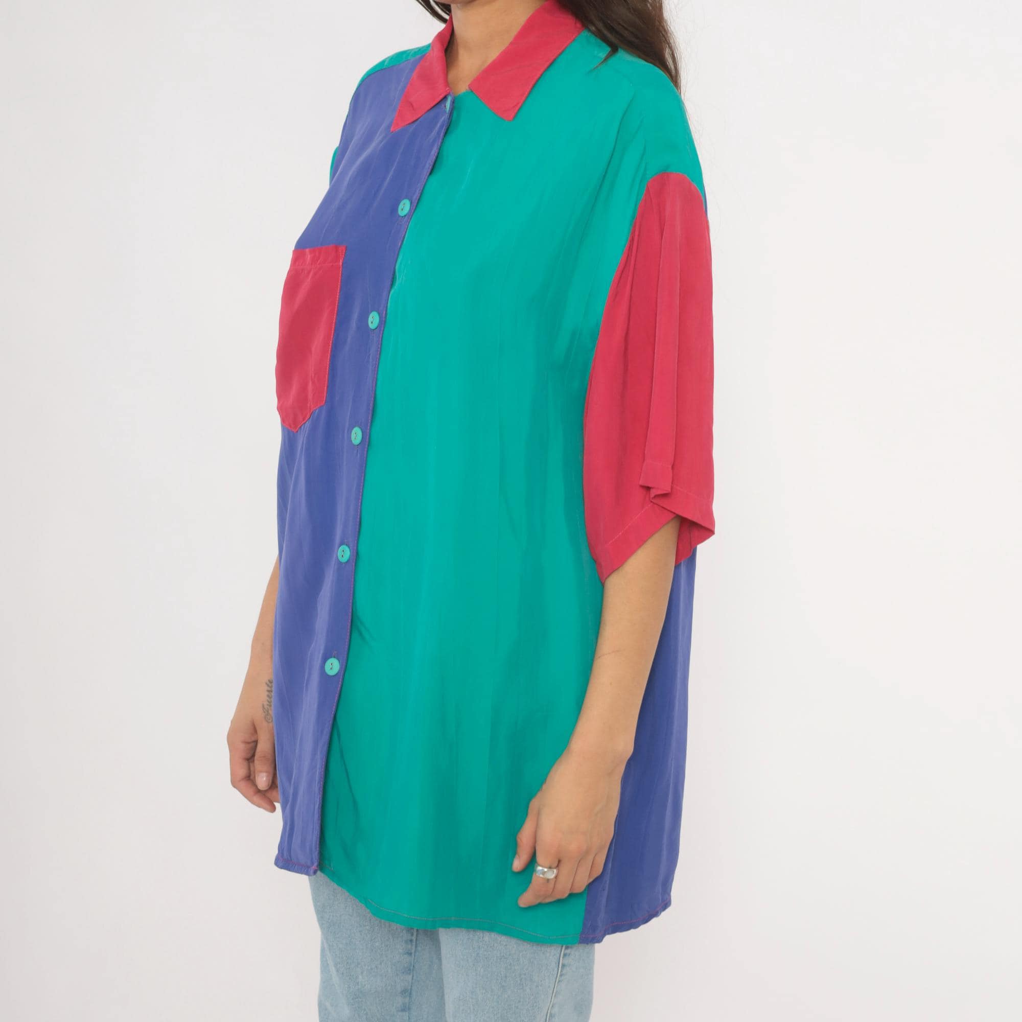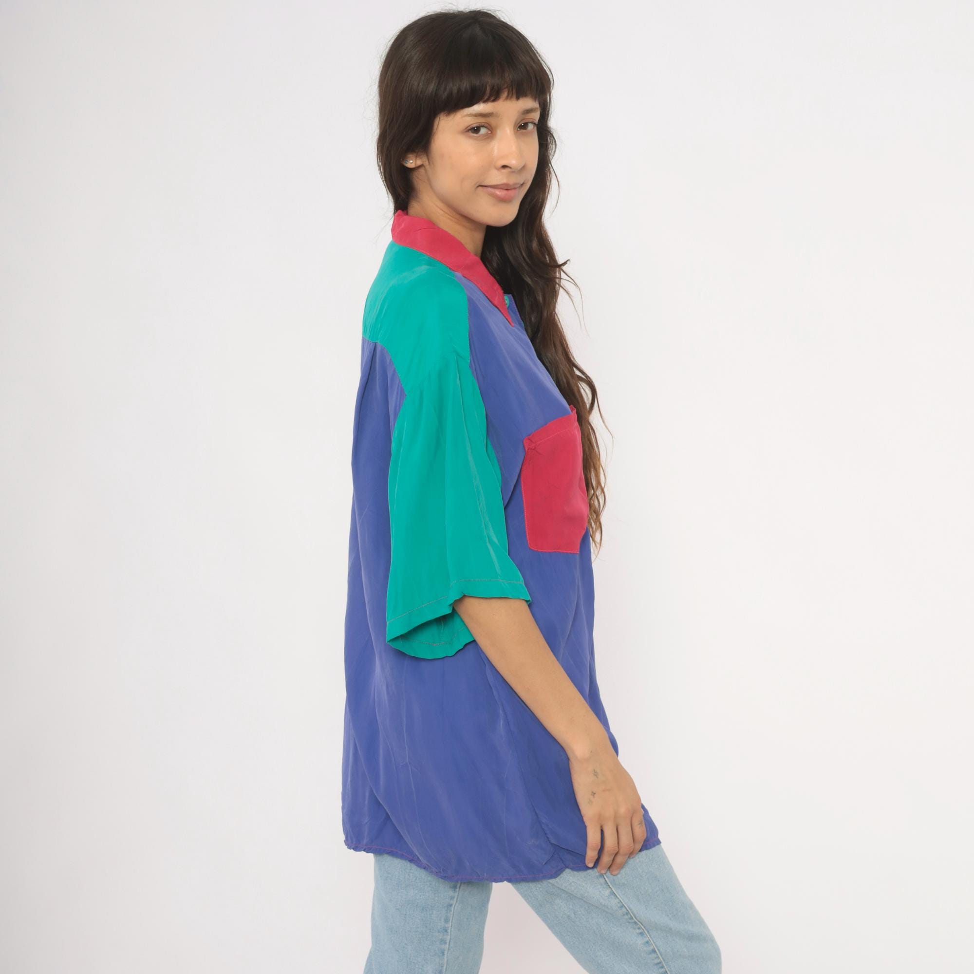 90s color block button front shirt from Ascente with a pink pointed collar and teal buttons down the front. The front splits into a purple panel on the left and teal on the right, with a pink chest pocket spanning both sections. Short dropped sleeves alternate between teal and pink, and the back is predominantly purple with teal shoulder yoke panels.