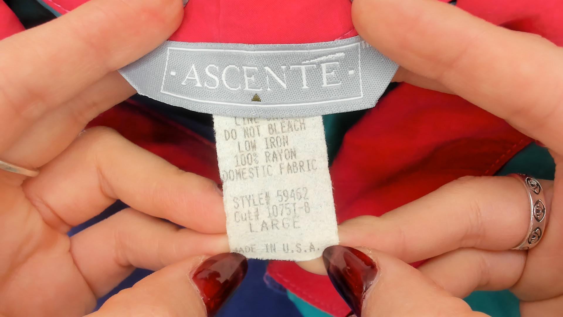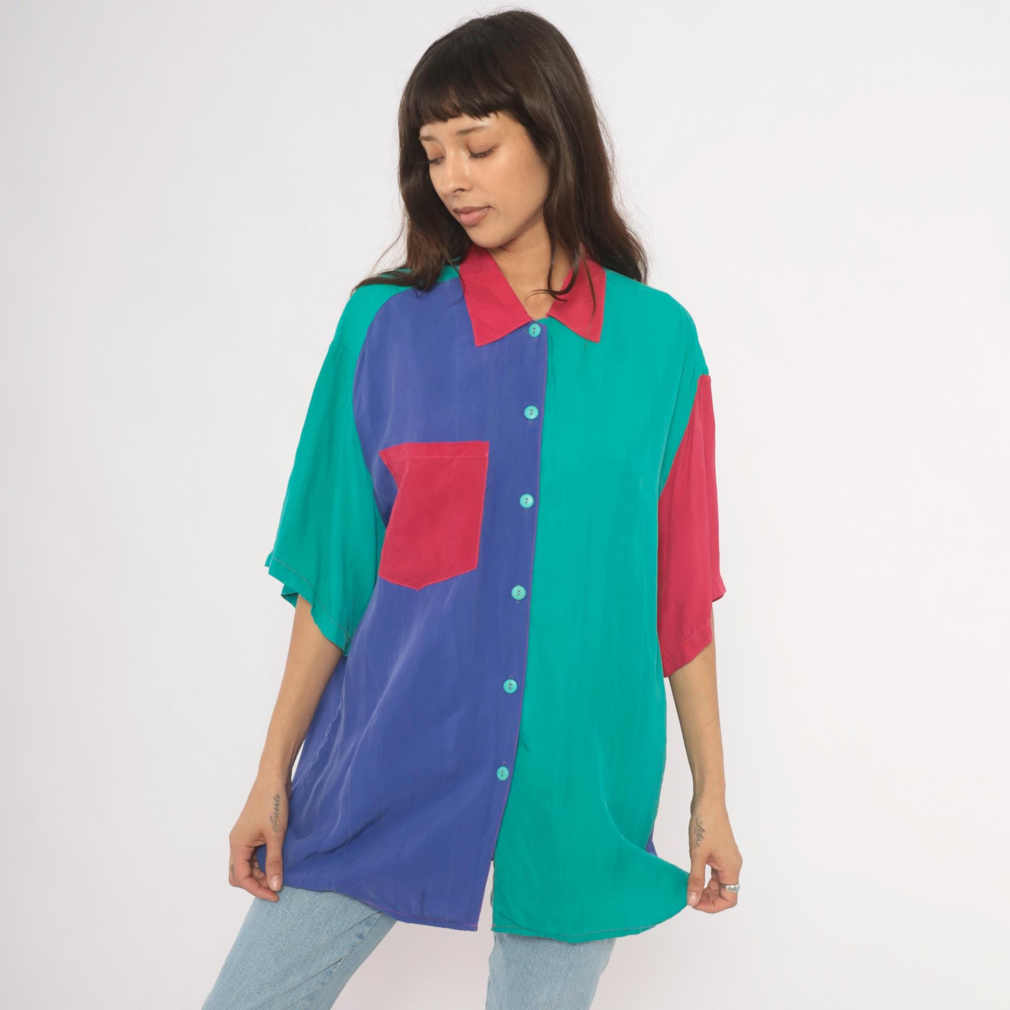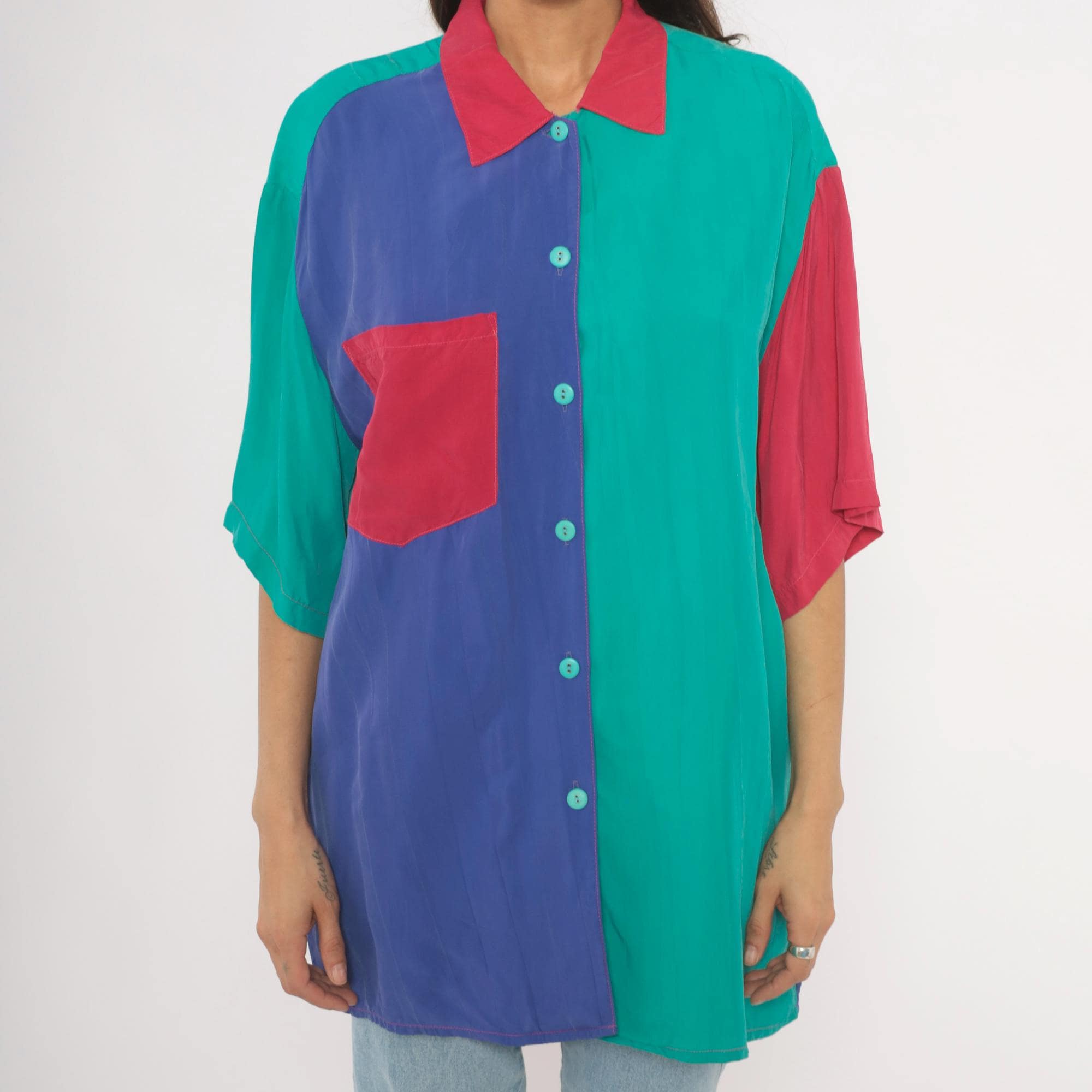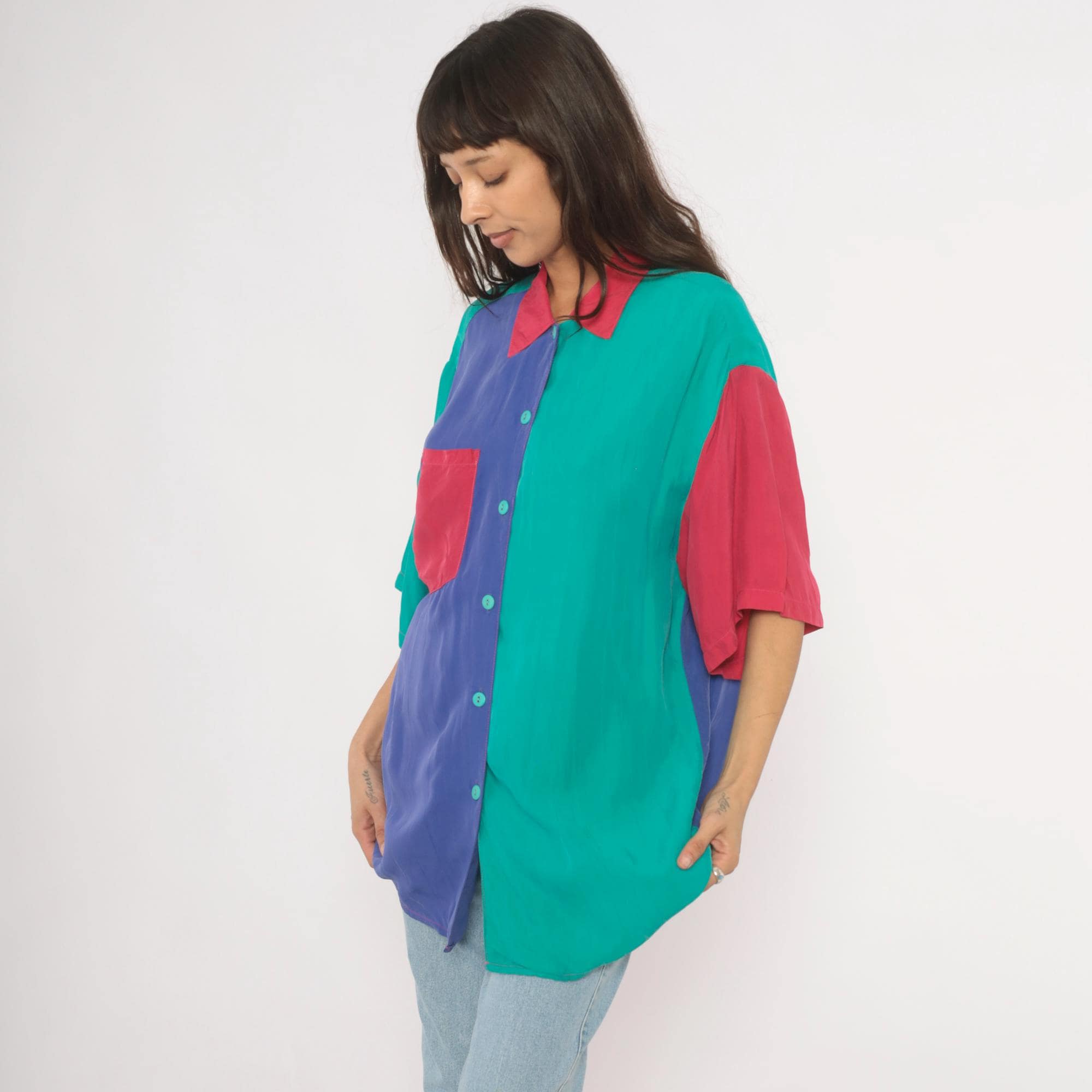 90s color block button front shirt from Ascente with a pink pointed collar and teal buttons down the front. The front splits into a purple panel on the left and teal on the right, with a pink chest pocket spanning both sections. Short dropped sleeves alternate between teal and pink, and the back is predominantly purple with teal shoulder yoke panels.