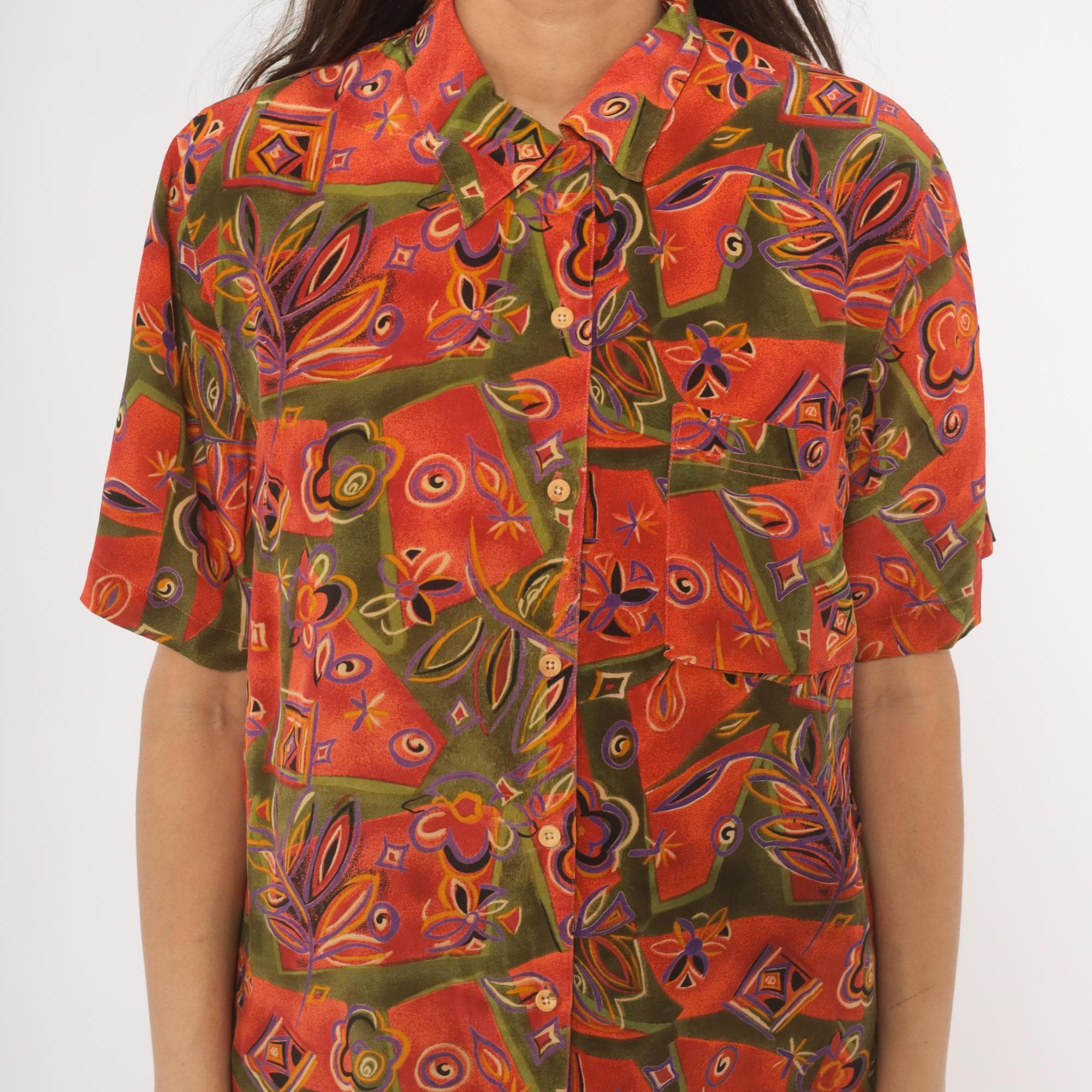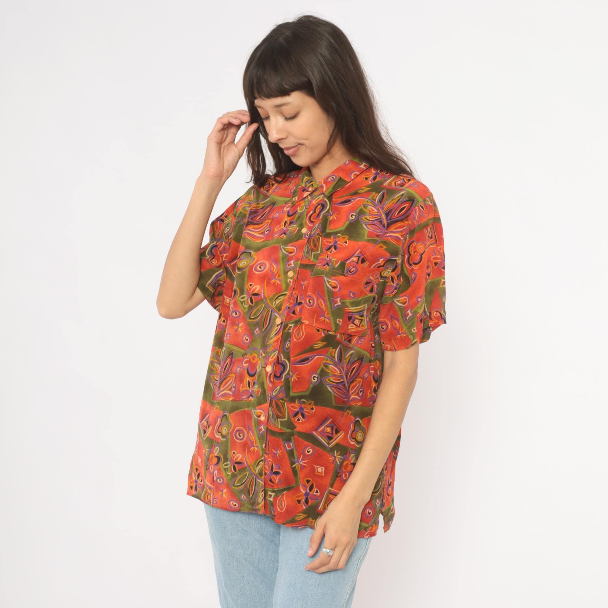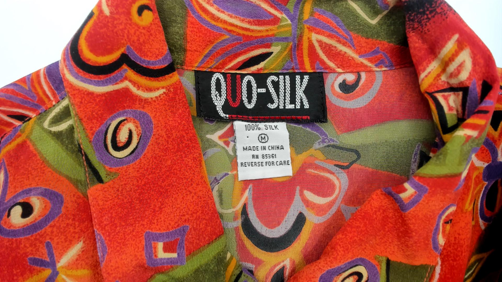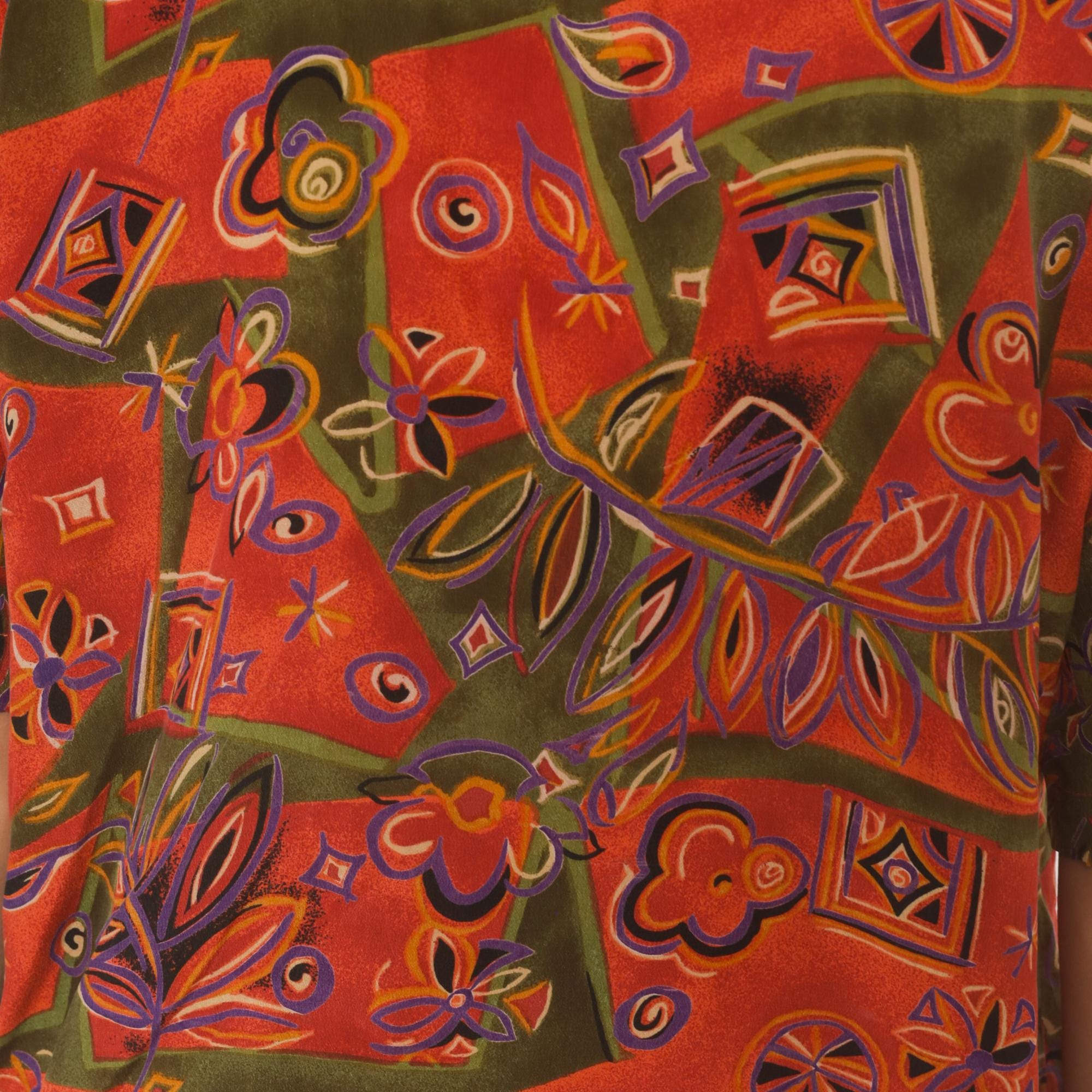 90s abstract patchwork print silk shirt from Quo-Silk in orange, olive green, and purple tones. Button front closure with a camp collar, short sleeves, and a front patch pocket. Stylized floral and leaf motifs layered over geometric shapes across the entire garment, with swirl and diamond accents throughout.
