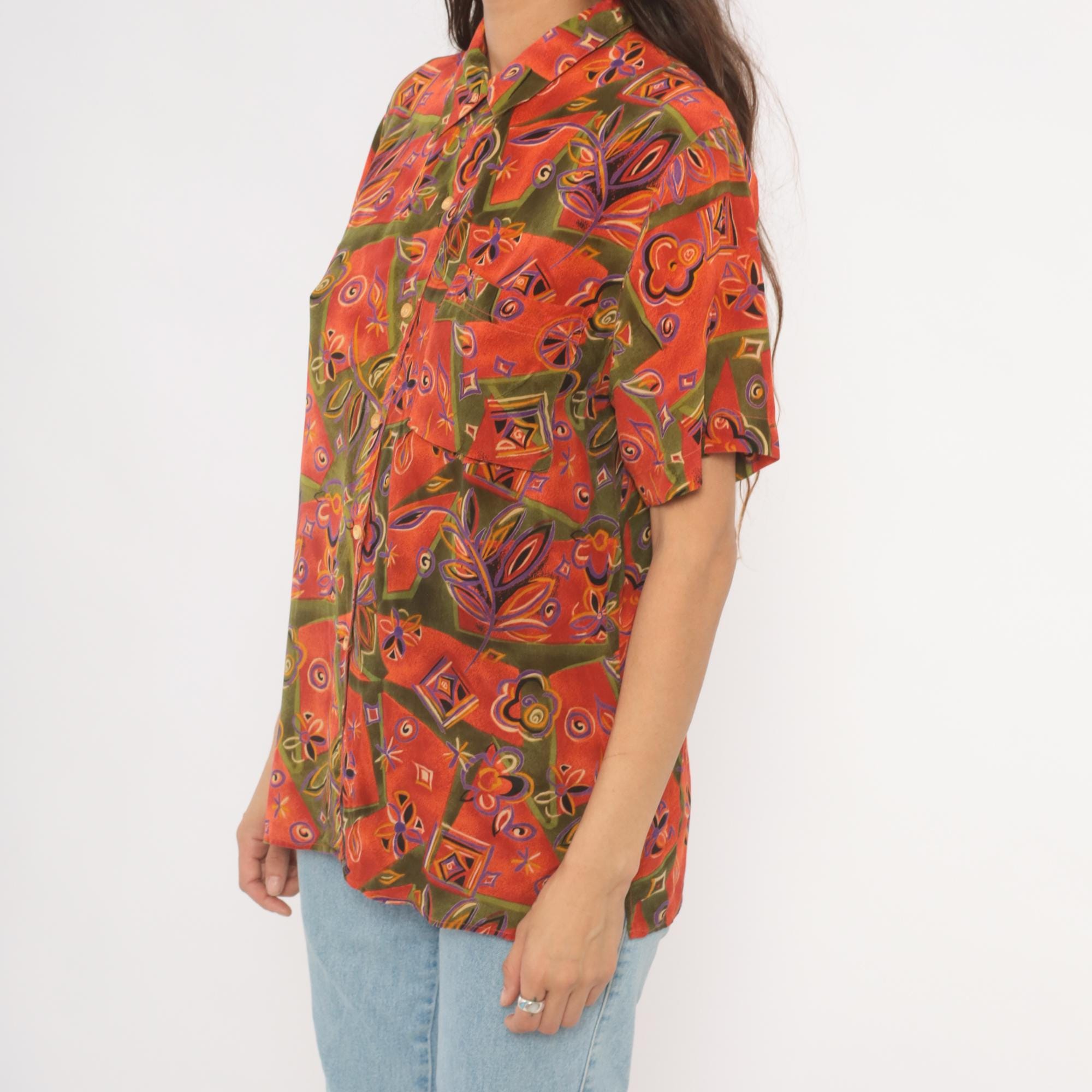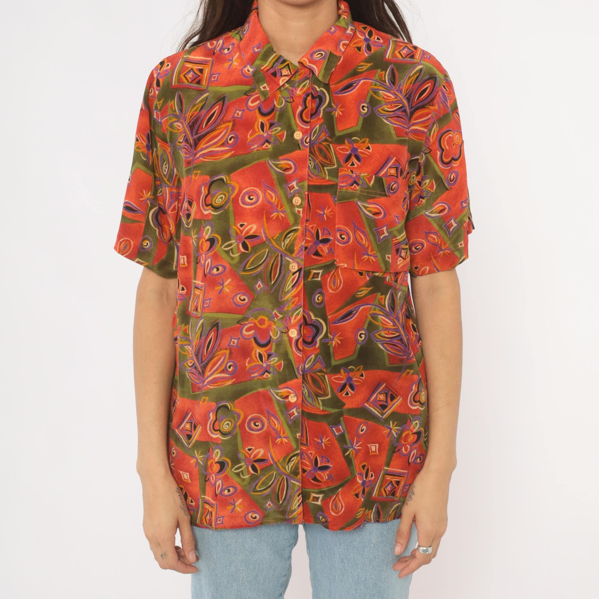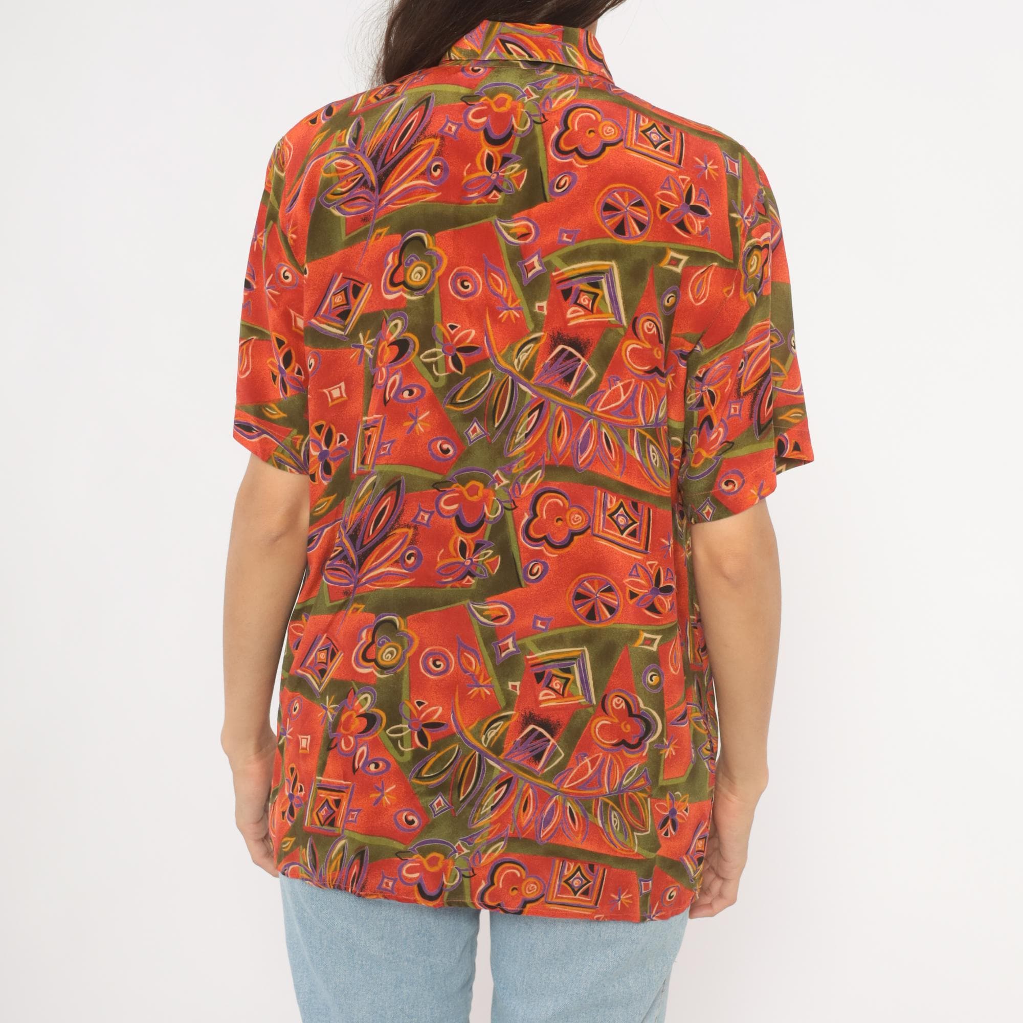 90s abstract patchwork print silk shirt from Quo-Silk in orange, olive green, and purple tones. Button front closure with a camp collar, short sleeves, and a front patch pocket. Stylized floral and leaf motifs layered over geometric shapes across the entire garment, with swirl and diamond accents throughout.