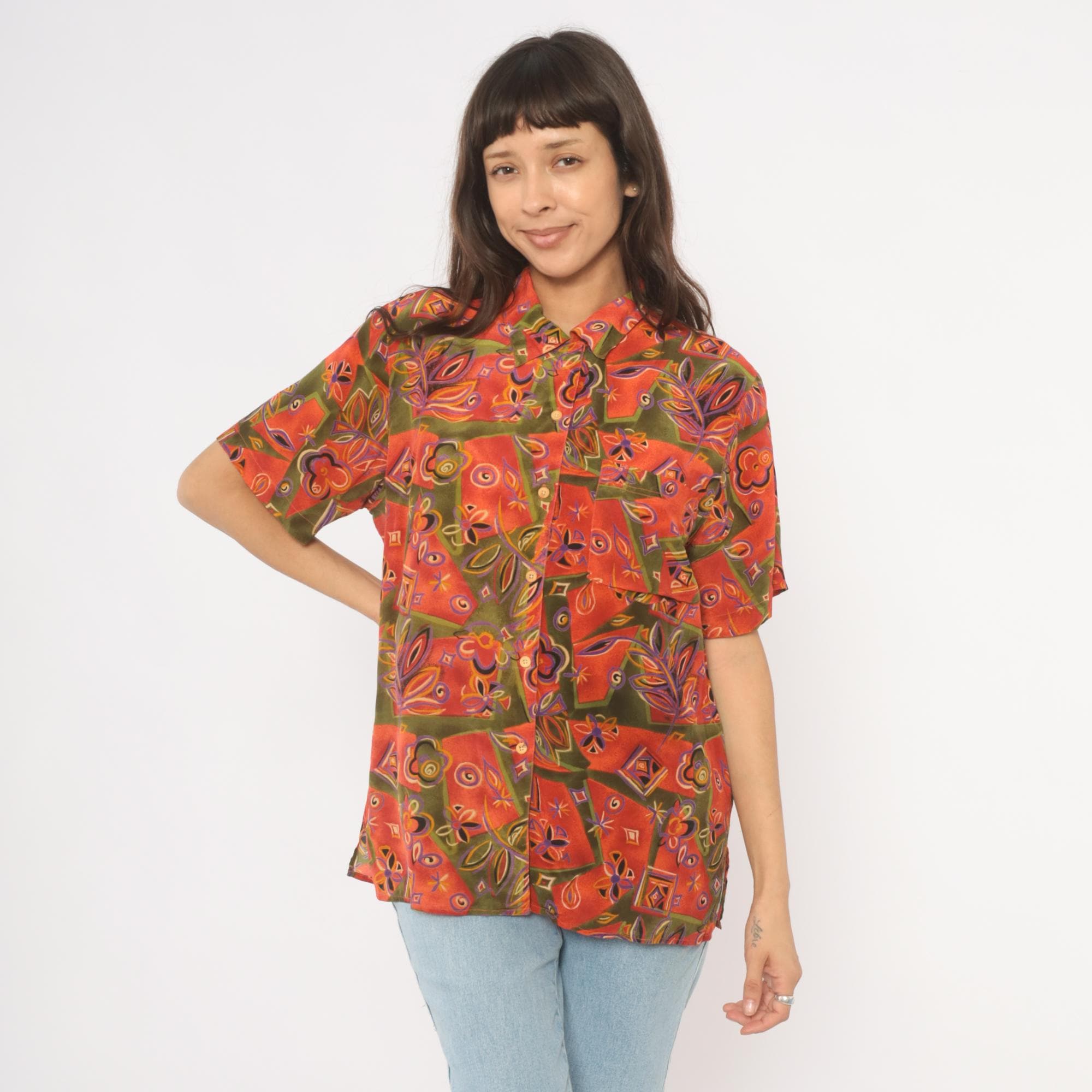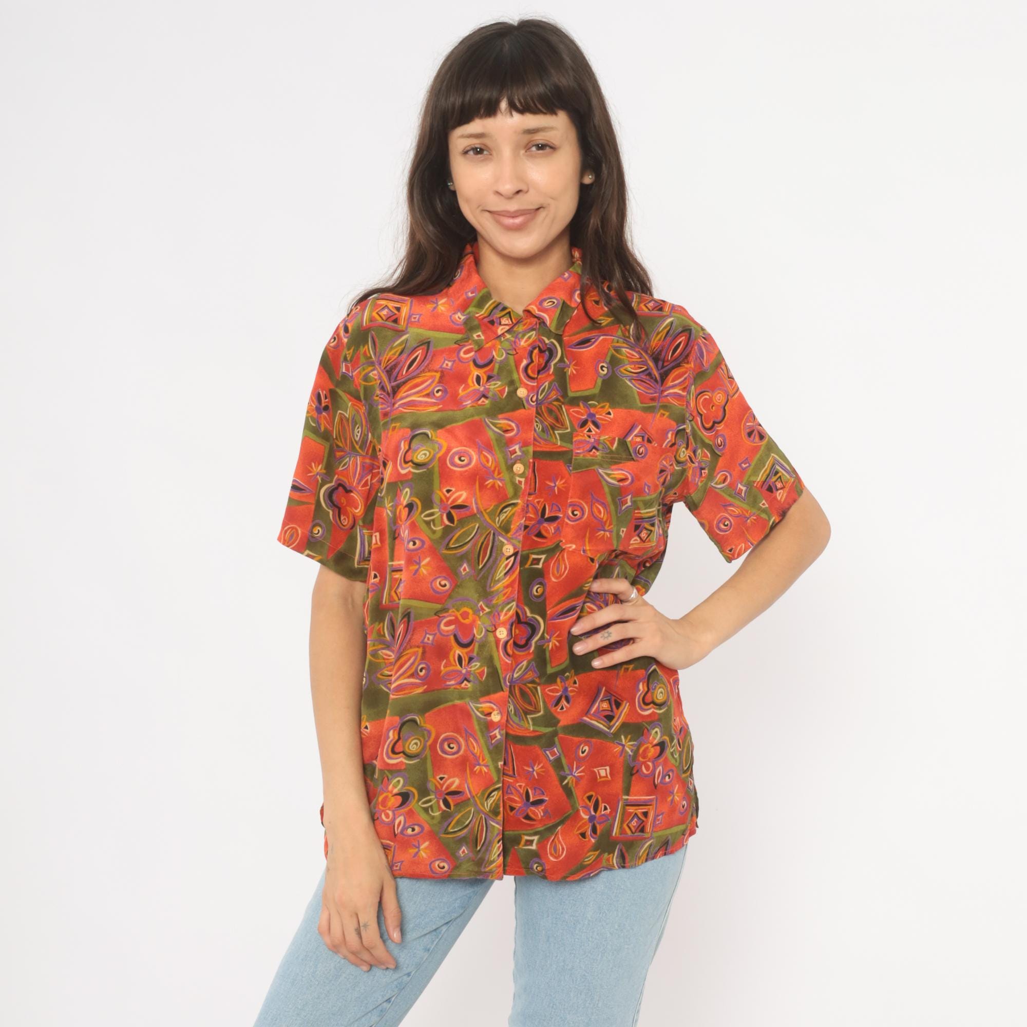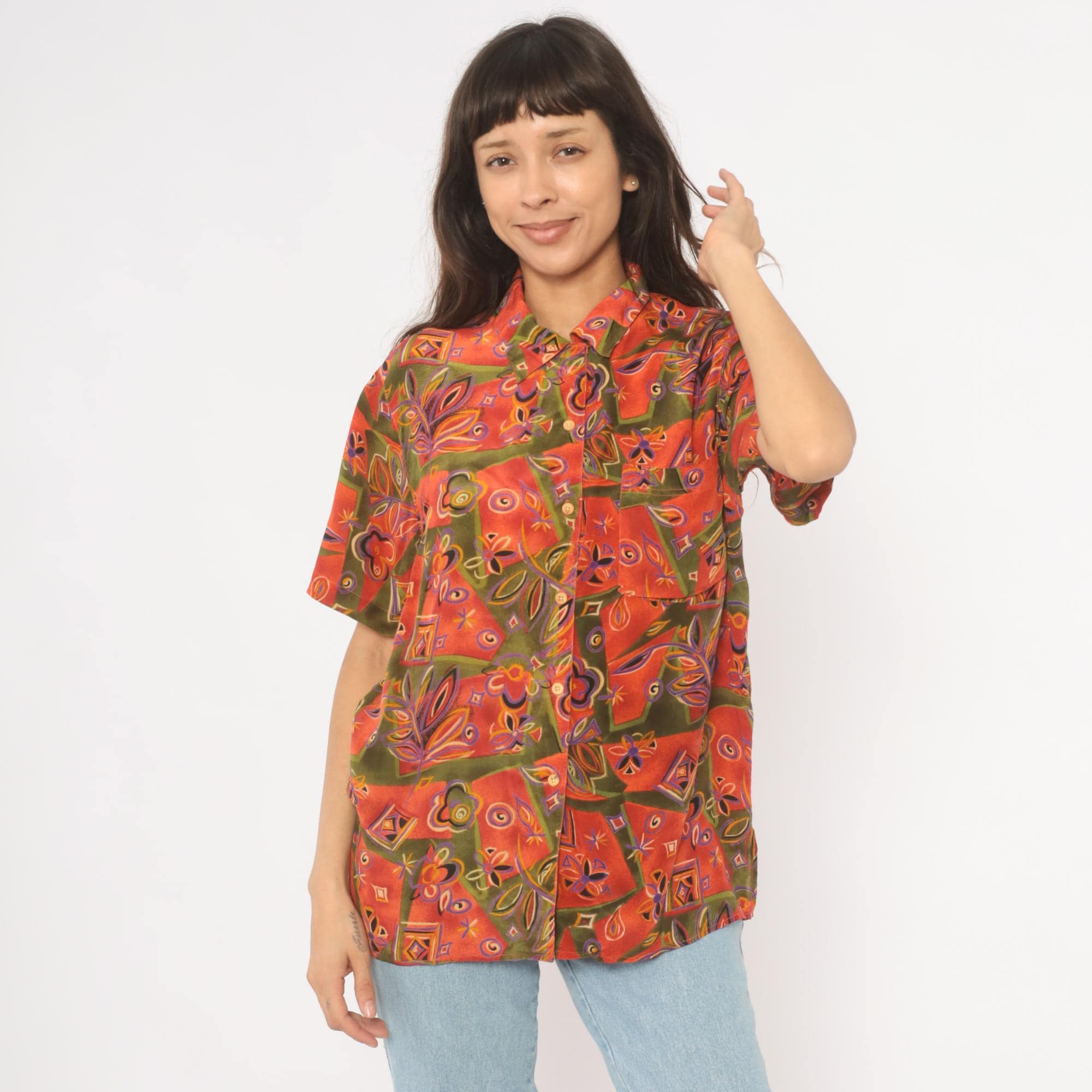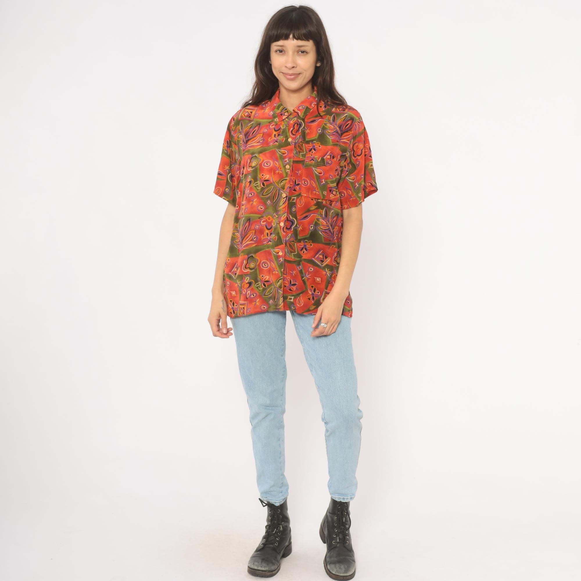 90s abstract patchwork print silk shirt from Quo-Silk in orange, olive green, and purple tones. Button front closure with a camp collar, short sleeves, and a front patch pocket. Stylized floral and leaf motifs layered over geometric shapes across the entire garment, with swirl and diamond accents throughout.