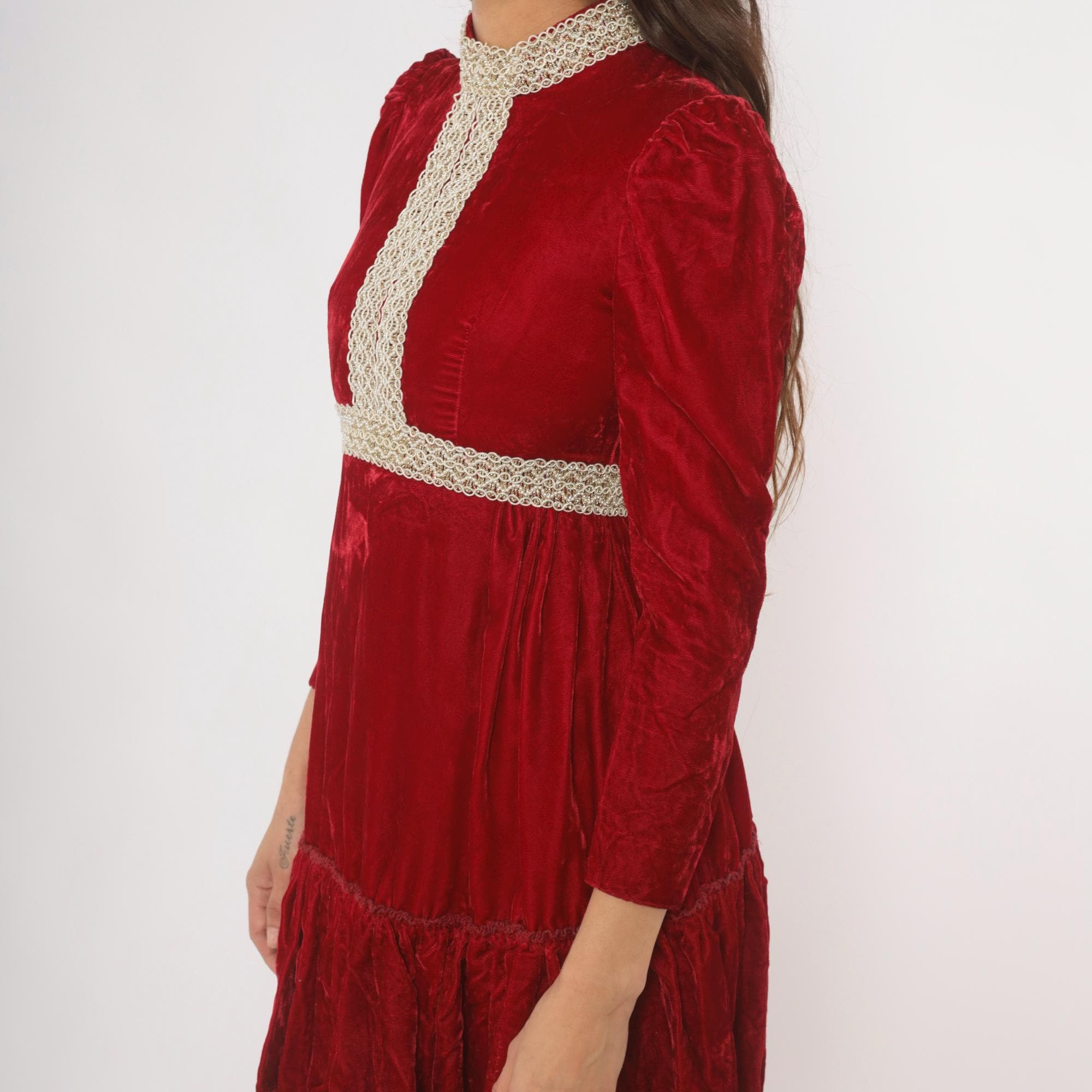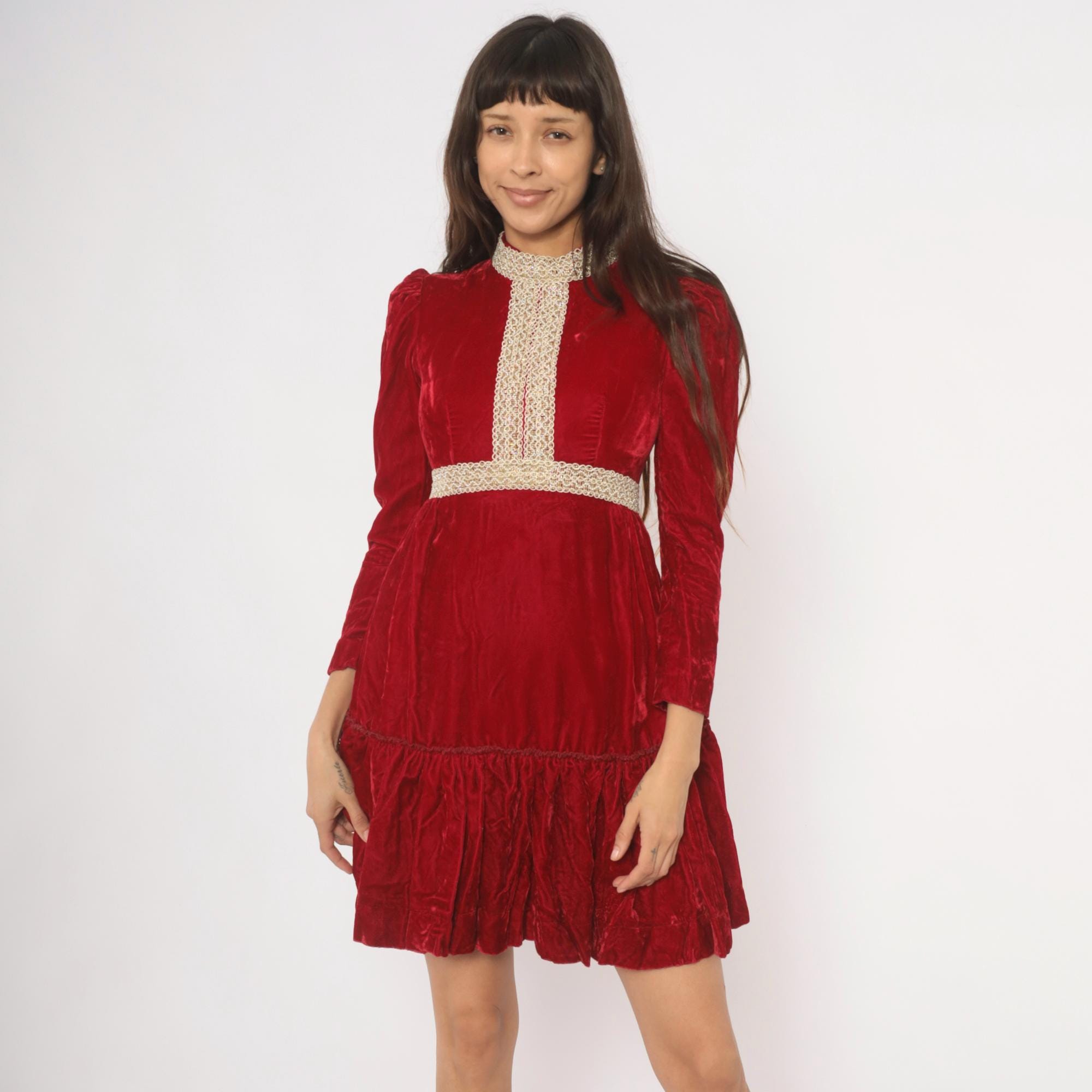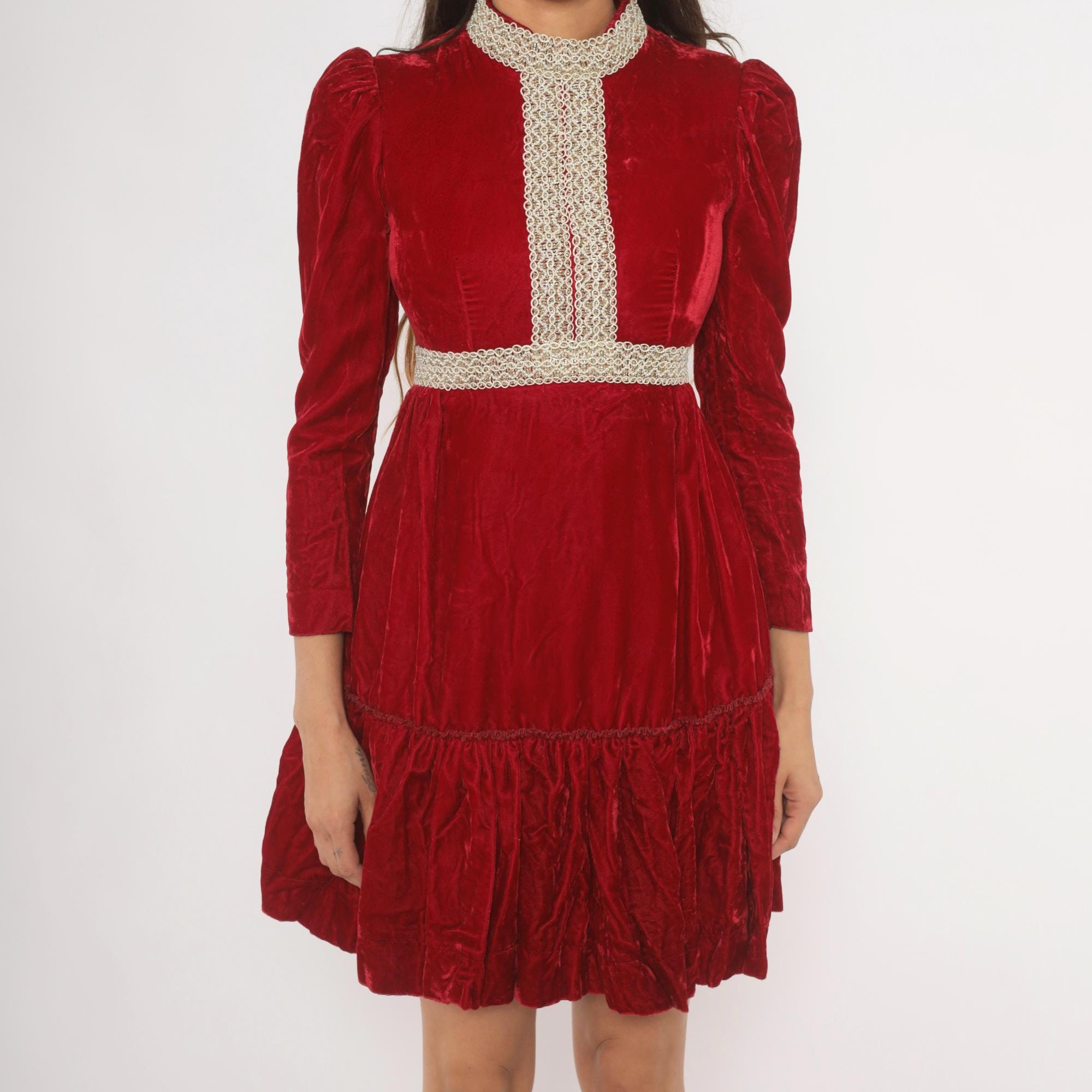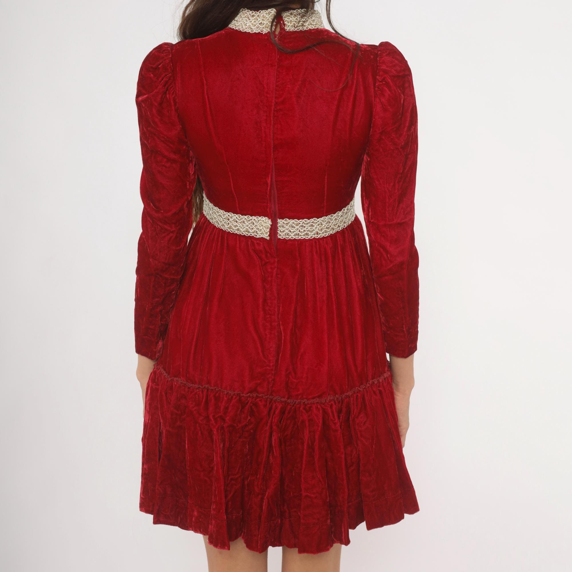 70s crimson velvet mini dress with a high mock neck, puff shoulders, and long fitted sleeves. Gold and cream braided lace trim runs down the center front bodice, around the collar, and at the empire waistline. The skirt gathers at the waist into an A-line shape with a ruffled flounce hem. Back zipper with hook and eye closure.