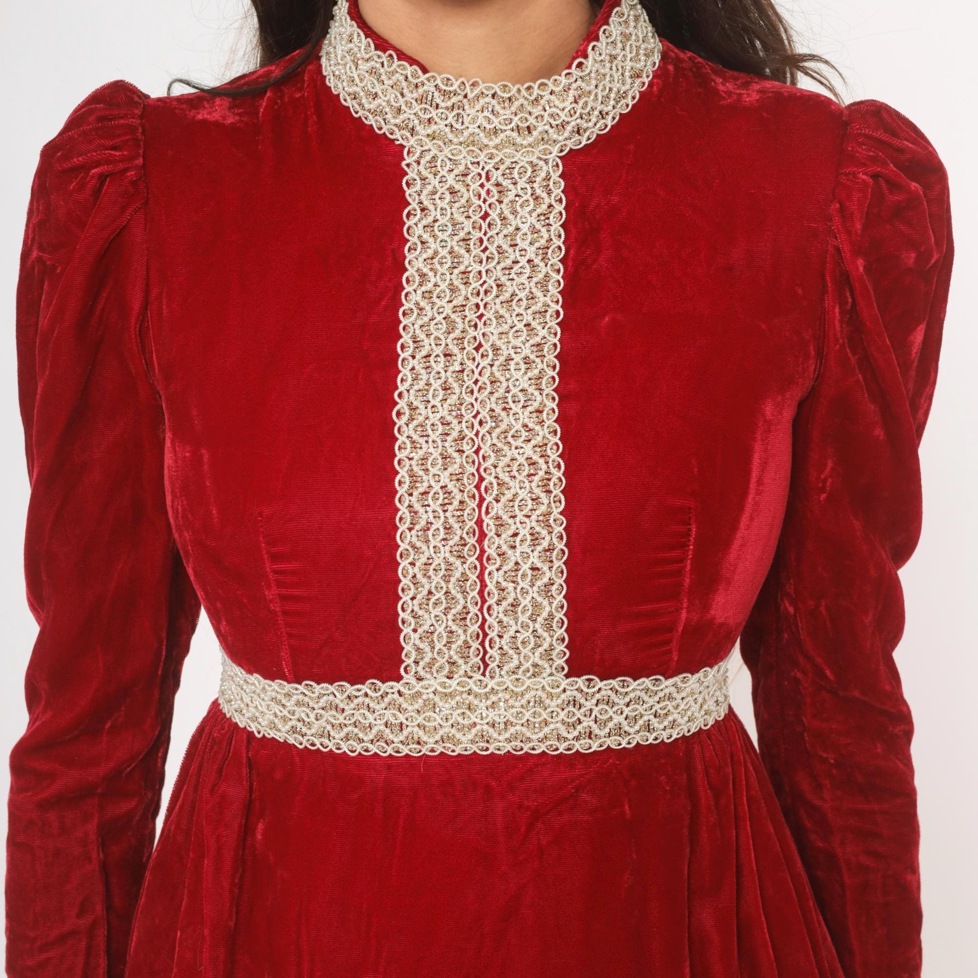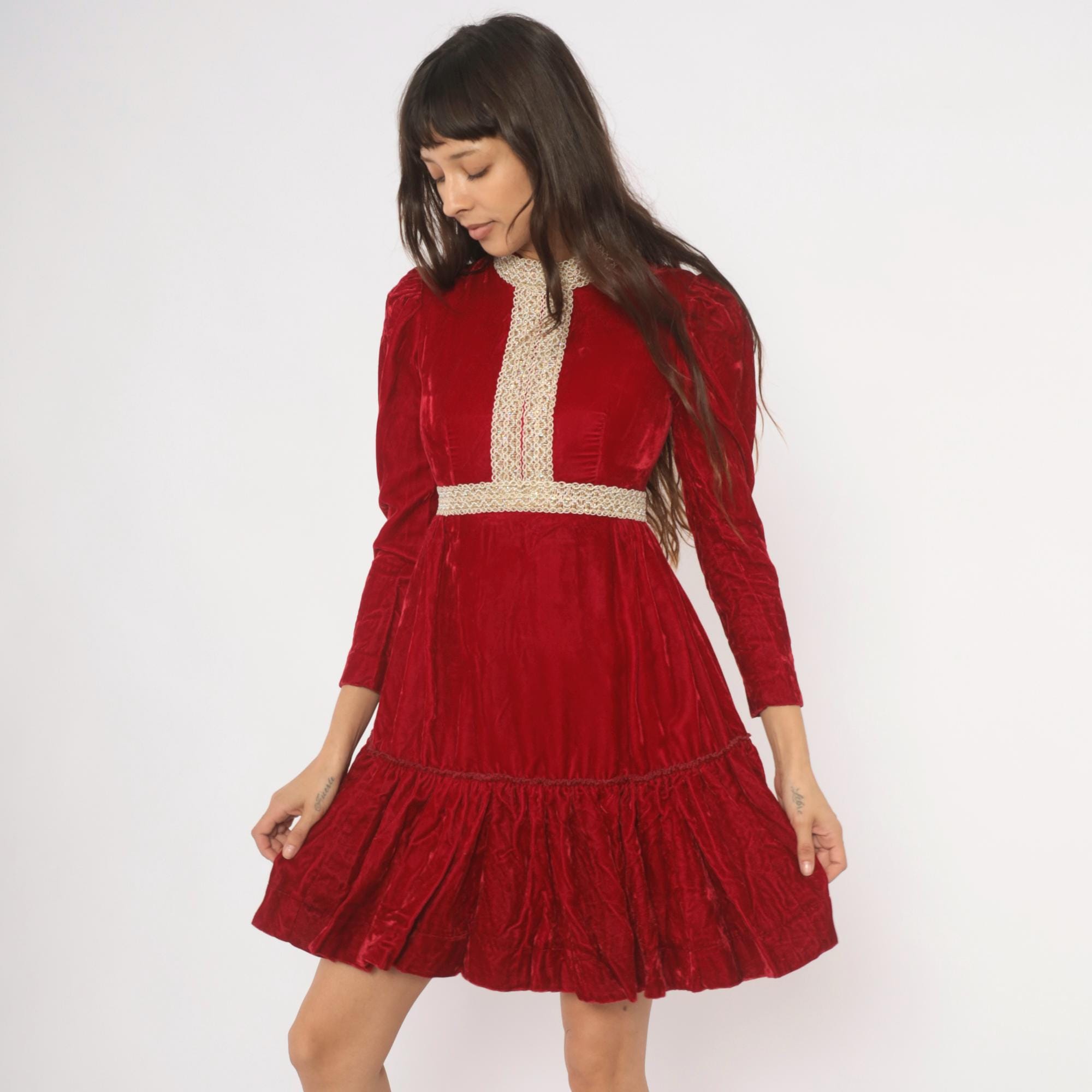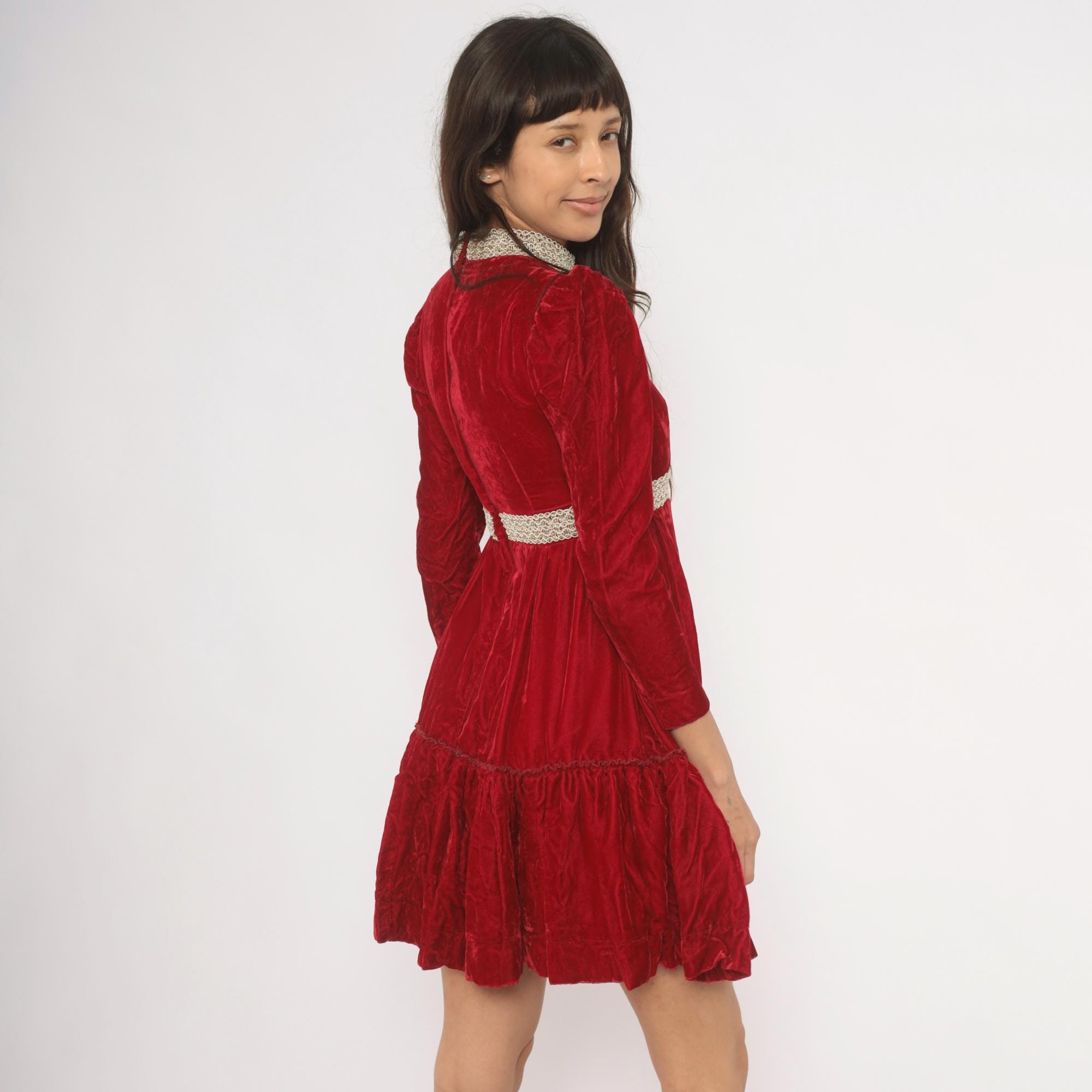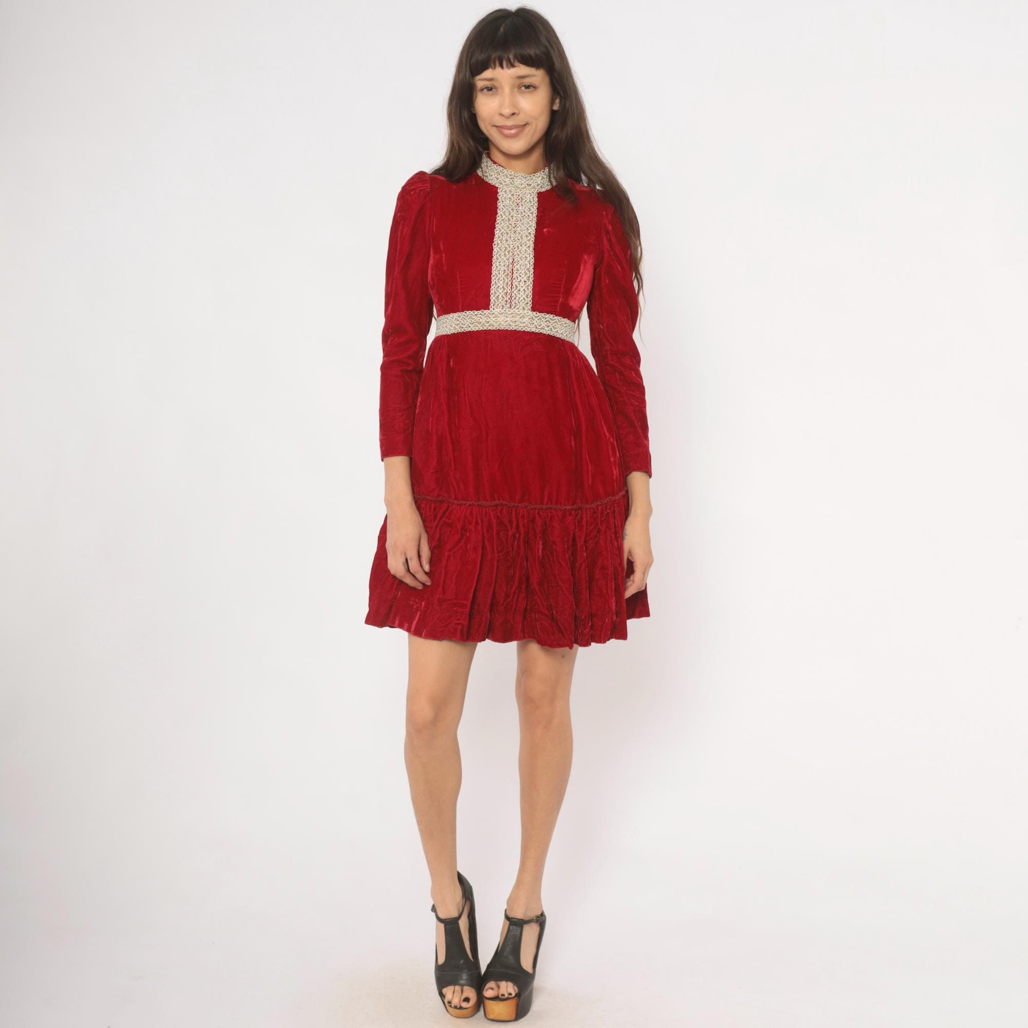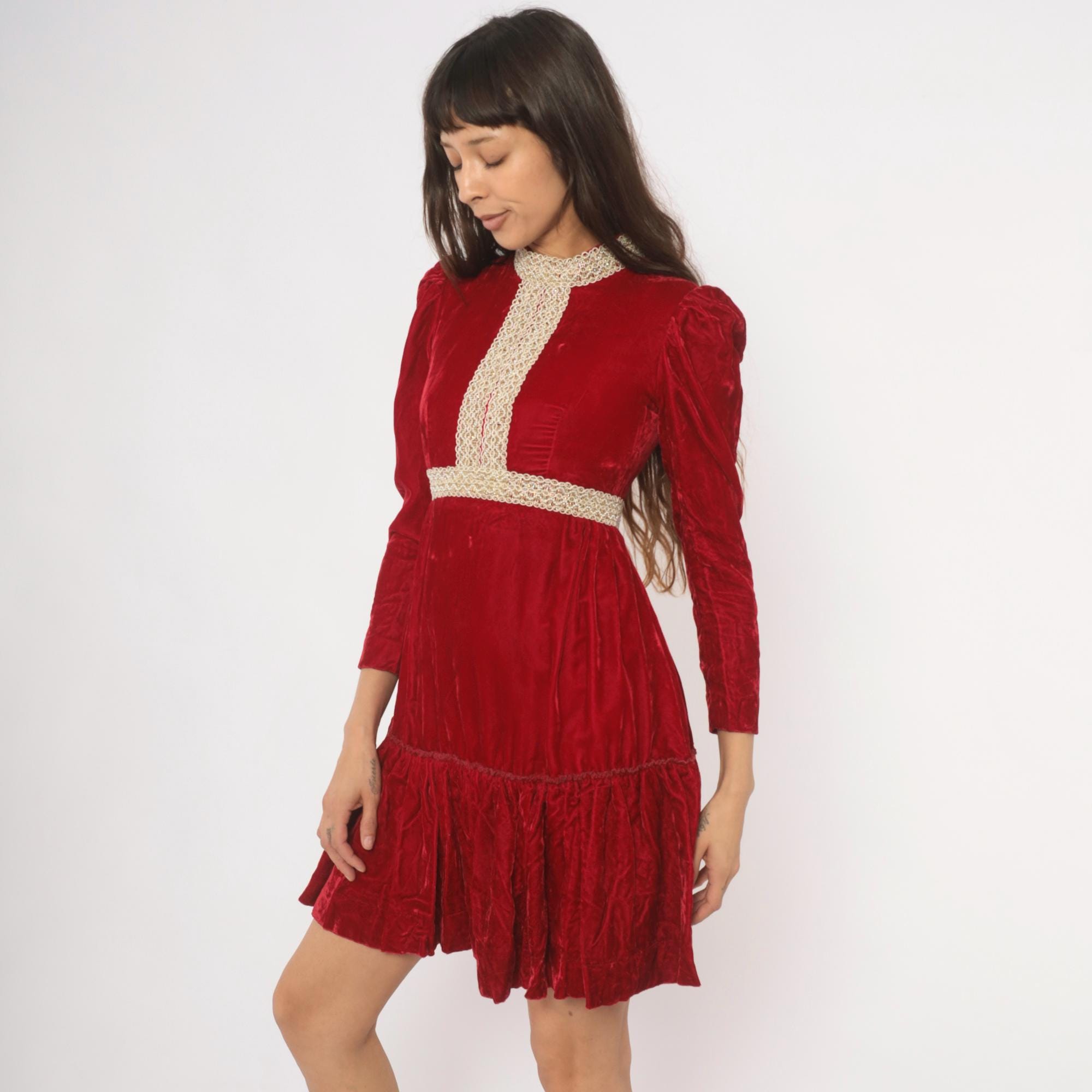 70s crimson velvet mini dress with a high mock neck, puff shoulders, and long fitted sleeves. Gold and cream braided lace trim runs down the center front bodice, around the collar, and at the empire waistline. The skirt gathers at the waist into an A-line shape with a ruffled flounce hem. Back zipper with hook and eye closure.