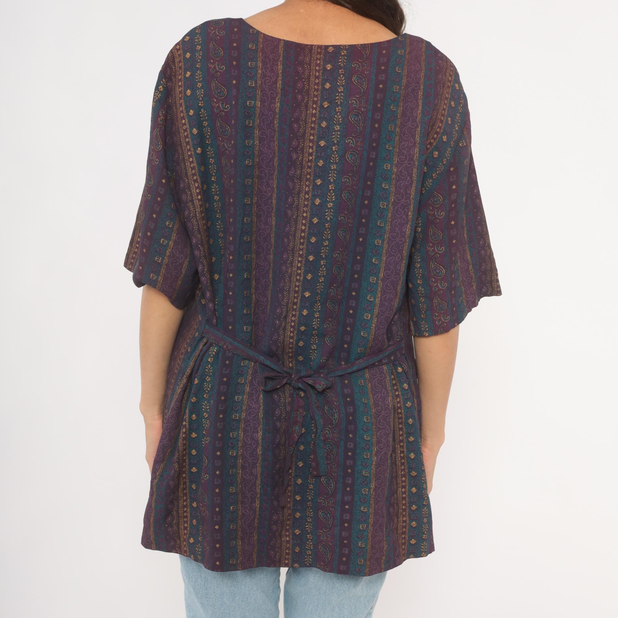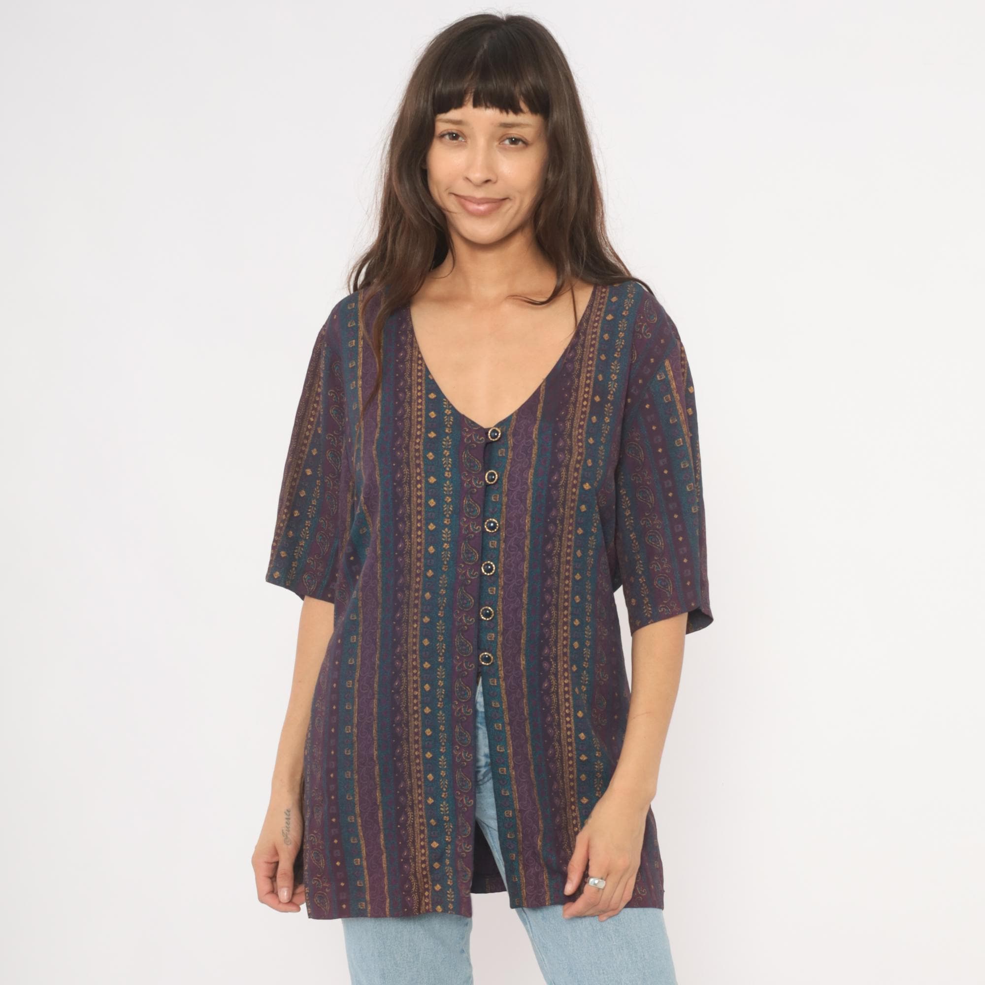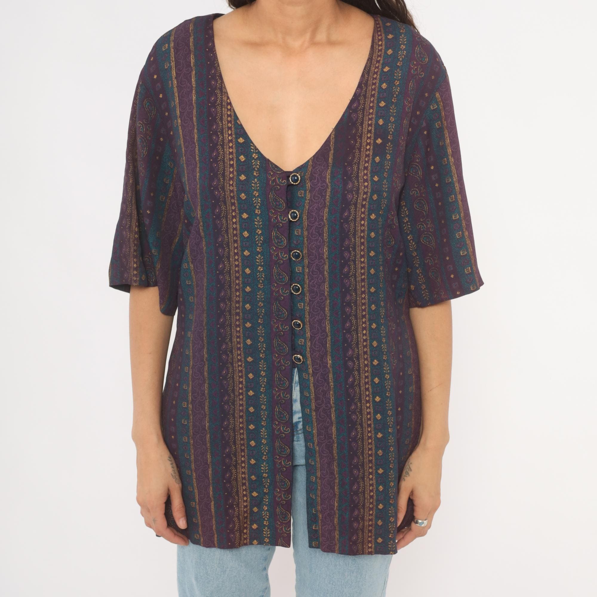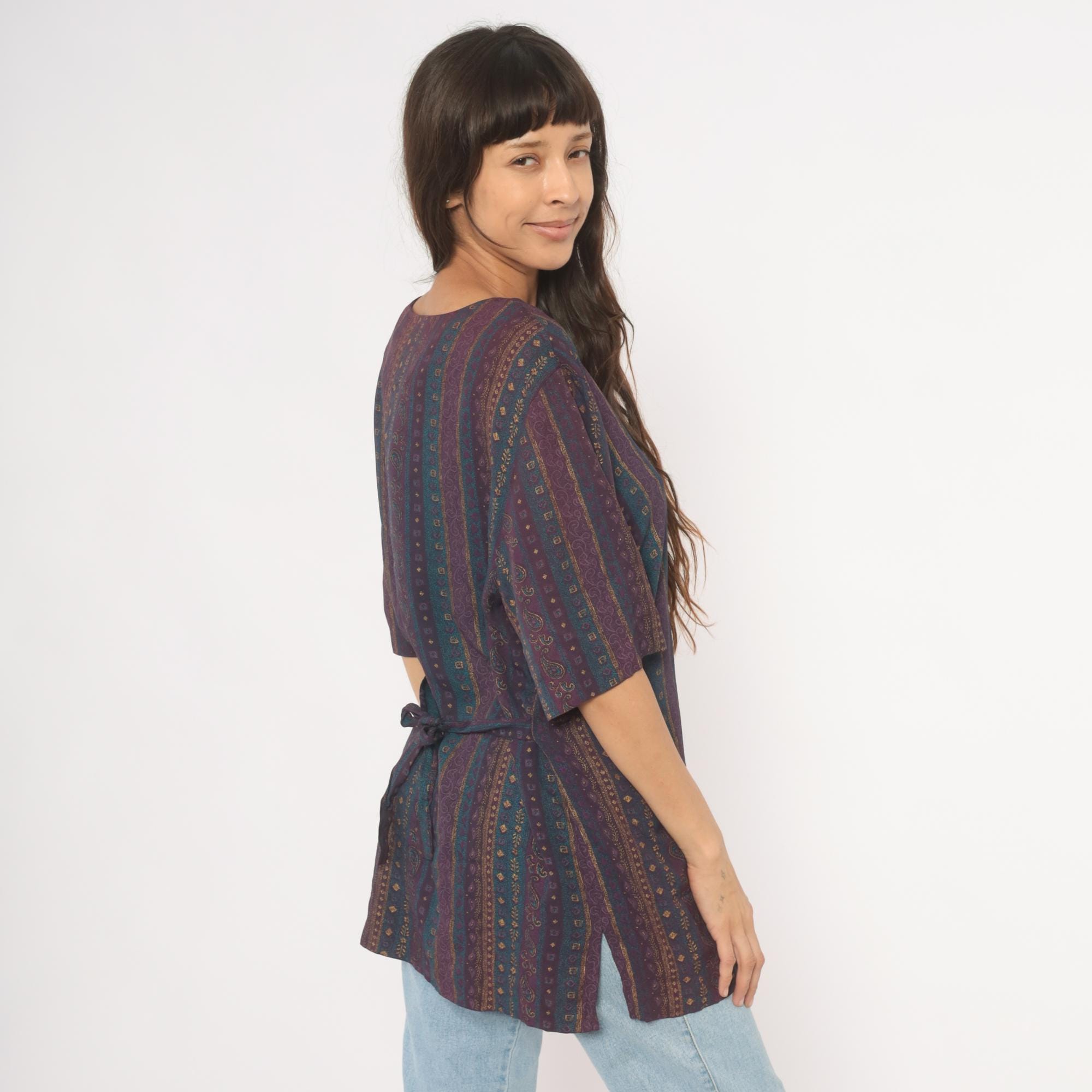 80s button front tunic from Reed Terry with a deep V neckline and vertical paisley stripe pattern in plum, teal, and gold tones. Decorative cabochon-style buttons down the front, half-length sleeves, and a tie closure at the back waist. Straight, relaxed silhouette with hip-length hem and side slits at the lower edge.