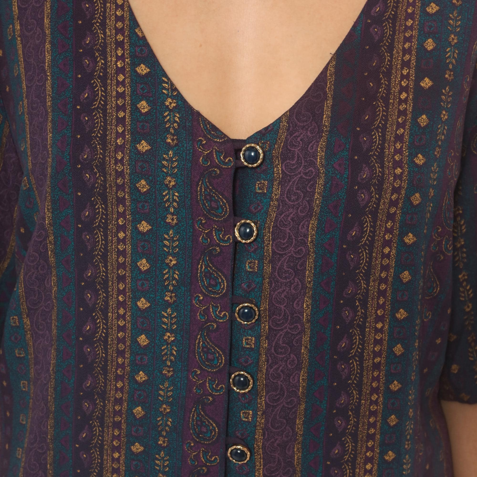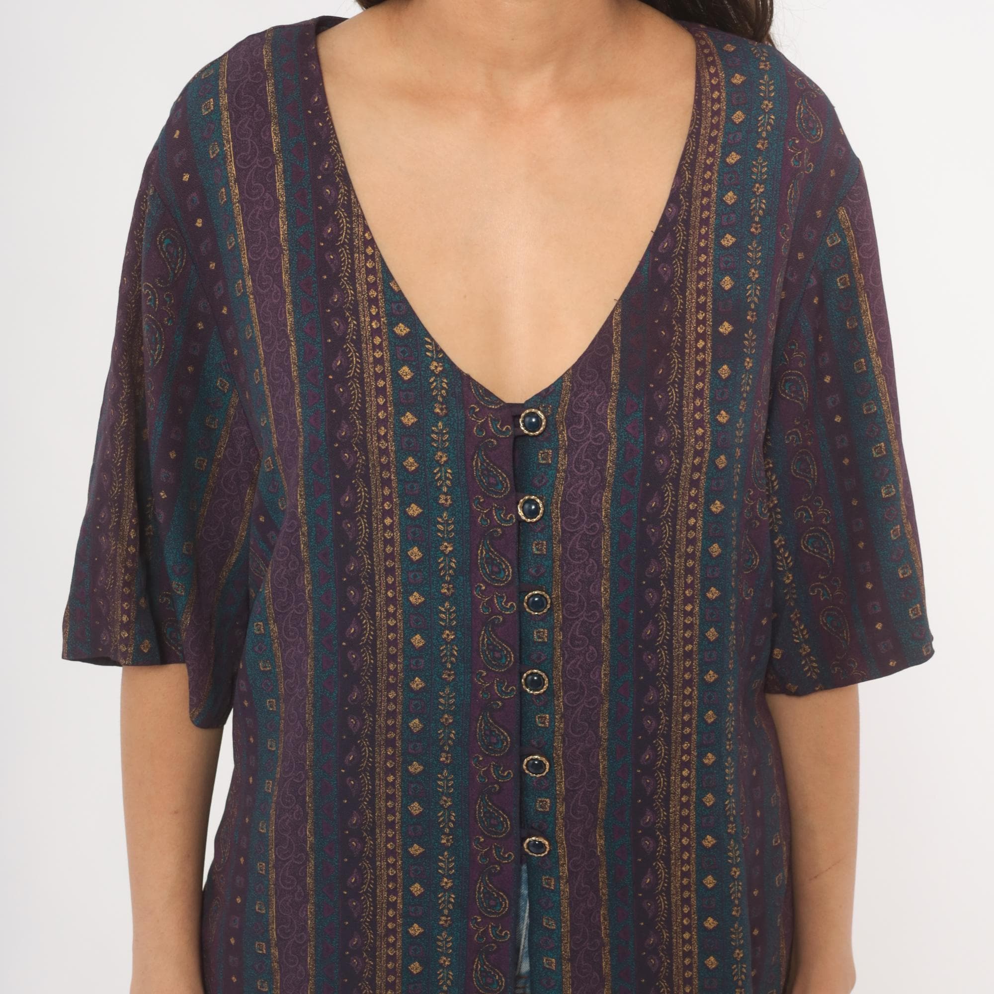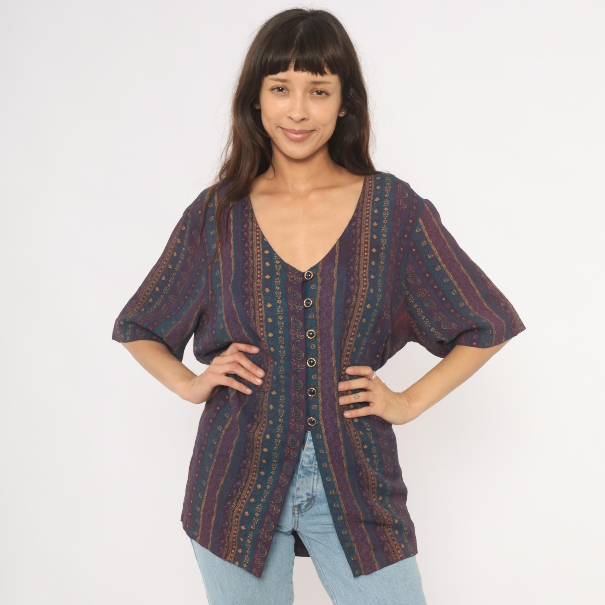 80s button front tunic from Reed Terry with a deep V neckline and vertical paisley stripe pattern in plum, teal, and gold tones. Decorative cabochon-style buttons down the front, half-length sleeves, and a tie closure at the back waist. Straight, relaxed silhouette with hip-length hem and side slits at the lower edge.
