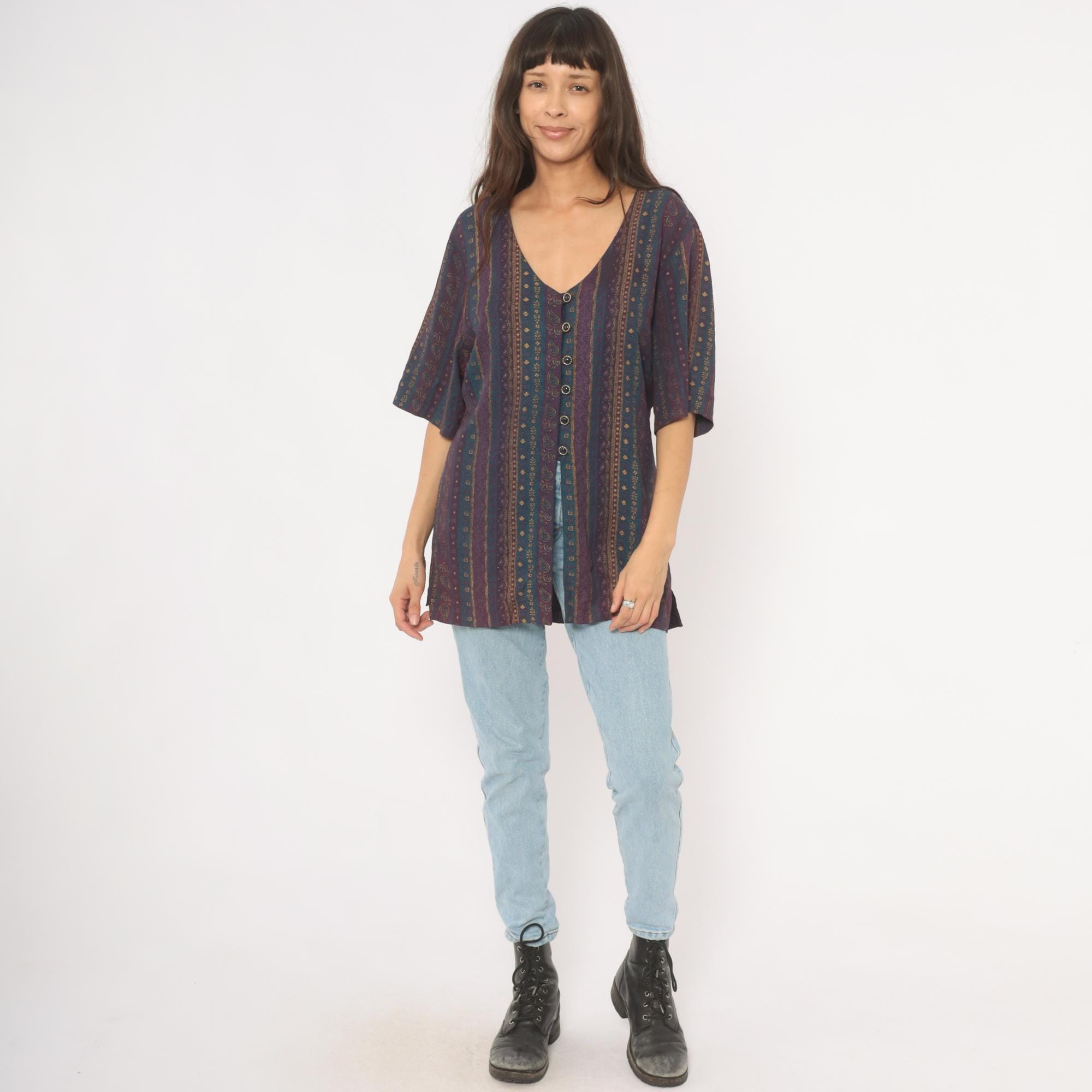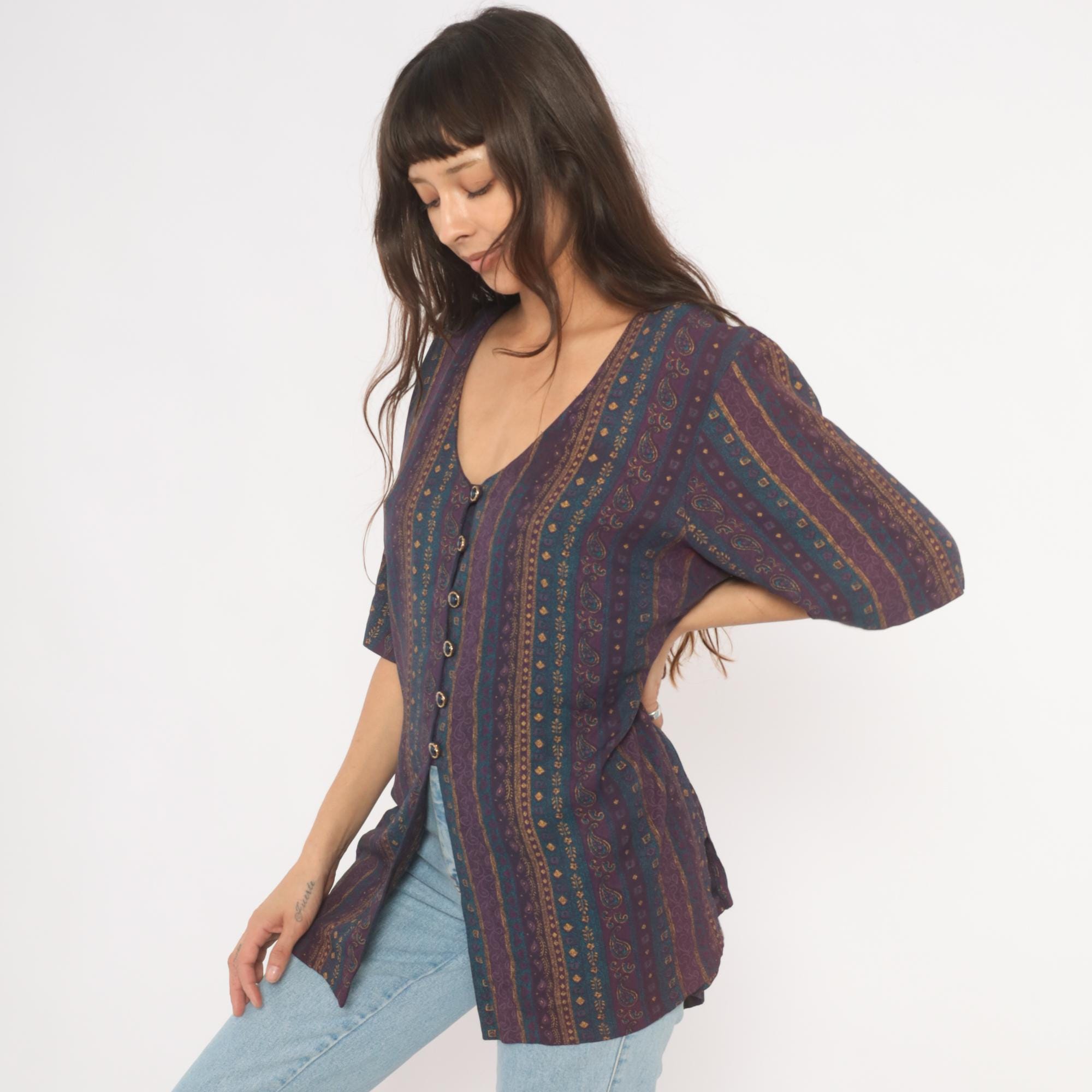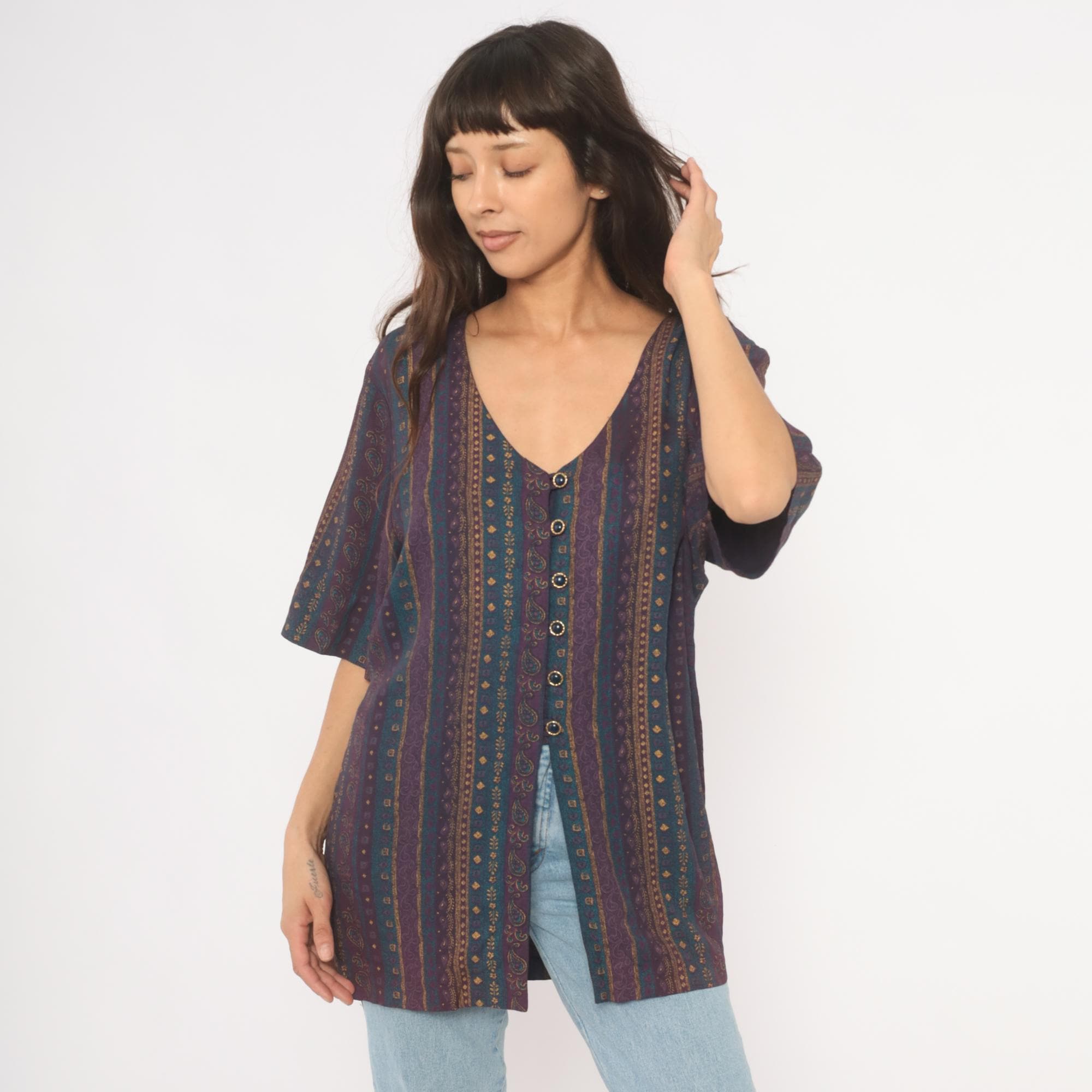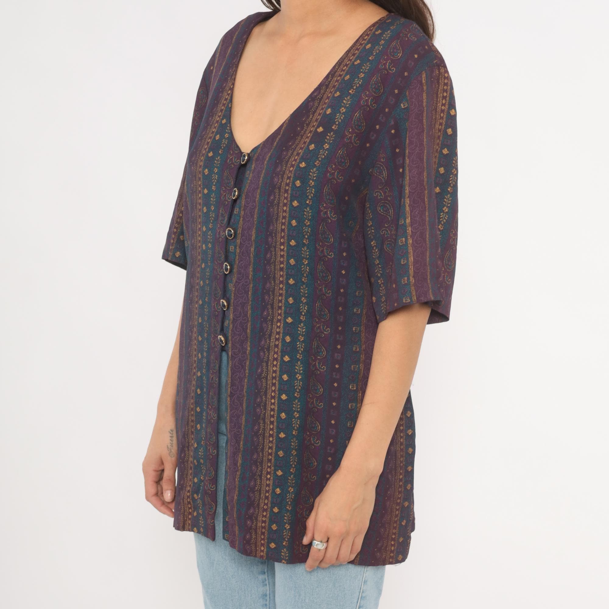 80s button front tunic from Reed Terry with a deep V neckline and vertical paisley stripe pattern in plum, teal, and gold tones. Decorative cabochon-style buttons down the front, half-length sleeves, and a tie closure at the back waist. Straight, relaxed silhouette with hip-length hem and side slits at the lower edge.
