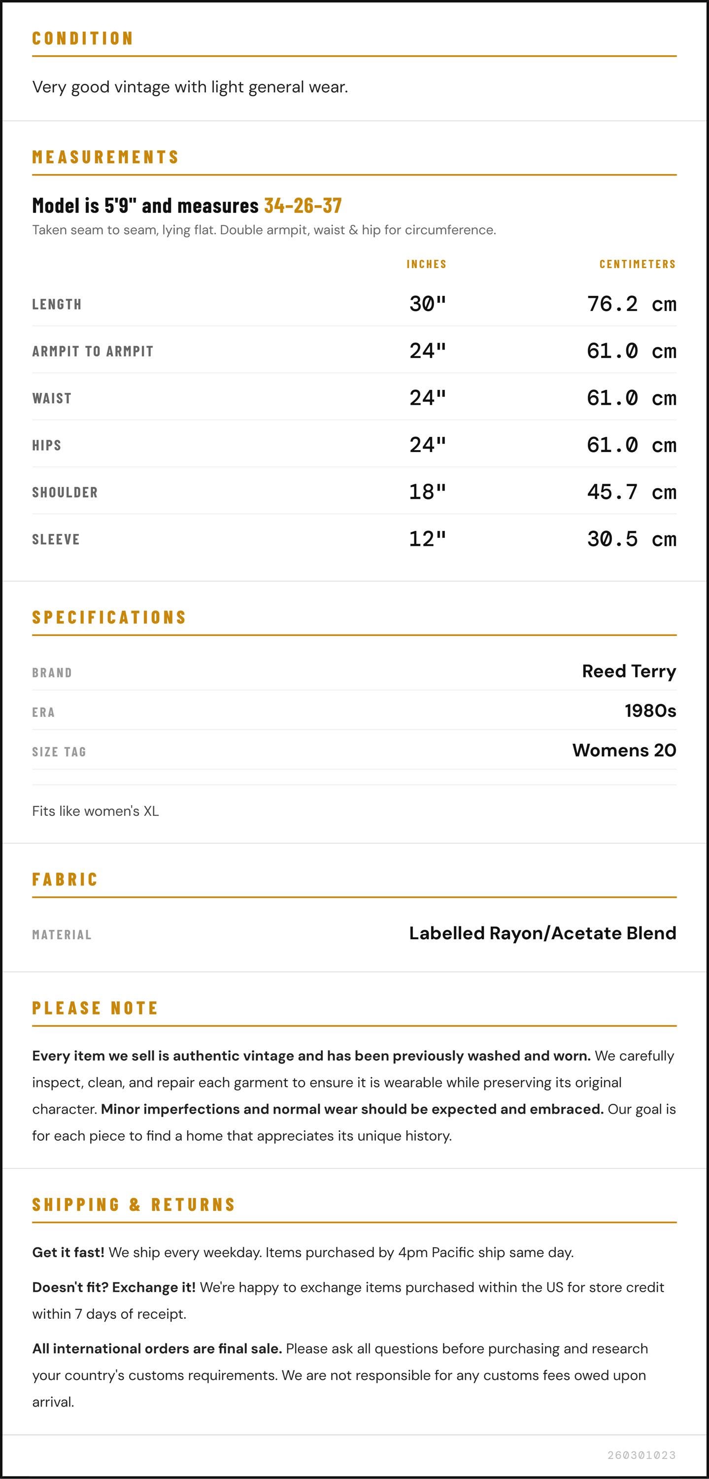 Measurements are taken laying flat and should be doubled where applicable. The "best fits" size is just an estimate, and vintage sizing can vary from modern sizing. Please use measurements to ensure proper fit. The best thing to do is measure a similar item of your own, and compare. When an item has stretch, we will list the unstretched dimensions with the stretched measurement afterwards.
