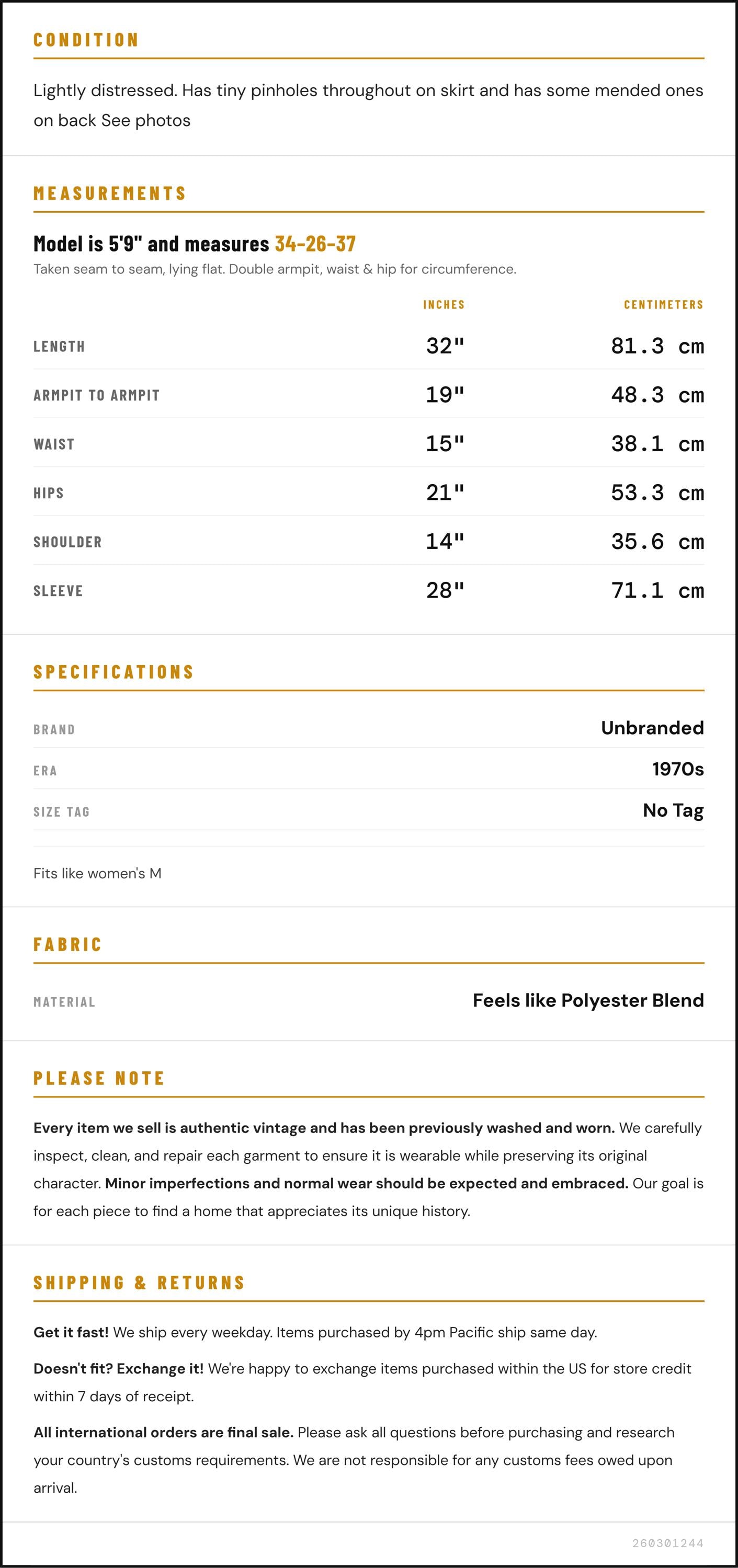 Condition: Lightly distressed. Has tiny pinholes throughout on skirt and has some mended ones on back See photos