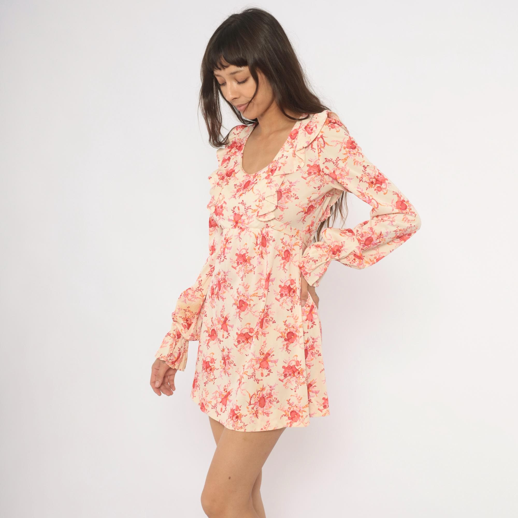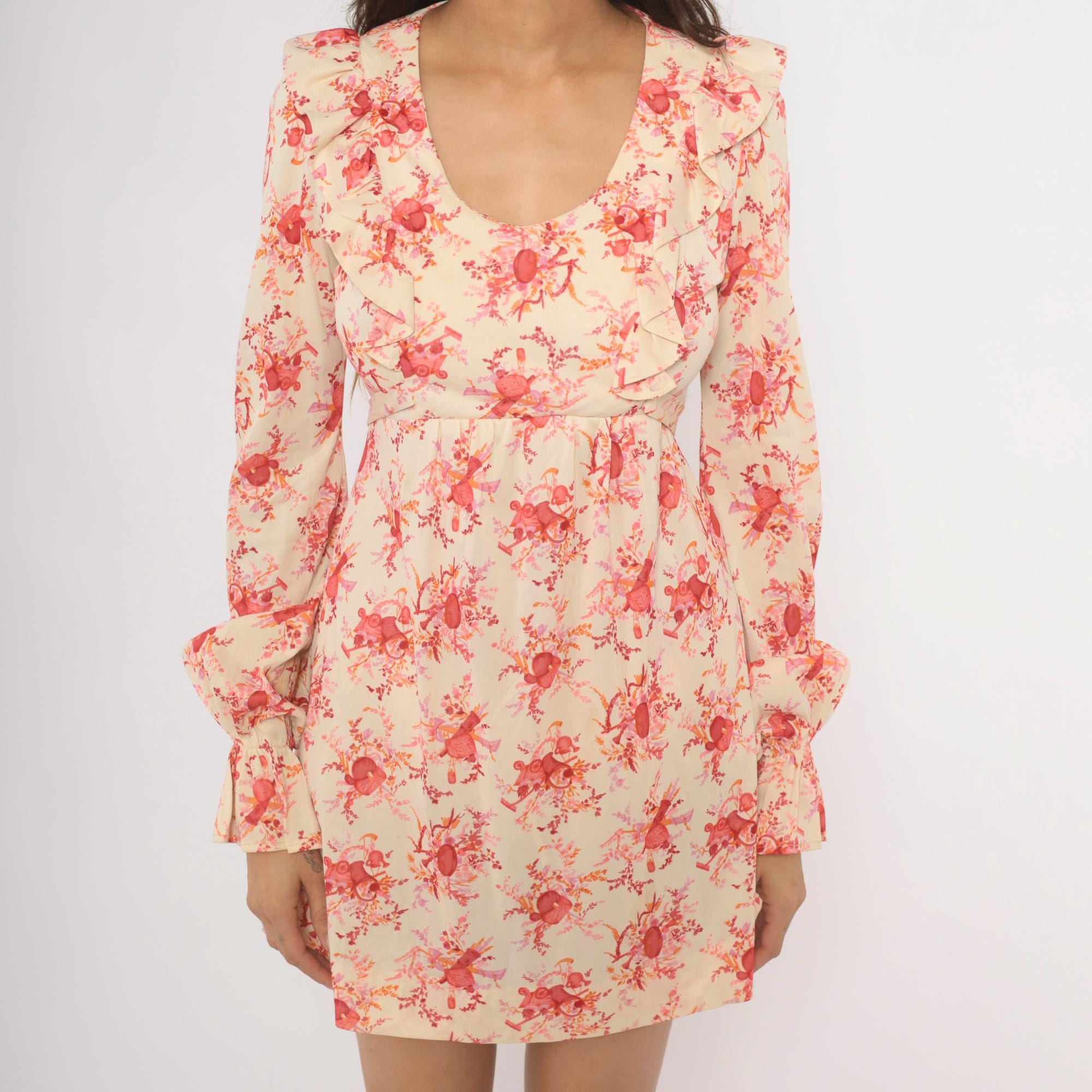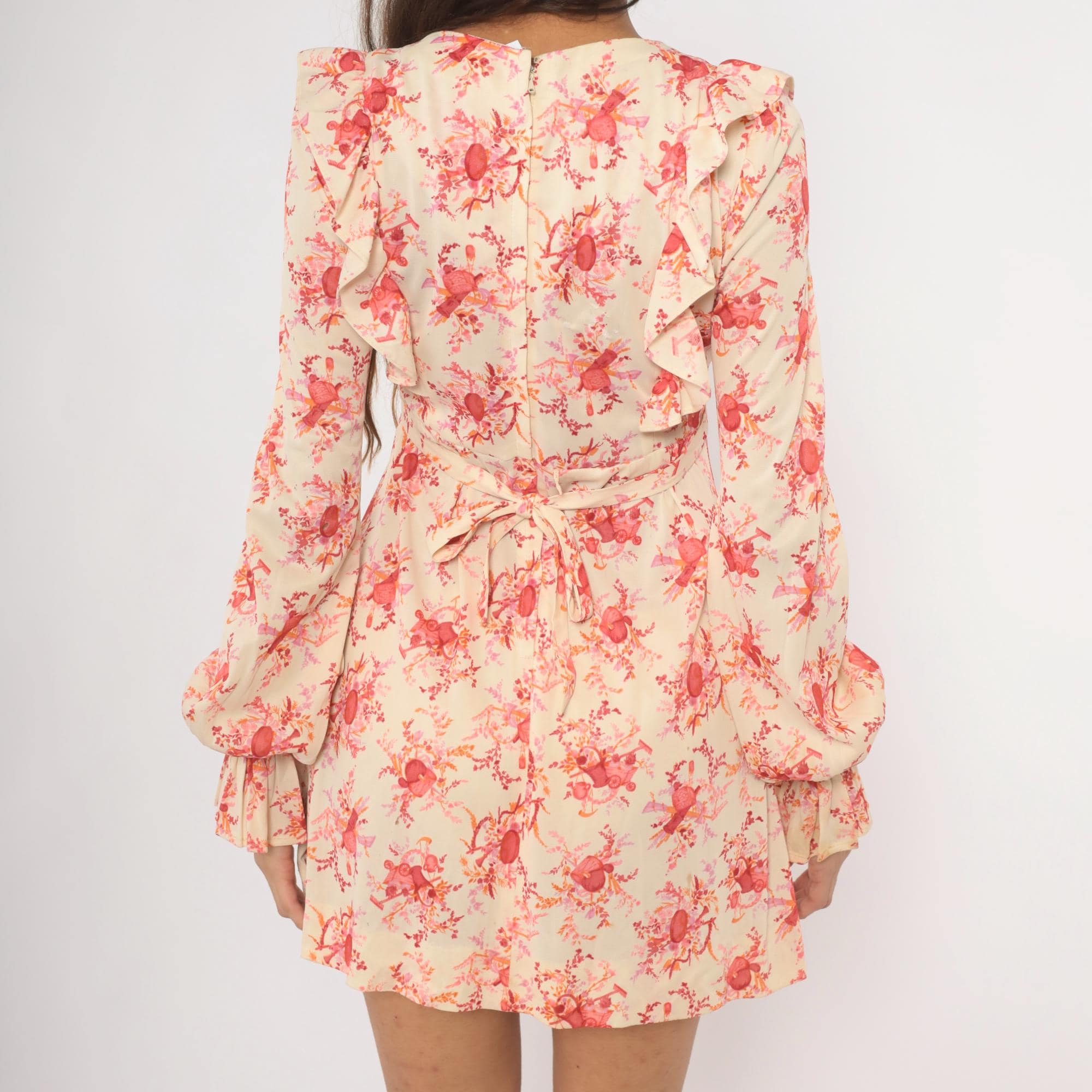 70s cream and pink floral print mini dress with a wide ruffle collar framing a scoop neckline. Long sleeves with gathered bell cuffs, fitted waist with a tie sash at the back, and an A-line skirt. Back zipper closure, rose and coral toned toile-style print across an ivory ground.