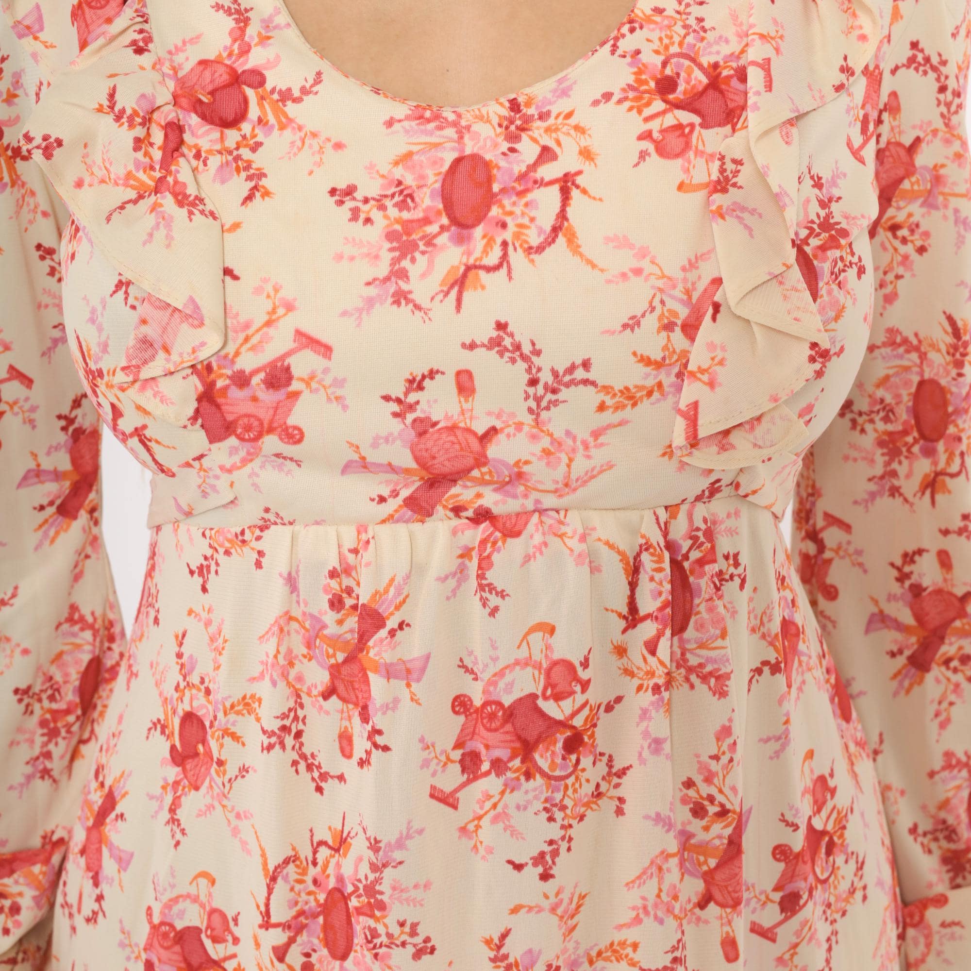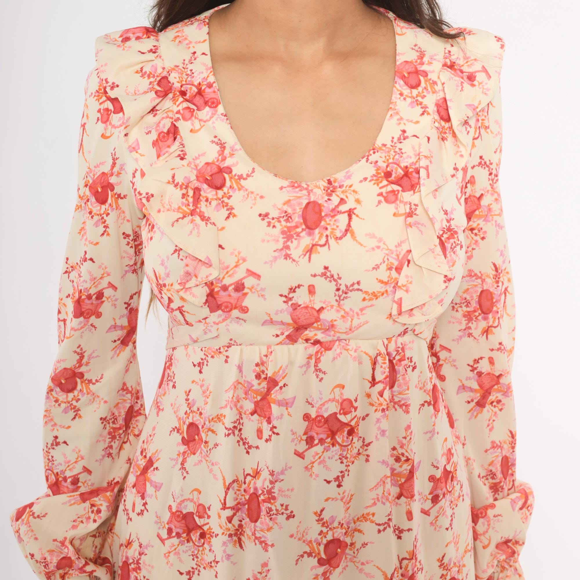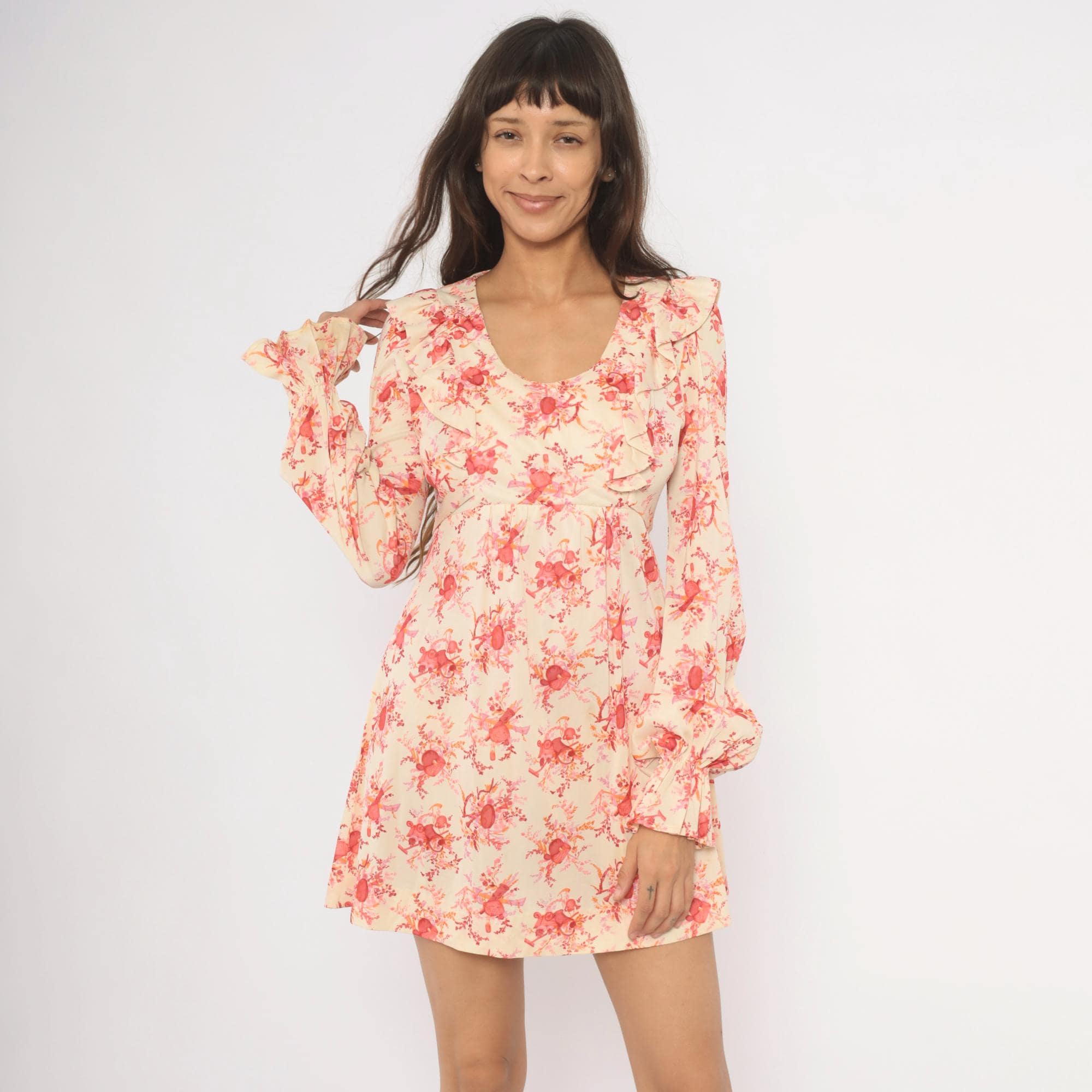 70s cream and pink floral print mini dress with a wide ruffle collar framing a scoop neckline. Long sleeves with gathered bell cuffs, fitted waist with a tie sash at the back, and an A-line skirt. Back zipper closure, rose and coral toned toile-style print across an ivory ground.