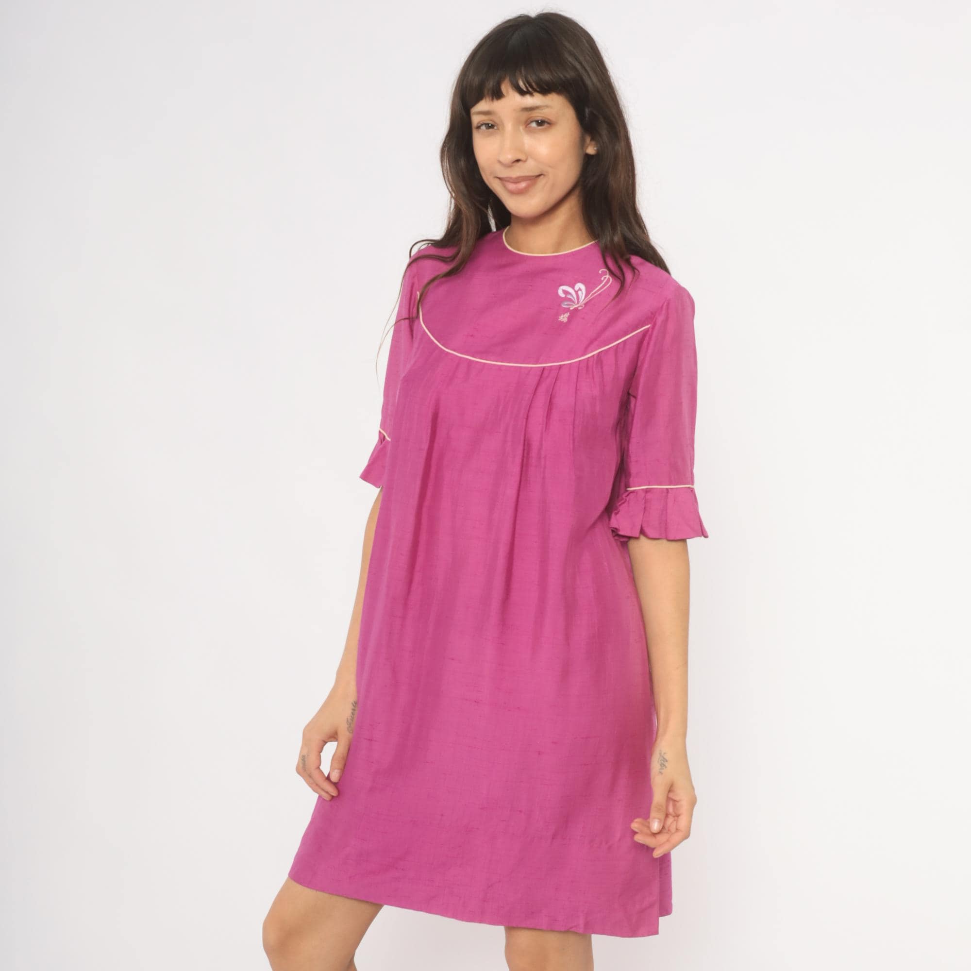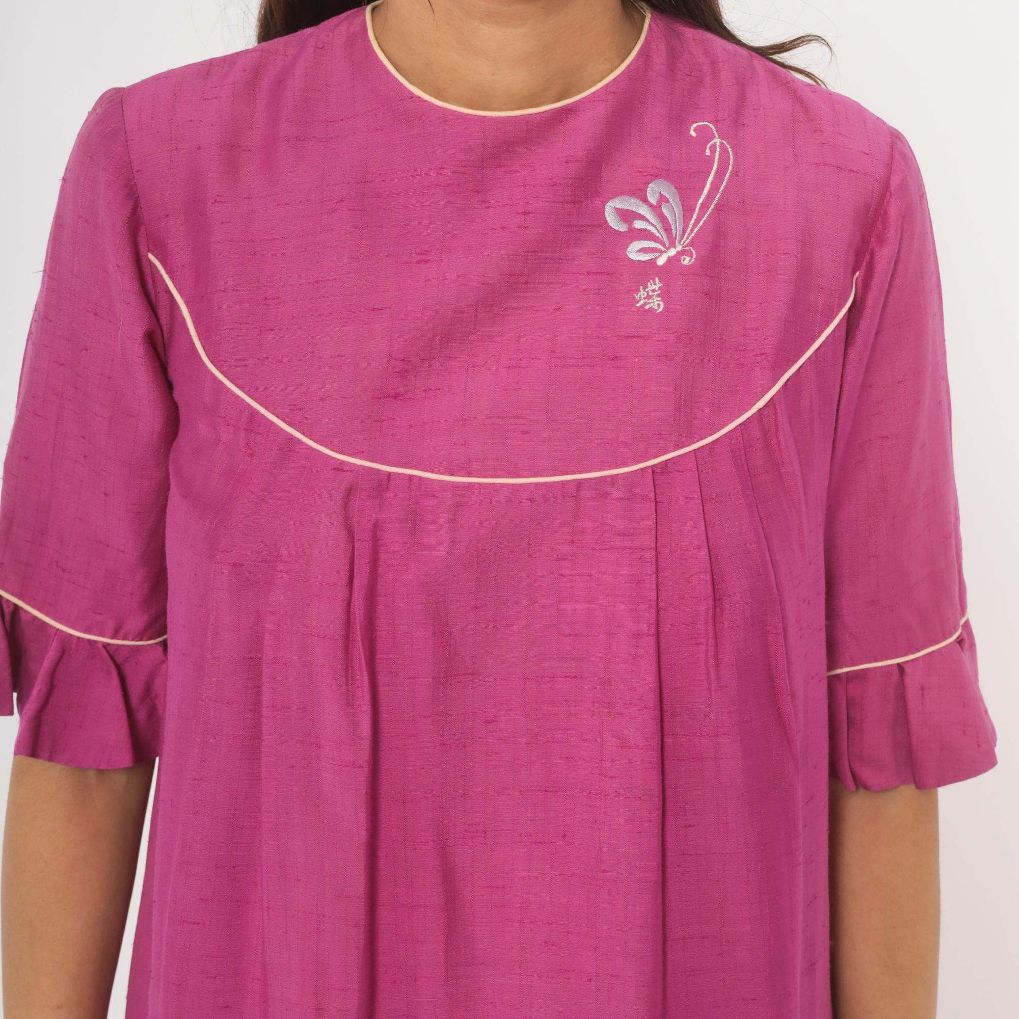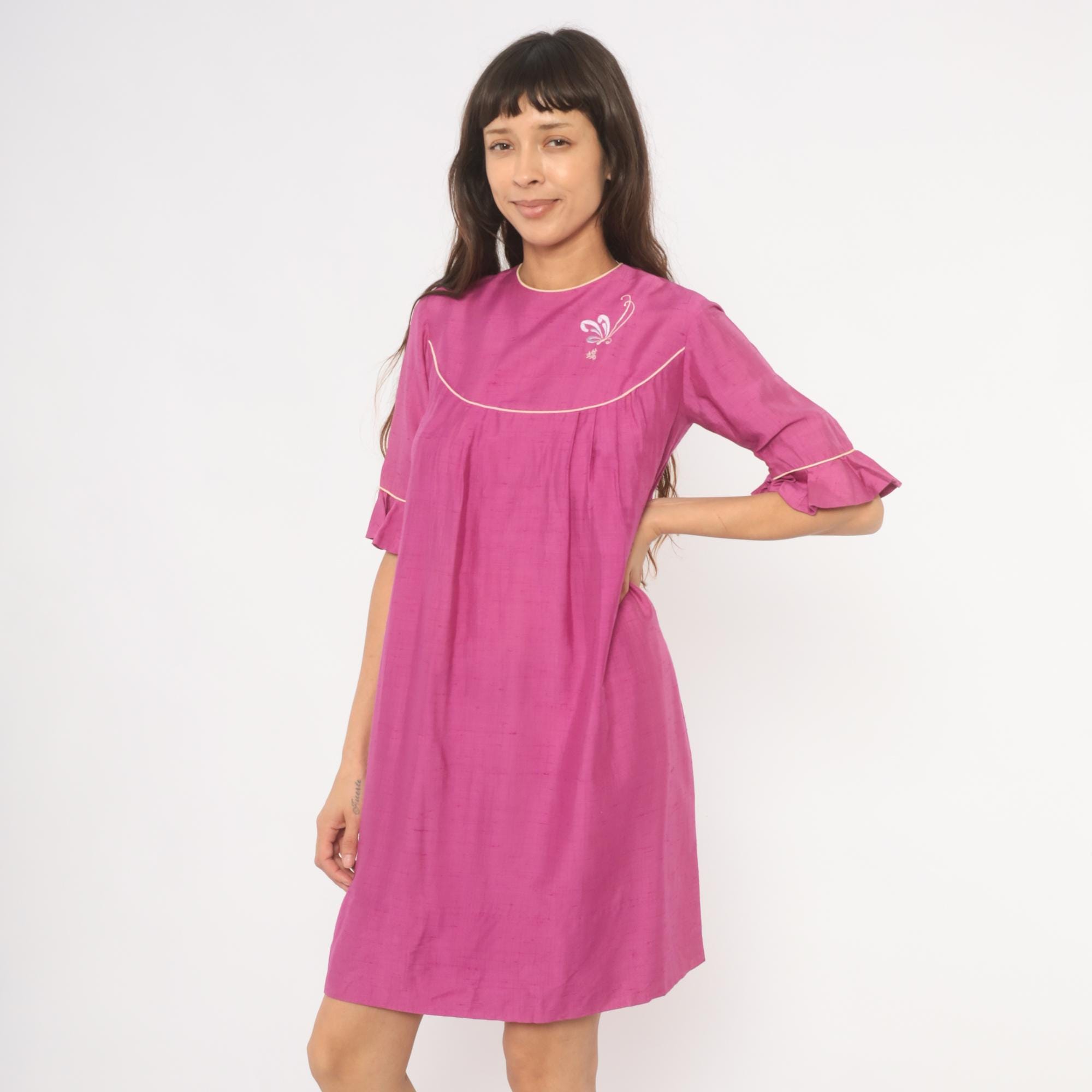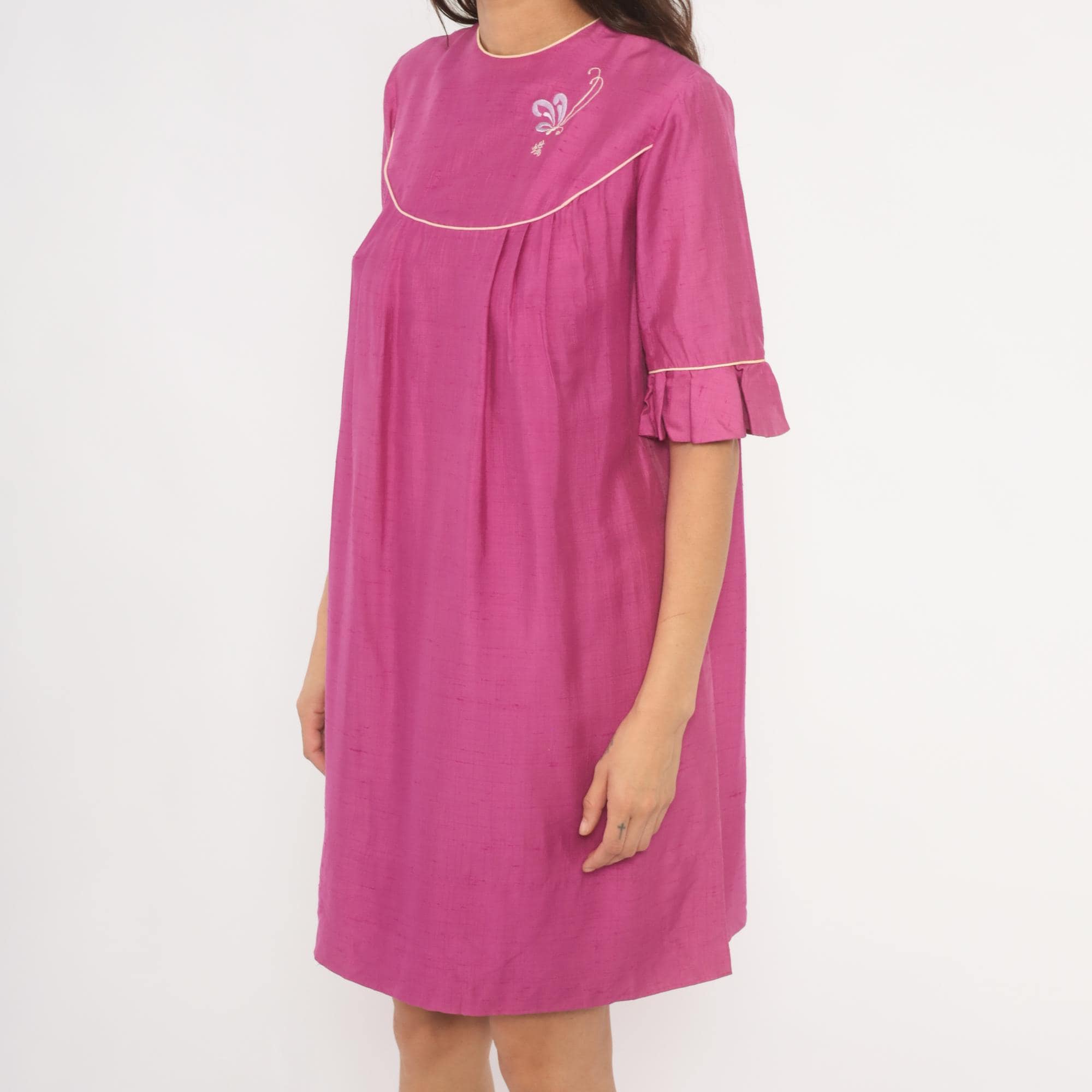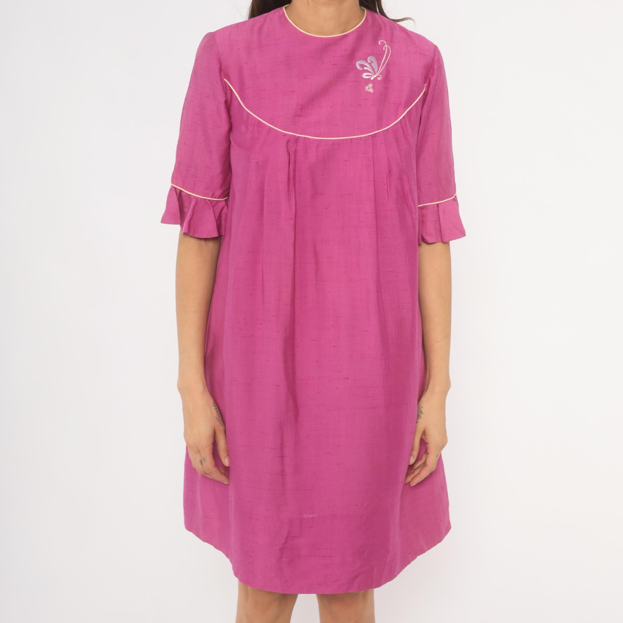 80s magenta babydoll dress from Keone with a curved yoke accented by cream piping at the neckline, chest, and sleeves. Embroidered butterfly motif with a Japanese character on the upper chest panel. Elbow-length sleeves with ruffle cuffs trimmed in cream piping, crew neckline with cream binding, and back button closure. Loose A-line silhouette with pleated fullness below the yoke, falling to knee length.