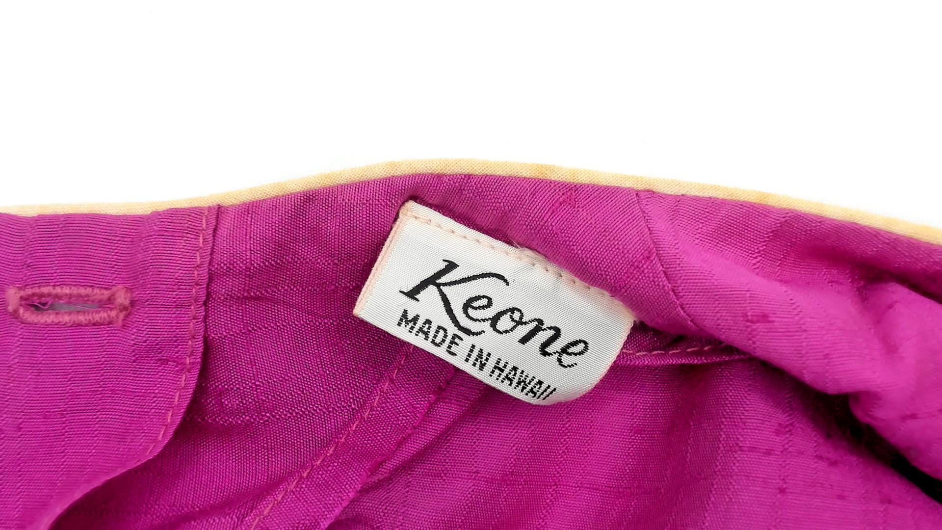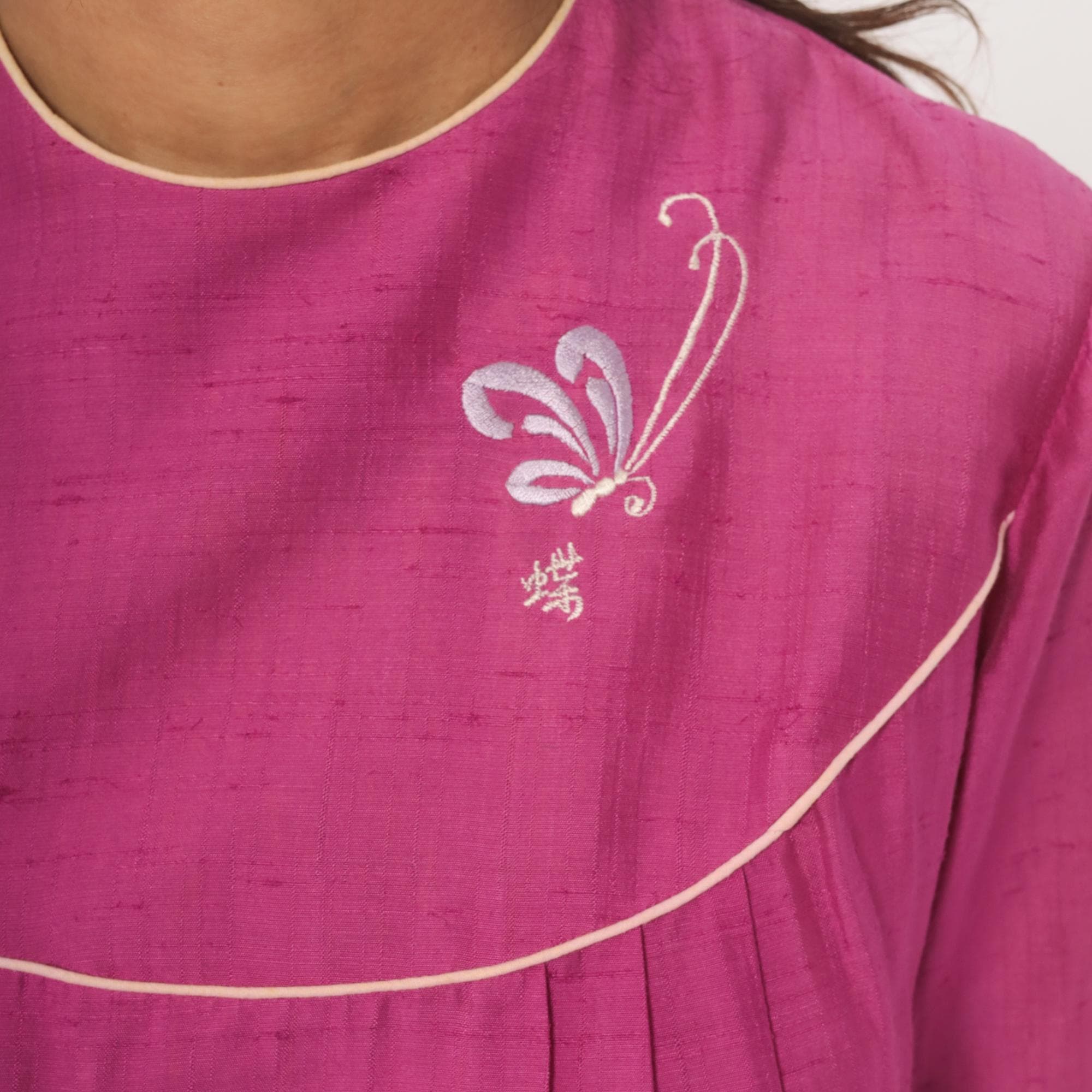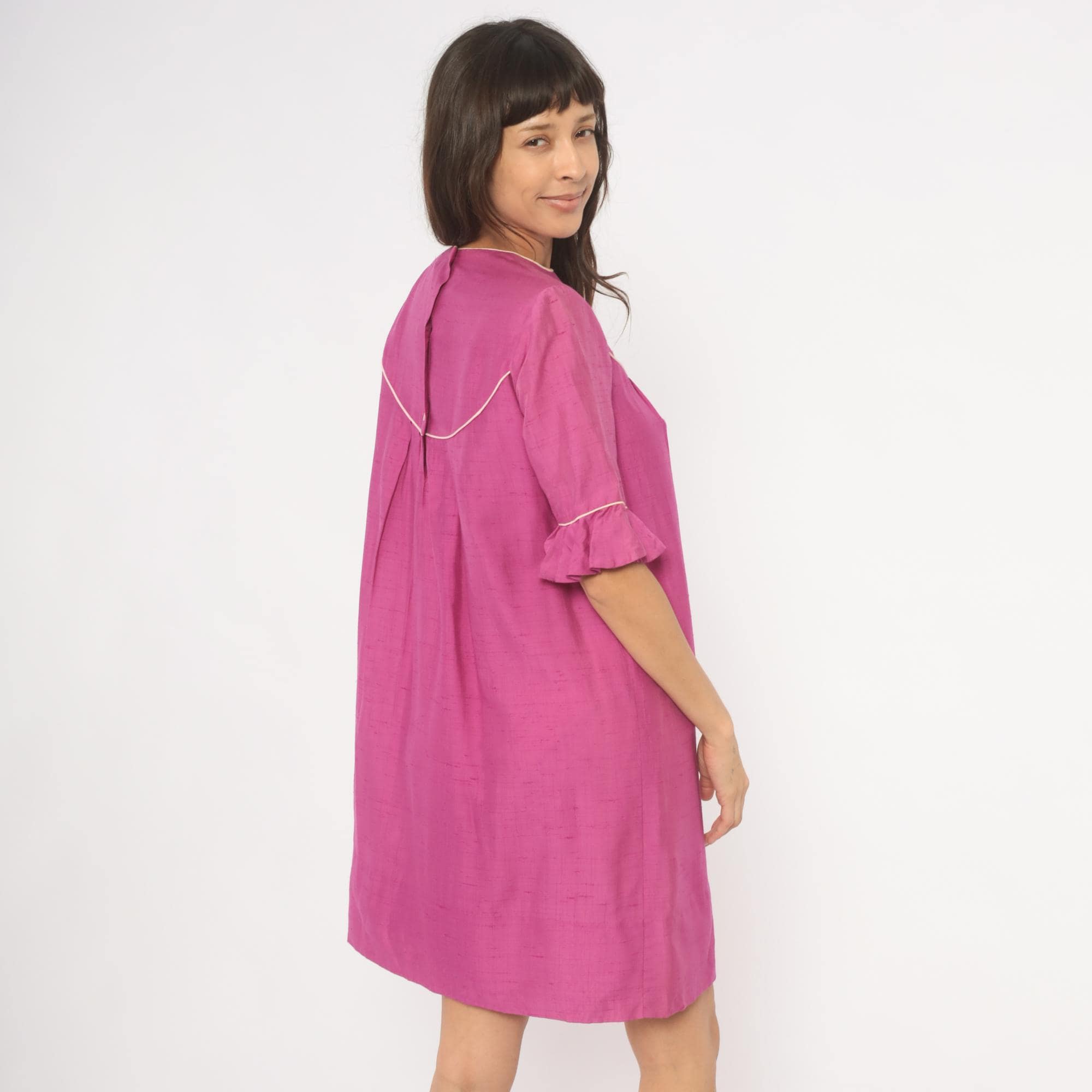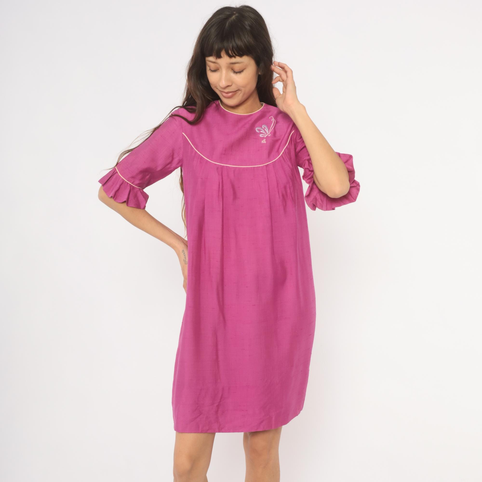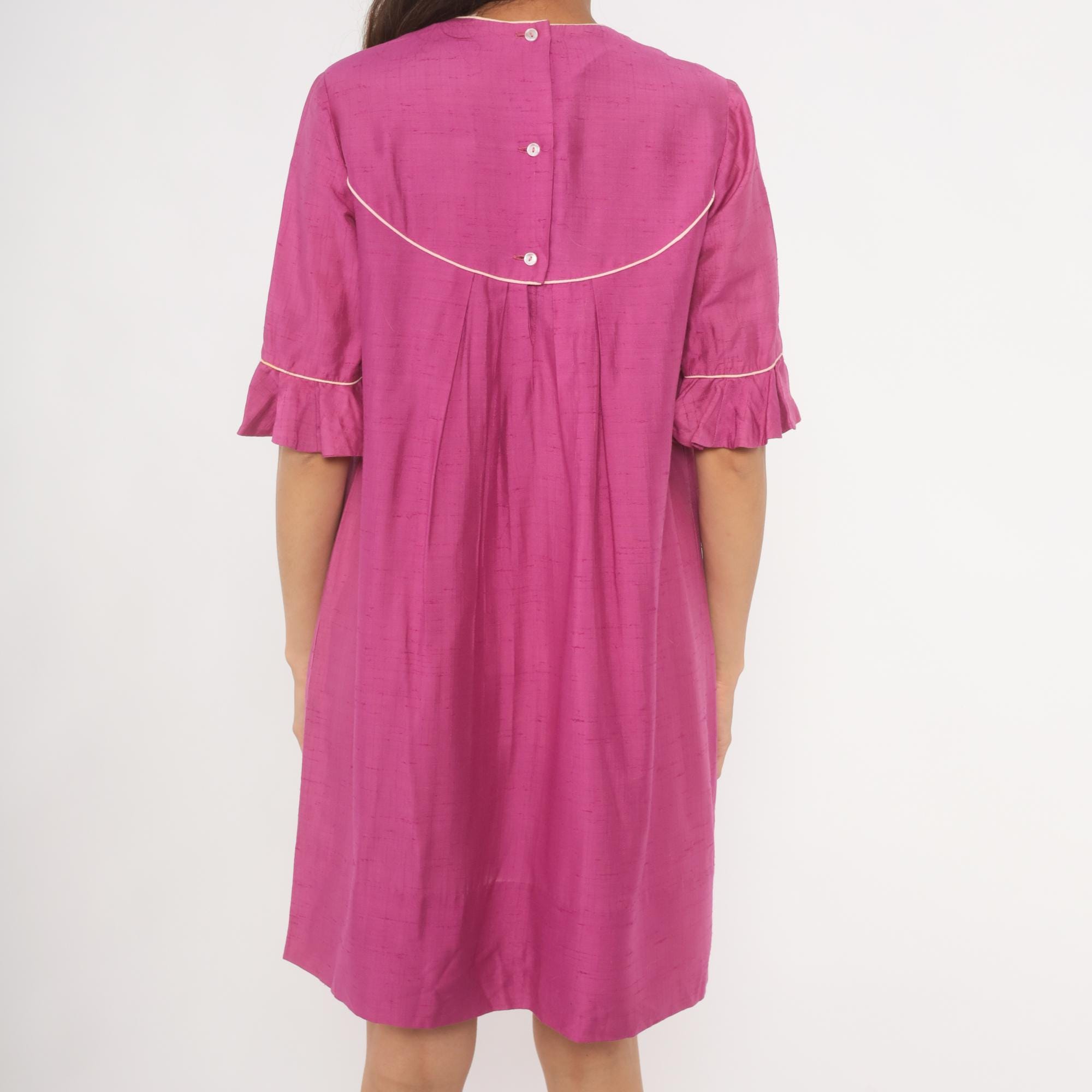 80s magenta babydoll dress from Keone with a curved yoke accented by cream piping at the neckline, chest, and sleeves. Embroidered butterfly motif with a Japanese character on the upper chest panel. Elbow-length sleeves with ruffle cuffs trimmed in cream piping, crew neckline with cream binding, and back button closure. Loose A-line silhouette with pleated fullness below the yoke, falling to knee length.