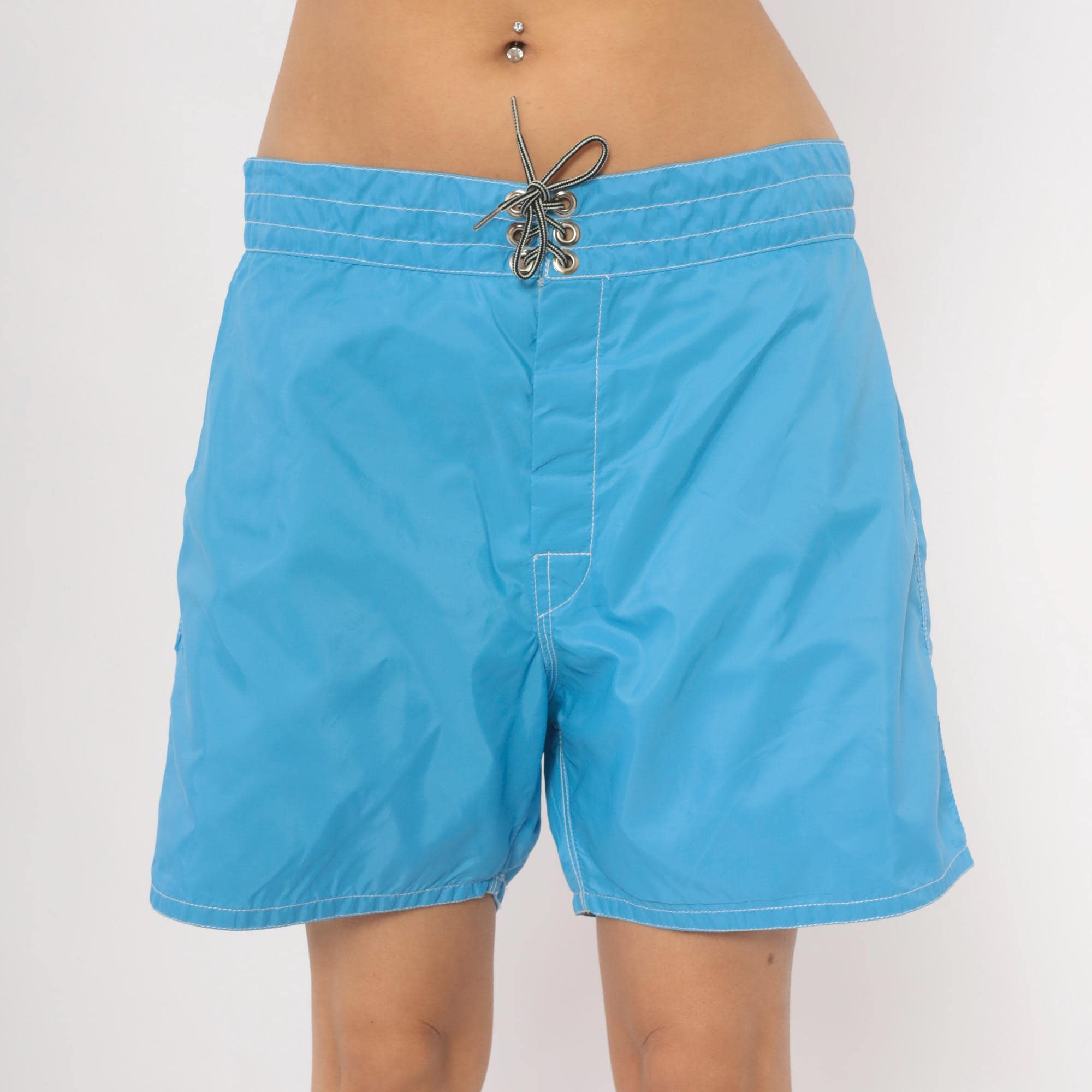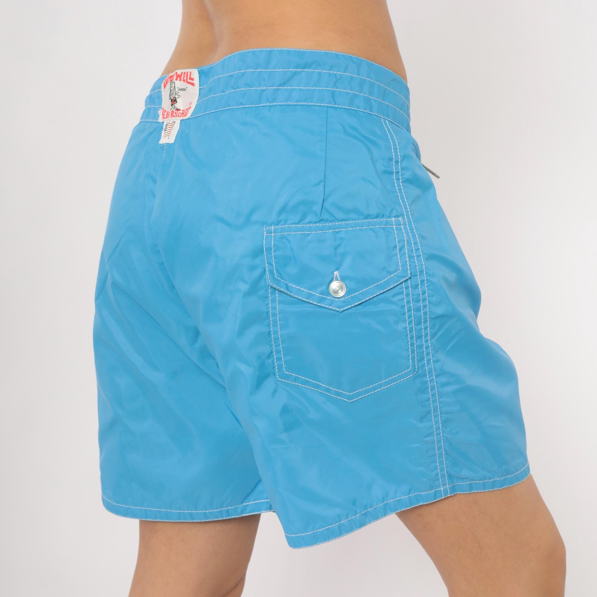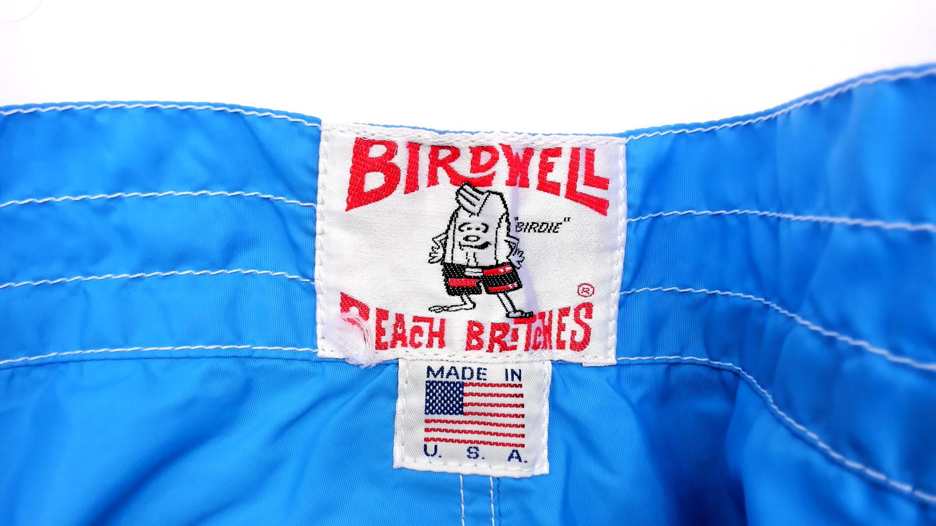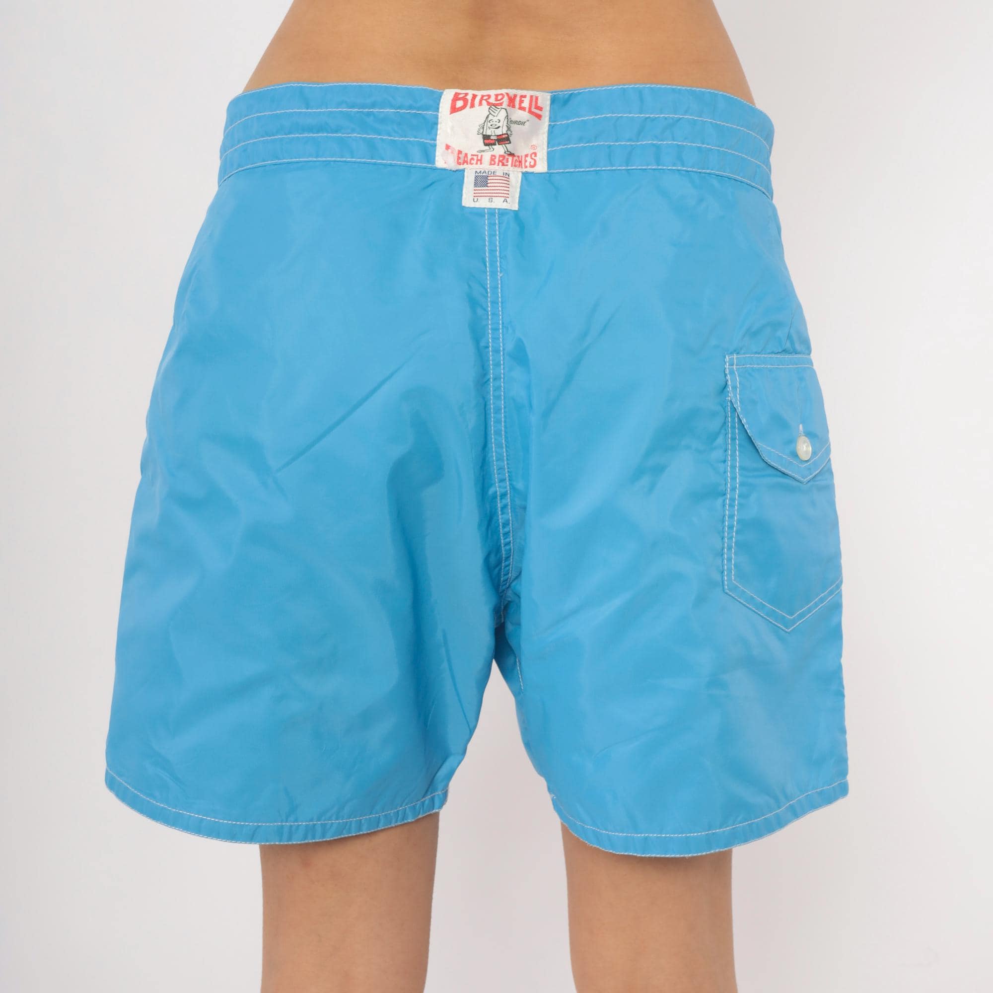 80s Birdwell Beach Britches board shorts in sky blue with contrast white topstitching throughout. Lace-up front closure with metal grommets and a drawstring tie at the waistband. Single back flap pocket with button snap, and the iconic "Birdie" label centered on the rear waistband. Made in USA with a mid-thigh inseam.
