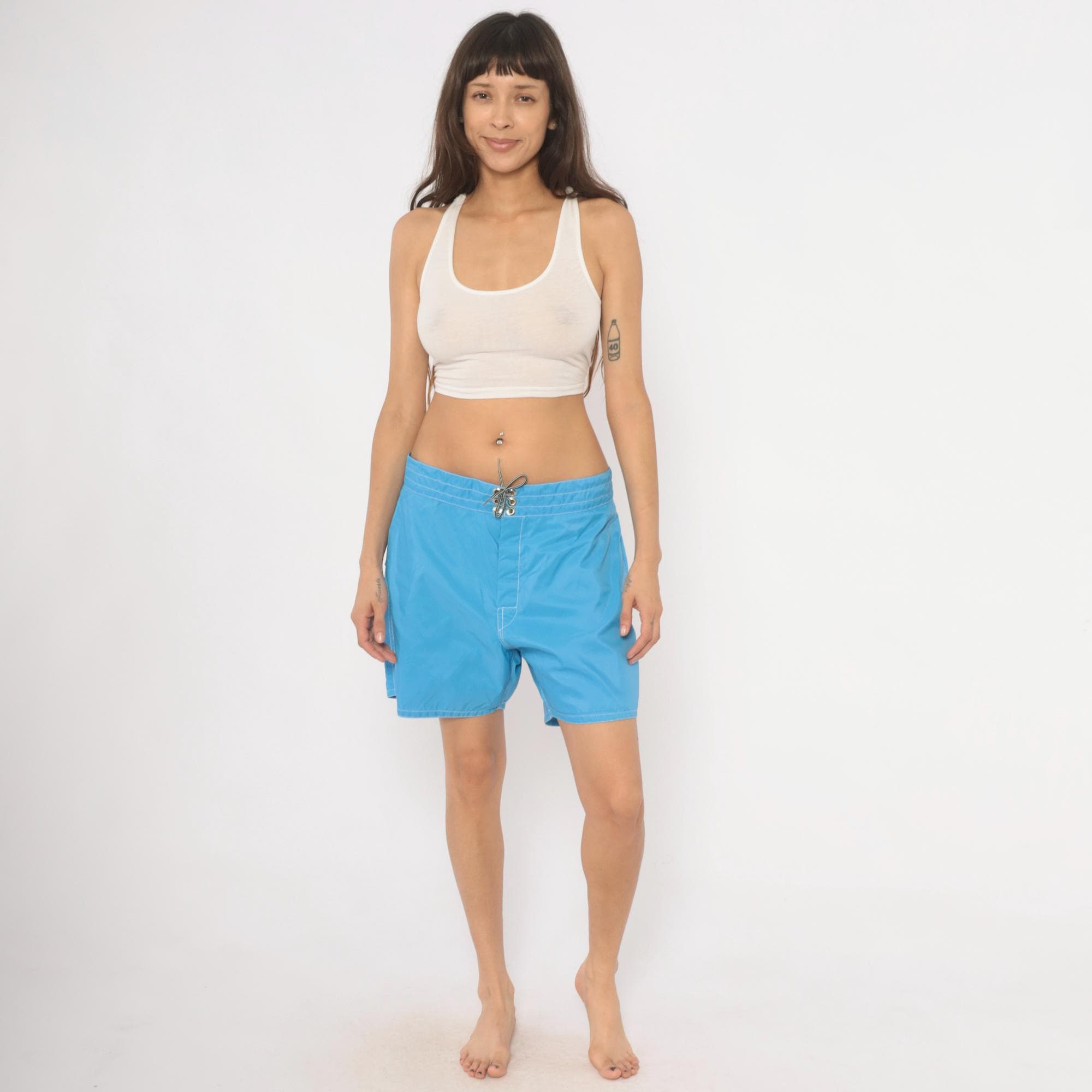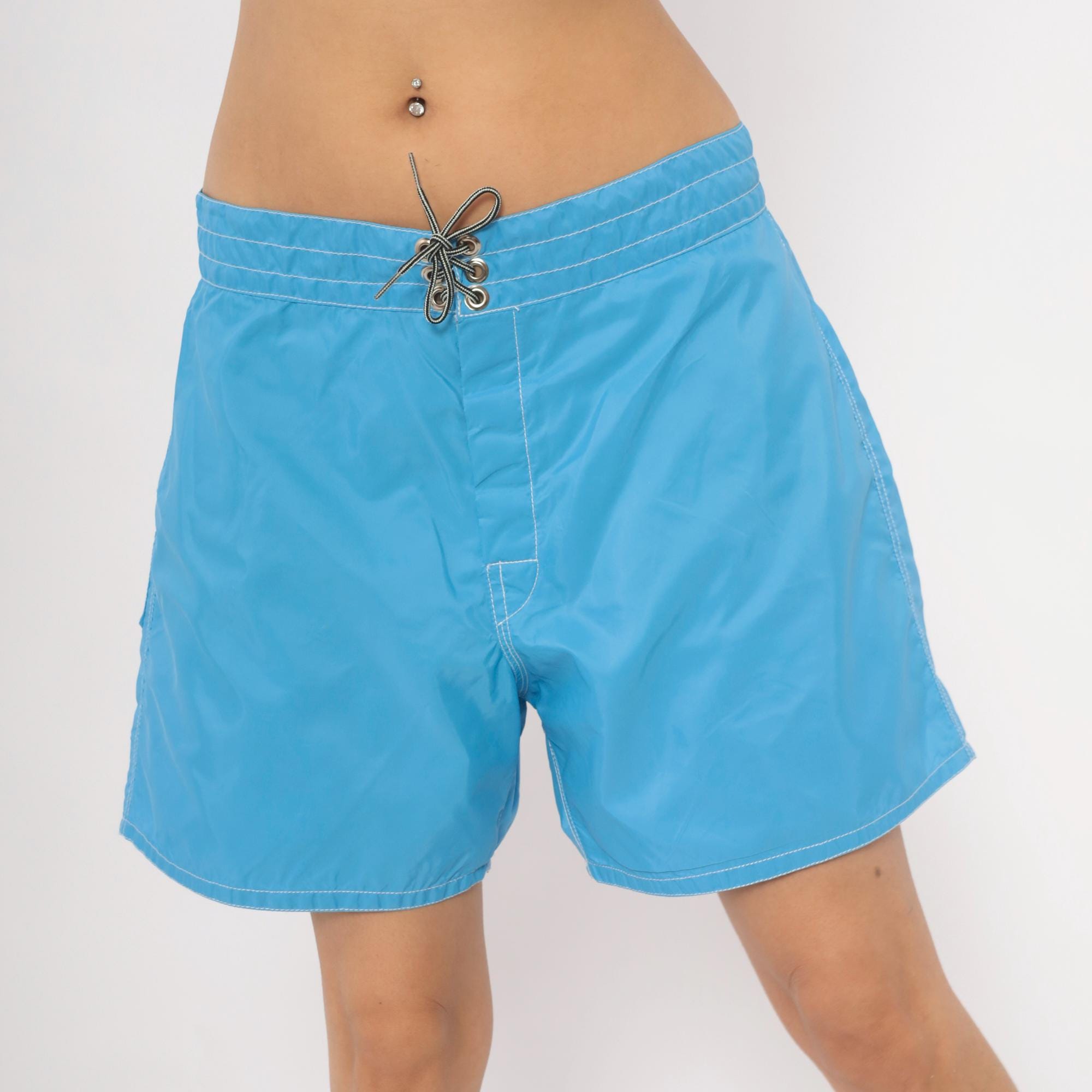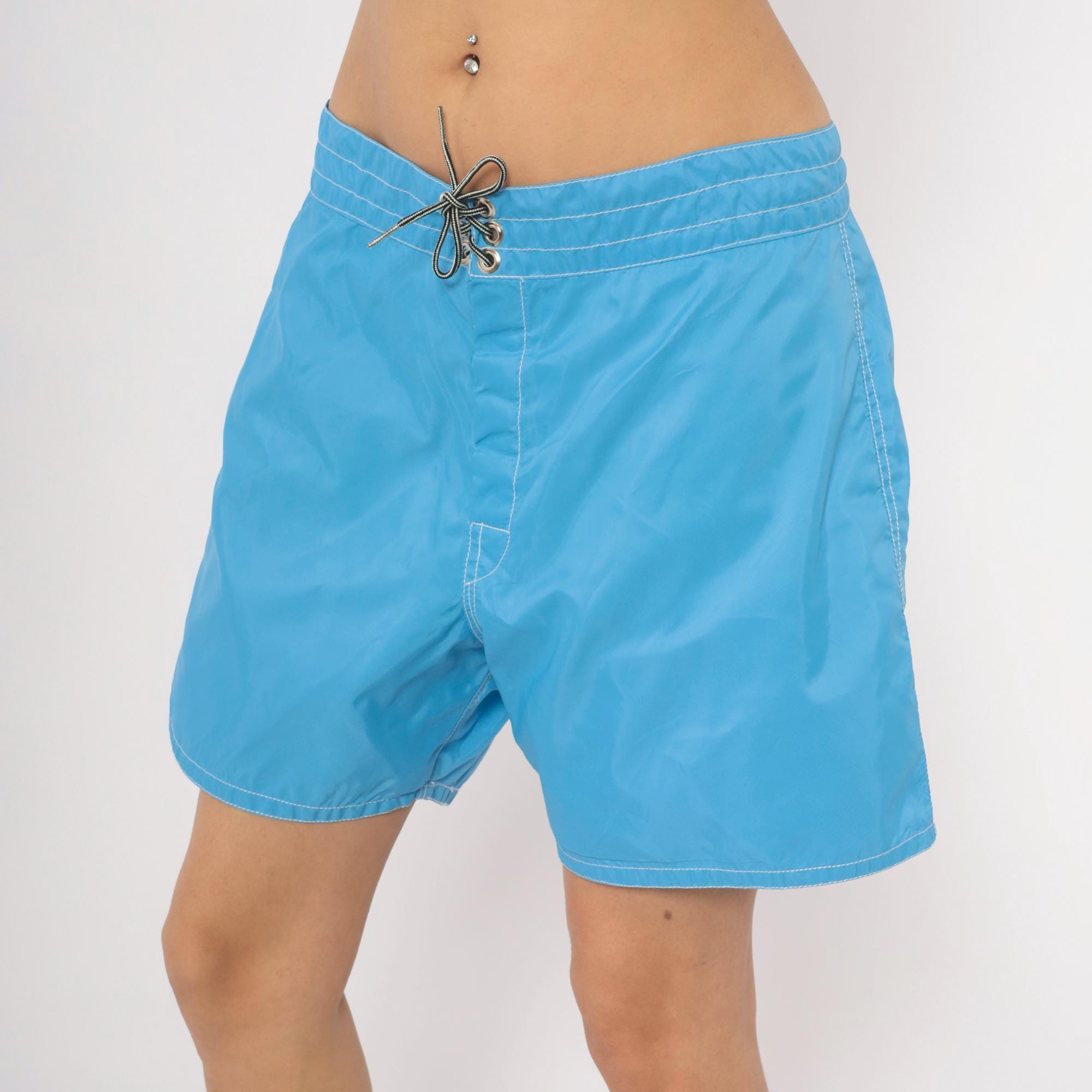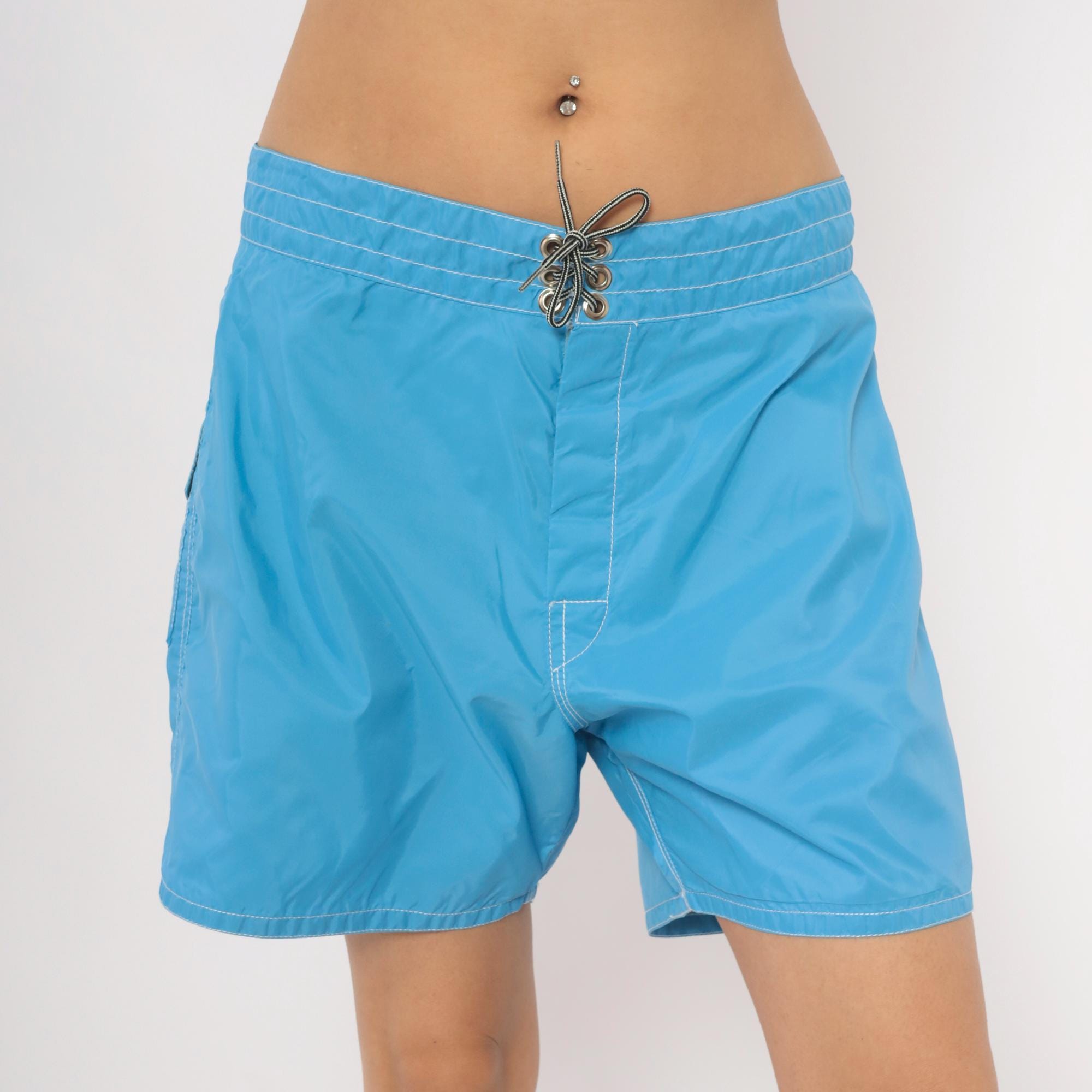 80s Birdwell Beach Britches board shorts in sky blue with contrast white topstitching throughout. Lace-up front closure with metal grommets and a drawstring tie at the waistband. Single back flap pocket with button snap, and the iconic "Birdie" label centered on the rear waistband. Made in USA with a mid-thigh inseam.