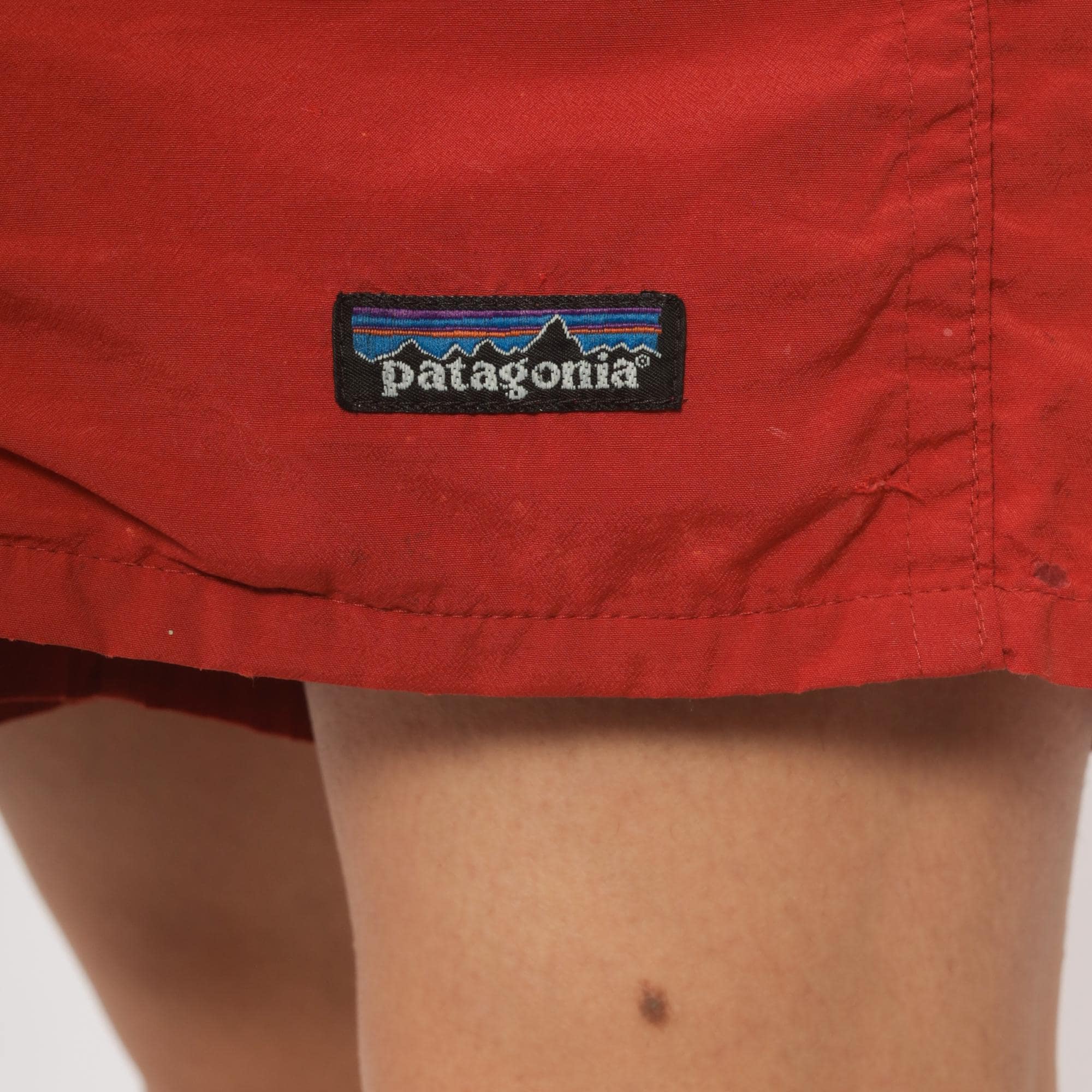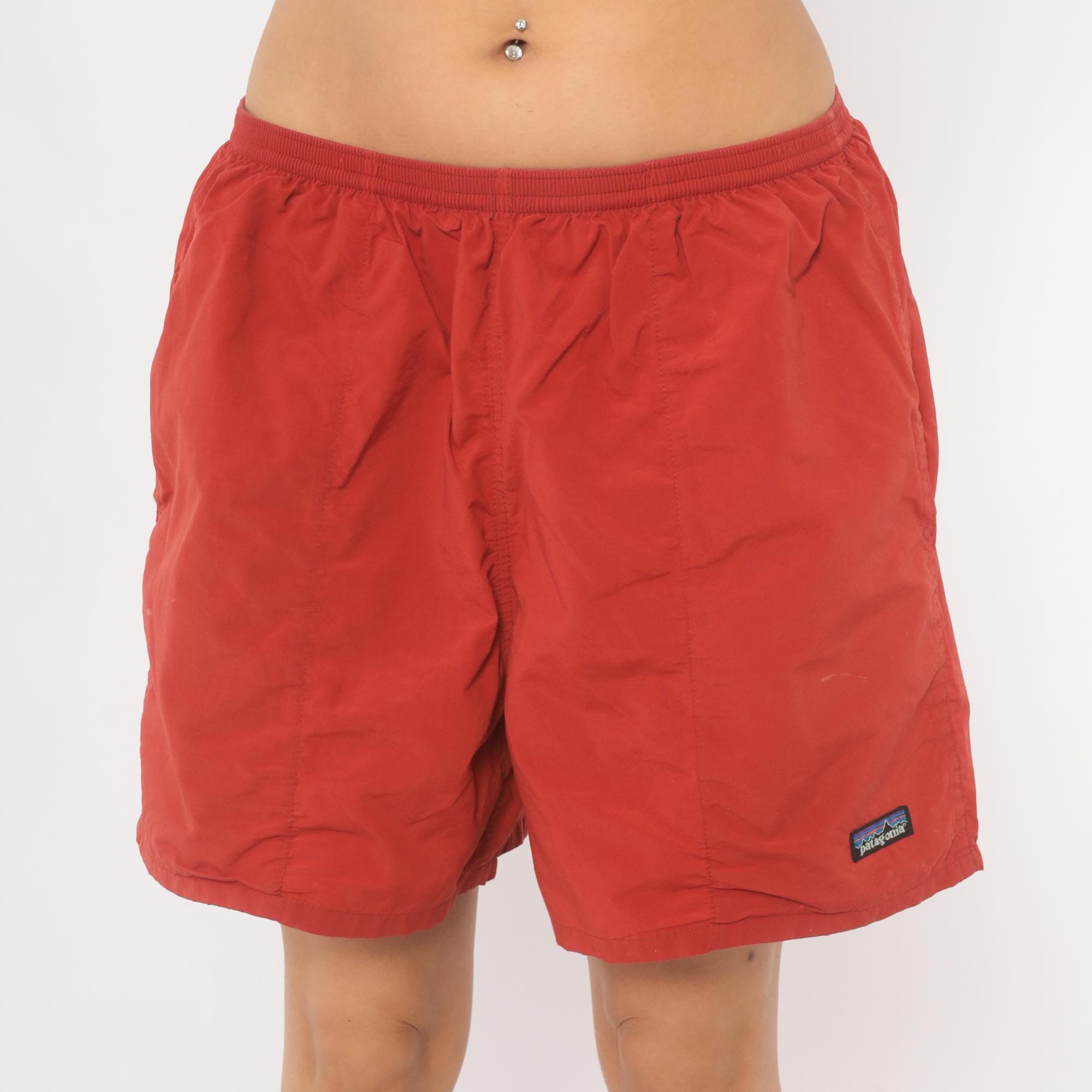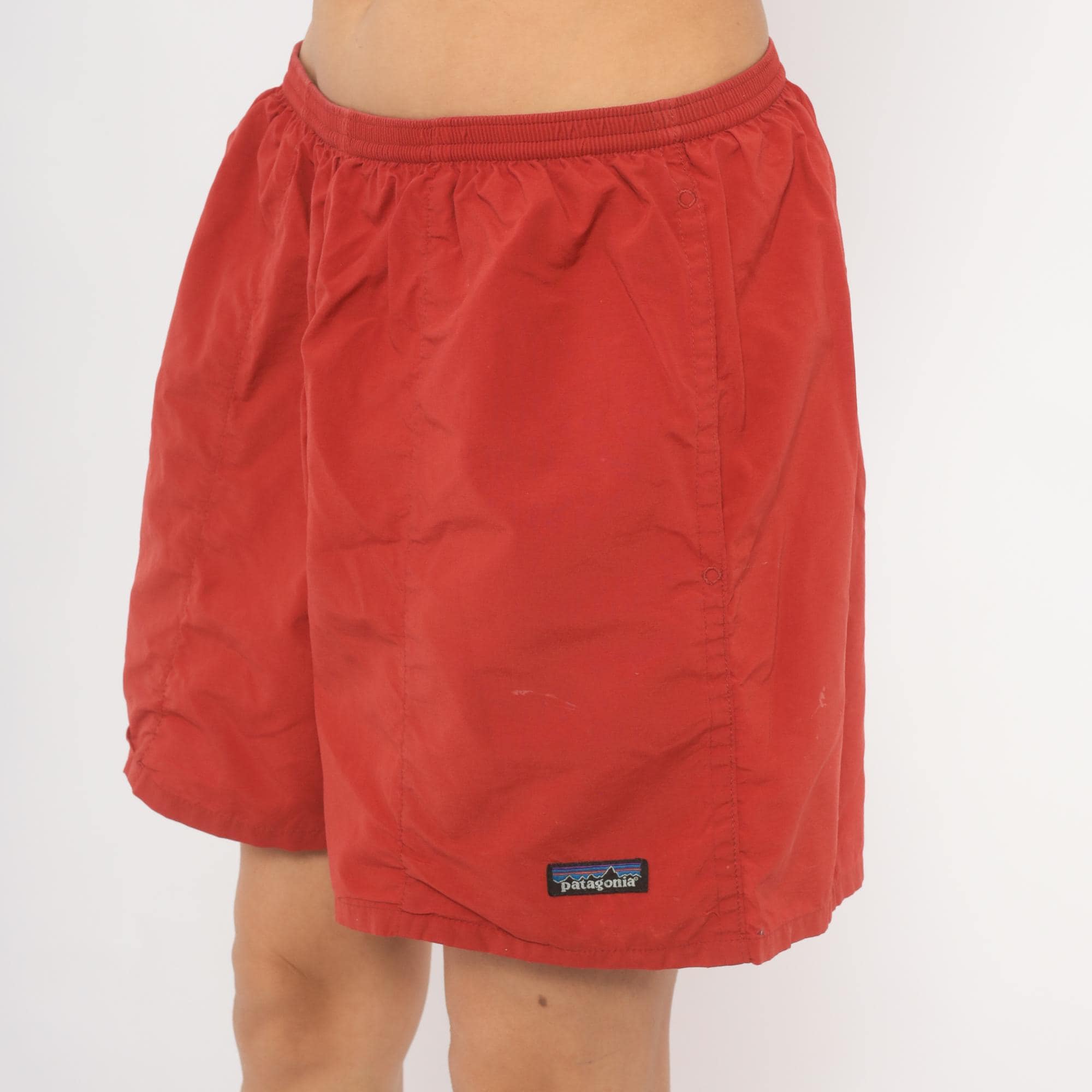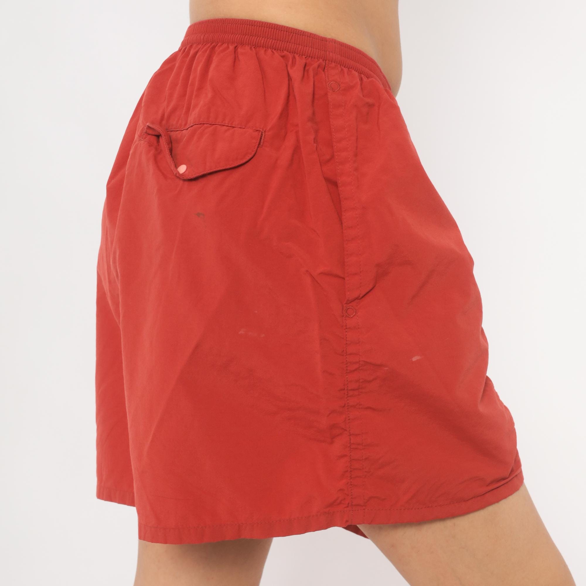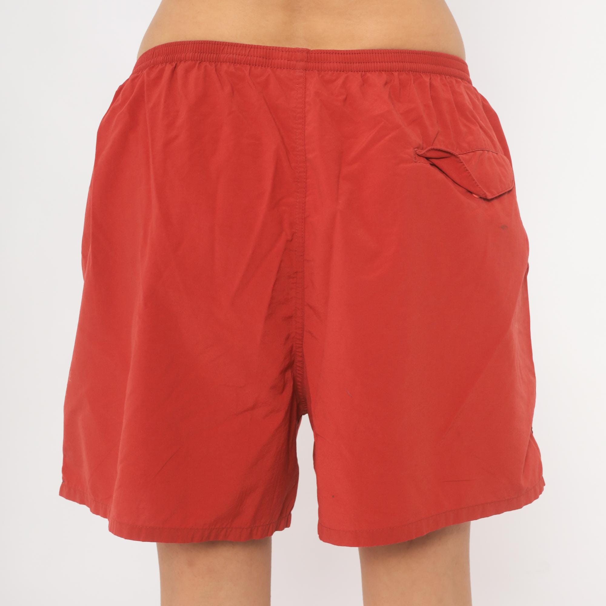 90s Patagonia swim shorts in a rust terra cotta color with elastic waistband and interior drawcord closure. Side seam pockets on both hips and a single snap-flap pocket on the back right. Small woven Patagonia label on the lower left leg hem.
