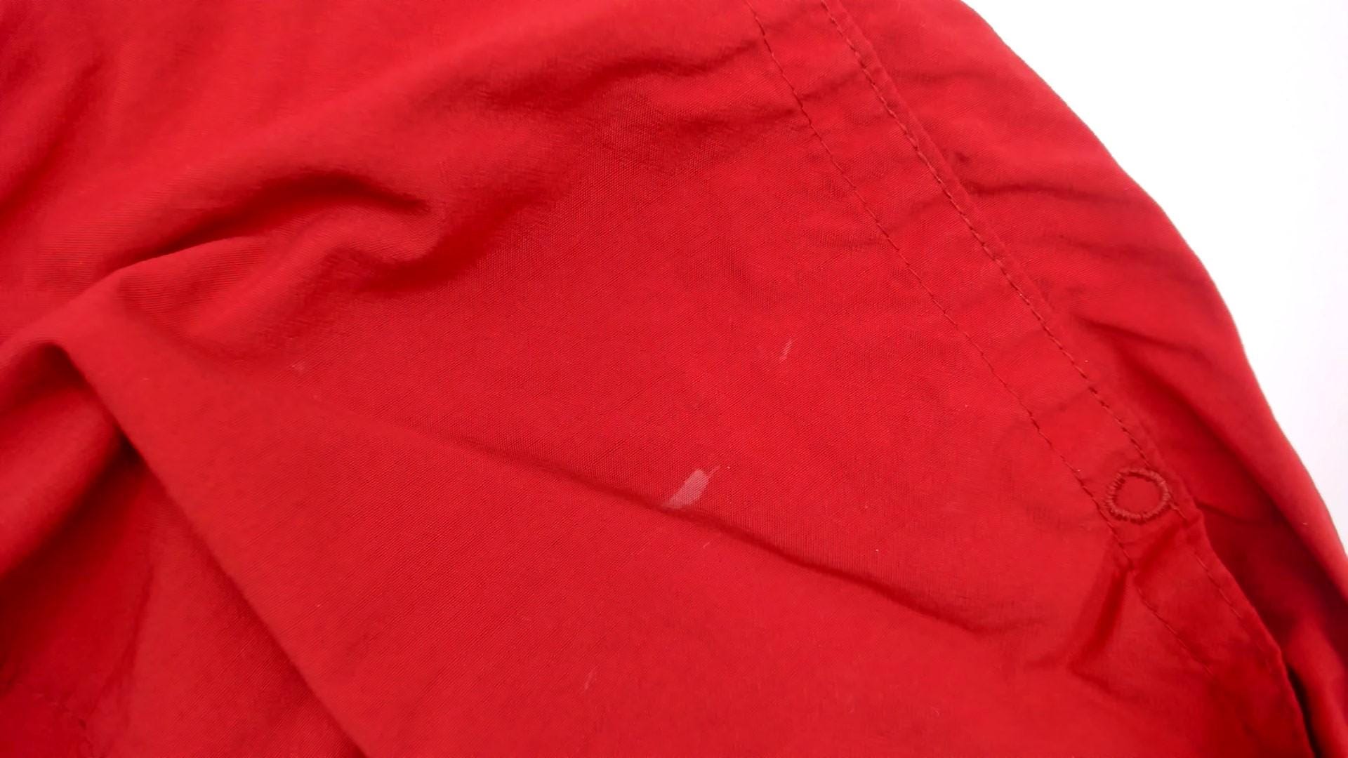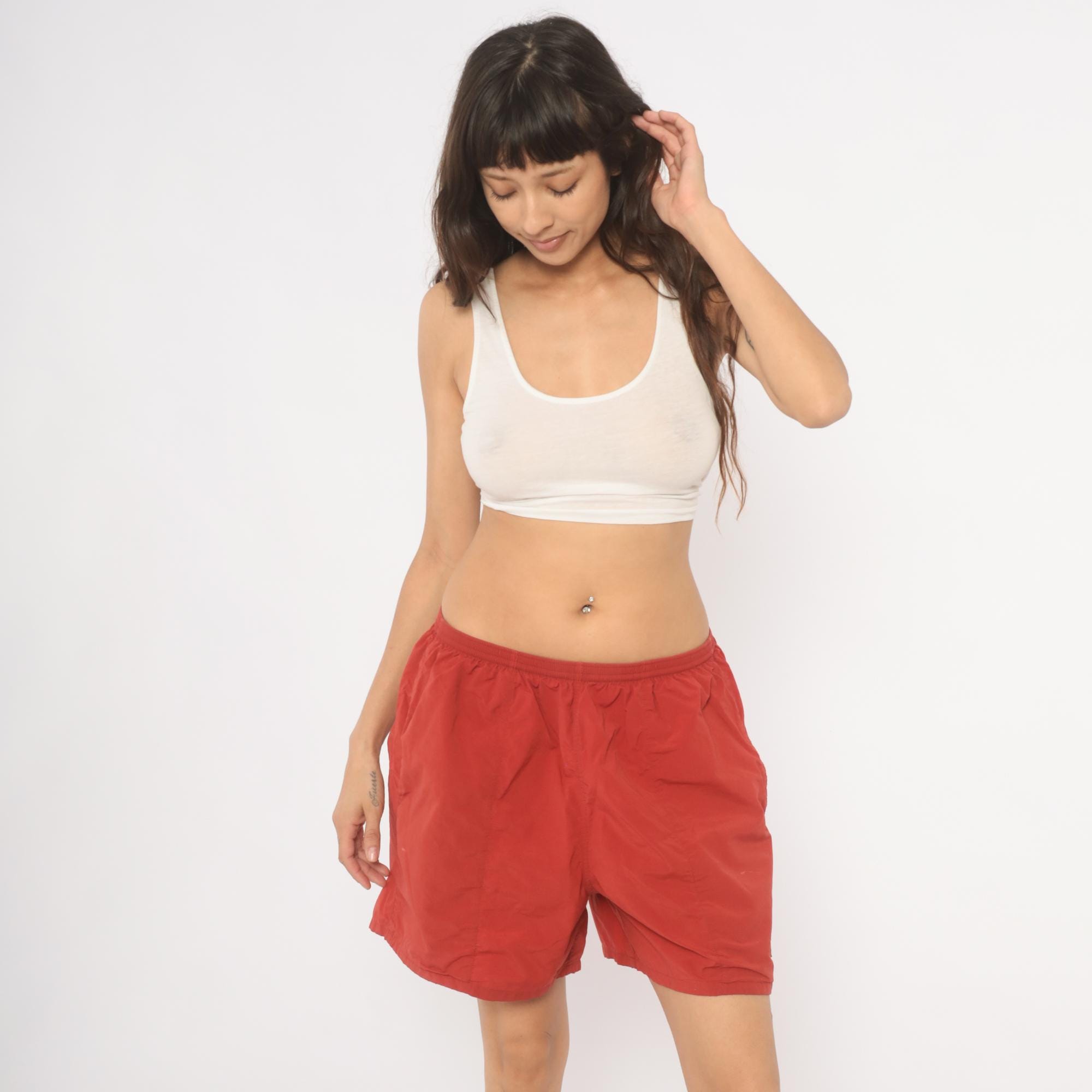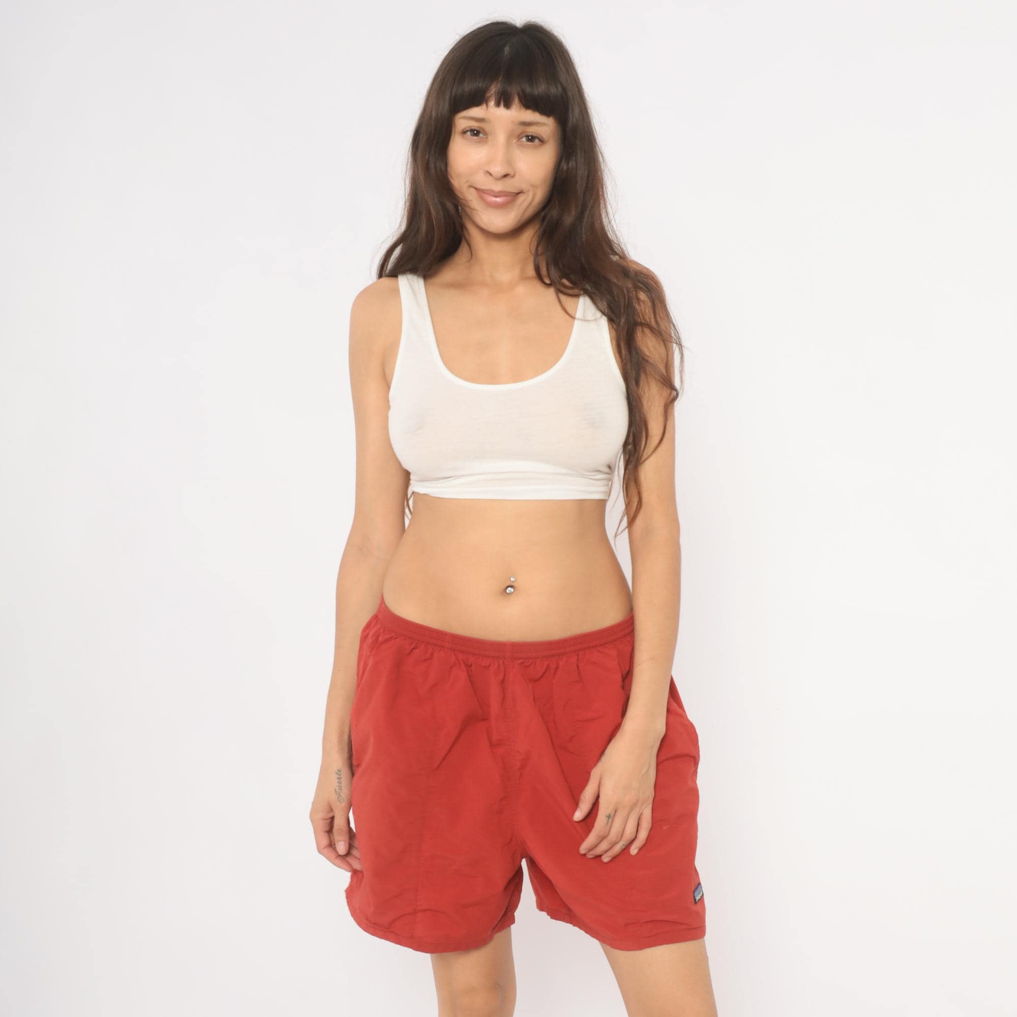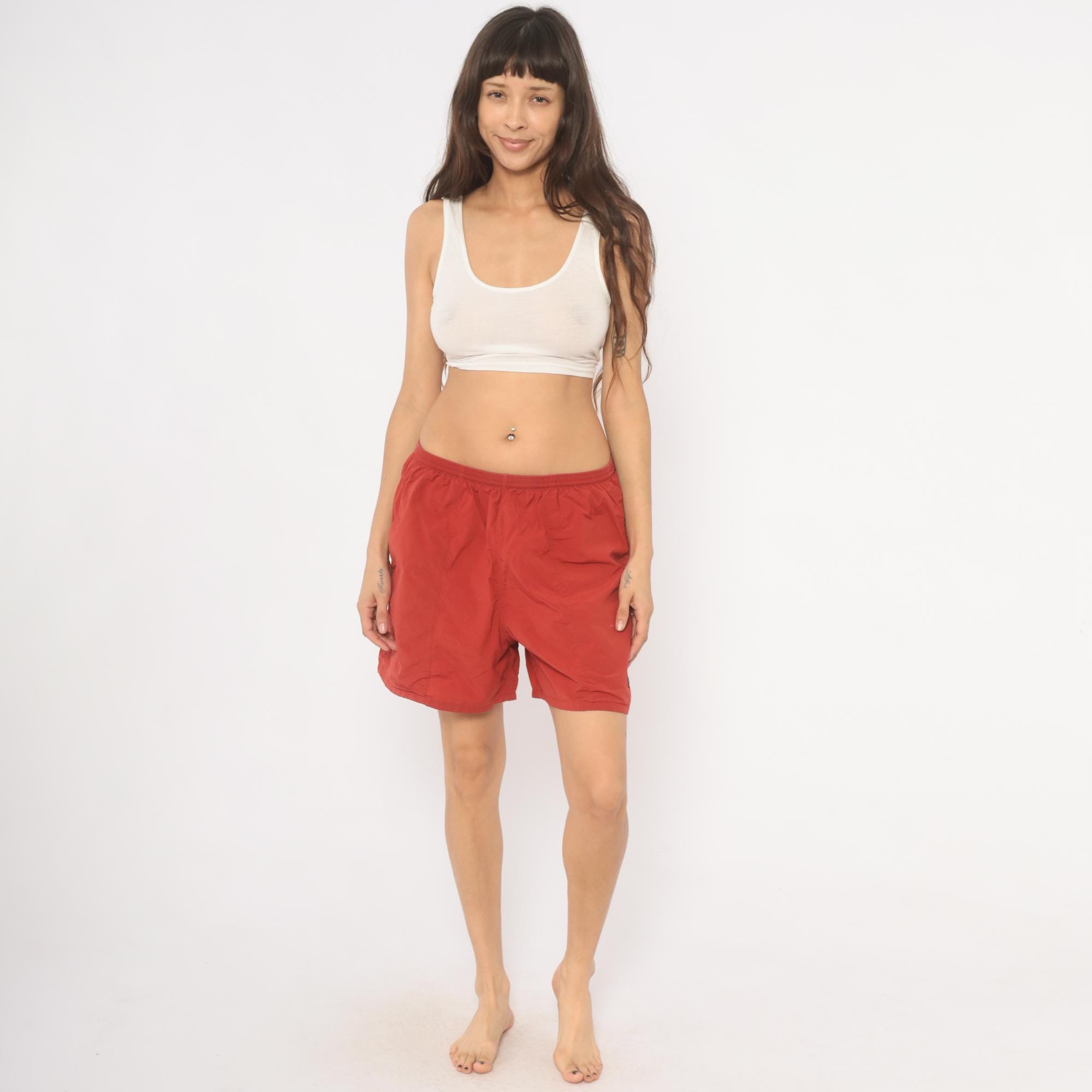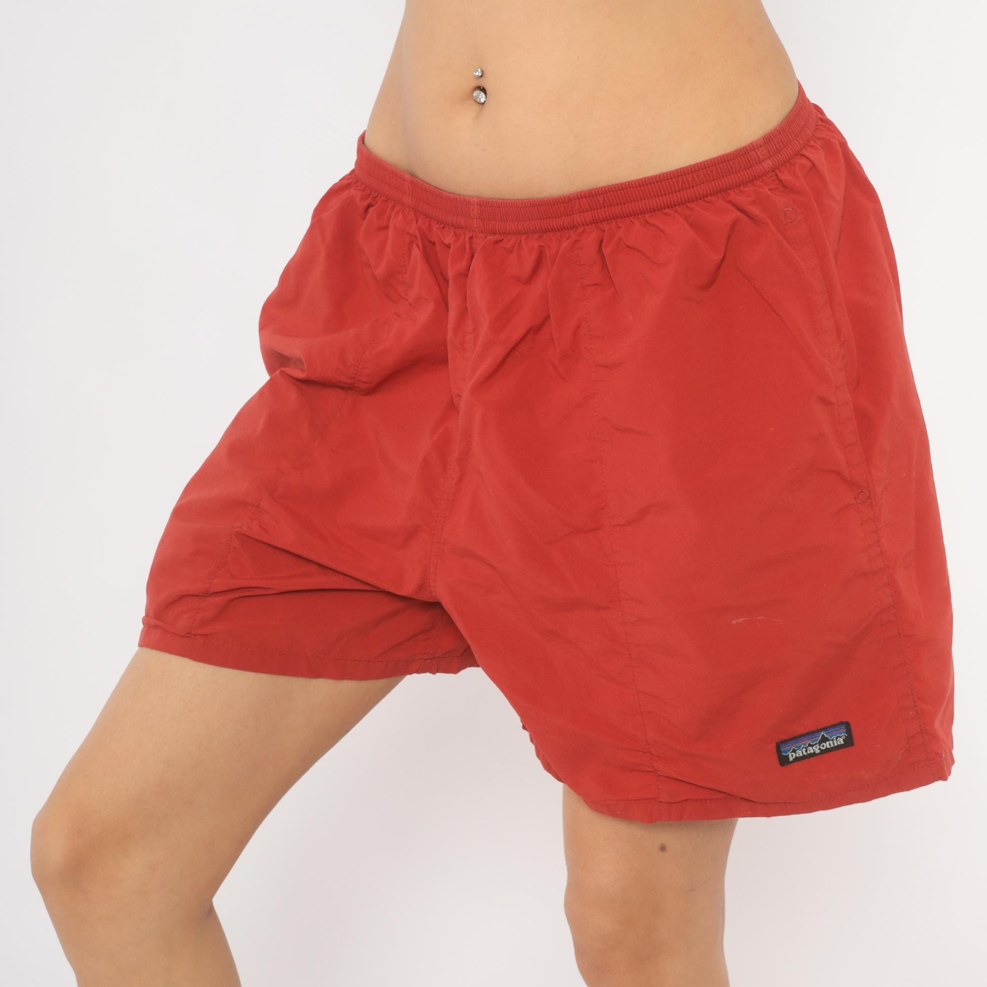 90s Patagonia swim shorts in a rust terra cotta color with elastic waistband and interior drawcord closure. Side seam pockets on both hips and a single snap-flap pocket on the back right. Small woven Patagonia label on the lower left leg hem.