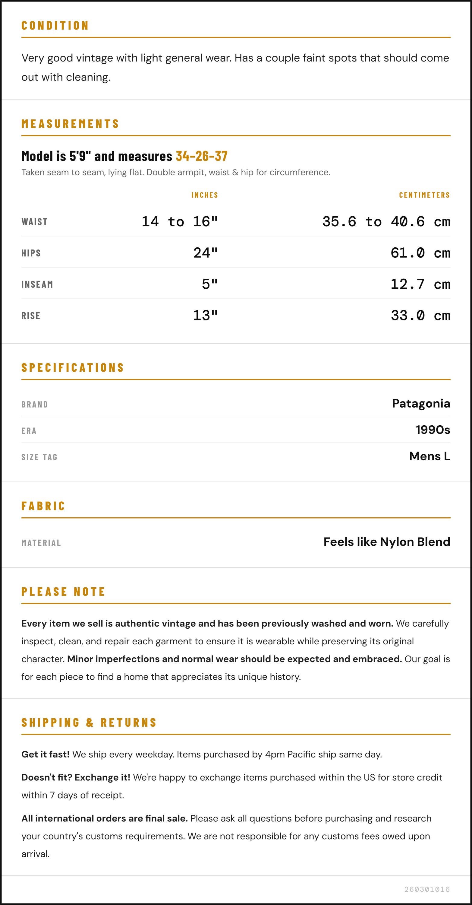 Vintage denim was usually made without any stretch, unlike modern jeans. Check the measurements to ensure proper fit, and remember to give yourself a little wiggle room in the waist and hips, depending on your preferred fit.