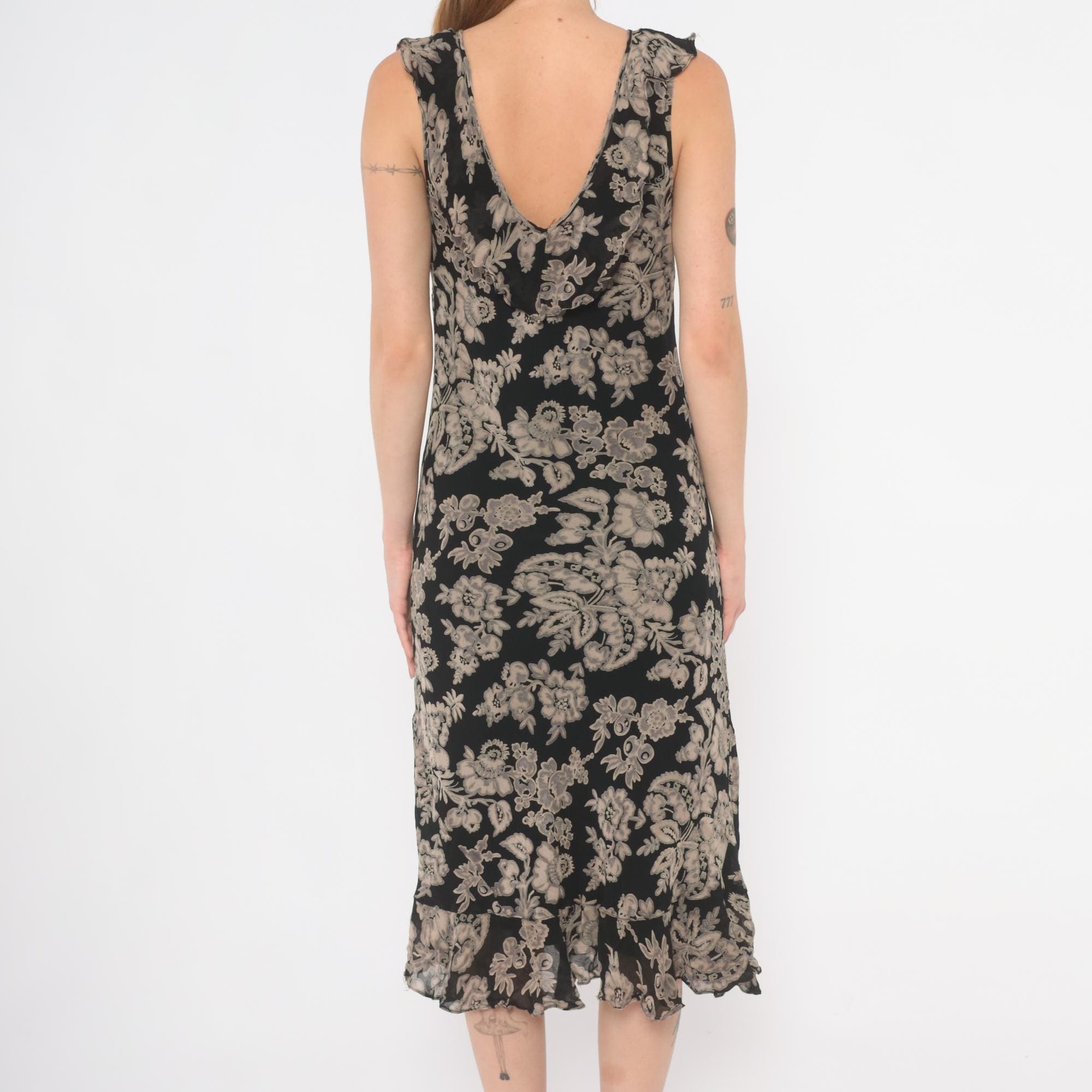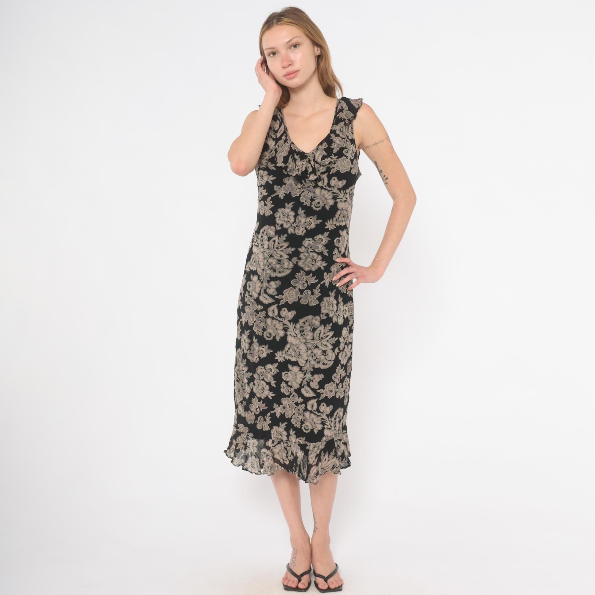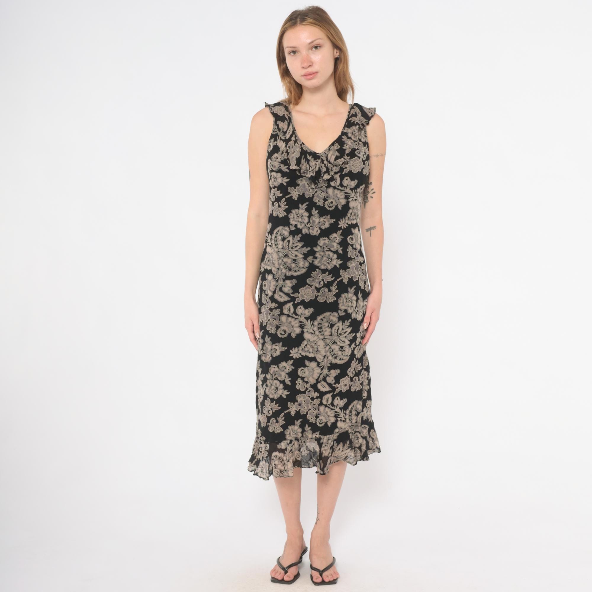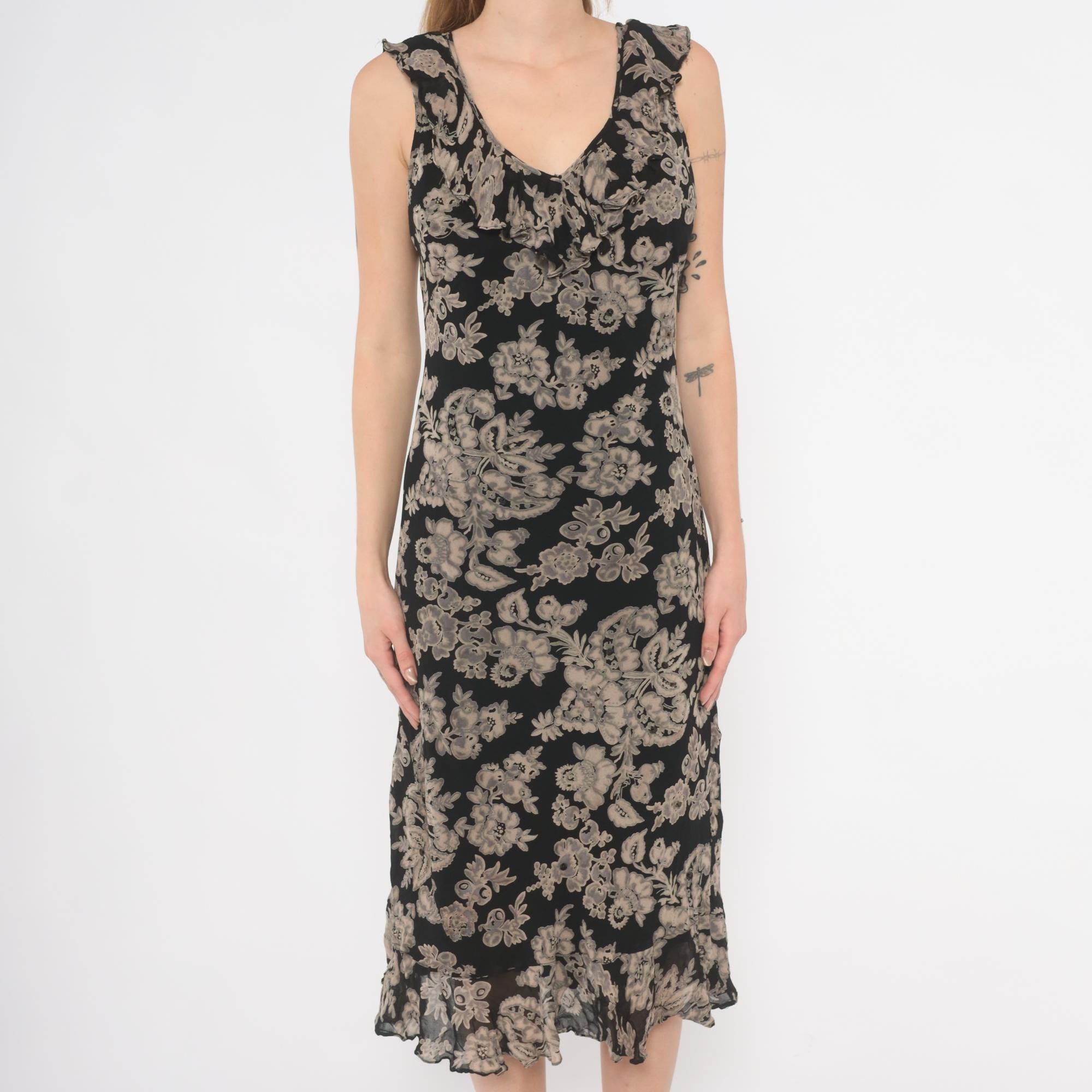 90s black and grey floral midi dress with a V-neckline on both the front and back, ruffle trim along the neckline and shoulder straps. Large-scale grey and taupe botanical print across the entire garment with flowers, leaves, and paisley motifs on a black ground.