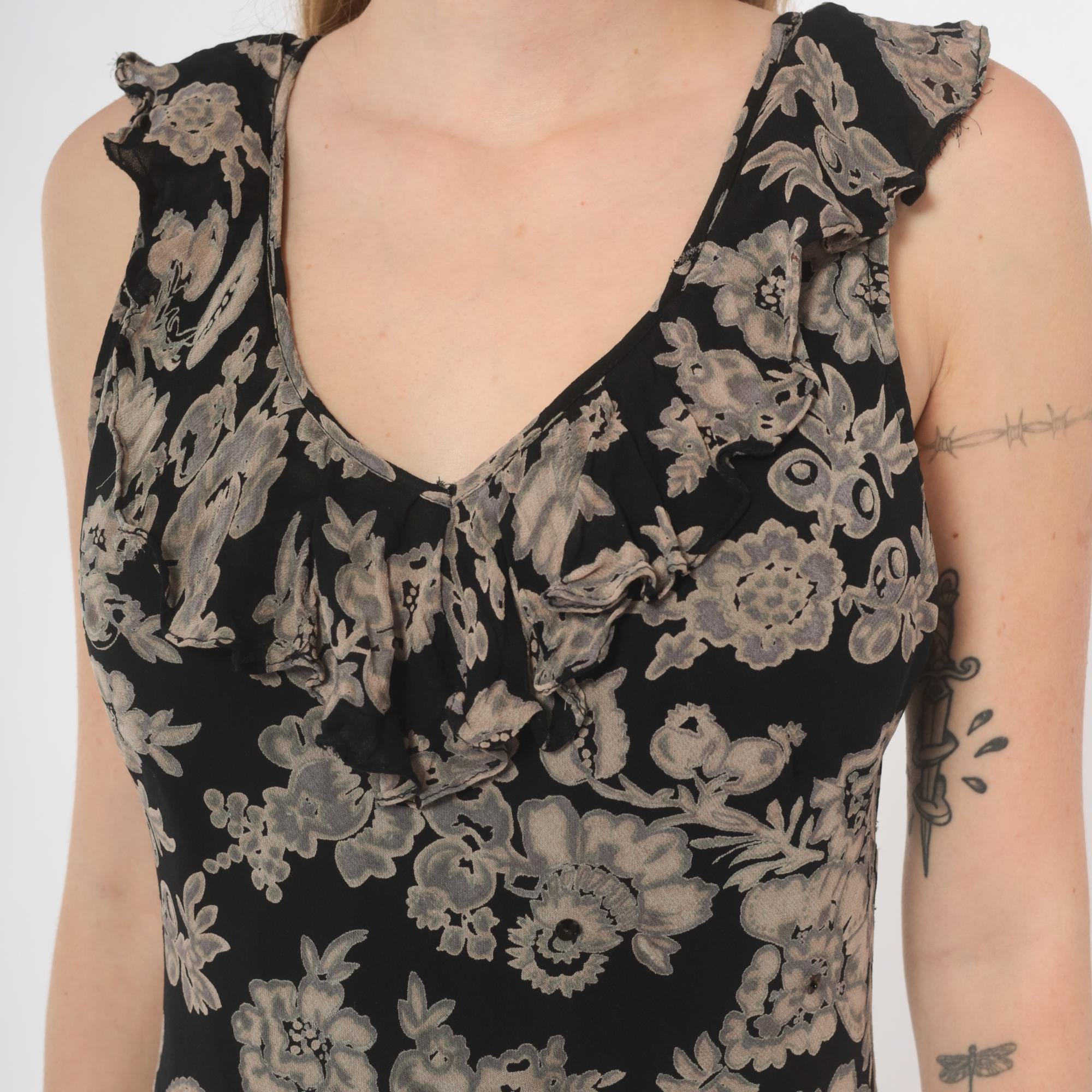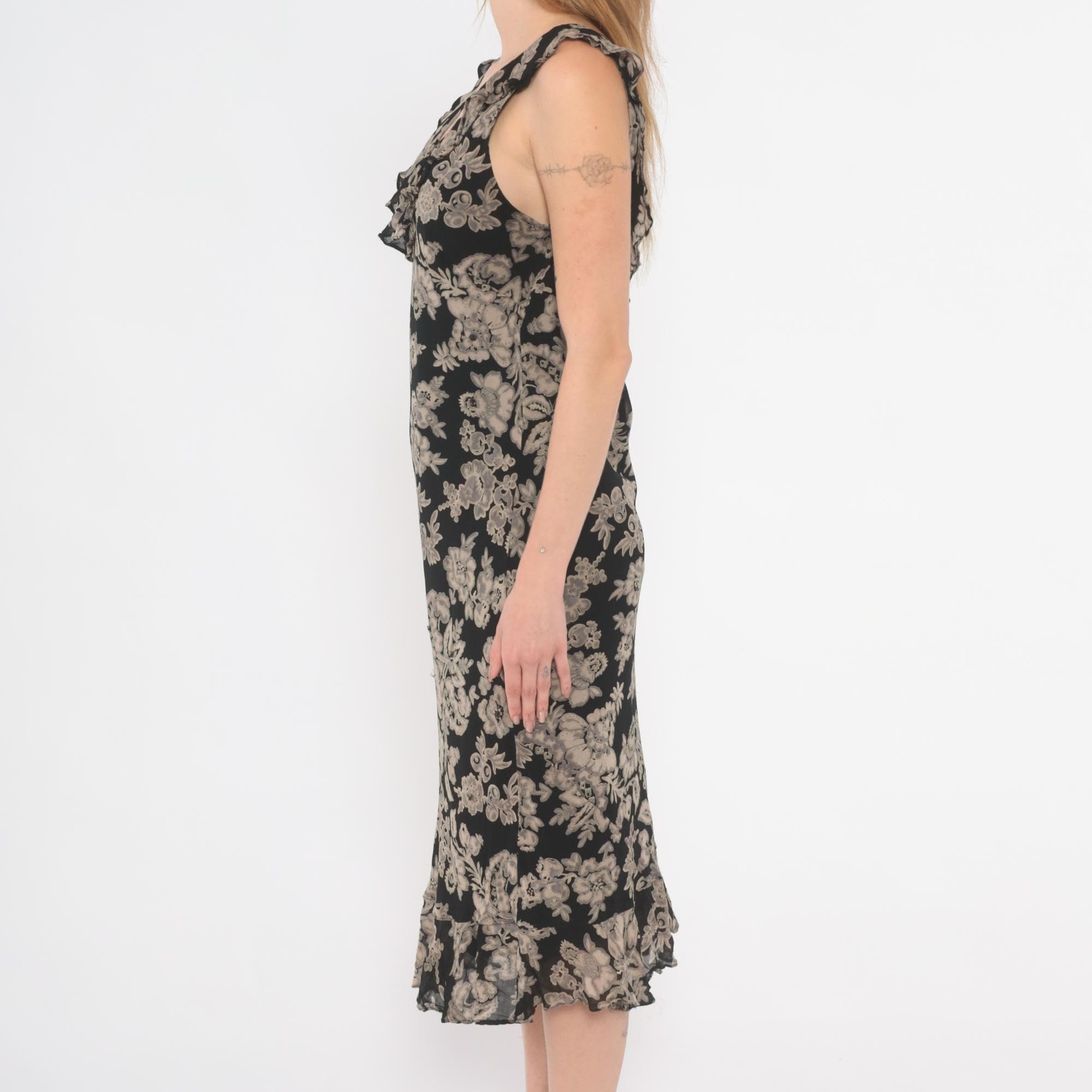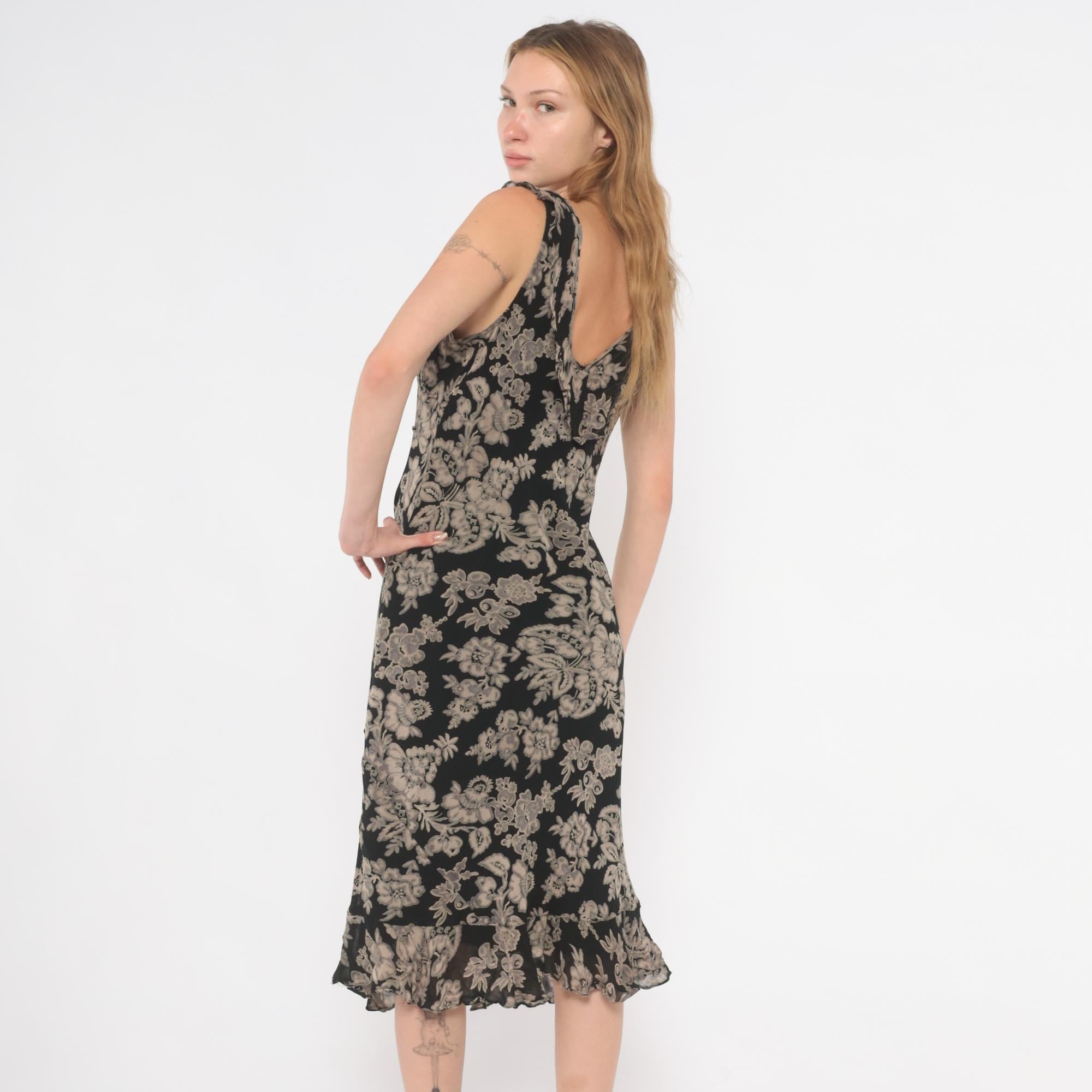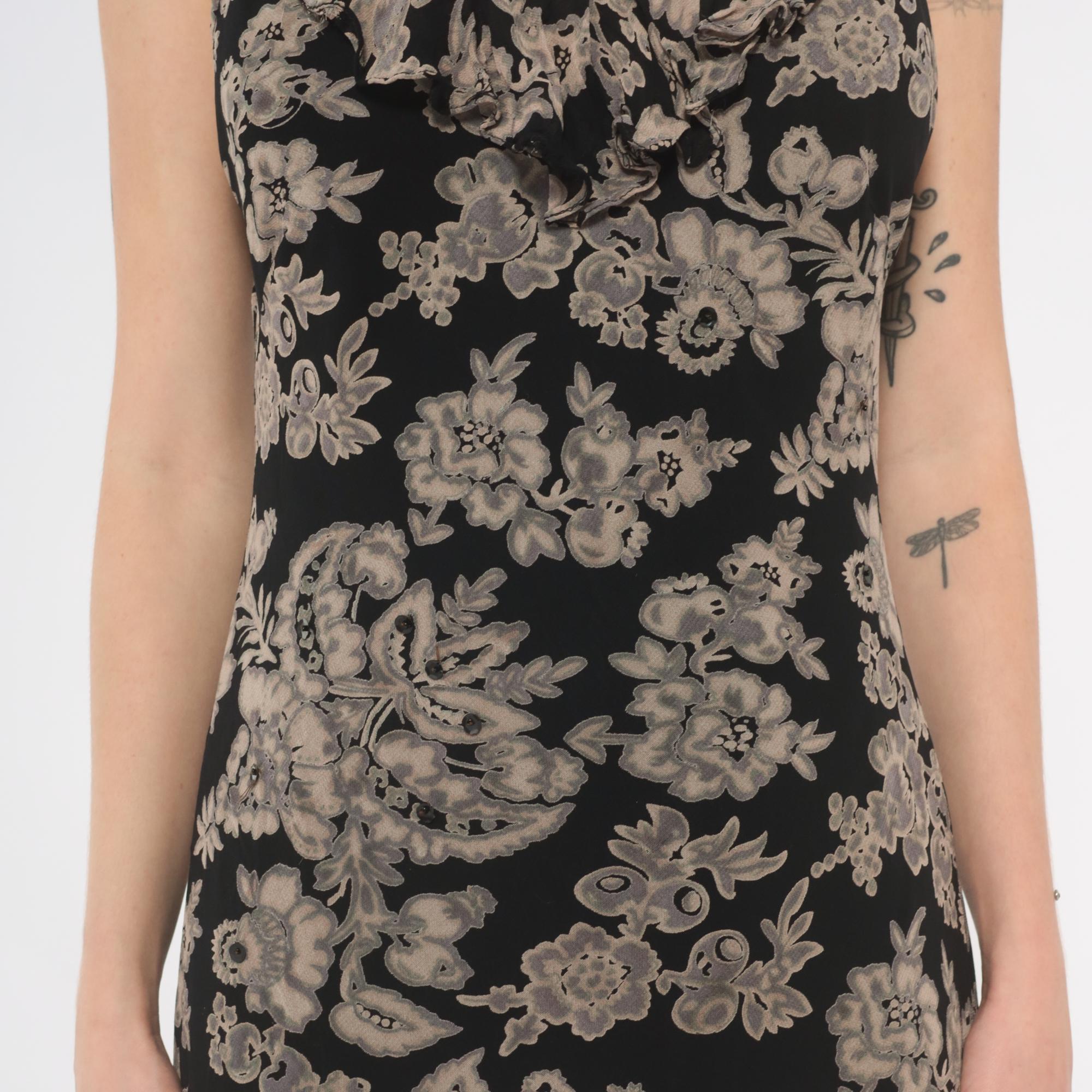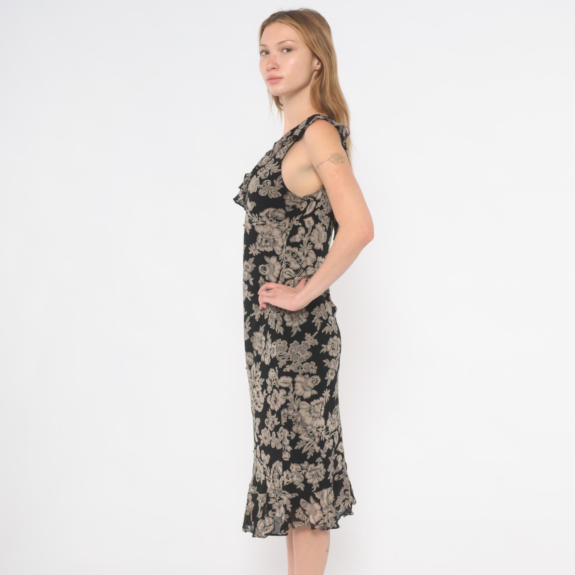 90s black and grey floral midi dress with a V-neckline on both the front and back, ruffle trim along the neckline and shoulder straps. Large-scale grey and taupe botanical print across the entire garment with flowers, leaves, and paisley motifs on a black ground.