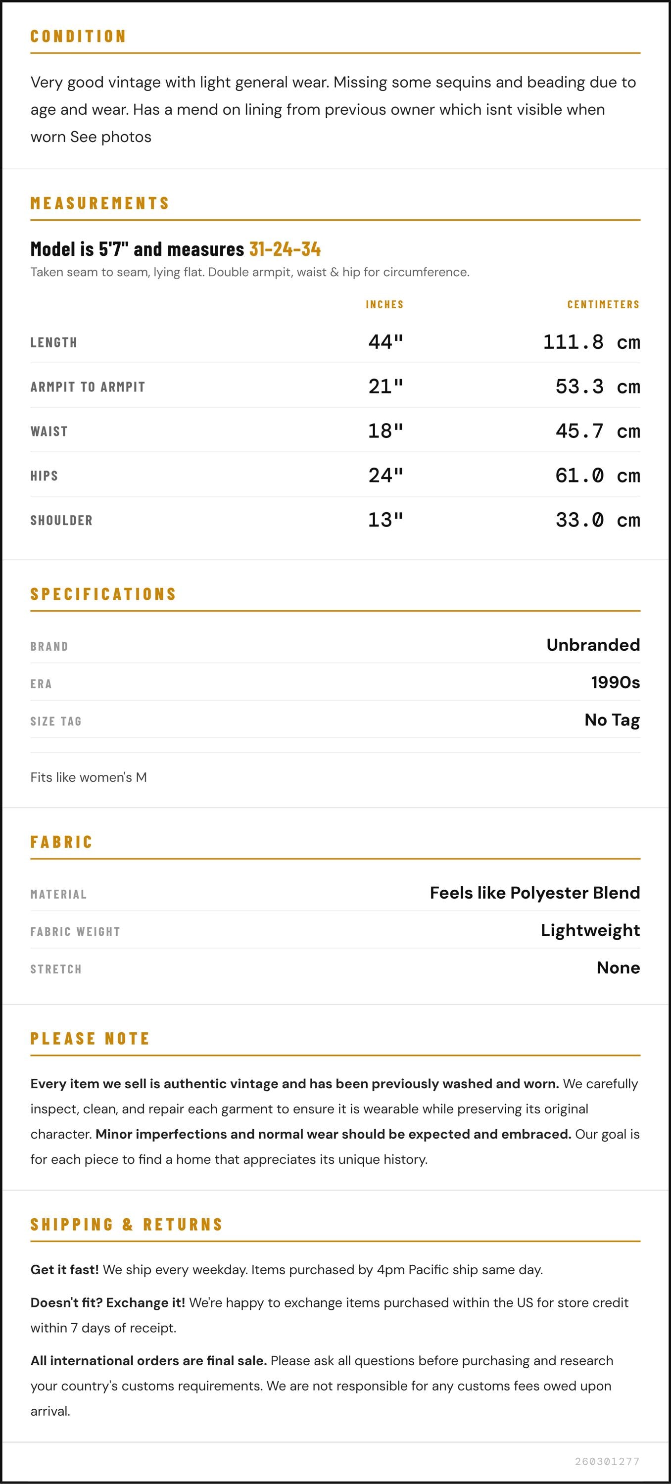 Condition: Very good vintage with light general wear. Missing some sequins and beading due to age and wear. Has a mend on lining from previous owner which isnt visible when worn See photos
