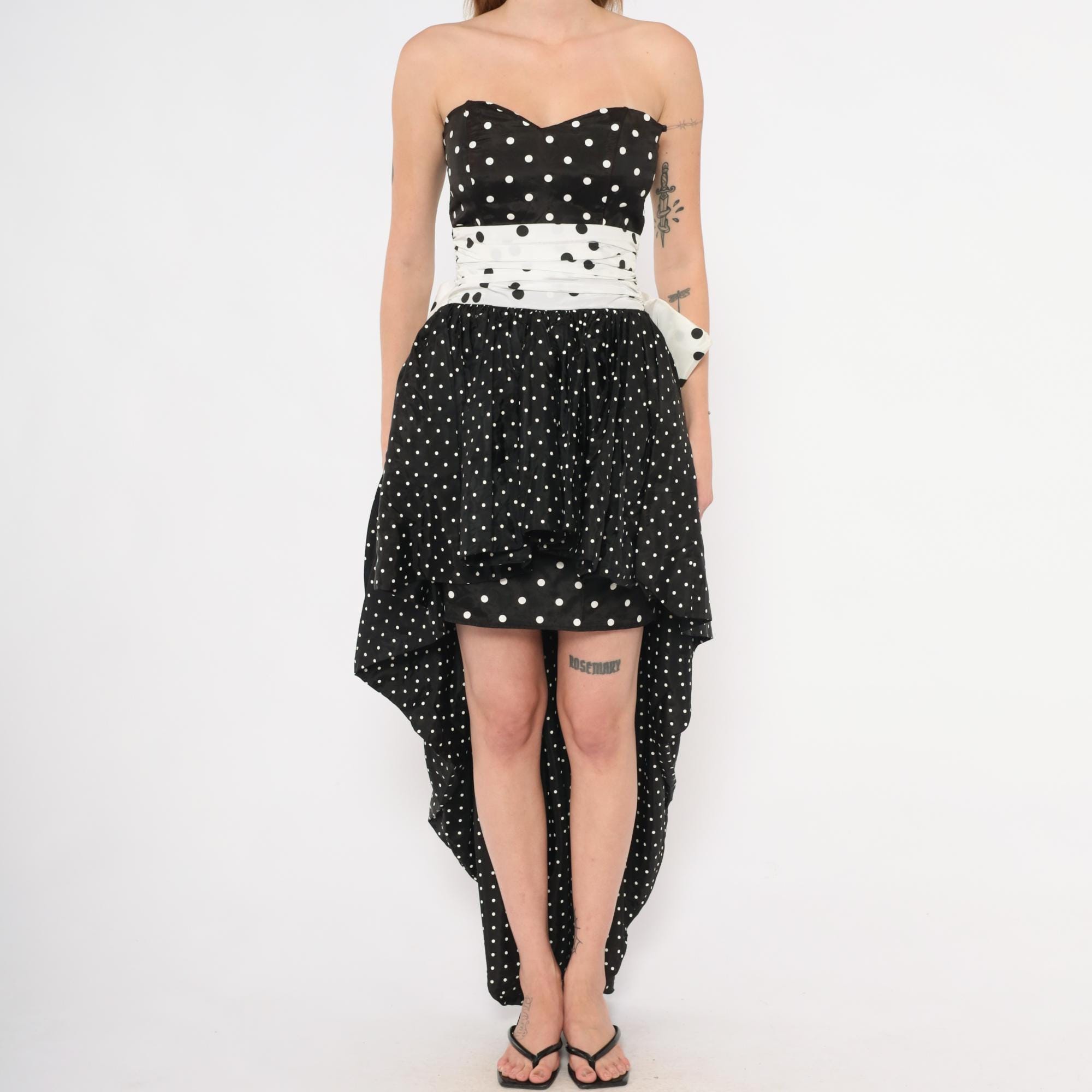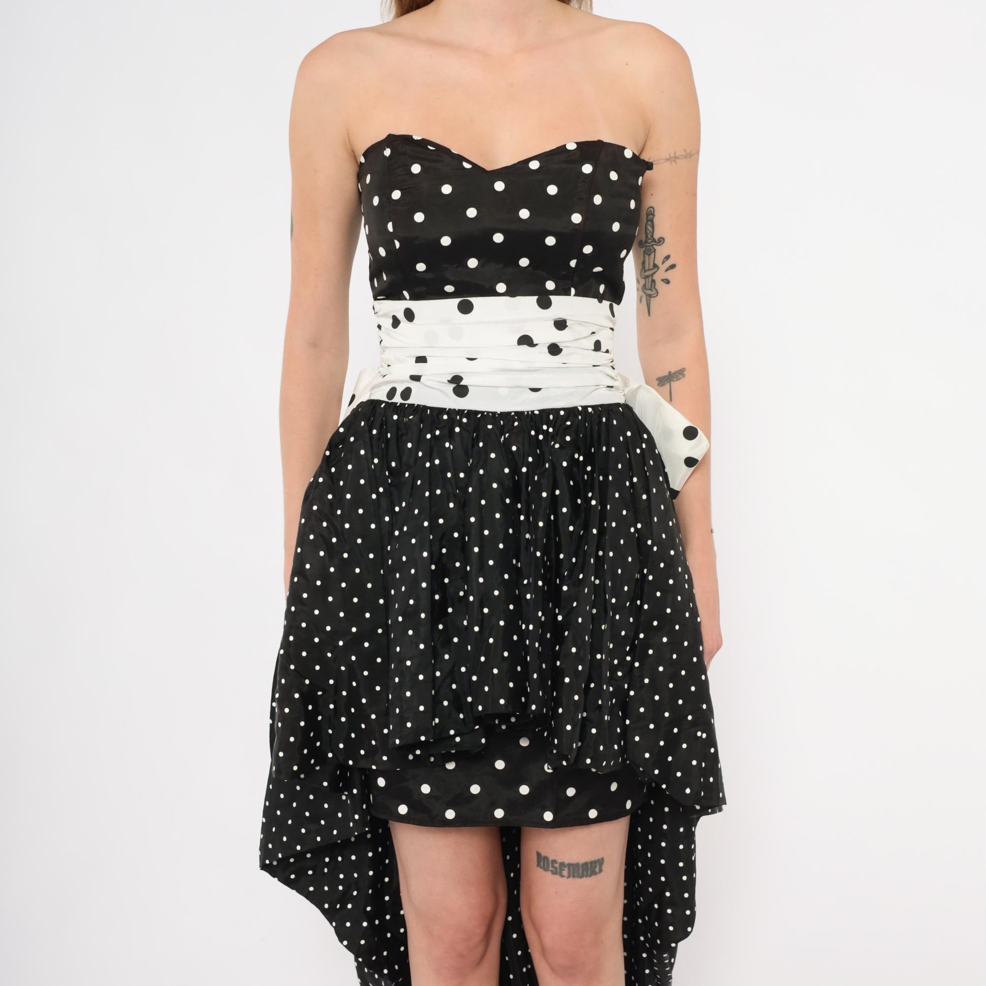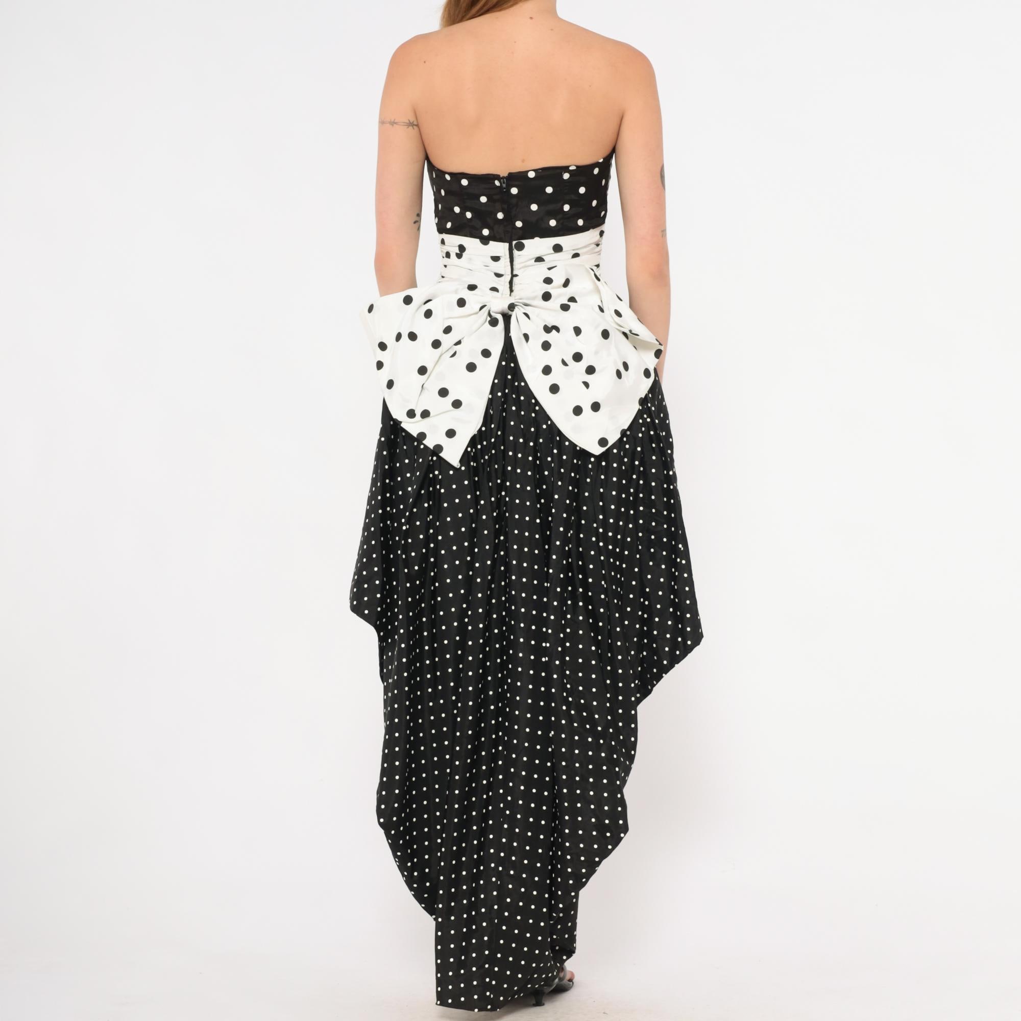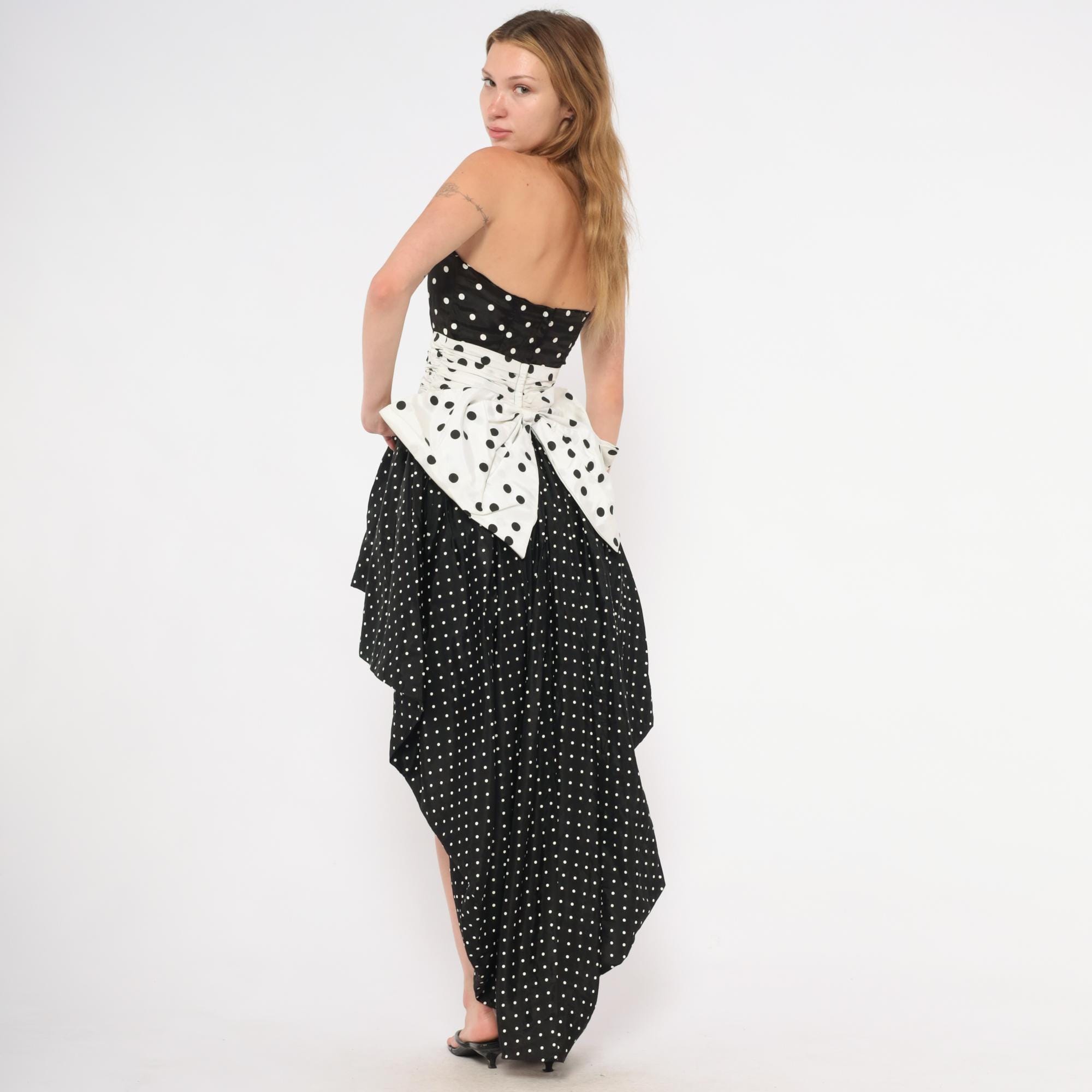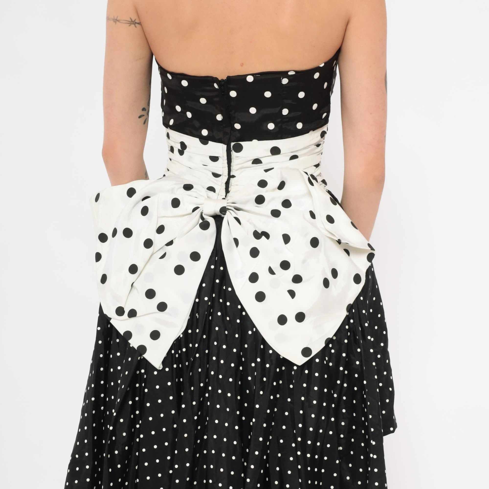 80s black and white polka dot strapless gown from Jessica McClintock Gunne Sax with a sweetheart neckline and boned bodice. White ruched cummerbund waistband with a large contrasting bow at the center back. High-low hemline, short in front and floor-length in back, with a gathered full skirt.