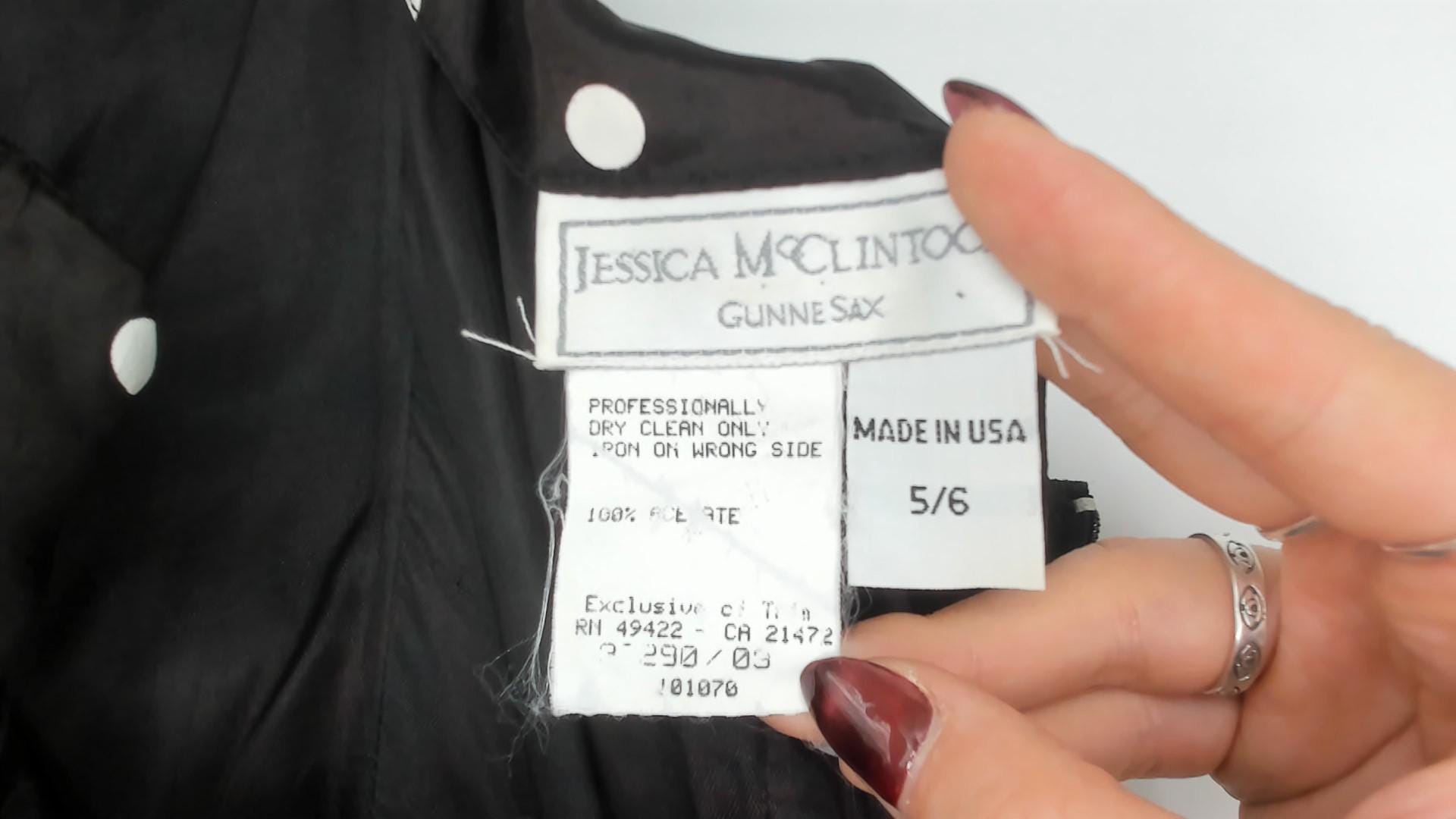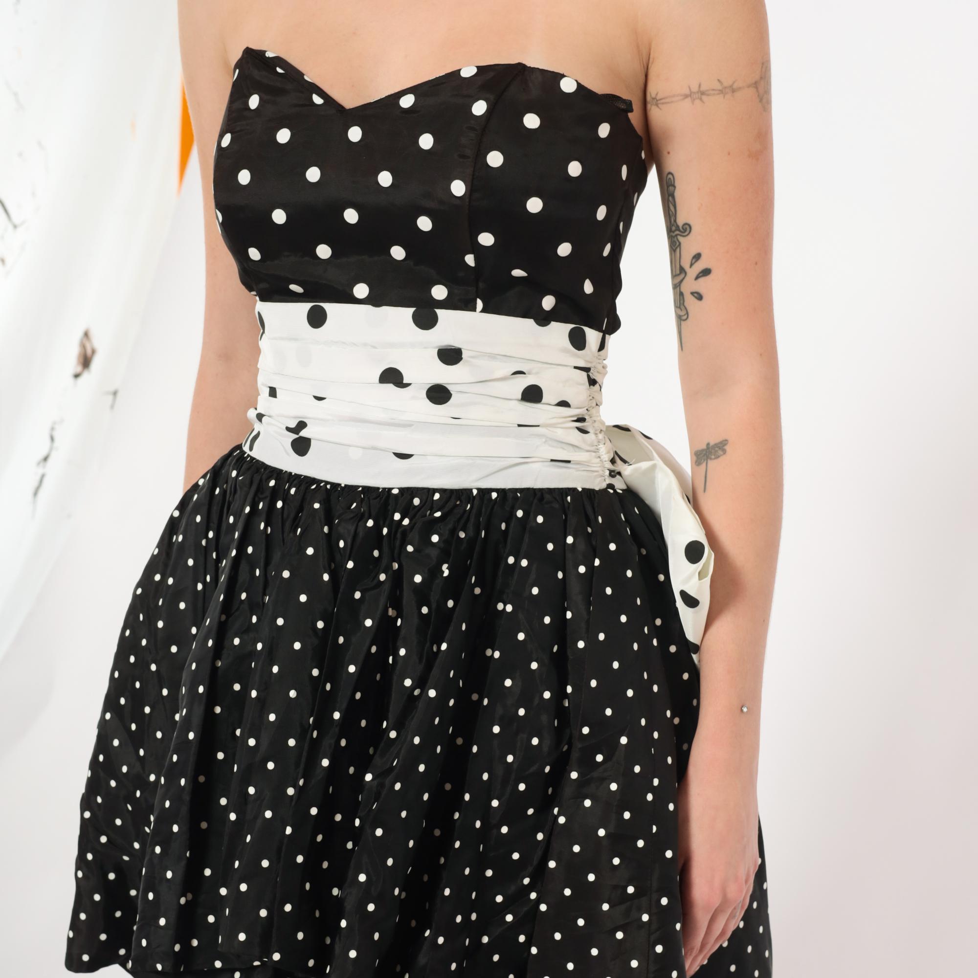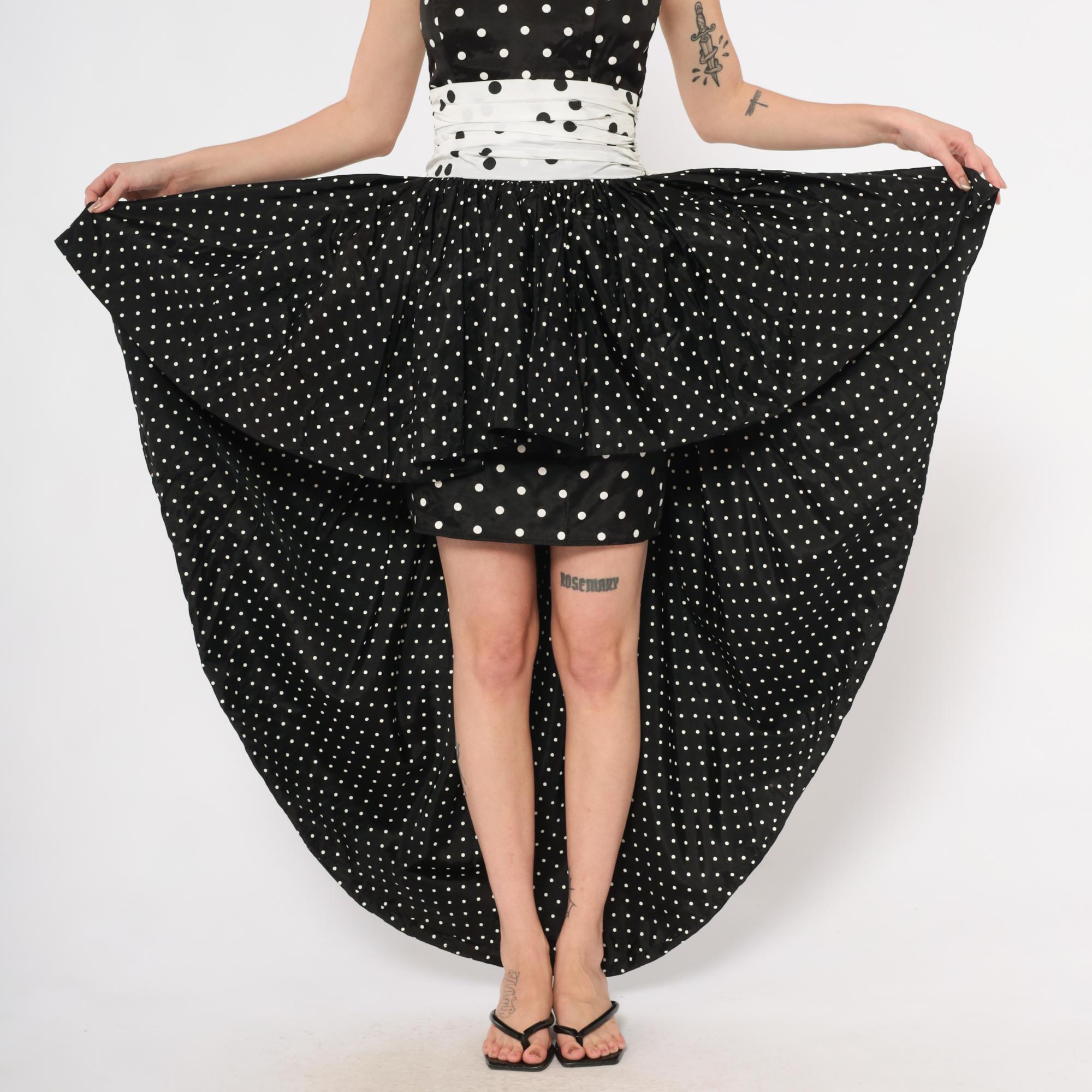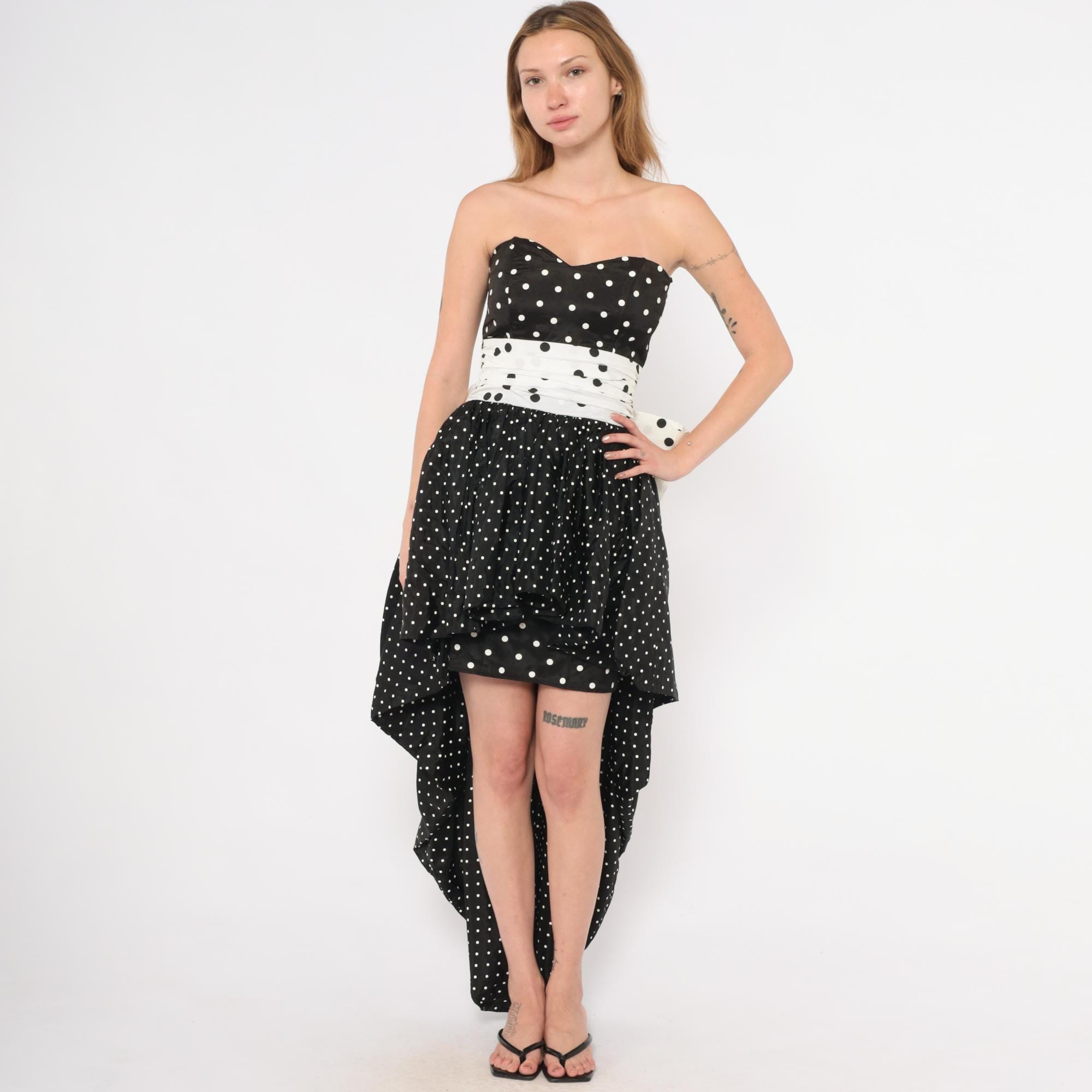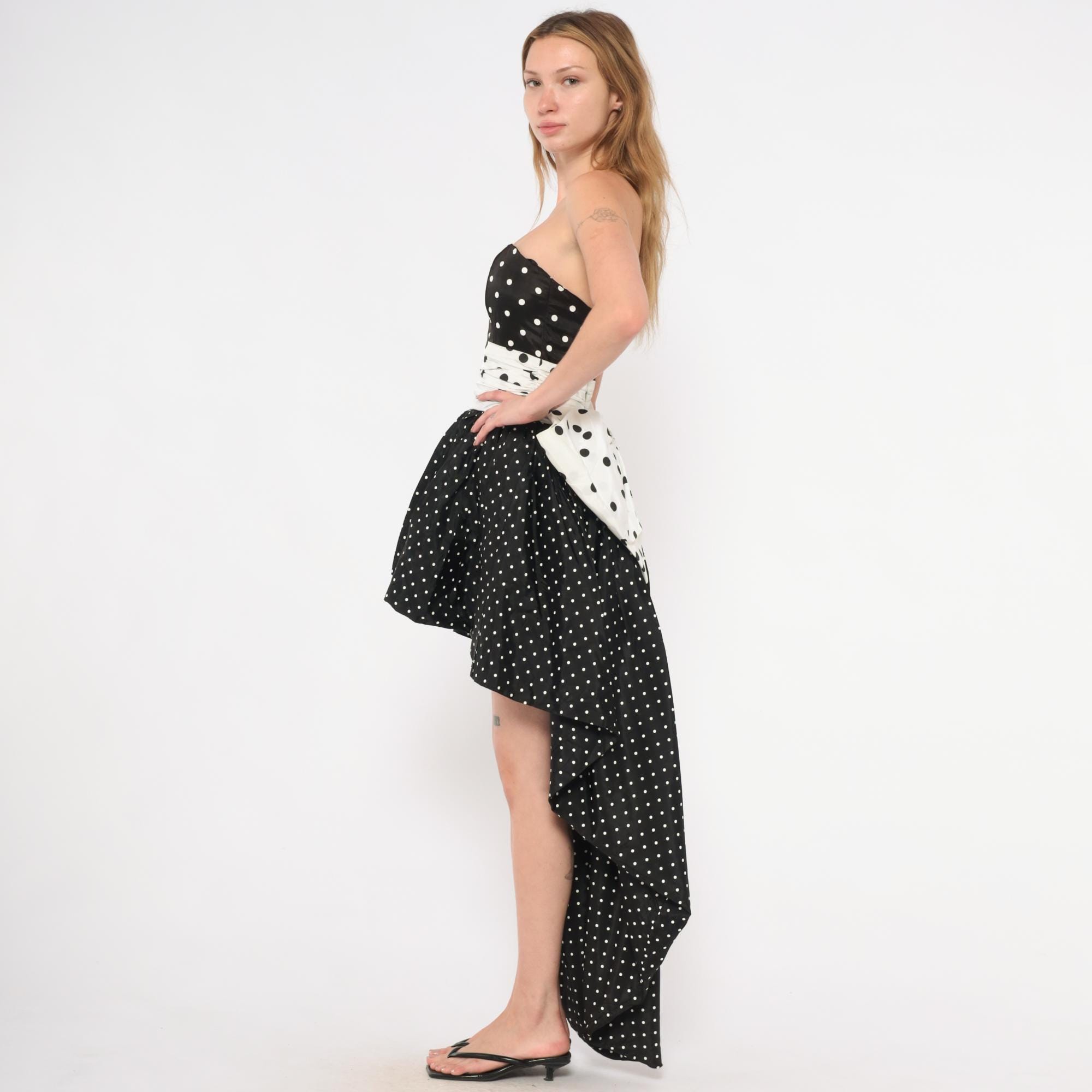 80s black and white polka dot strapless gown from Jessica McClintock Gunne Sax with a sweetheart neckline and boned bodice. White ruched cummerbund waistband with a large contrasting bow at the center back. High-low hemline, short in front and floor-length in back, with a gathered full skirt.