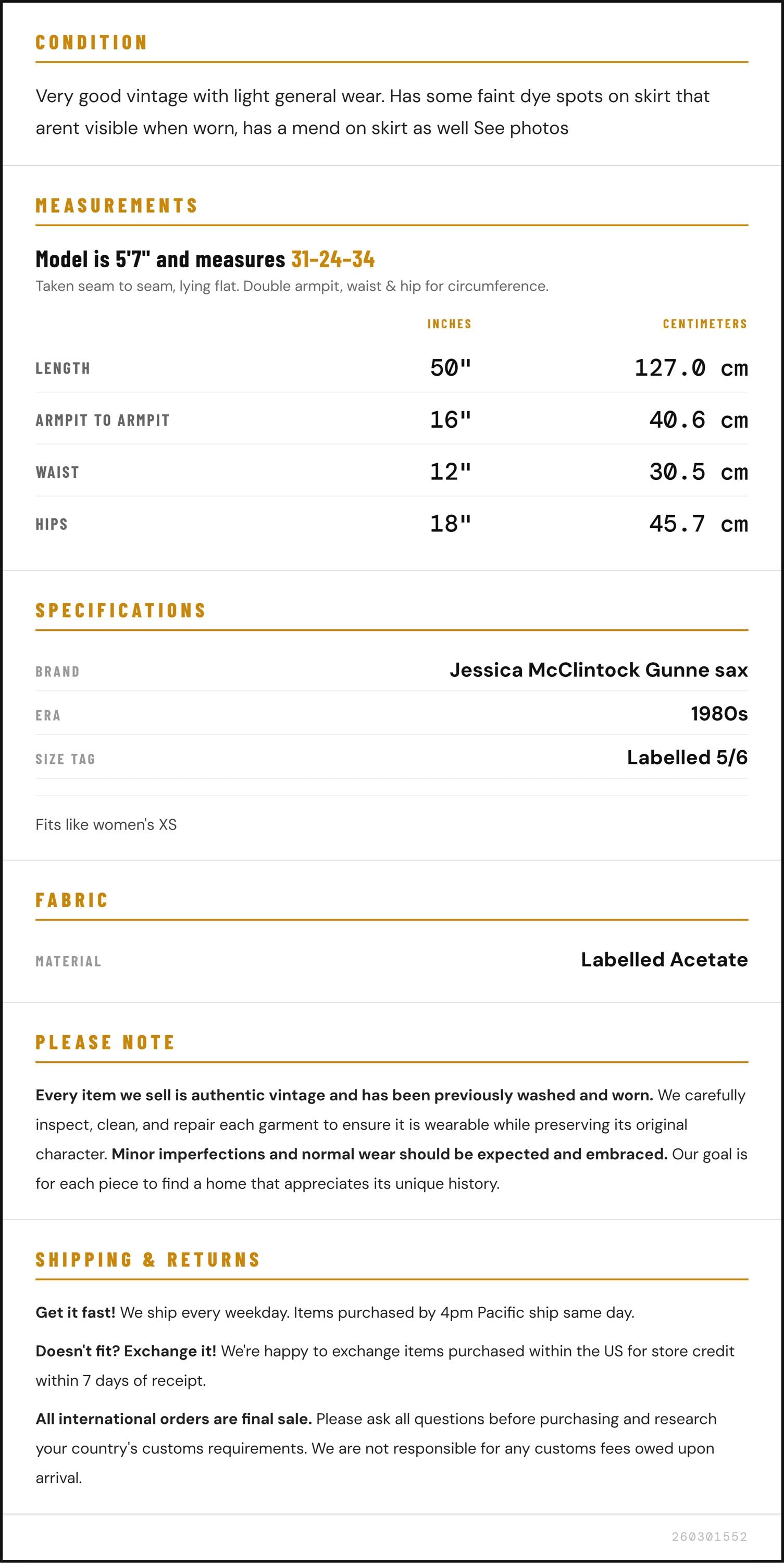 Condition: Very good vintage with light general wear. Has some faint dye spots on skirt that arent visible when worn, has a mend on skirt as well See photos
