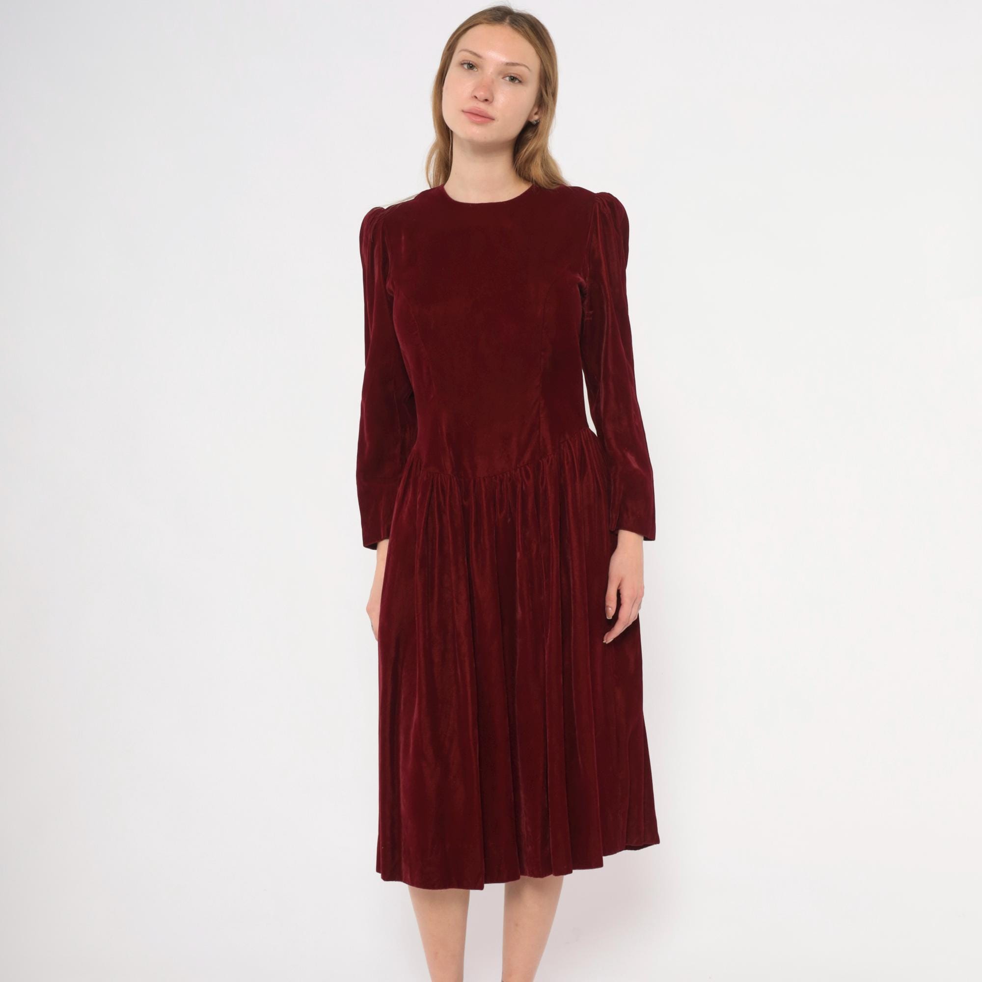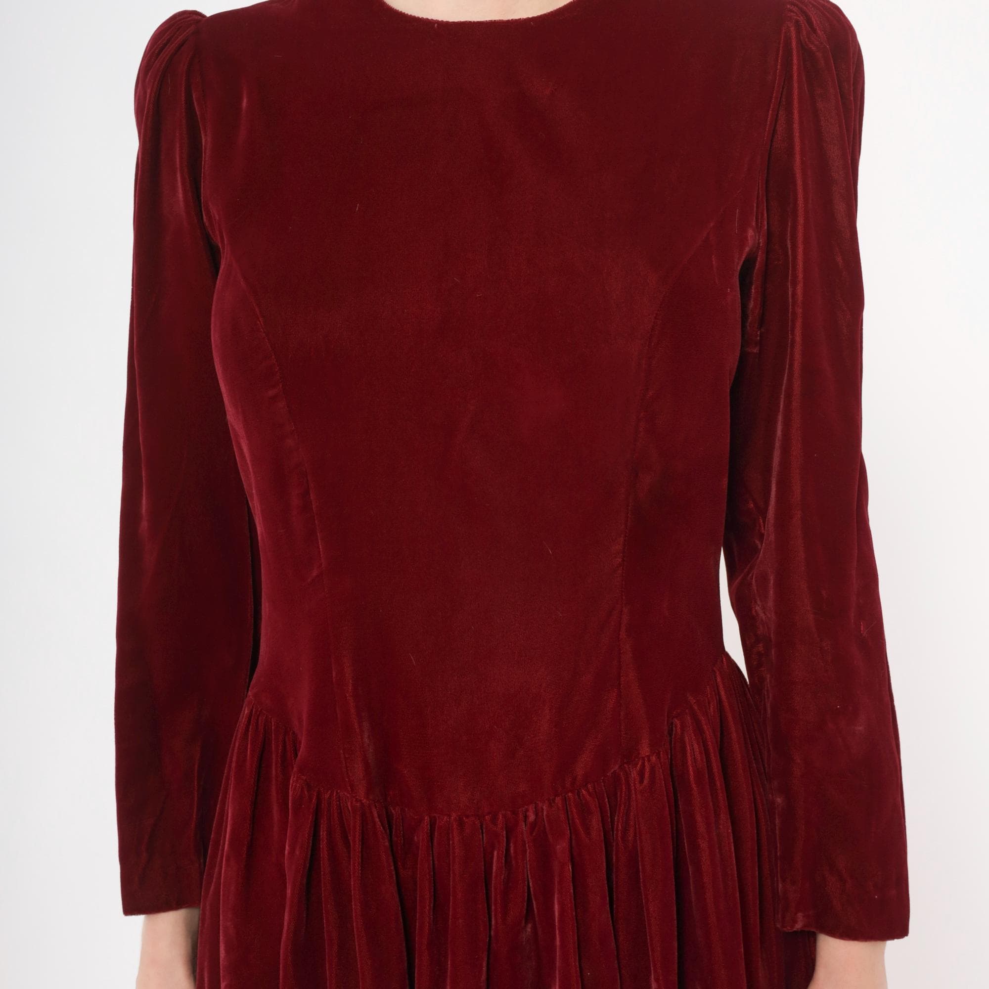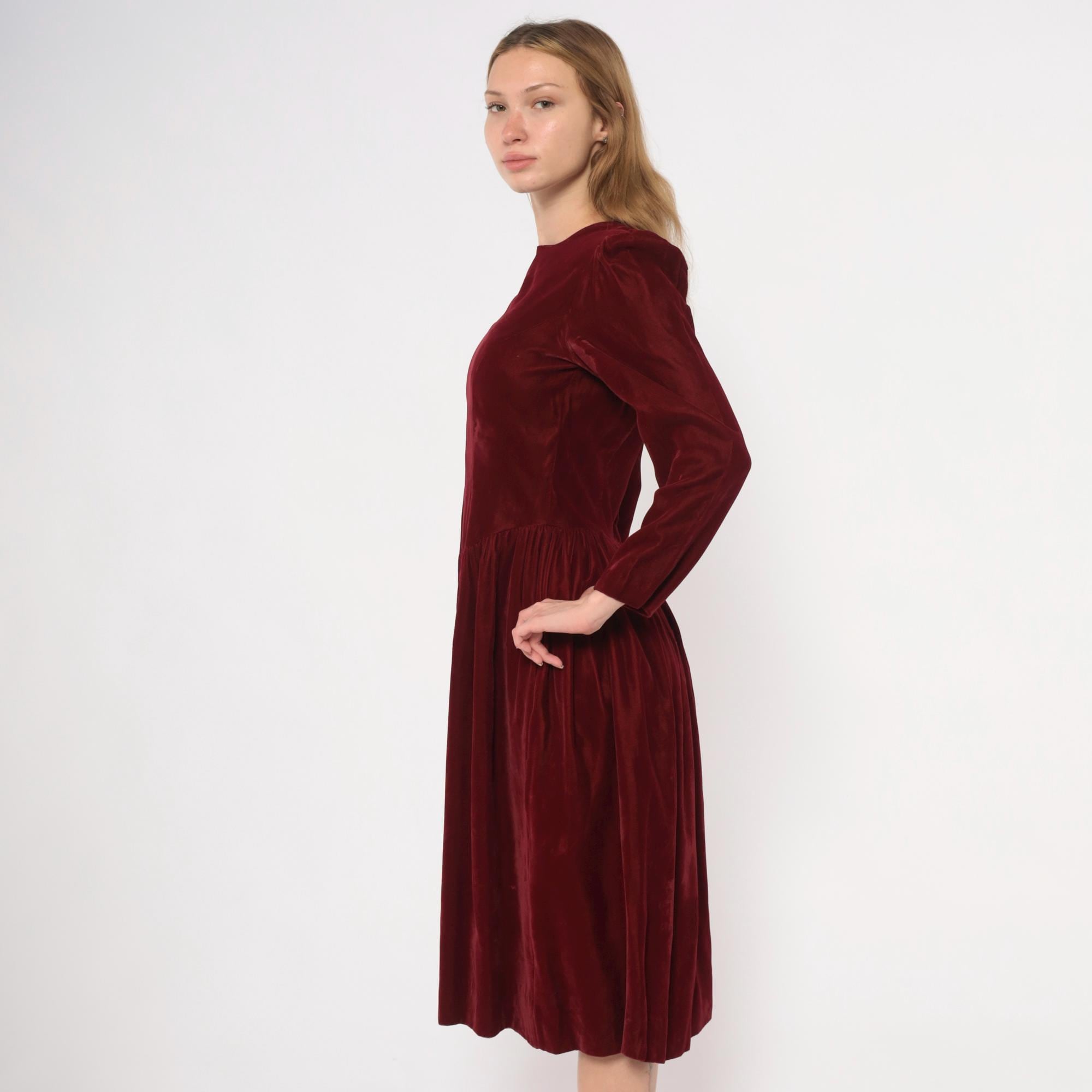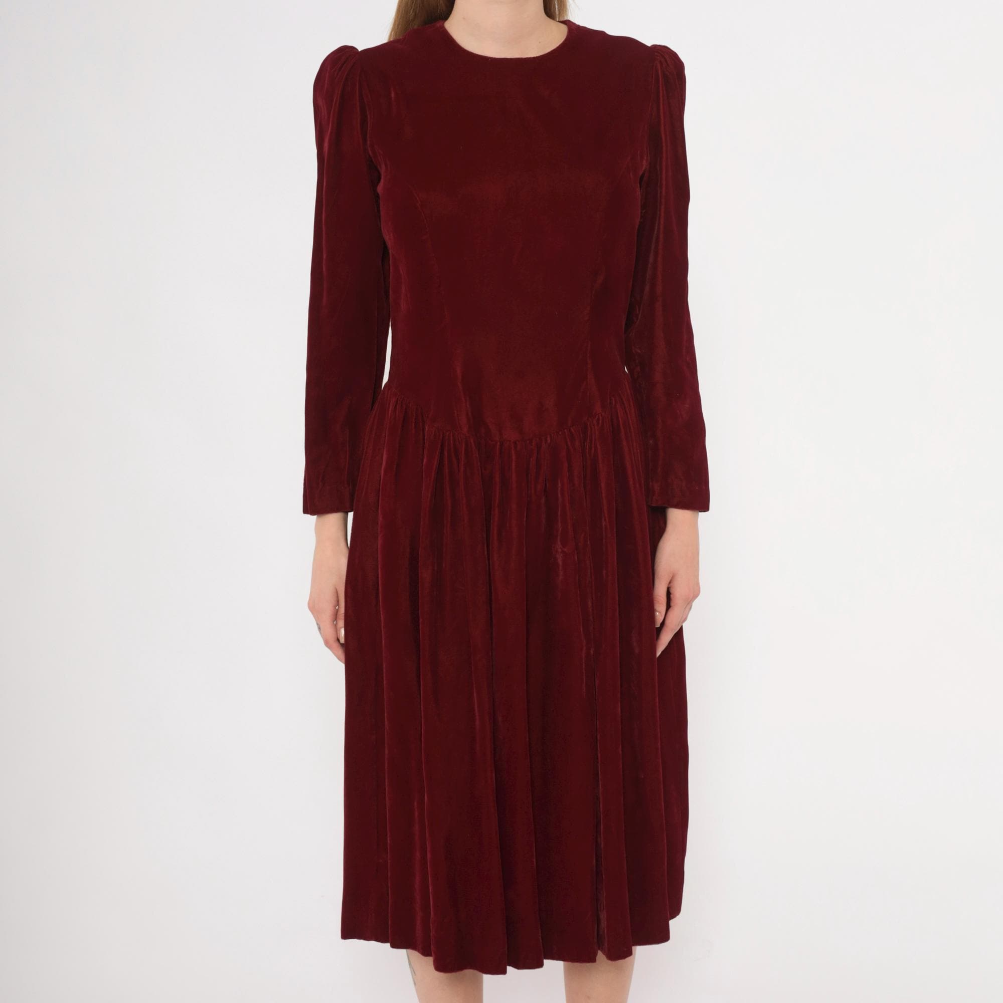 70s burgundy velvet midi dress with a crew neckline and puffed shoulders that taper into fitted long sleeves. Fitted bodice through the waist with a dropped waistline and gathered full skirt.